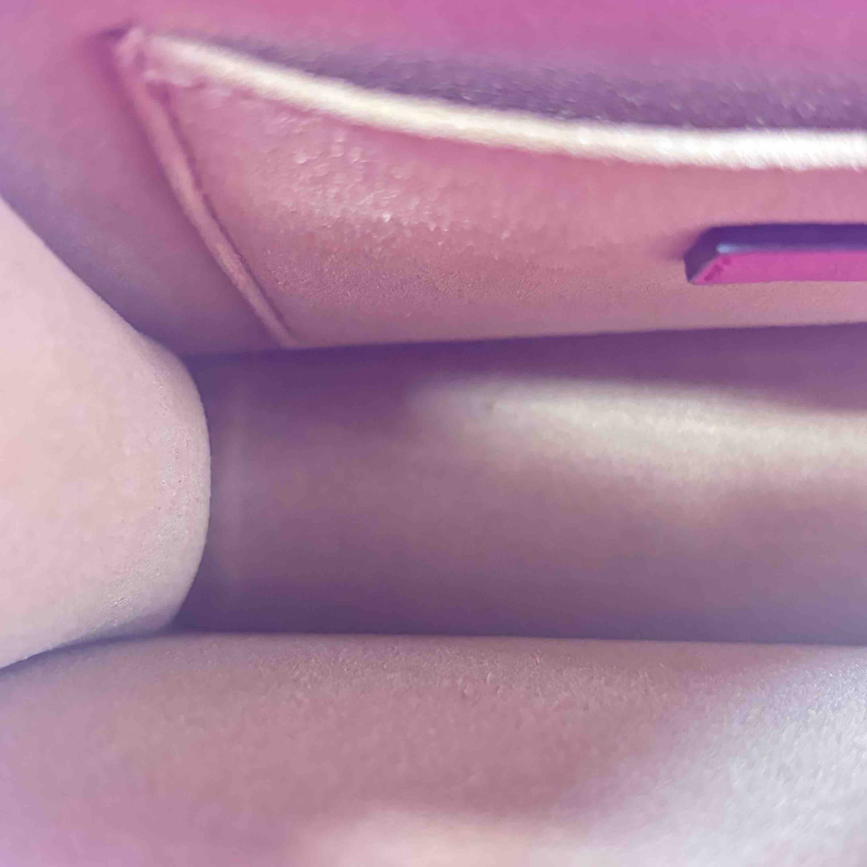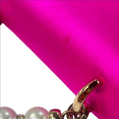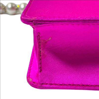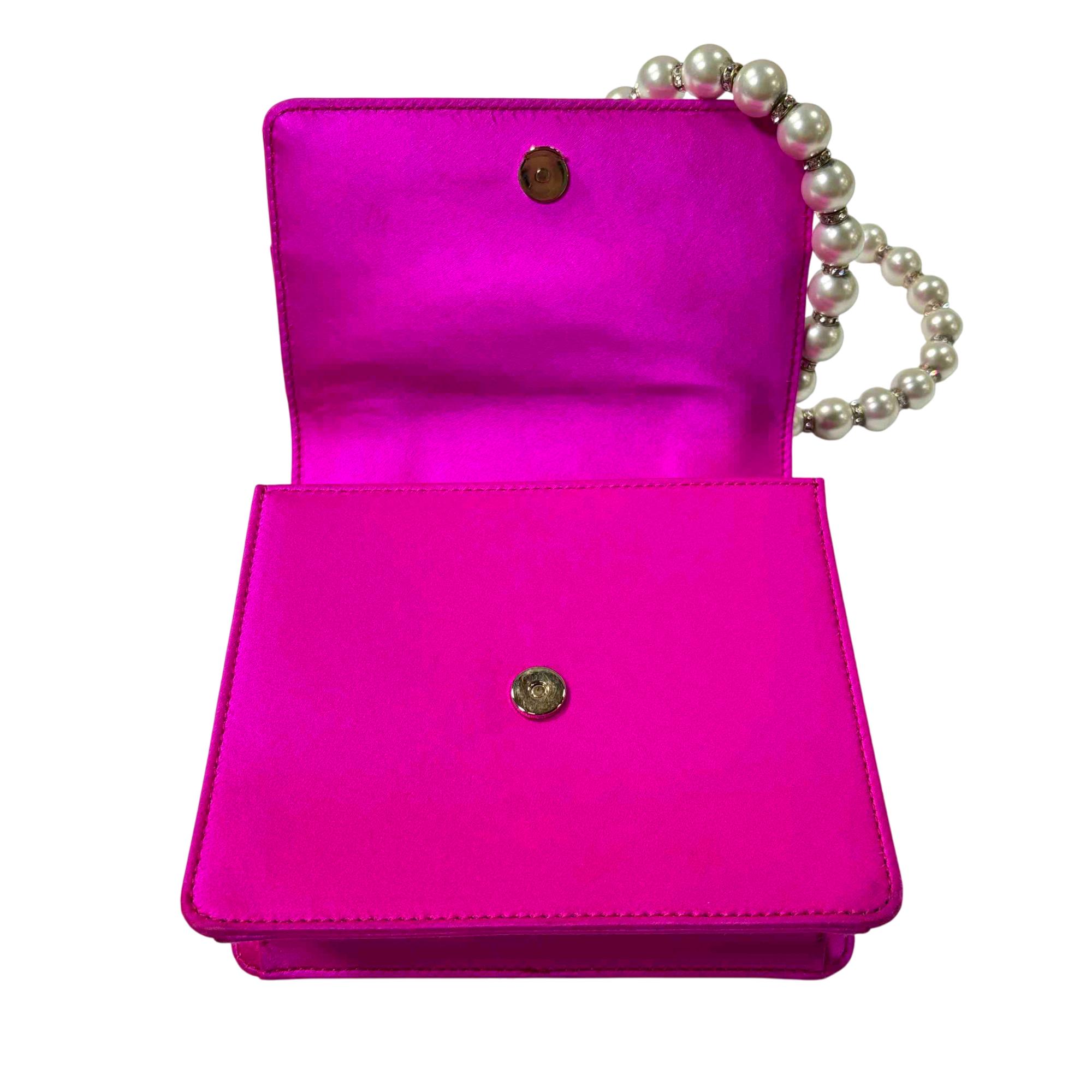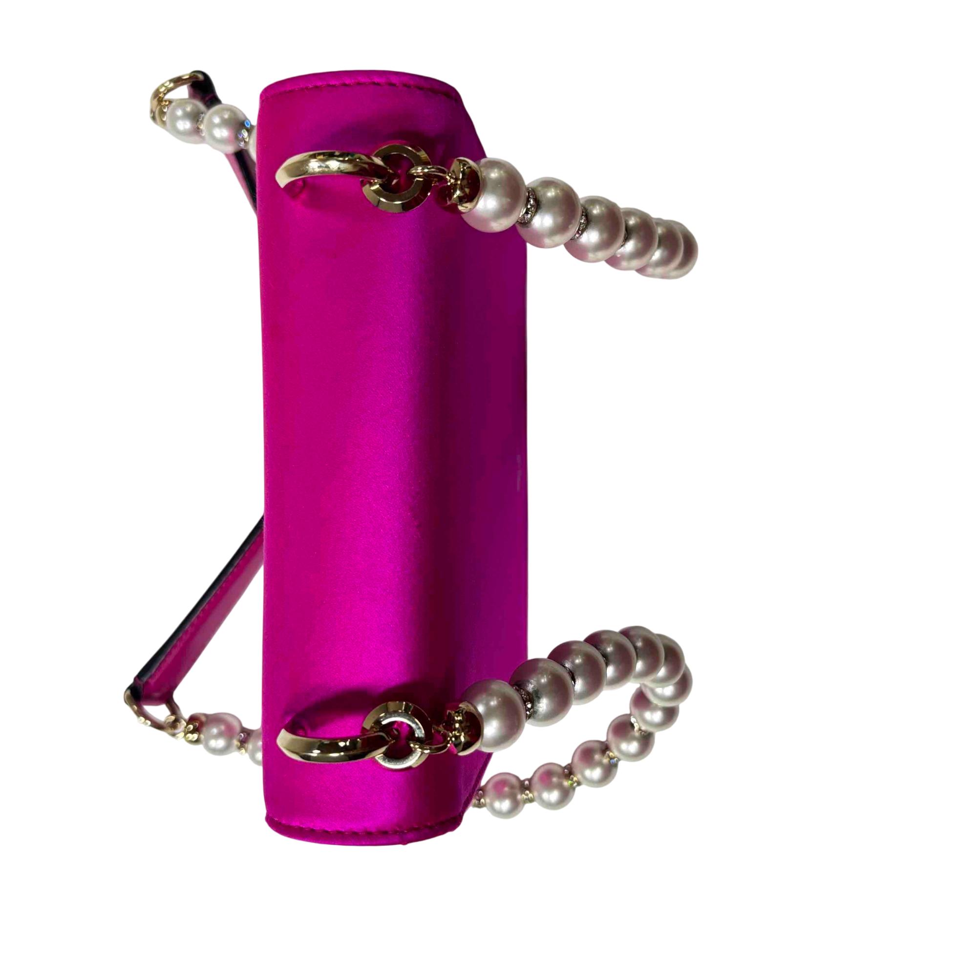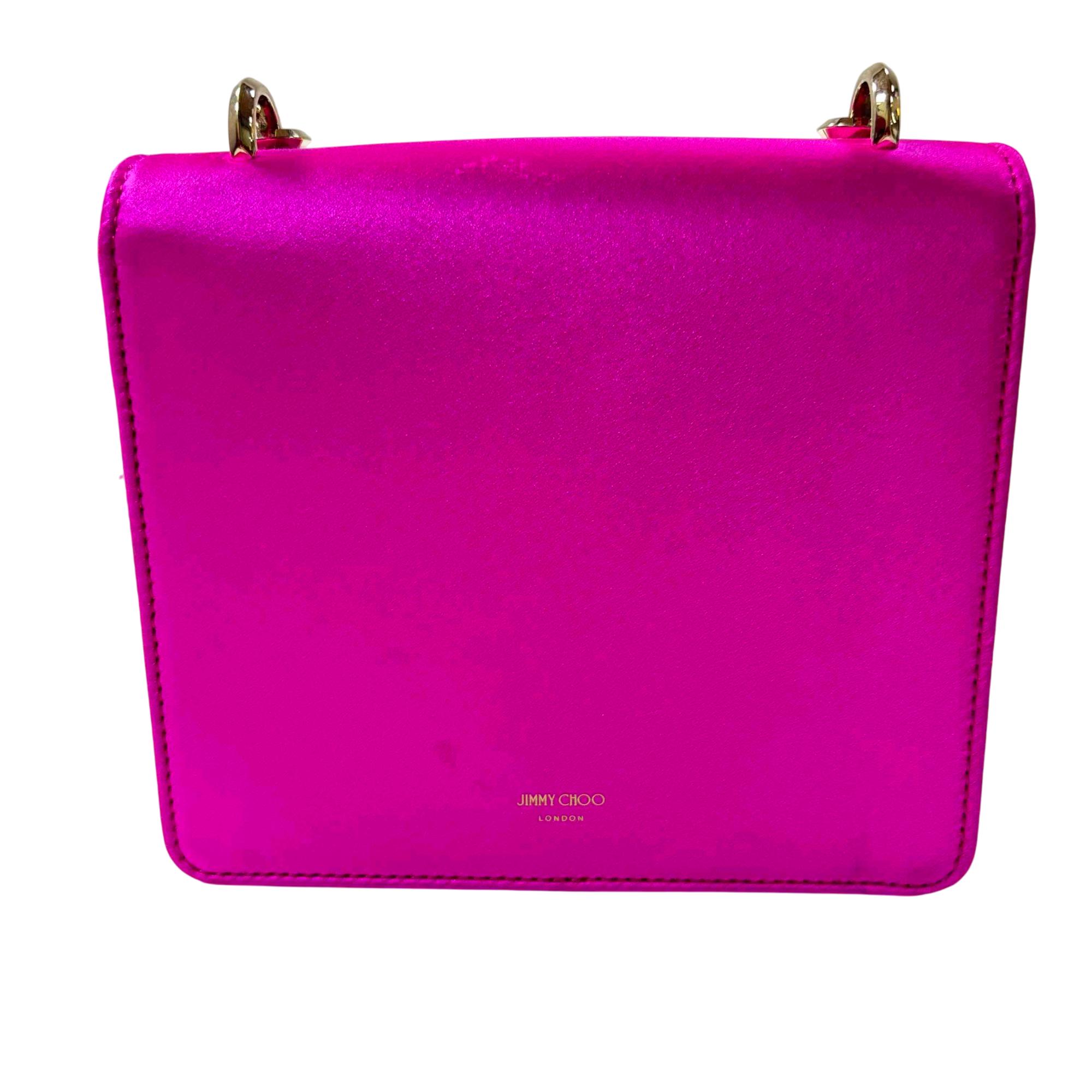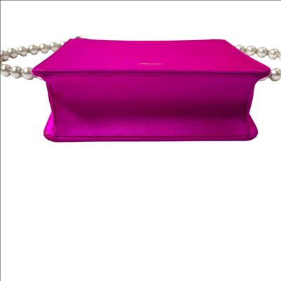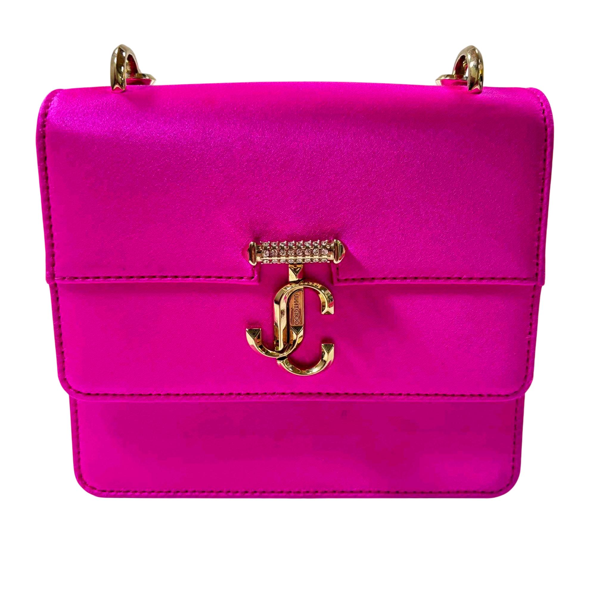 The Jimmy Choo Avenue Quad XS Satin Shoulder Bag in Pearl Pink features a luxurious satin finish complemented by a distinctive pearl strap that adds an elegant touch. This compact shoulder bag combines refined craftsmanship with a soft pink hue and subtle gold lettering, making it a stylish accessory for everyday fashion.