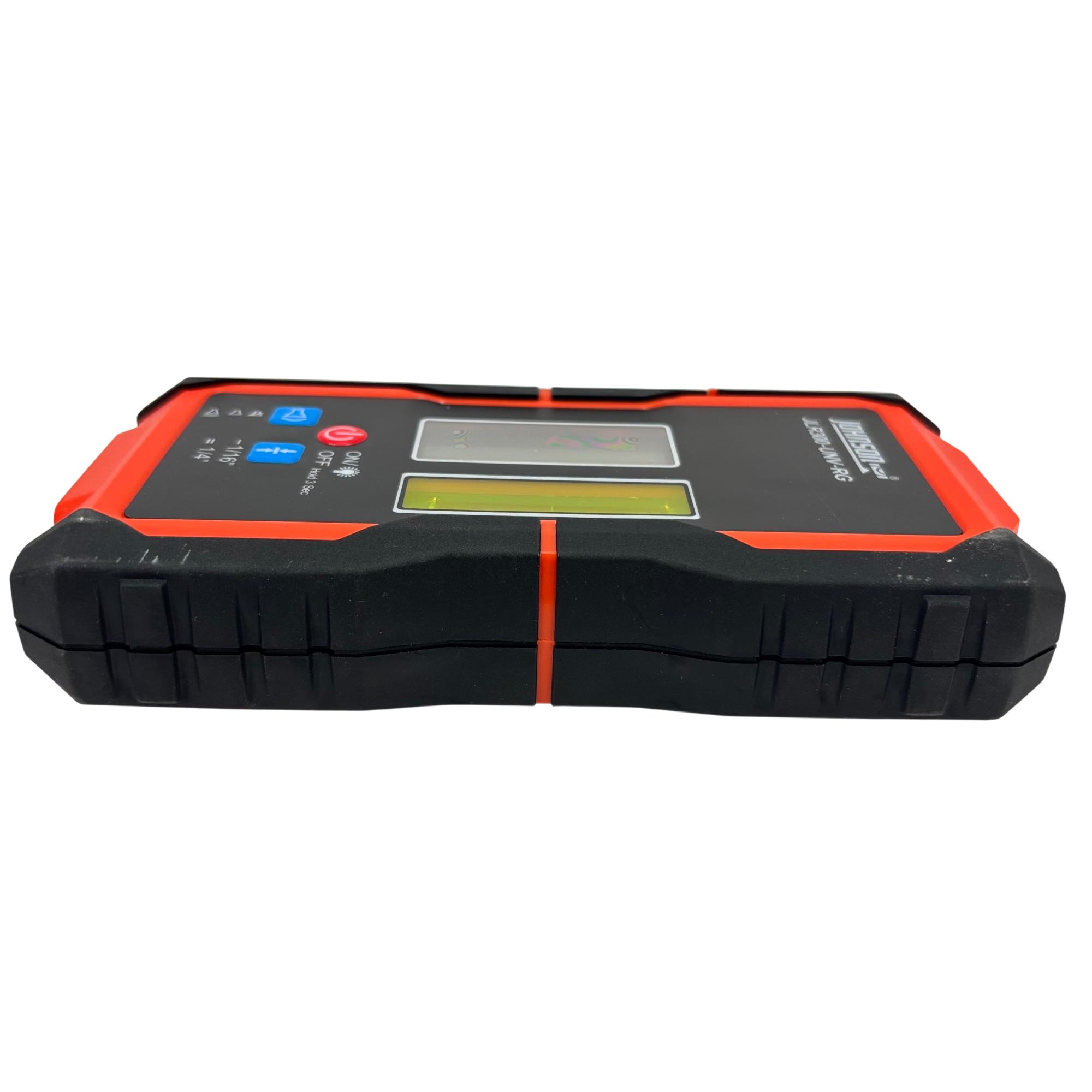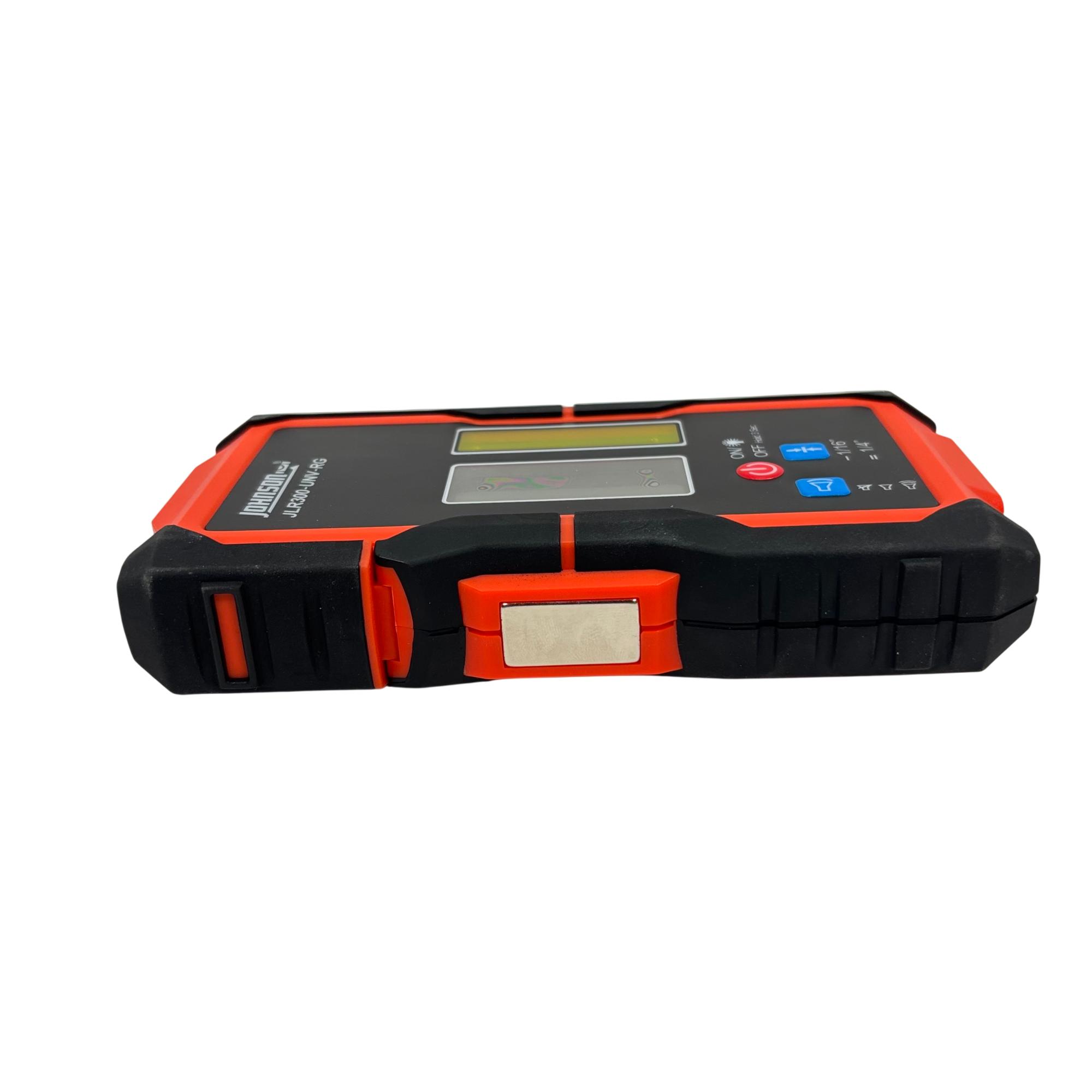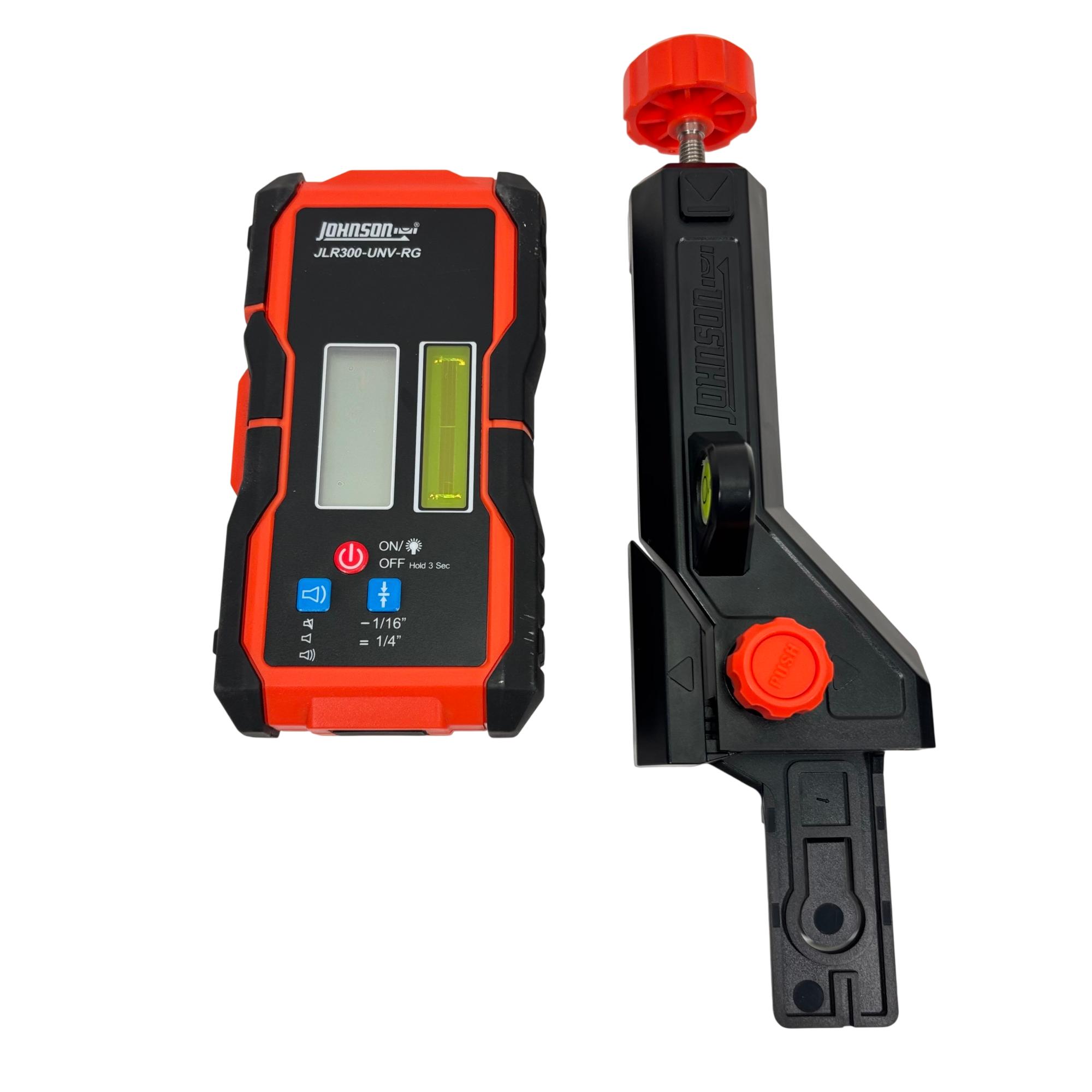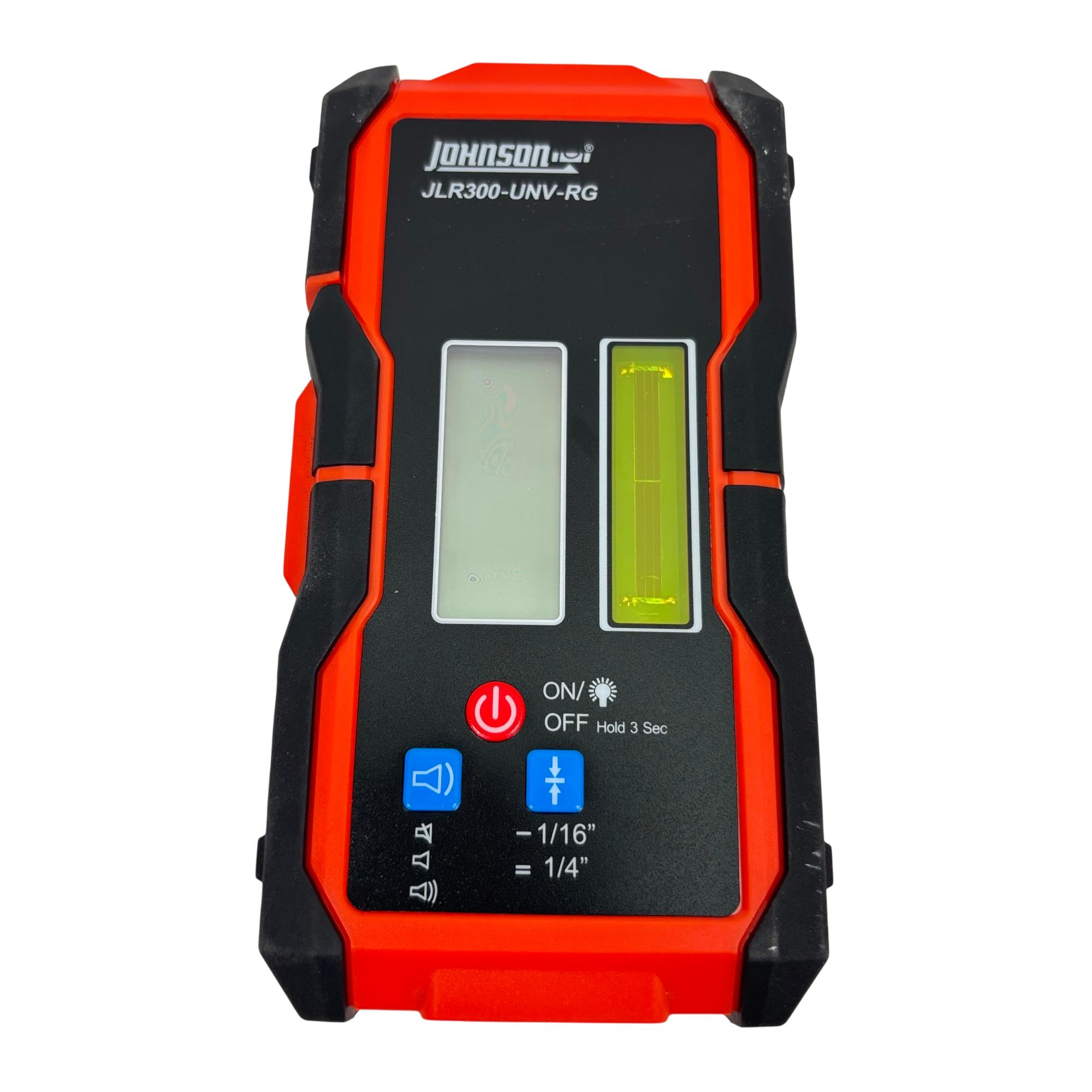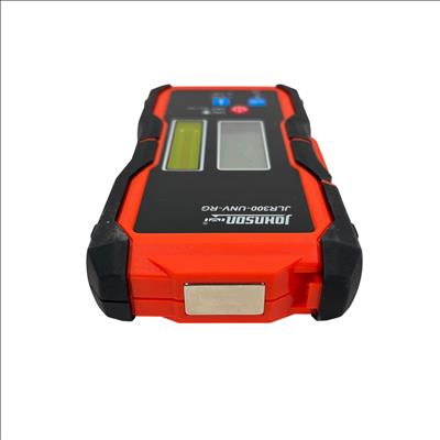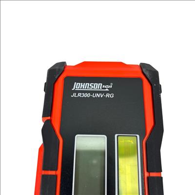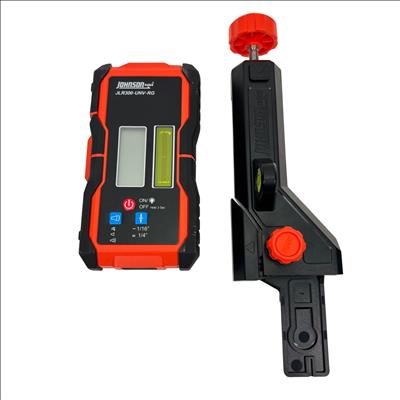 Johnson Level & Tool JLR300-UNV-RG Universal Laser Detector is a precision instrument designed to detect green and red laser beams for accurate leveling and alignment tasks. Featuring a black and red design with a red detection wheel and push button, this tool offers clear laser visibility and easy operation. Its robust construction and versatile clamp make it suitable for various professional and DIY leveling applications.