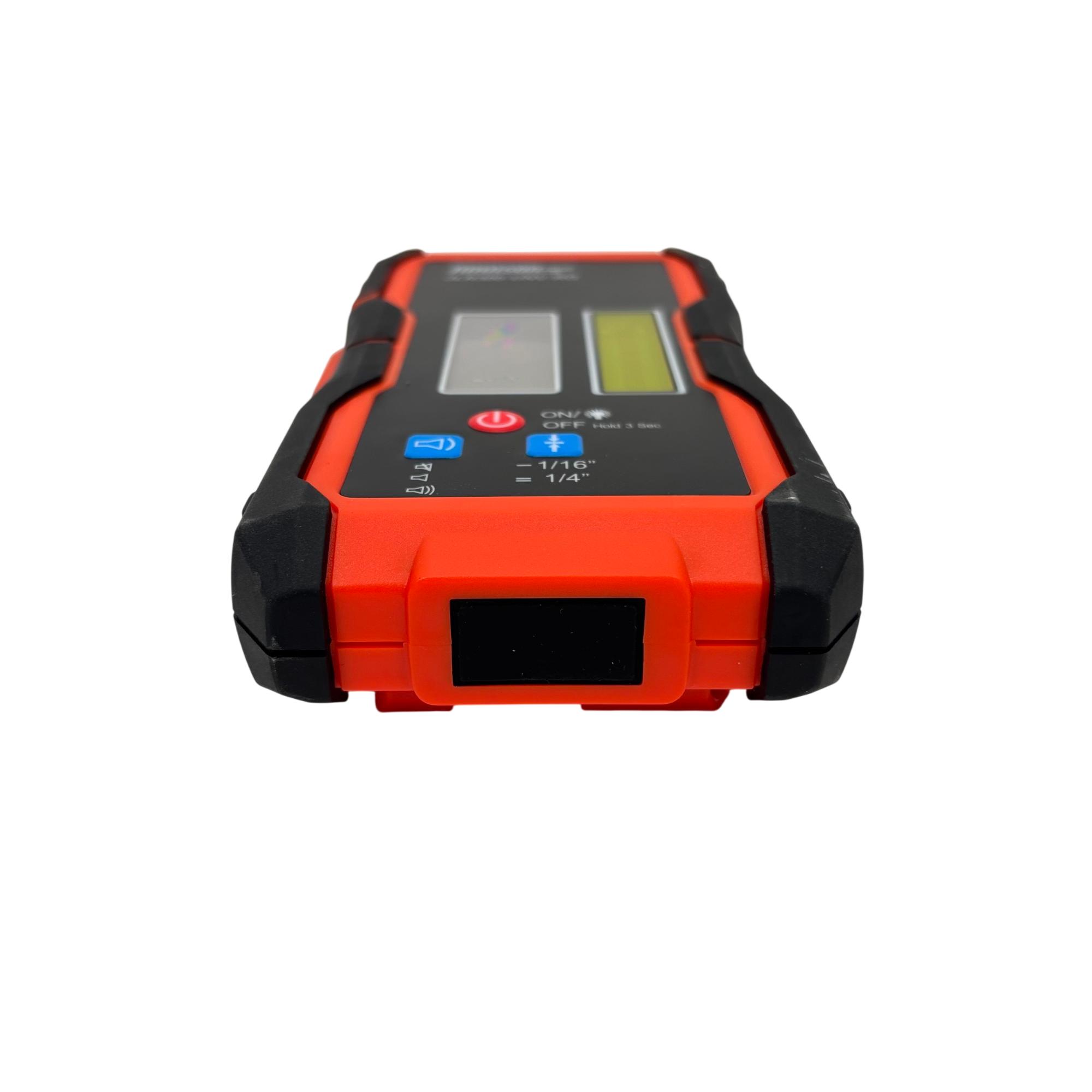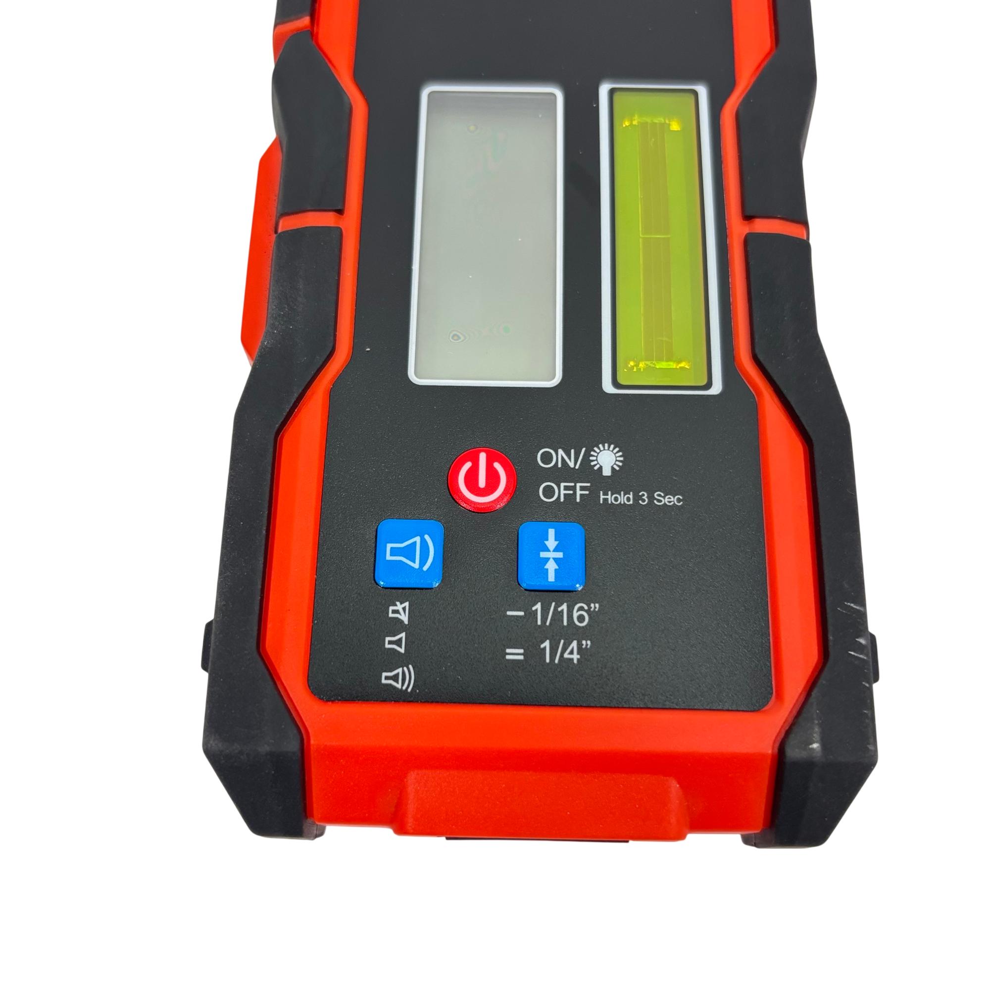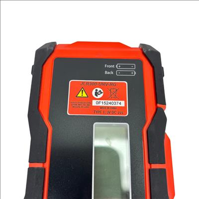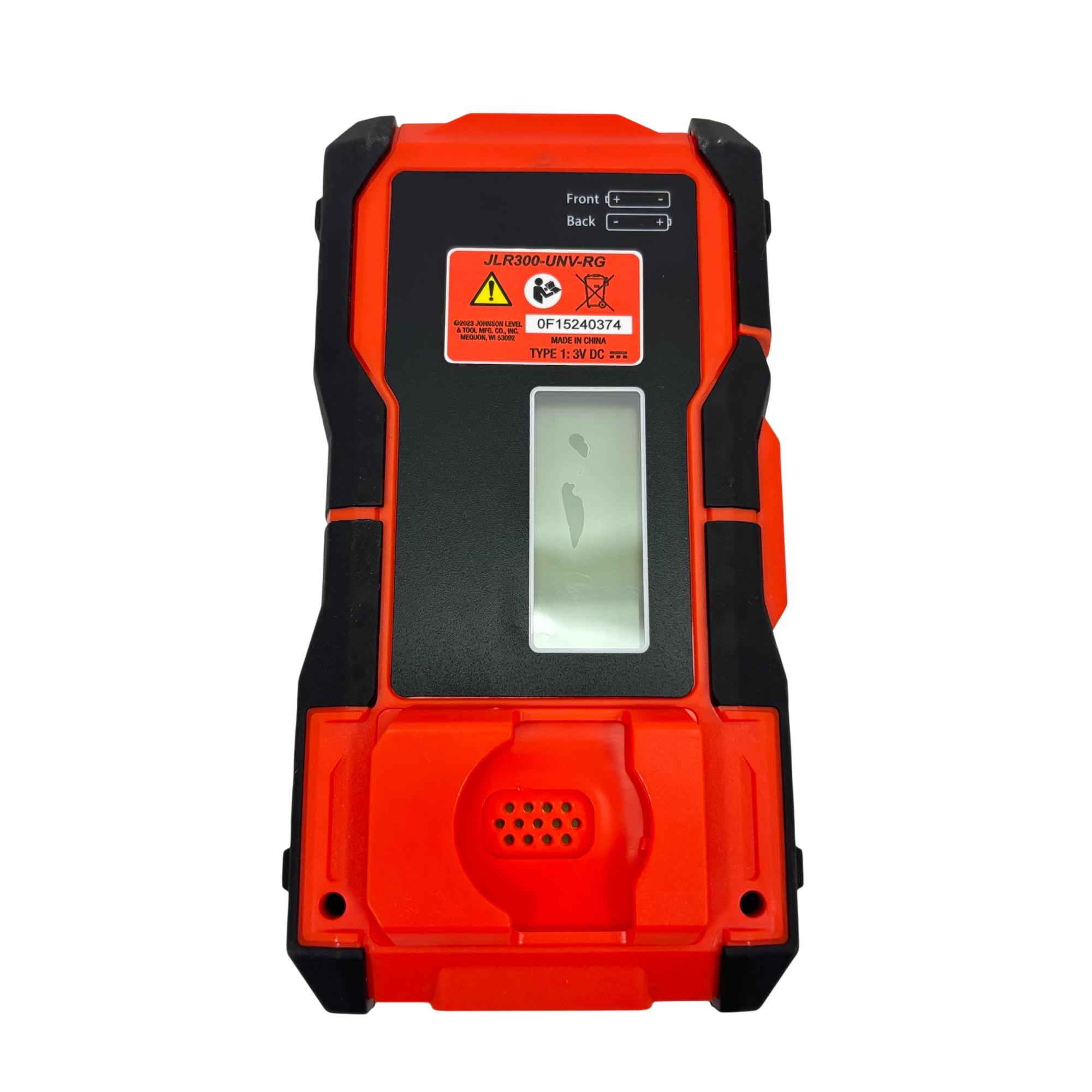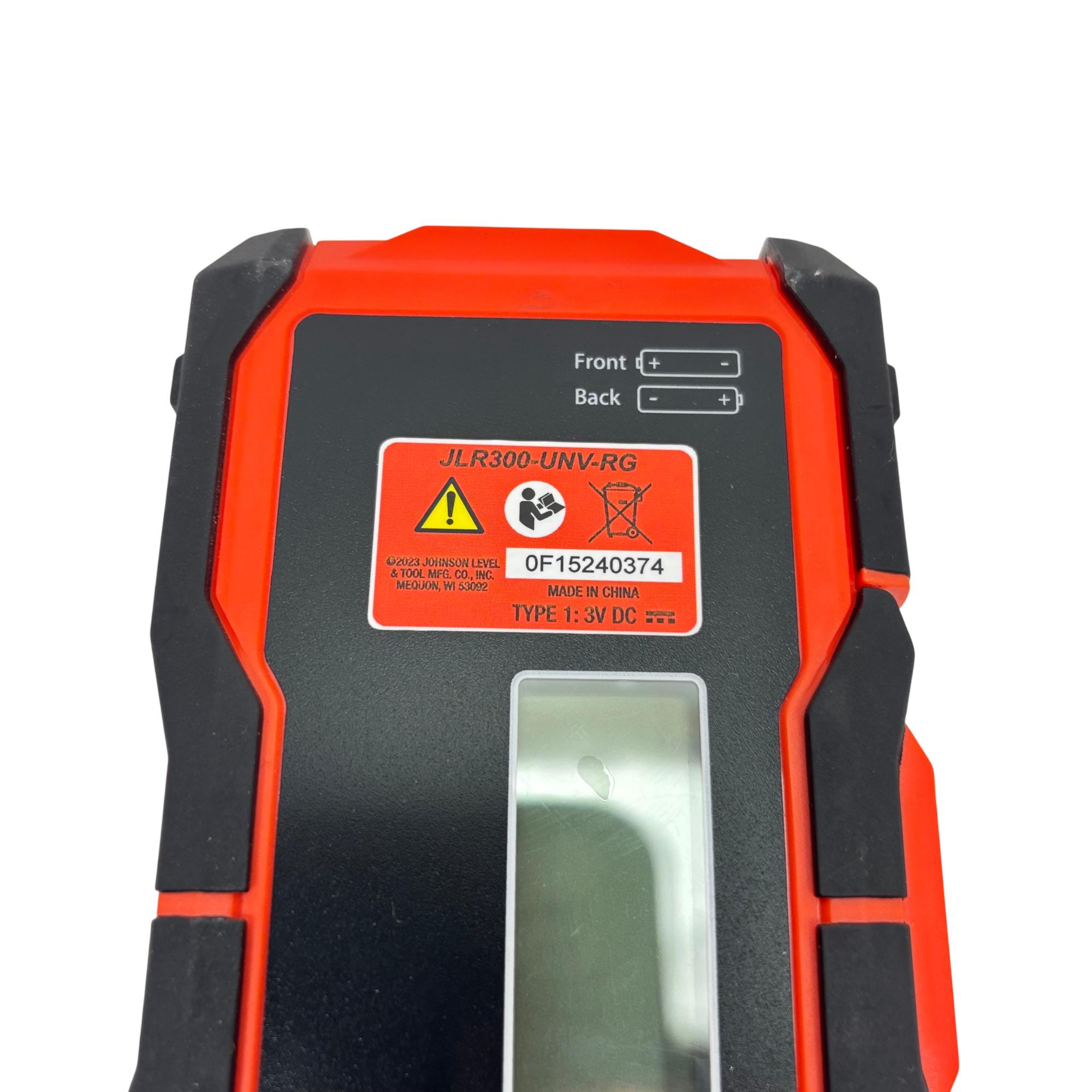 Johnson Level & Tool JLR300-UNV-RG Universal Laser Detector is a precision instrument designed to detect green and red laser beams for accurate leveling and alignment tasks. Featuring a black and red design with a red detection wheel and push button, this tool offers clear laser visibility and easy operation. Its robust construction and versatile clamp make it suitable for various professional and DIY leveling applications.