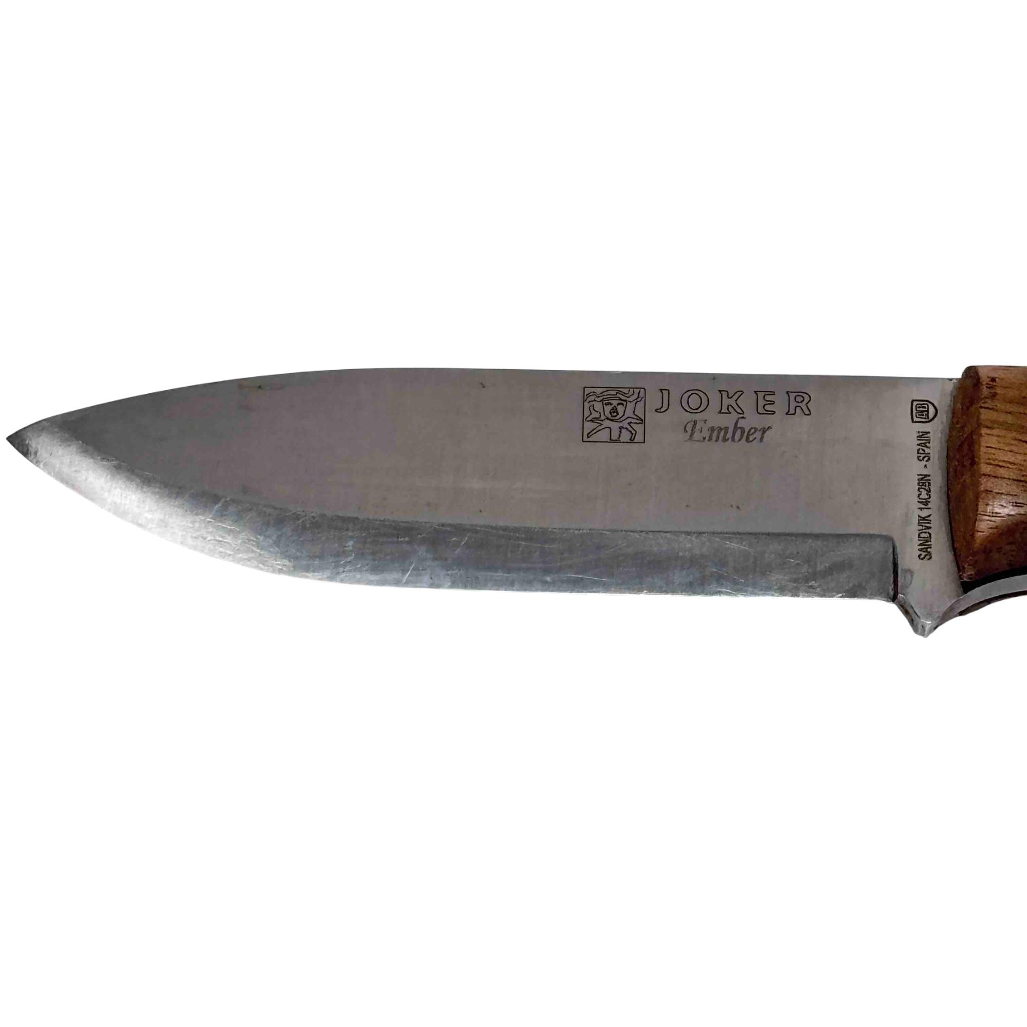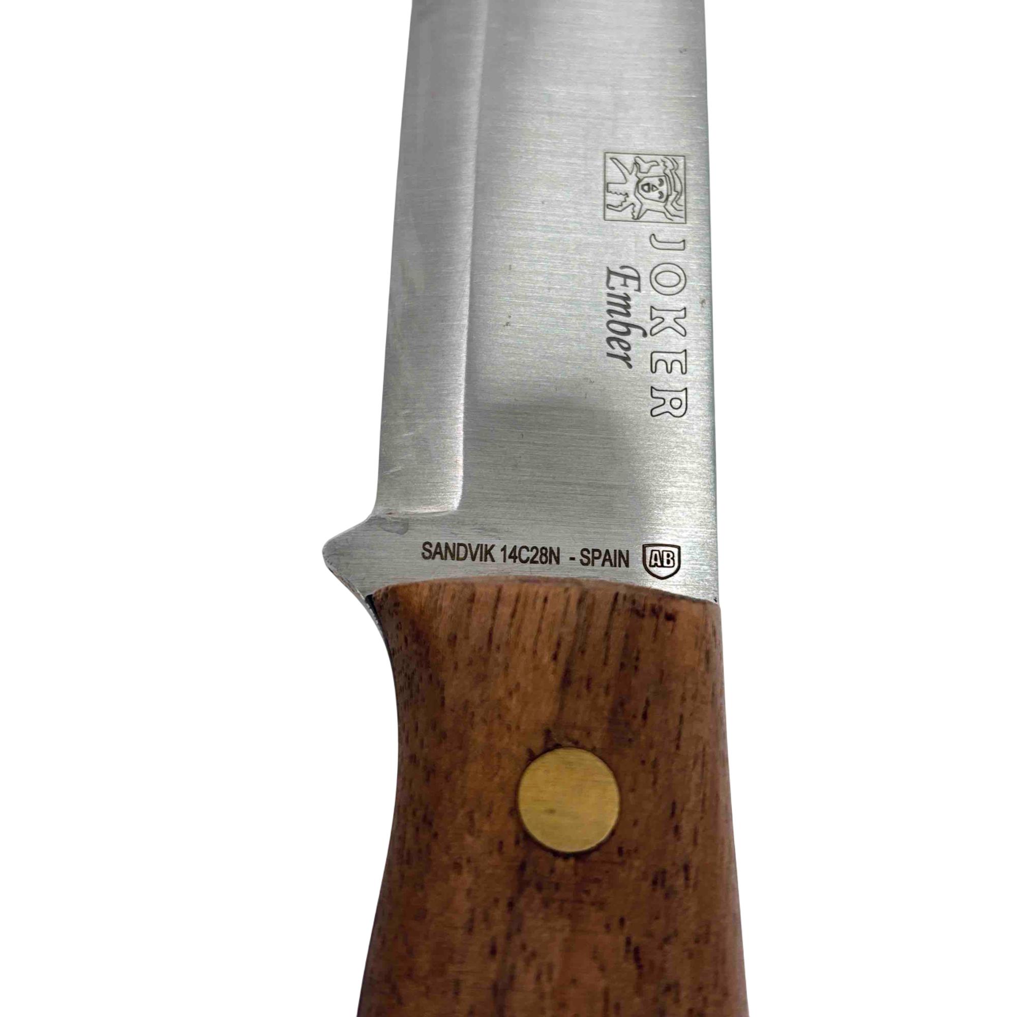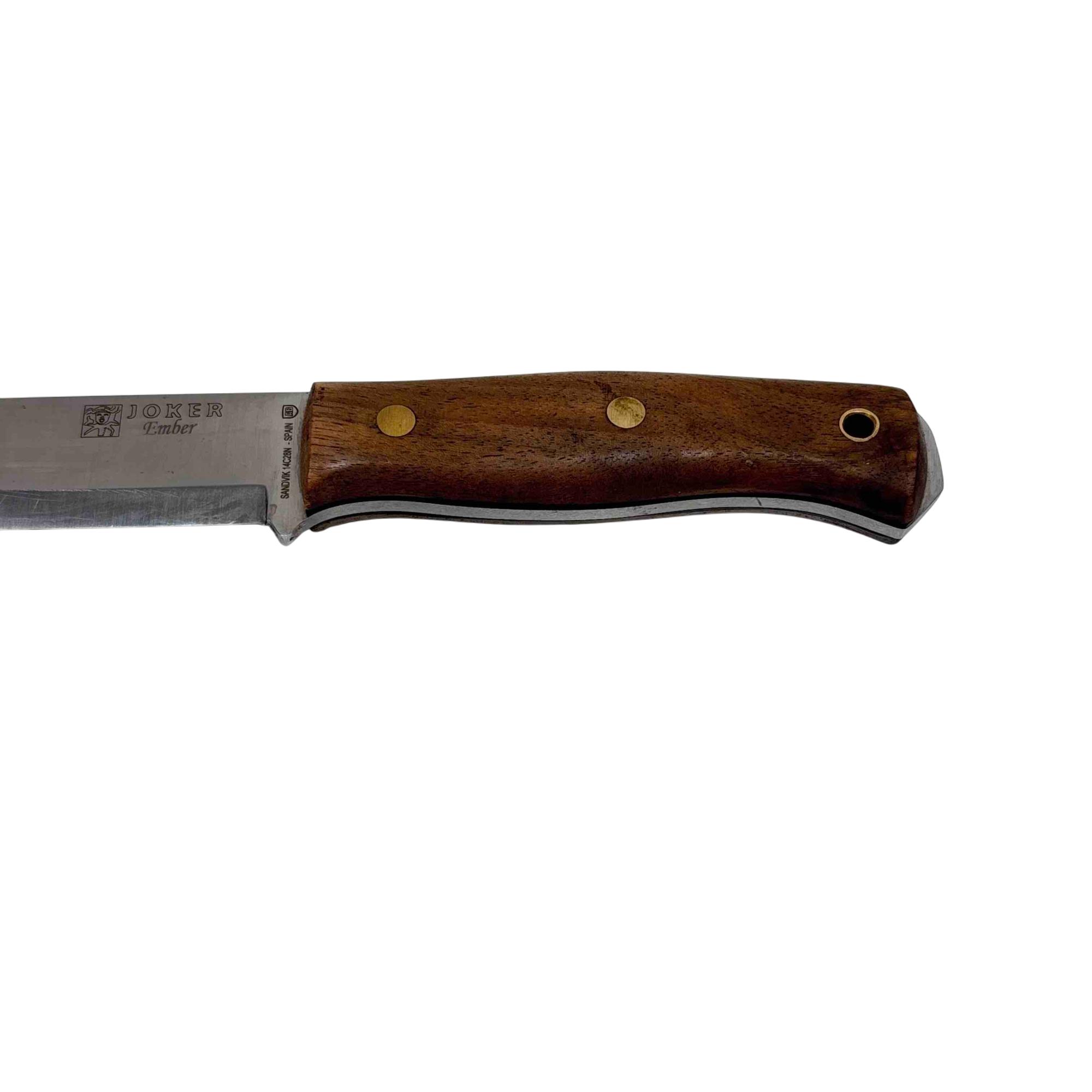 Discover the Joker Ember, a premium bushcraft and outdoor survival knife crafted in Spain with top-grade SANDVIK 14C28N stainless steel. Featuring a sturdy wooden handle with brass rivets and a custom-fit leather sheath, this fixed-blade knife is perfect for outdoor adventures, camping, and bushcraft enthusiasts. Elevate your gear with a tool trusted for its durability, precision, and timeless style.