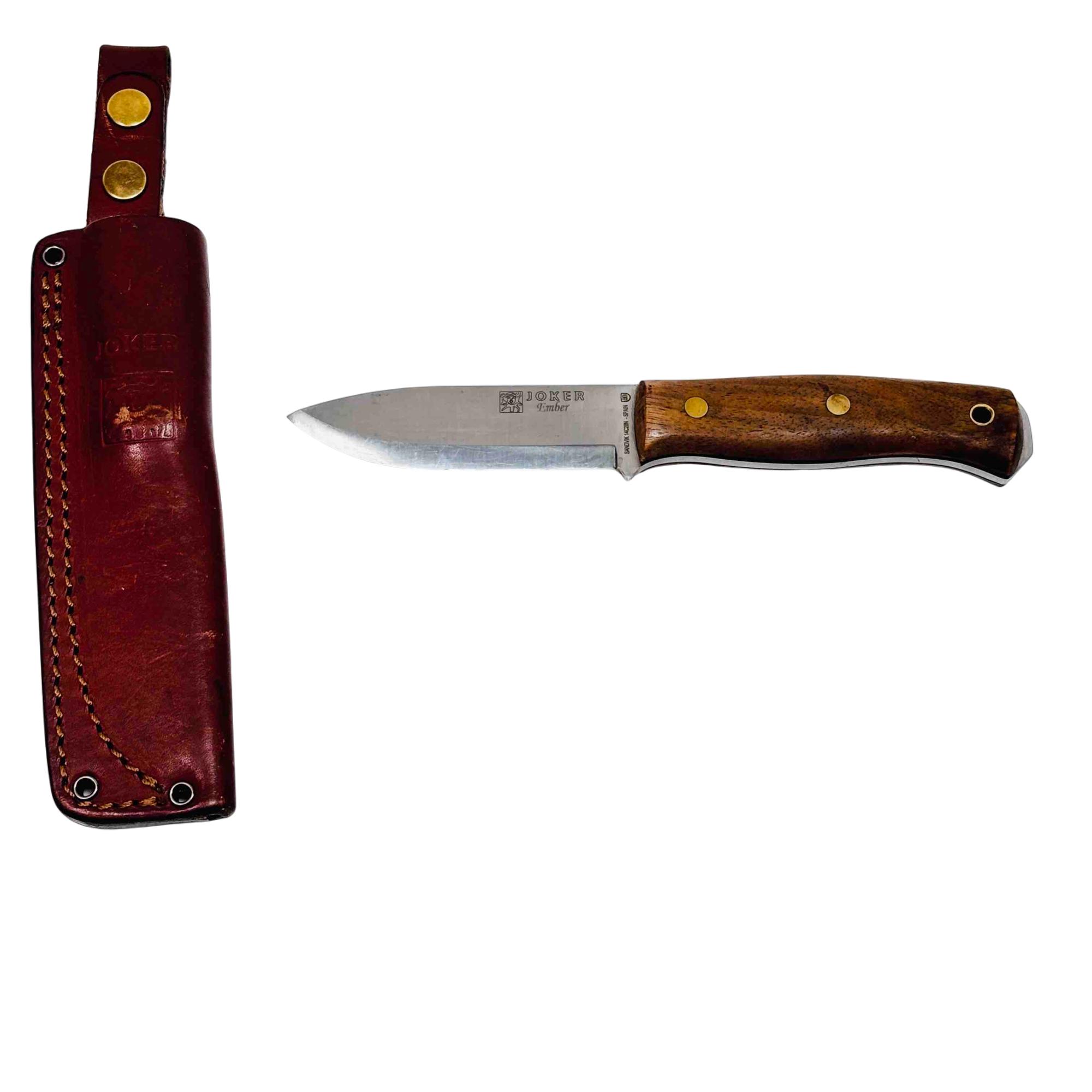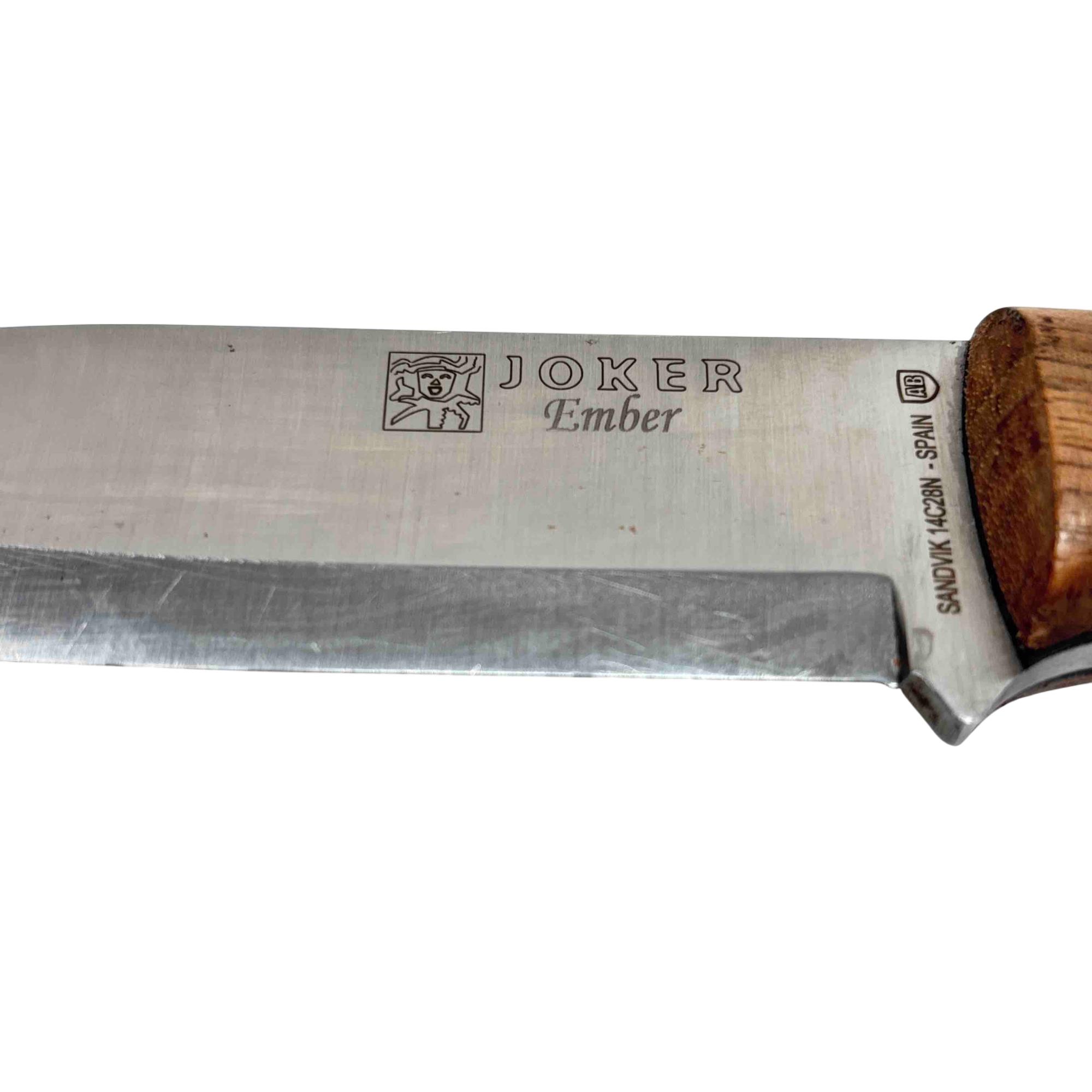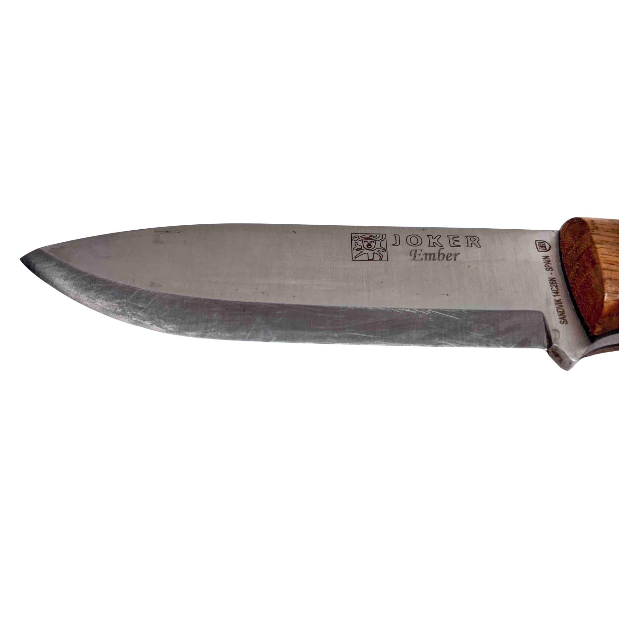 Discover the Joker Ember, a premium bushcraft and outdoor survival knife crafted in Spain with top-grade SANDVIK 14C28N stainless steel. Featuring a sturdy wooden handle with brass rivets and a custom-fit leather sheath, this fixed-blade knife is perfect for outdoor adventures, camping, and bushcraft enthusiasts. Elevate your gear with a tool trusted for its durability, precision, and timeless style.