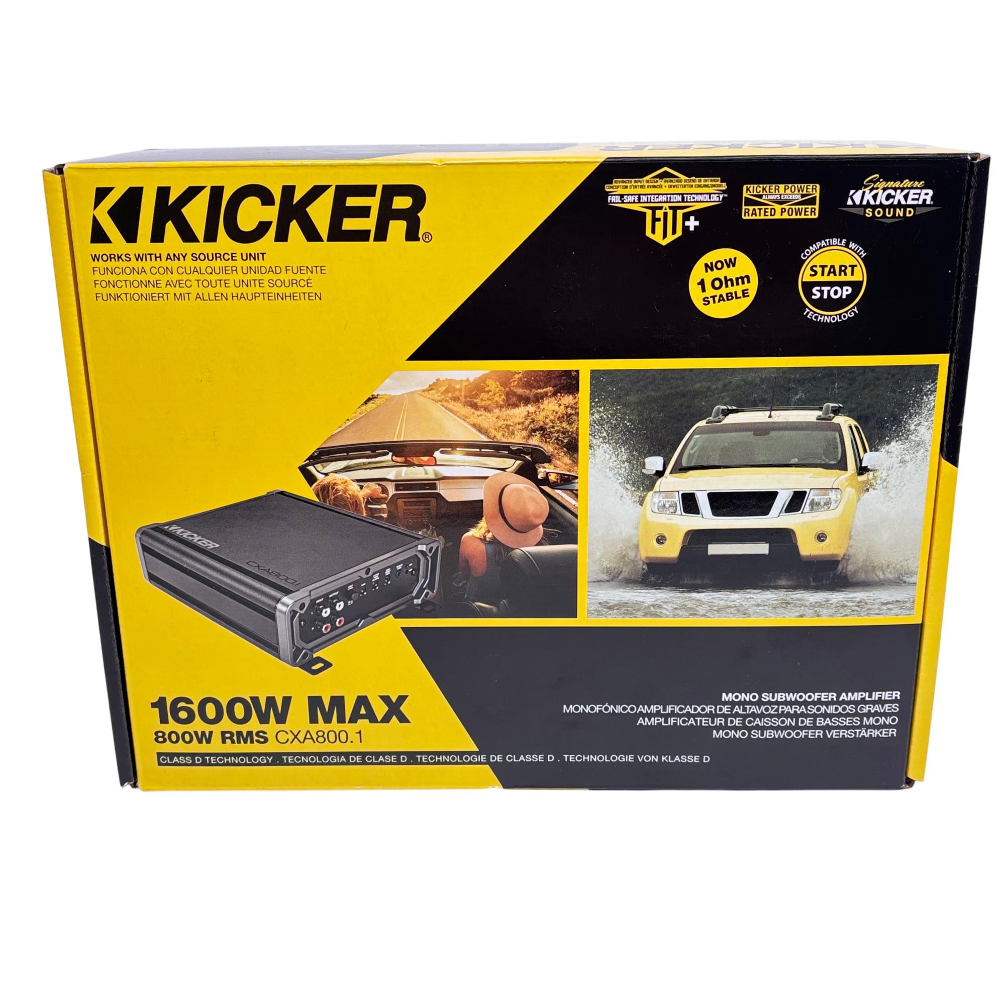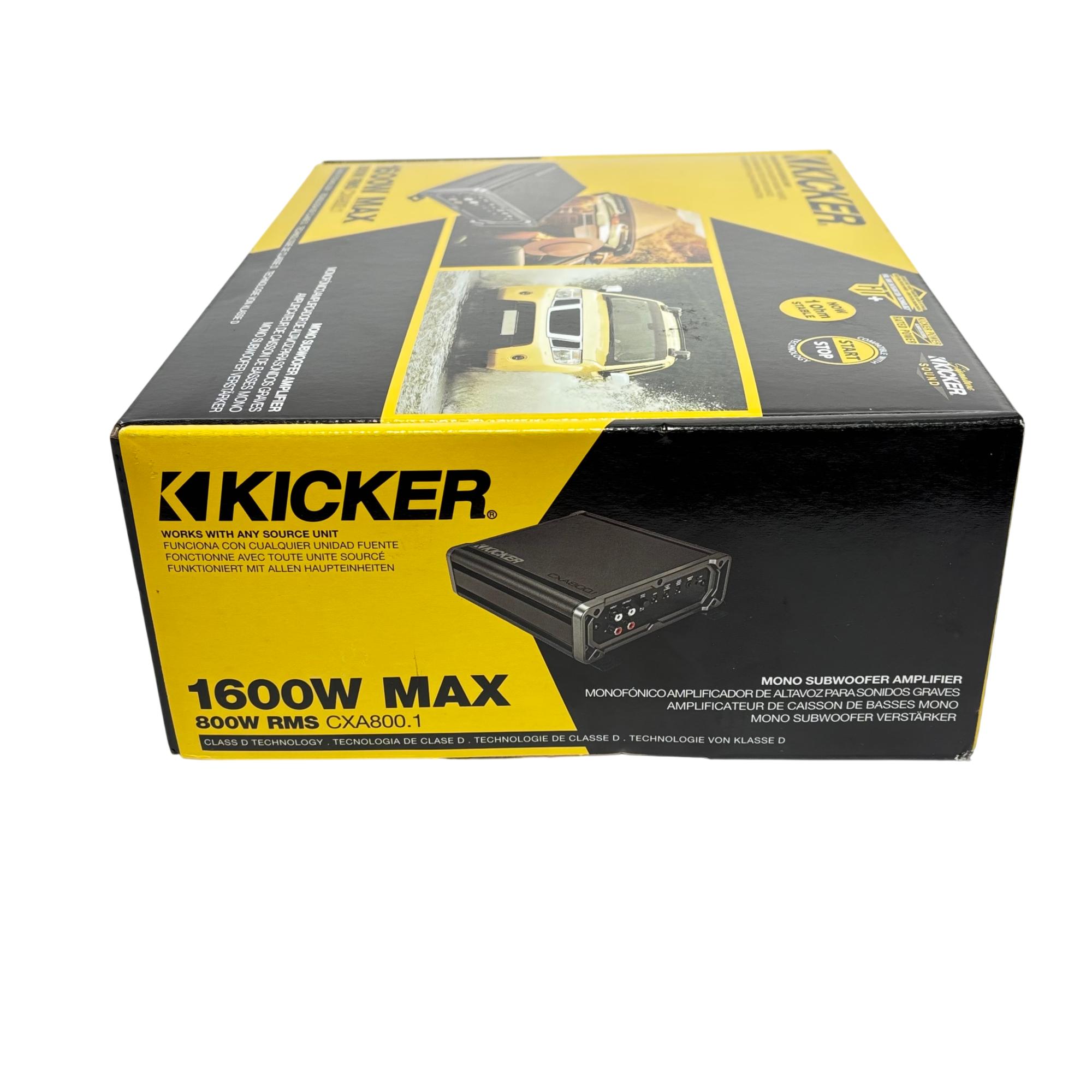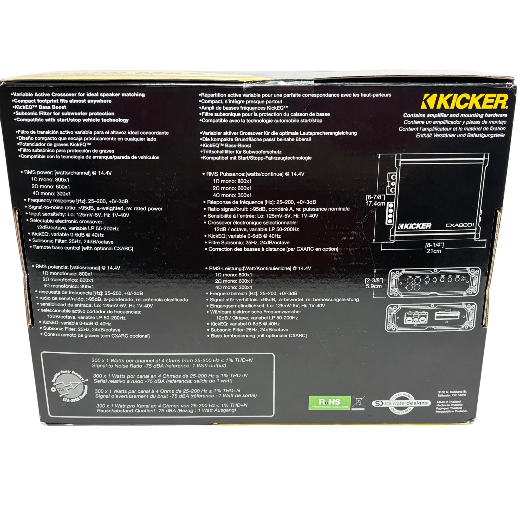 KICKER CXA800.1 Mono Subwoofer Amplifier delivers powerful 800 watts RMS and 1600 watts maximum output using advanced Class D technology for superior efficiency and sound quality. It features a variable active crossover and KickEQ bass boost for precise speaker matching and enhanced low-frequency performance, making it compatible with any source unit and designed to fit compact spaces.