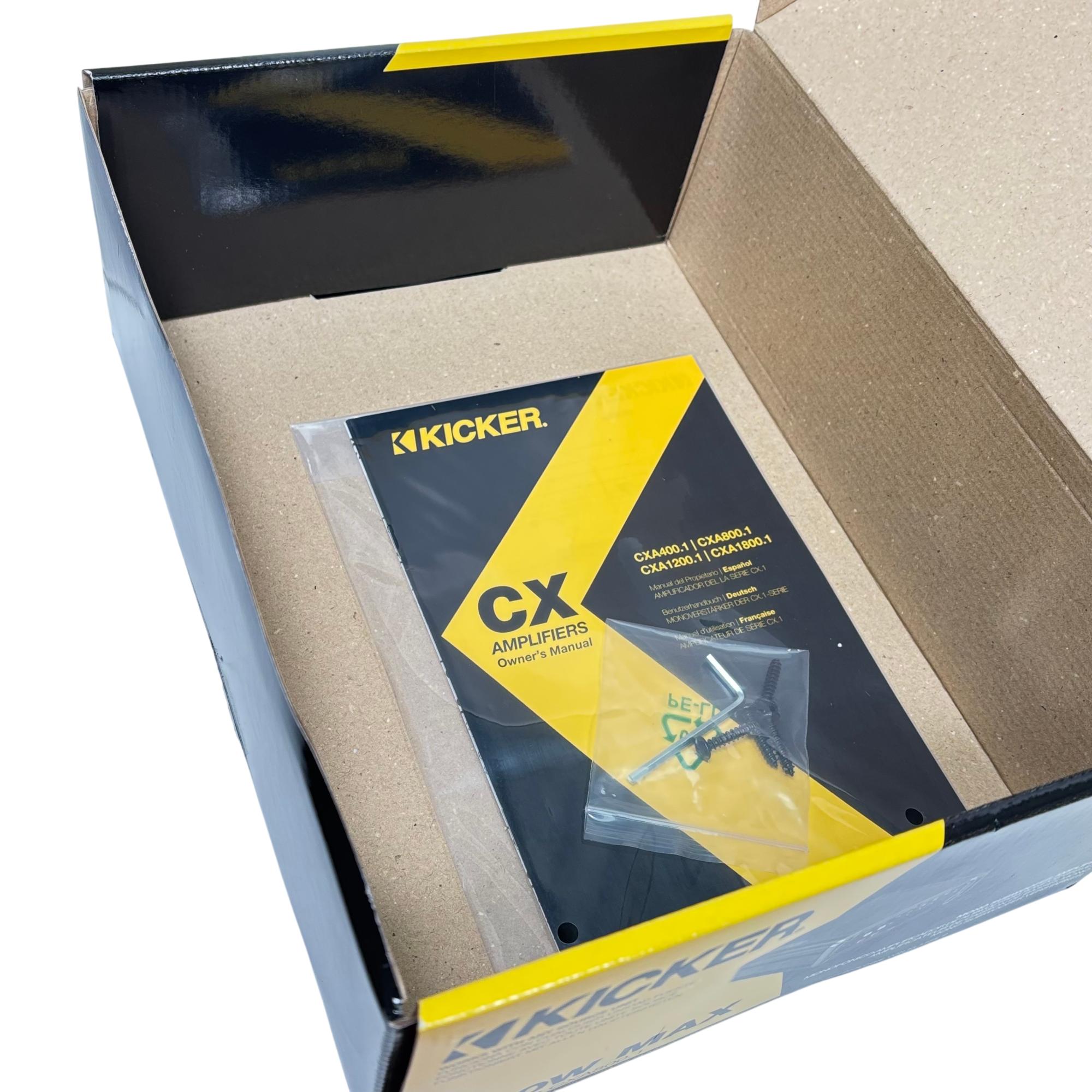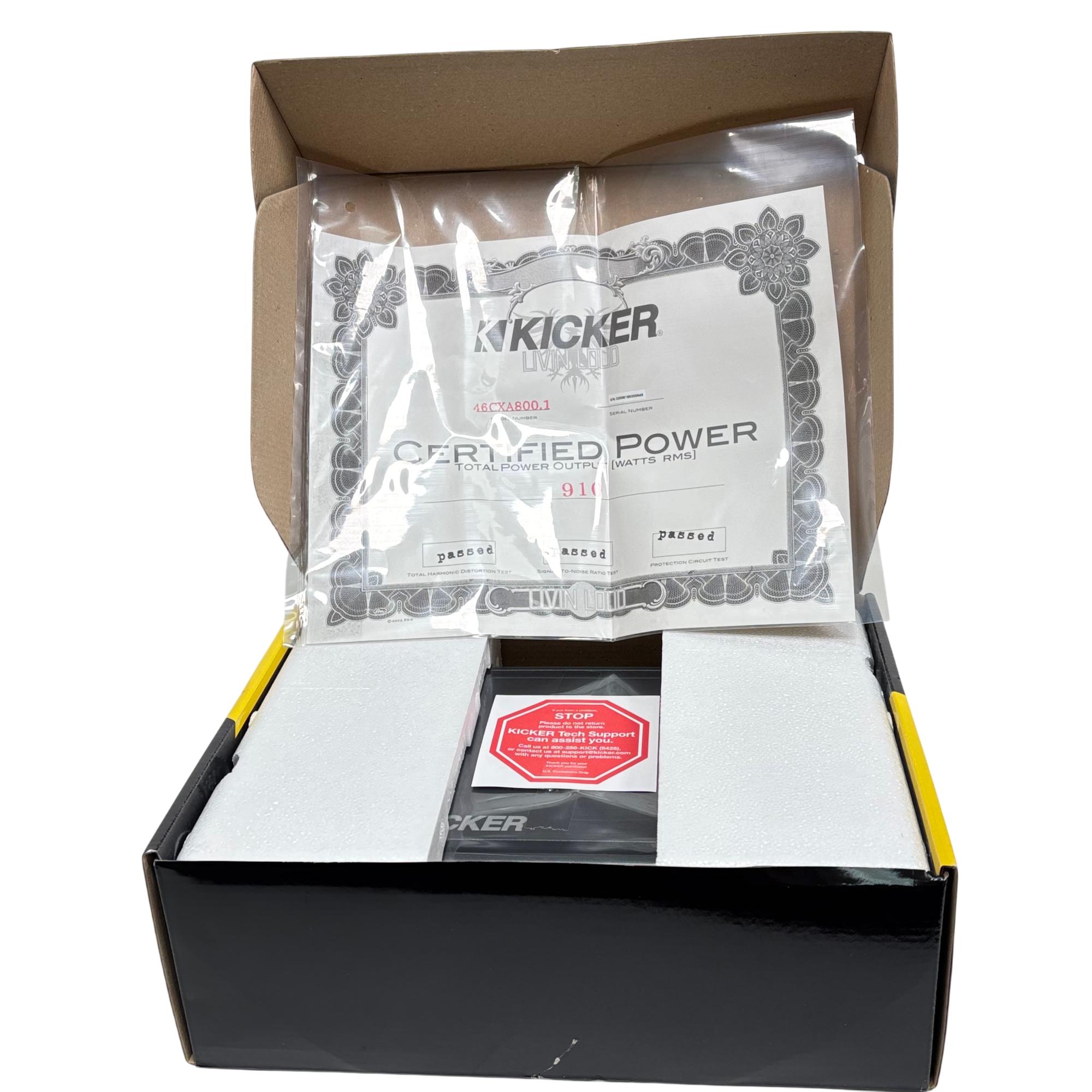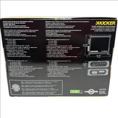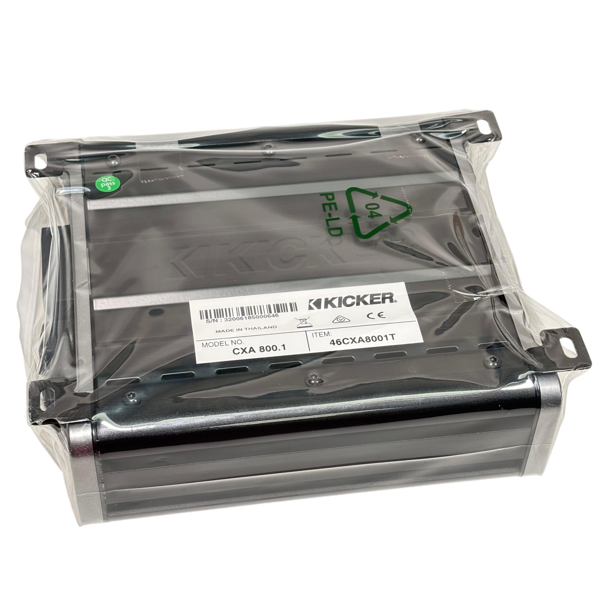KICKER CXA800.1 Mono Subwoofer Amplifier delivers powerful 800 watts RMS and 1600 watts maximum output using advanced Class D technology for superior efficiency and sound quality. It features a variable active crossover and KickEQ bass boost for precise speaker matching and enhanced low-frequency performance, making it compatible with any source unit and designed to fit compact spaces.