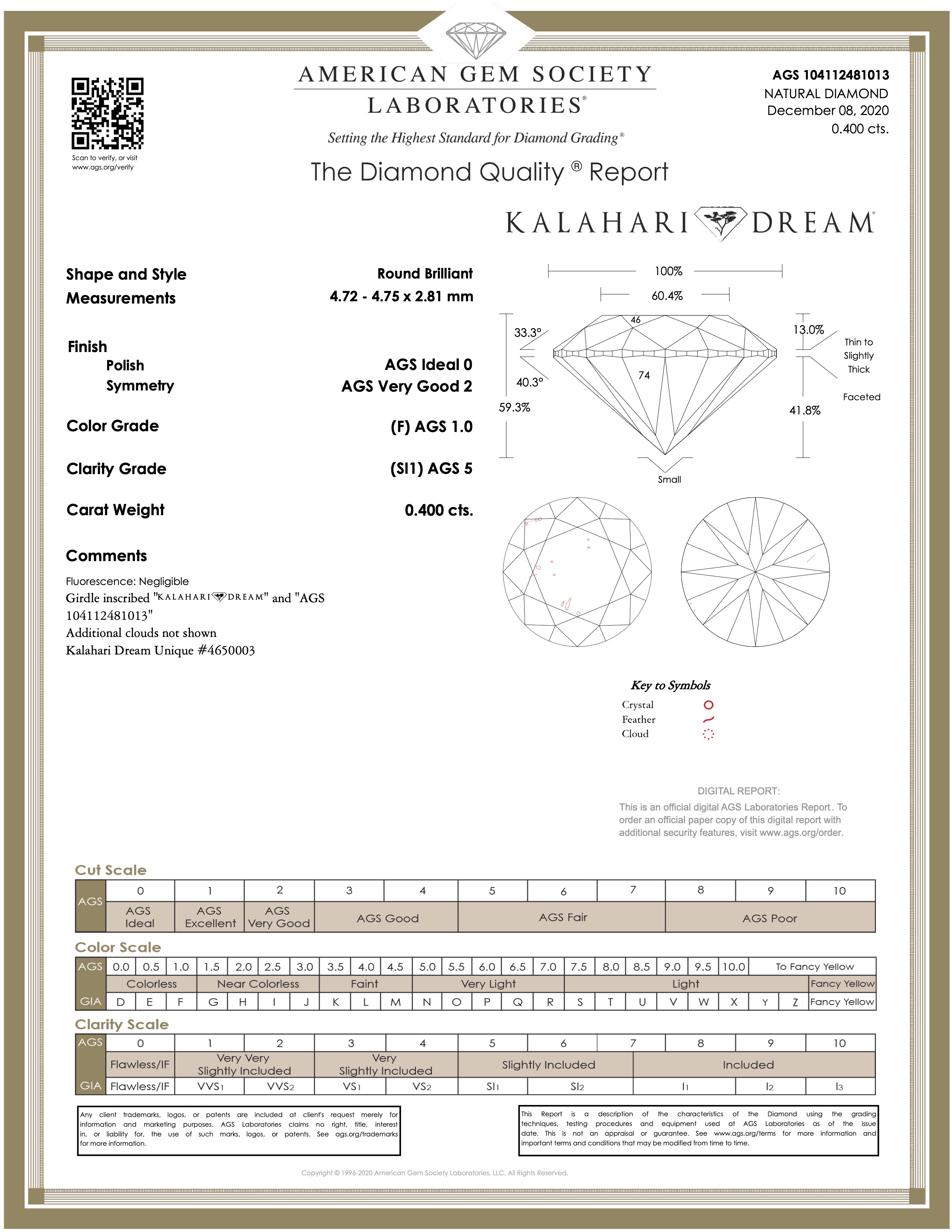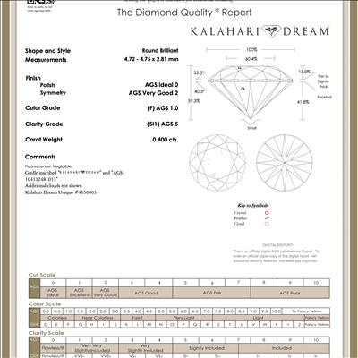 The primary diamond is laserscribed with "Kalahari Dream" and "AGS 104112481813" on the girdle.