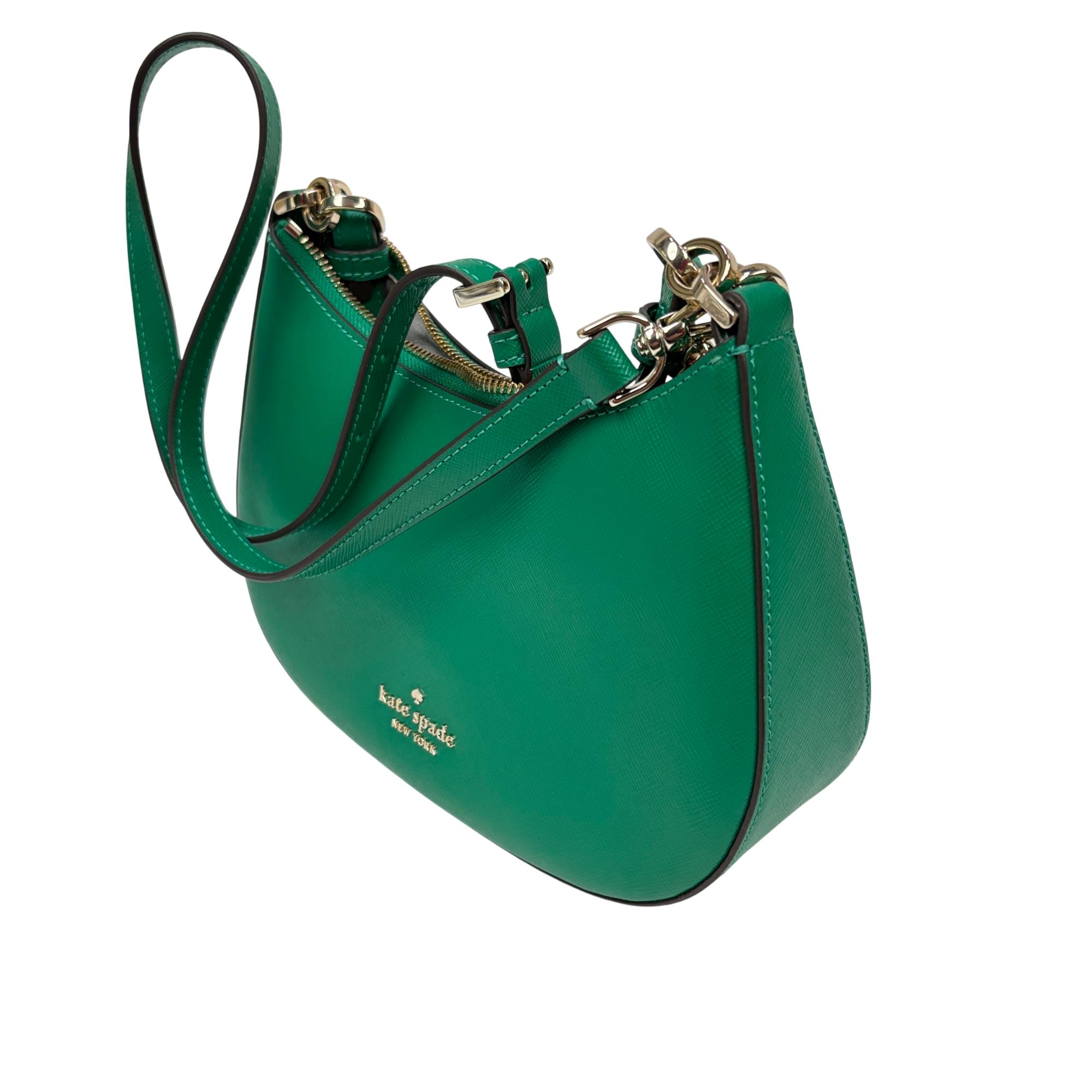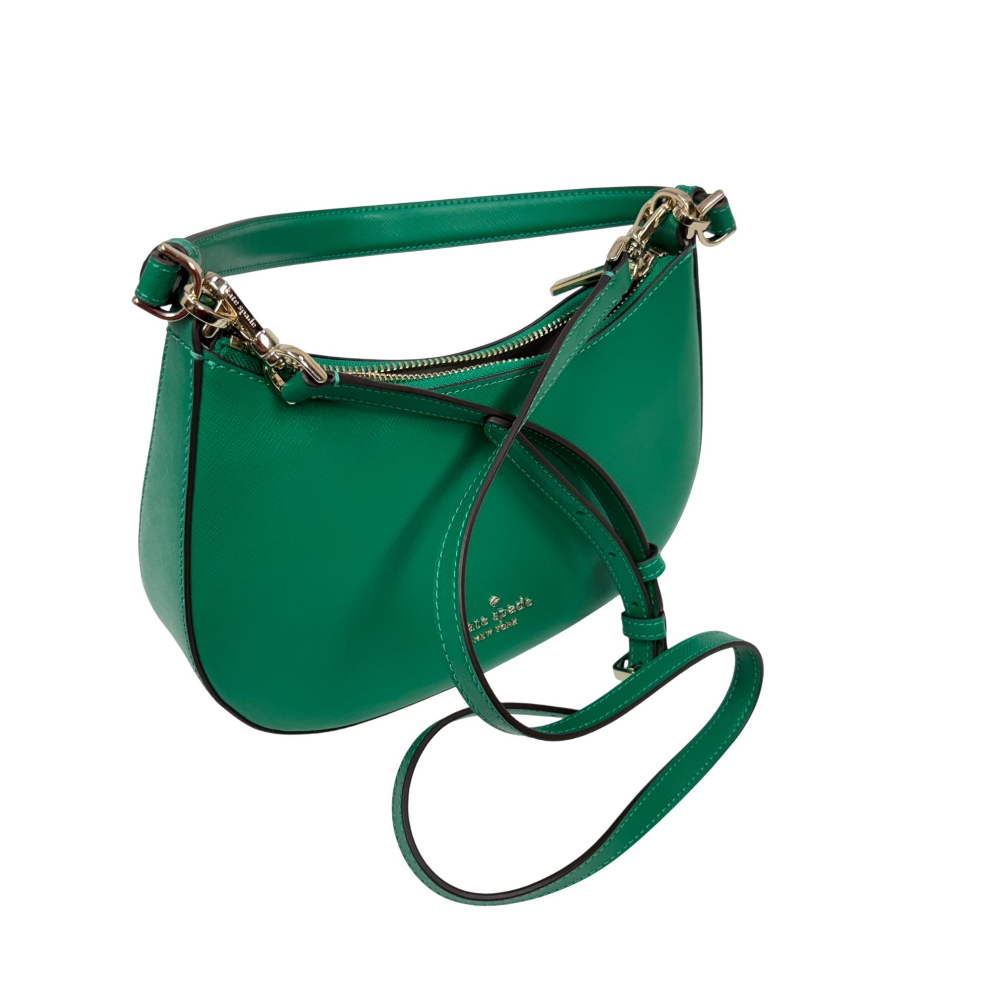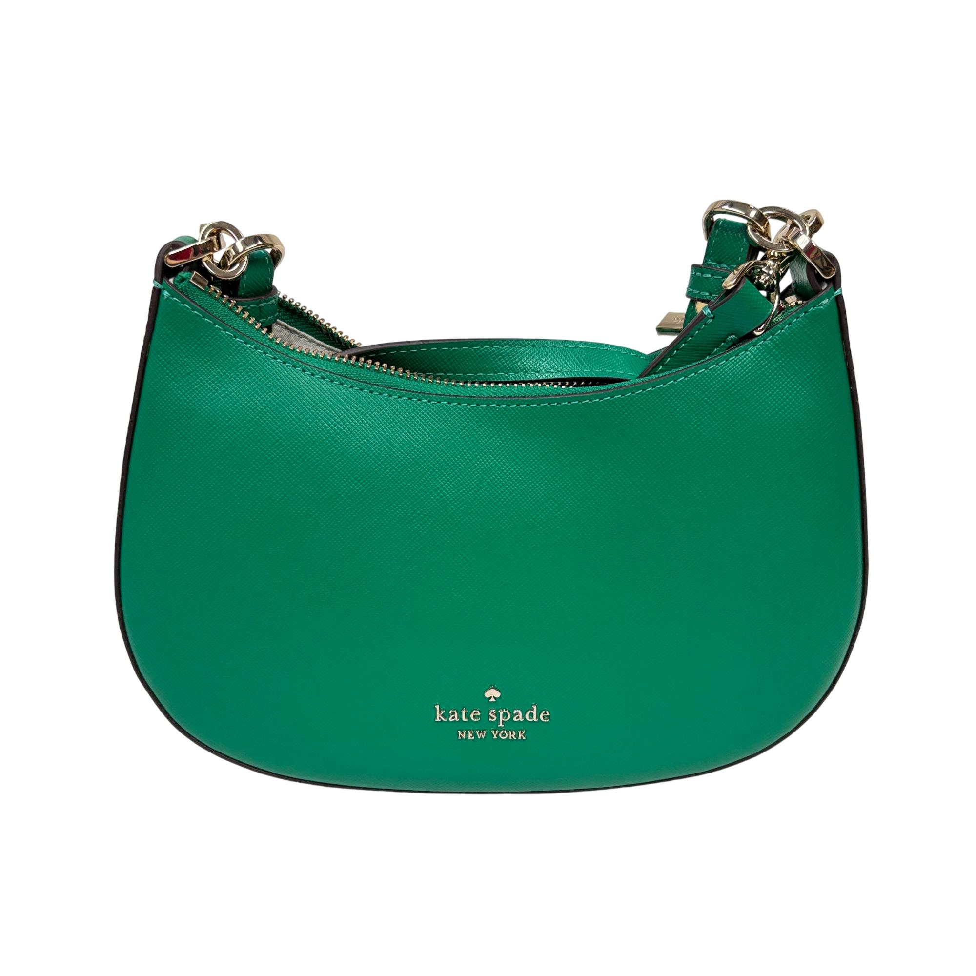 This Kate Spade New York Stacy Saffiano Leather Convertible Shoulder Bag in green features a sleek design crafted from textured leather with gold accents. This versatile shoulder bag offers a convertible strap for multiple carrying styles, combining practical functionality with refined elegance. Its rich green color and detailed stitching make it a standout fashion accessory for everyday use.