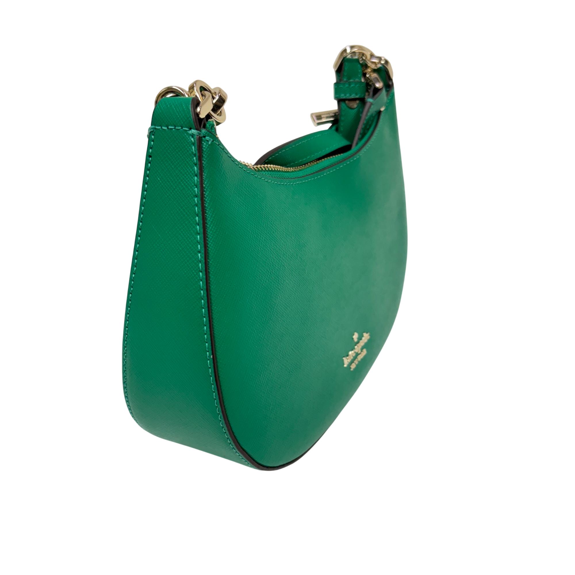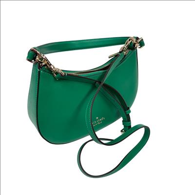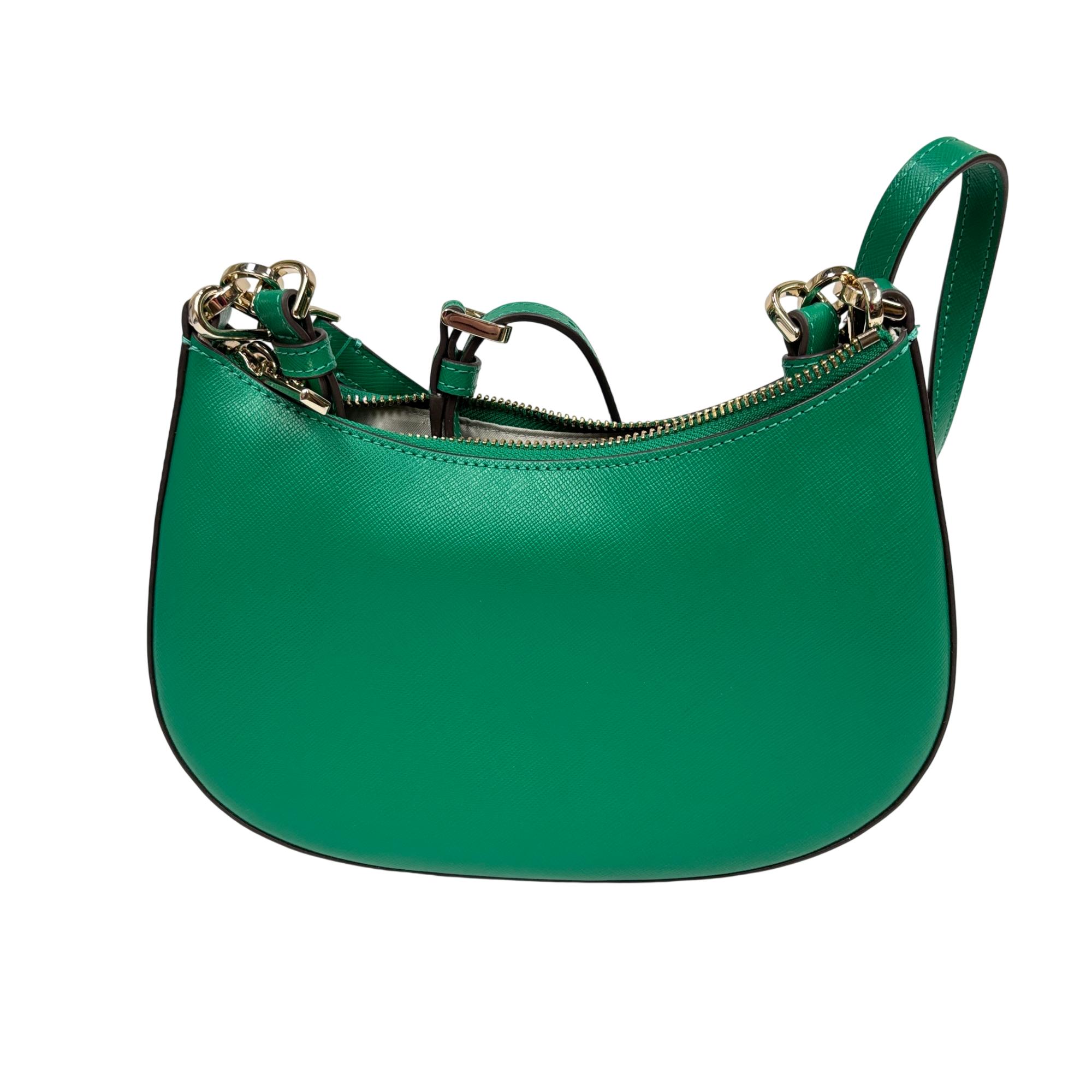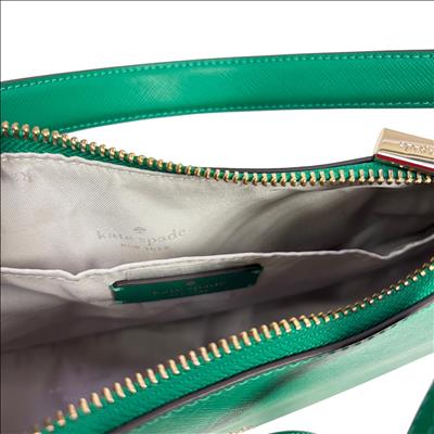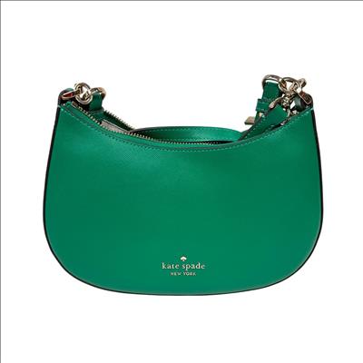 This Kate Spade New York Stacy Saffiano Leather Convertible Shoulder Bag in green features a sleek design crafted from textured leather with gold accents. This versatile shoulder bag offers a convertible strap for multiple carrying styles, combining practical functionality with refined elegance. Its rich green color and detailed stitching make it a standout fashion accessory for everyday use.