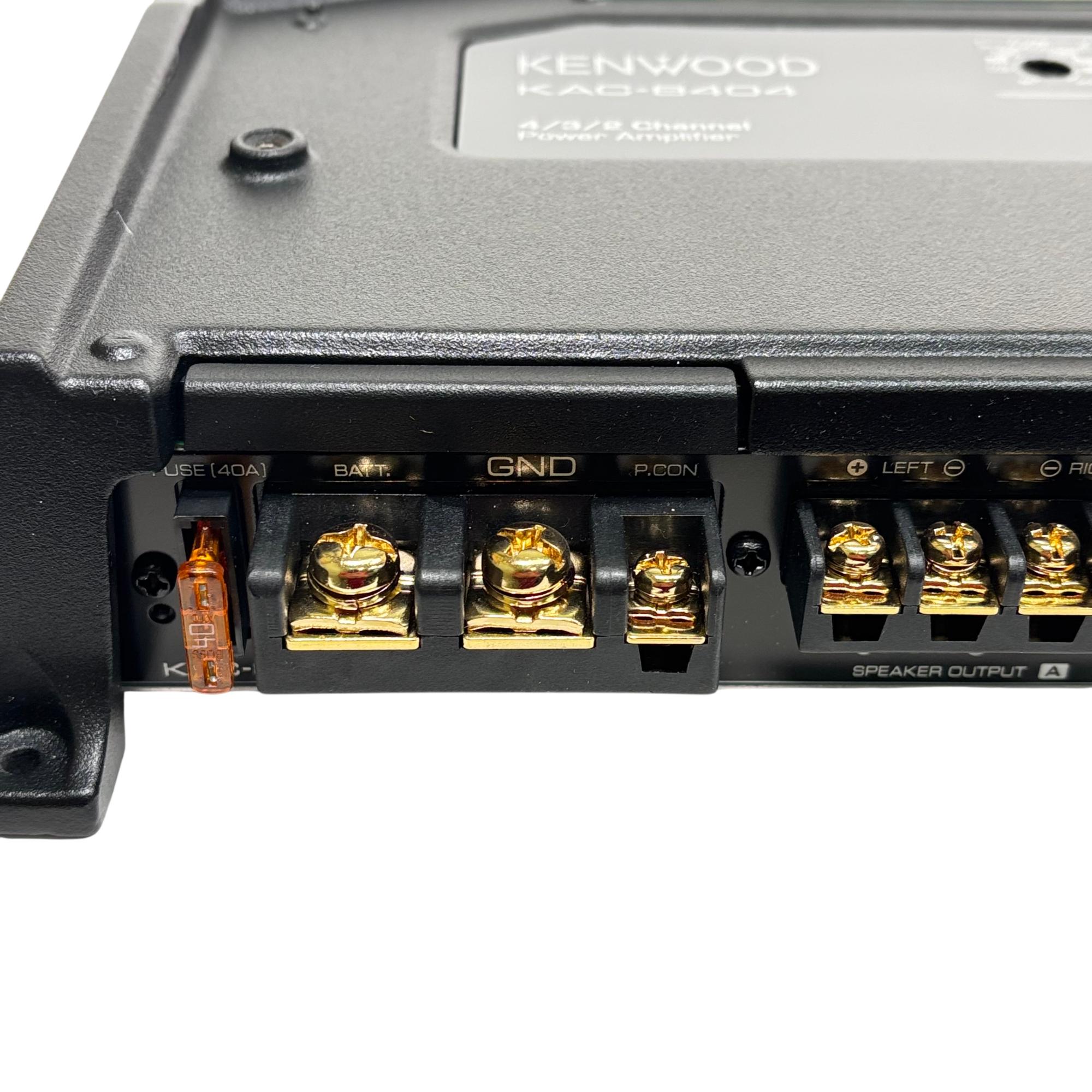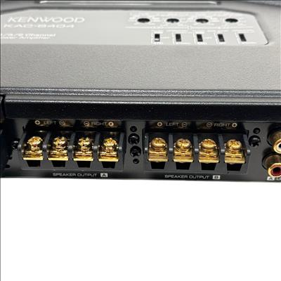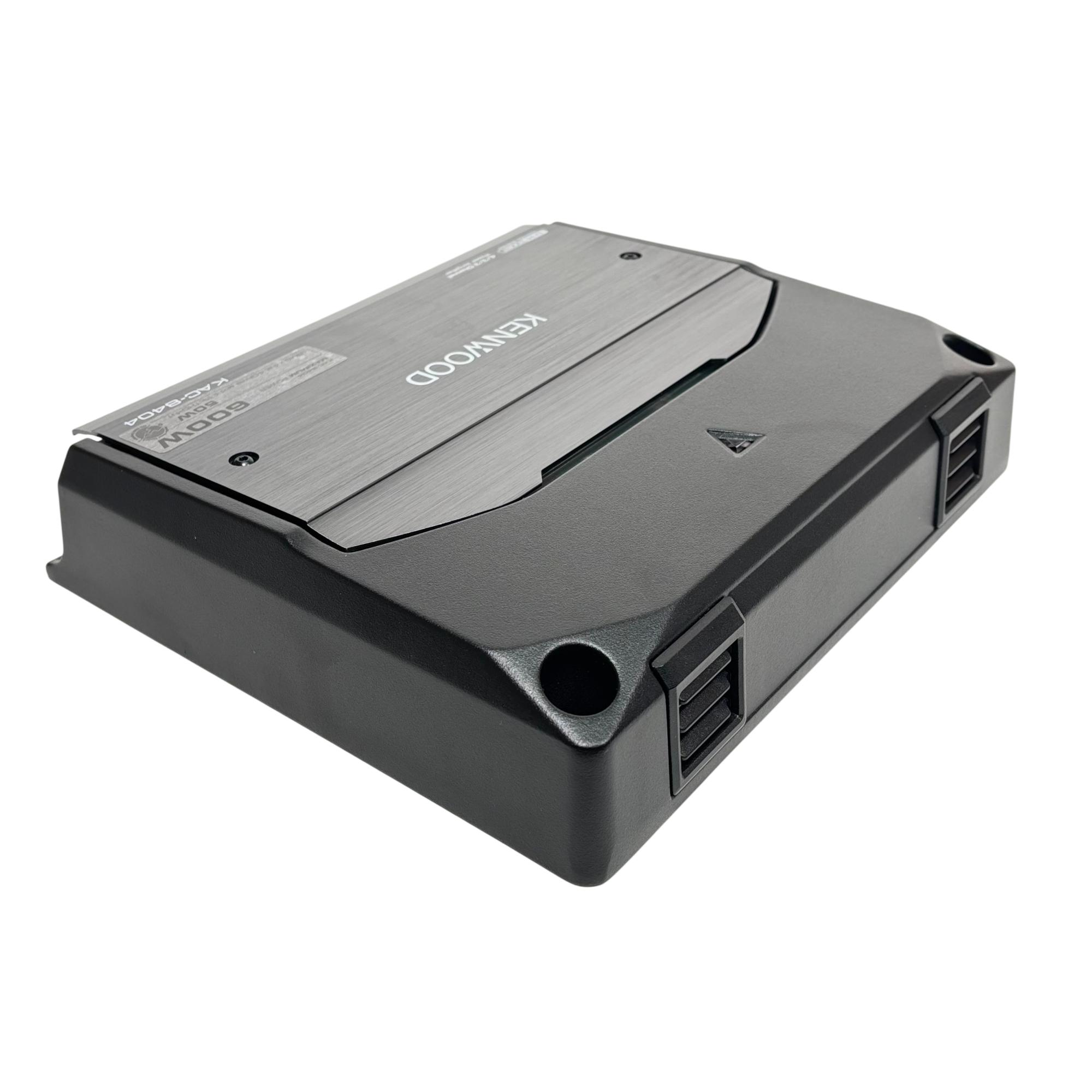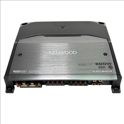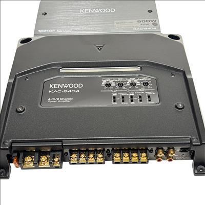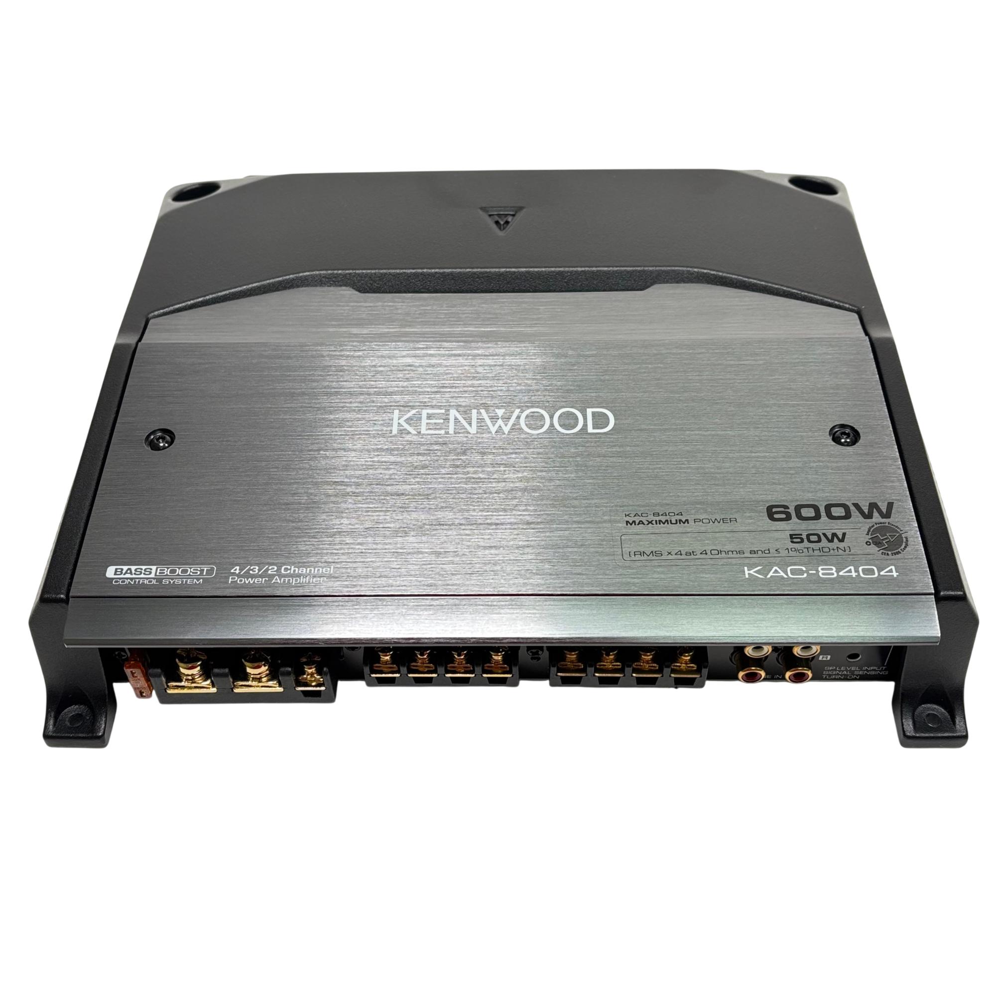 Kenwood KAC-8404 4/3/2 Channel Power Amplifier 600W delivers versatile audio power with 50 watts RMS across four channels at 4 ohms and less than 1% total harmonic distortion plus noise. This high-performance amplifier features power MOS-FET switching technology, speaker level input, and supports 2 ohm load capability, ensuring reliable sound amplification for various car audio setups.