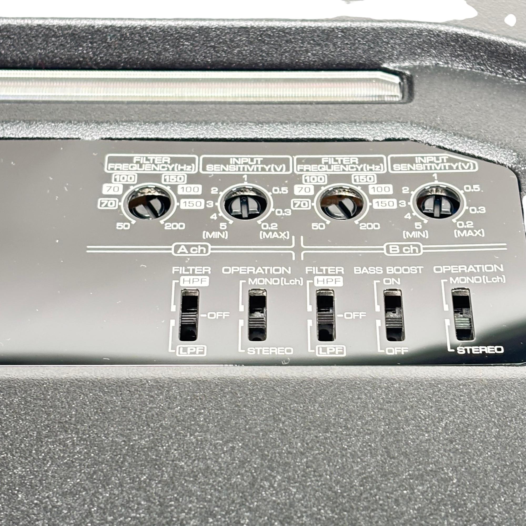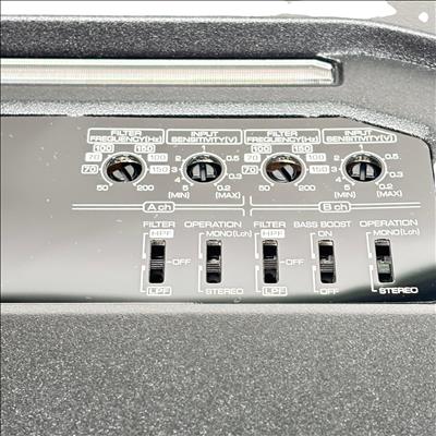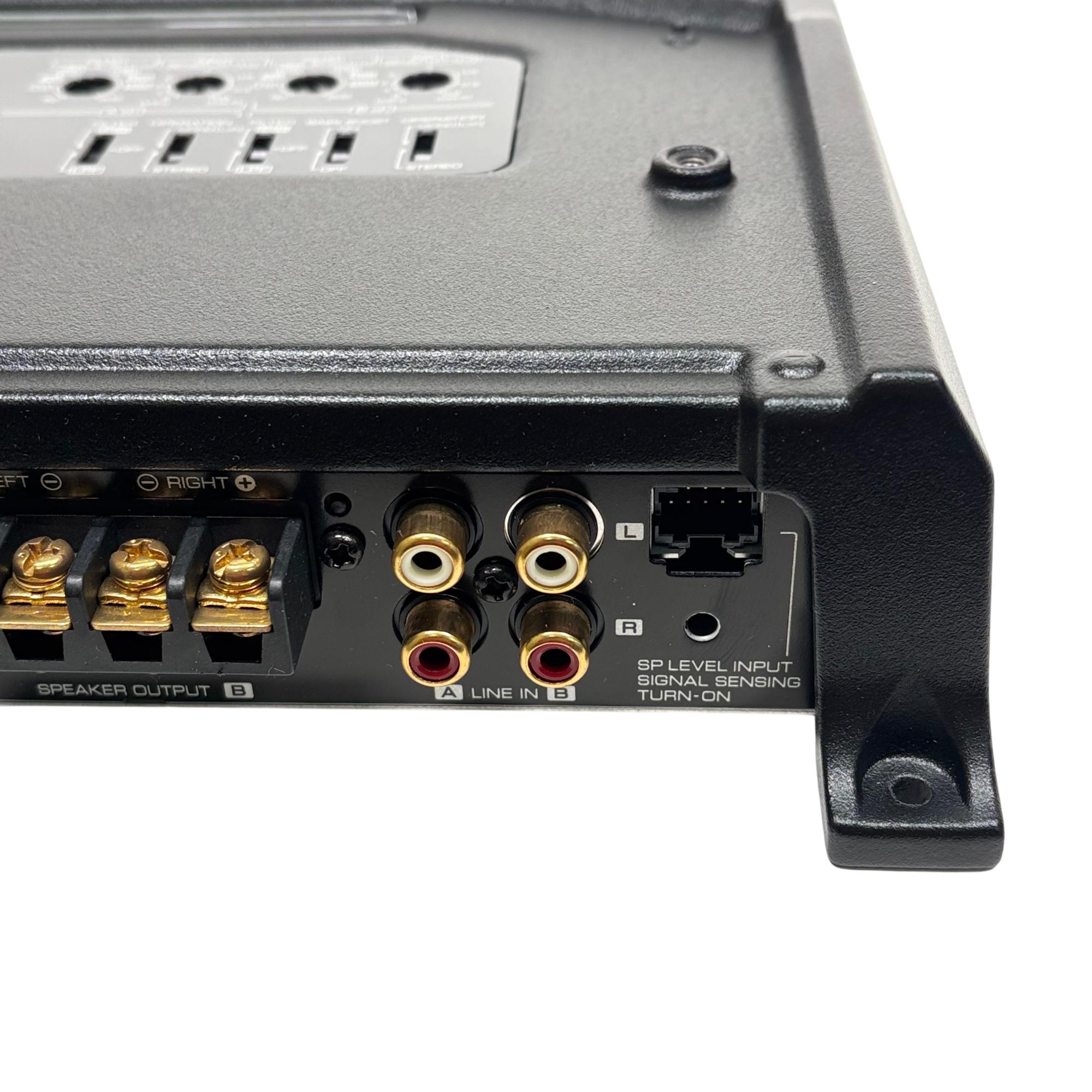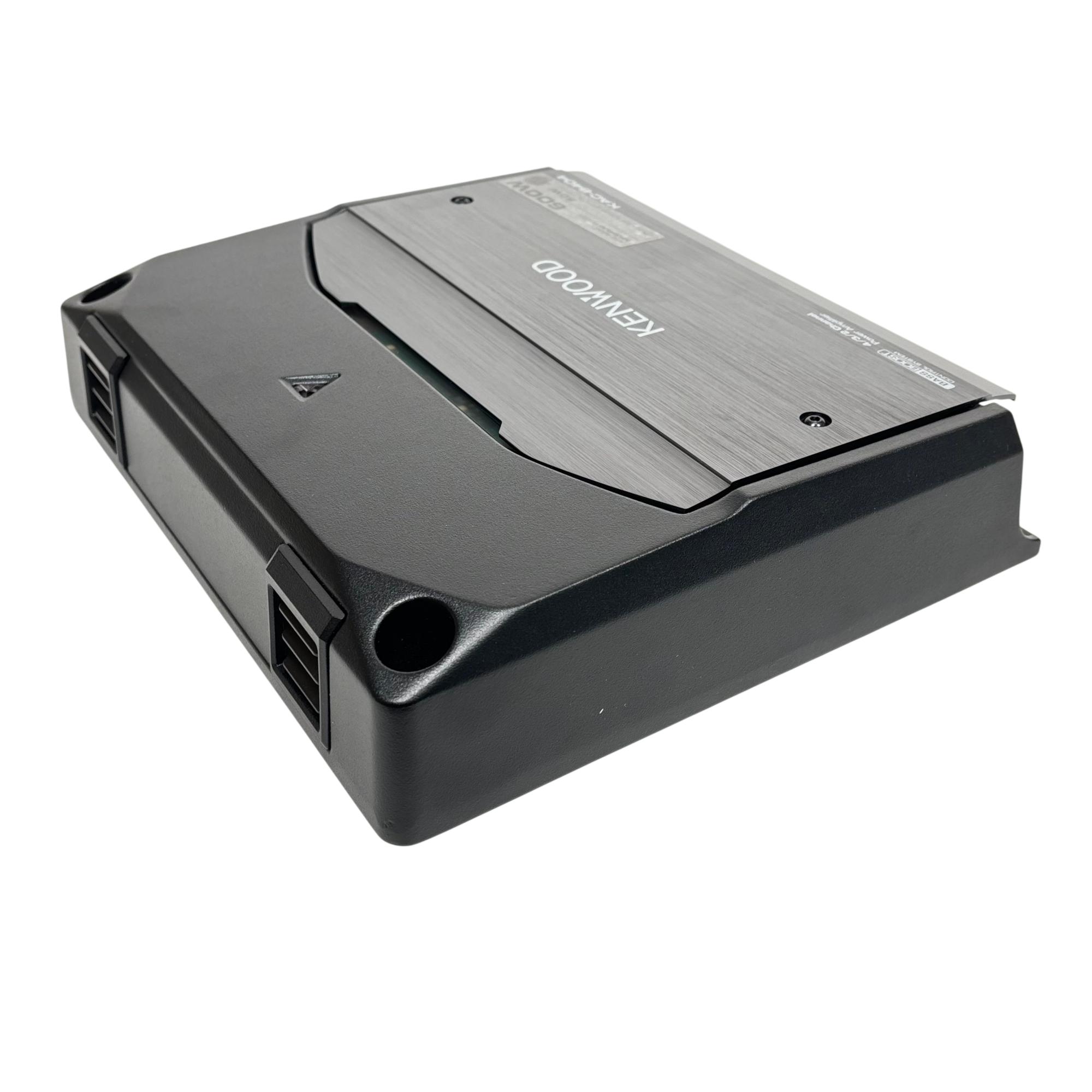 Kenwood KAC-8404 4/3/2 Channel Power Amplifier 600W delivers versatile audio power with 50 watts RMS across four channels at 4 ohms and less than 1% total harmonic distortion plus noise. This high-performance amplifier features power MOS-FET switching technology, speaker level input, and supports 2 ohm load capability, ensuring reliable sound amplification for various car audio setups.