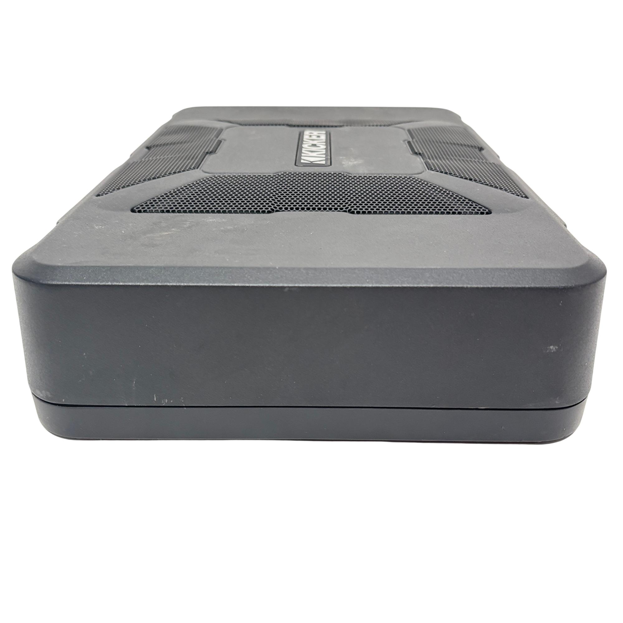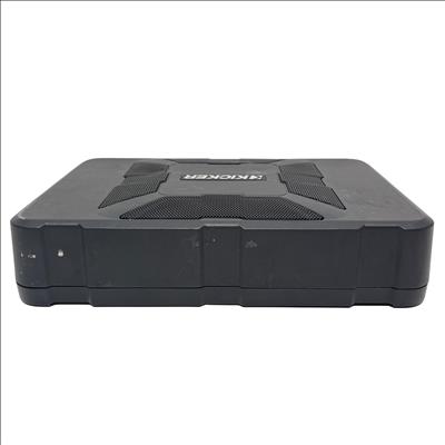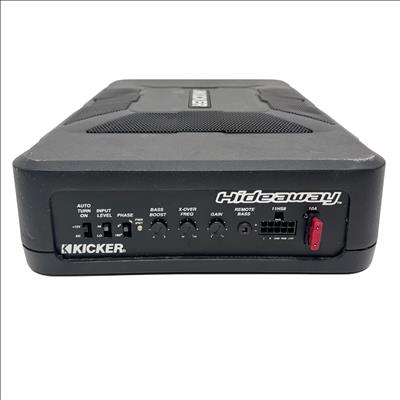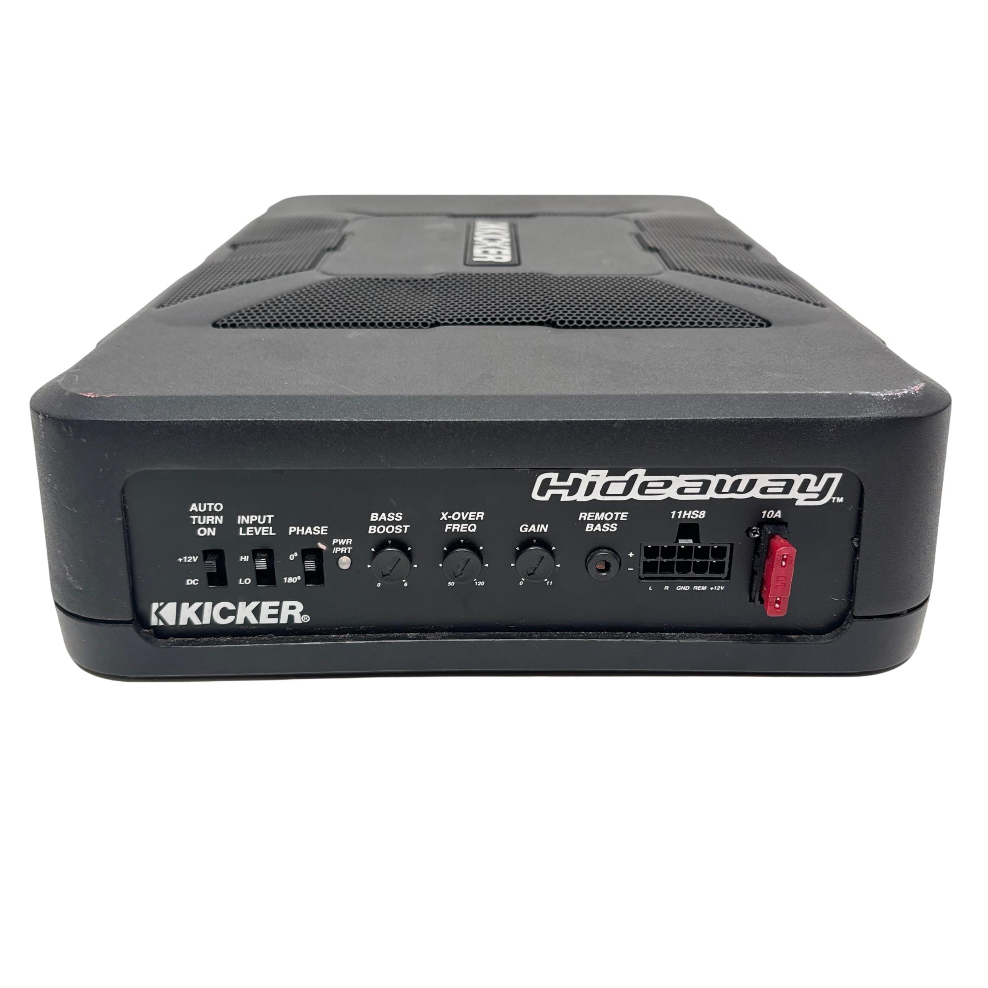 Kicker 11HS8 Hideaway 8" 150W Compact Powered Car Subwoofer features a sleek, low-profile design ideal for under-seat installation in vehicles. This powered subwoofer delivers powerful bass with customizable controls including bass boost, crossover frequency, and phase adjustment, enhancing in-car audio performance while maintaining a compact footprint for versatile placement.