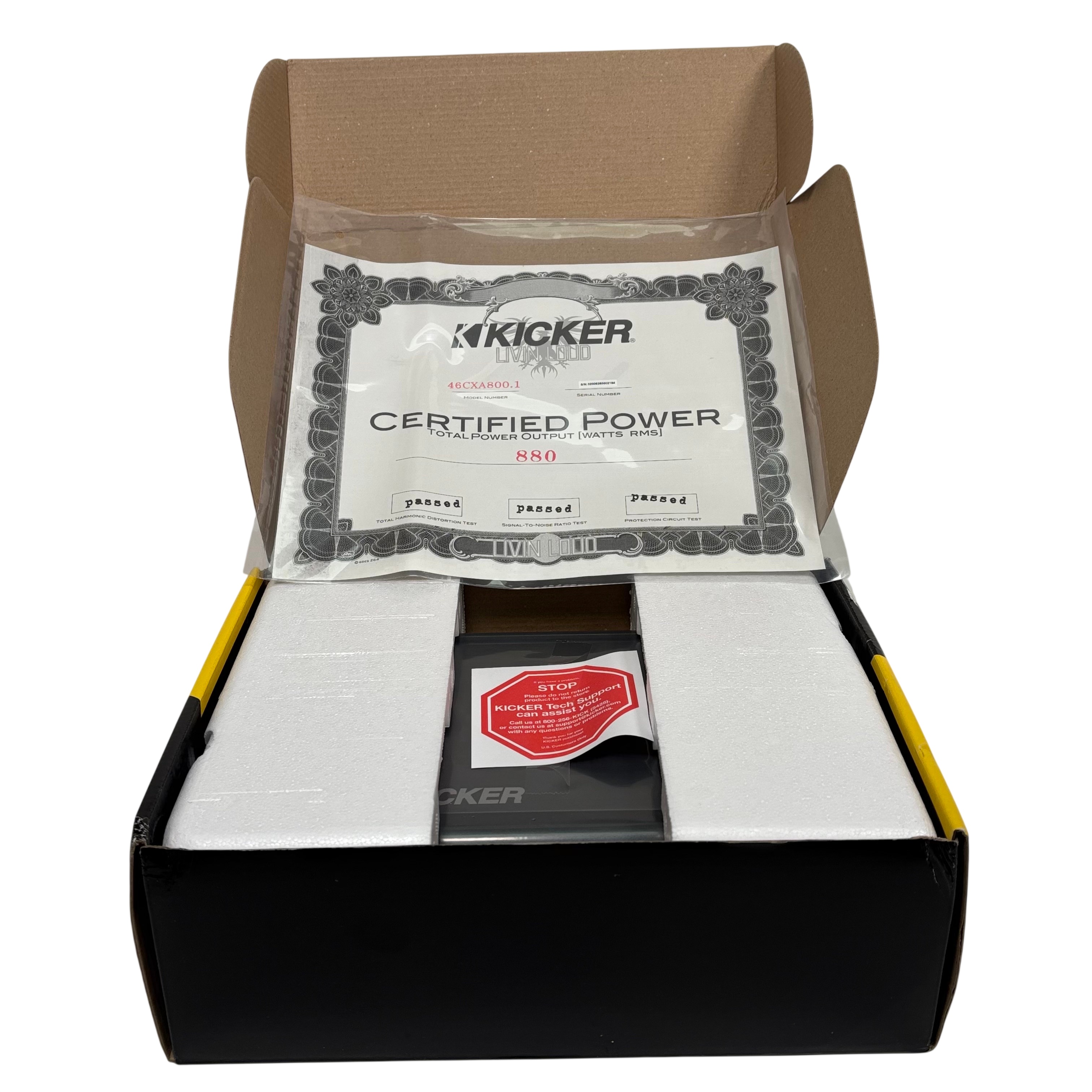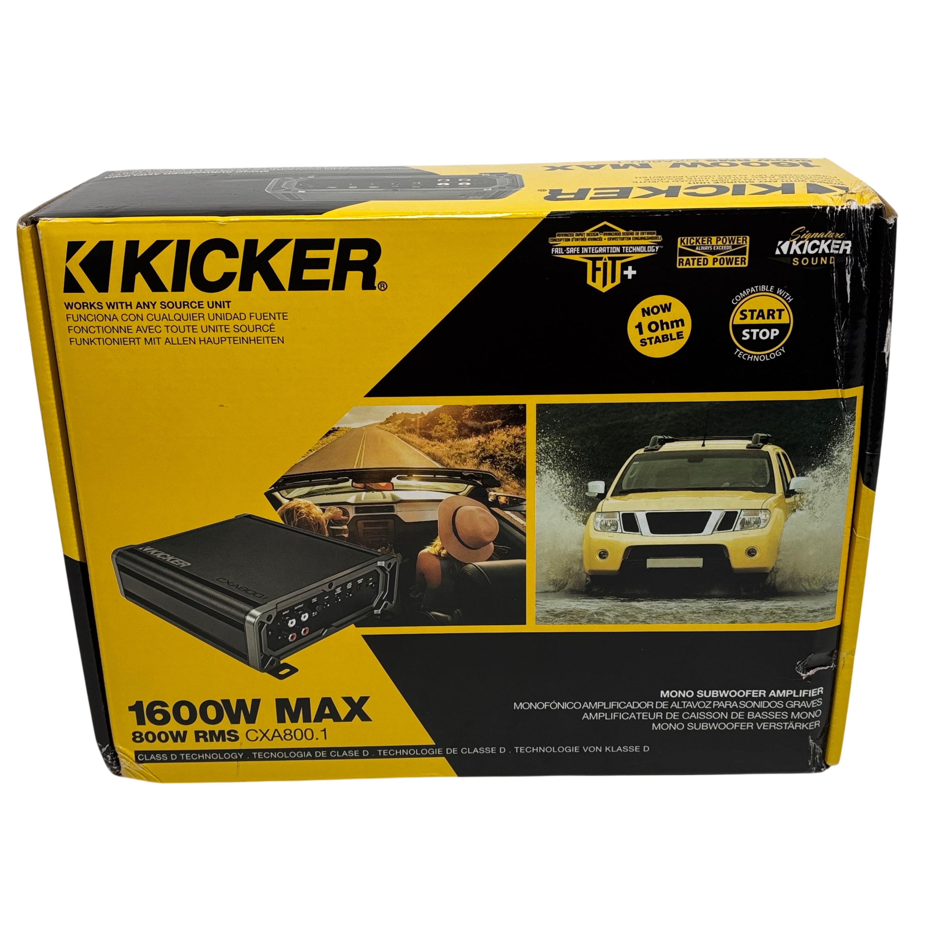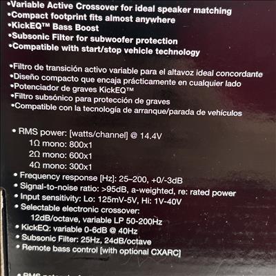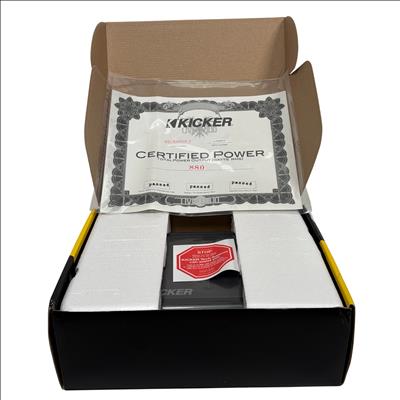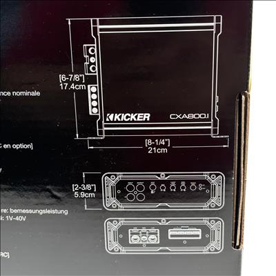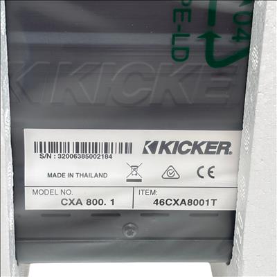 The Kicker CXA8001 Mono Subwoofer Amplifier (Model CXA 800.1) delivers a powerful 800W RMS output with a peak power of 1600W, utilizing efficient Class D technology for clean and robust bass performance. Designed for subwoofer applications, this amplifier features variable KickEQm bass boost and is compatible with any source unit, including vehicles with Start-Stop technology. Compact in size with dimensions of approximately 8.25 x 6.88 x 2.38 inches, it is ideal for enhancing your car audio system with deep, punchy bass.