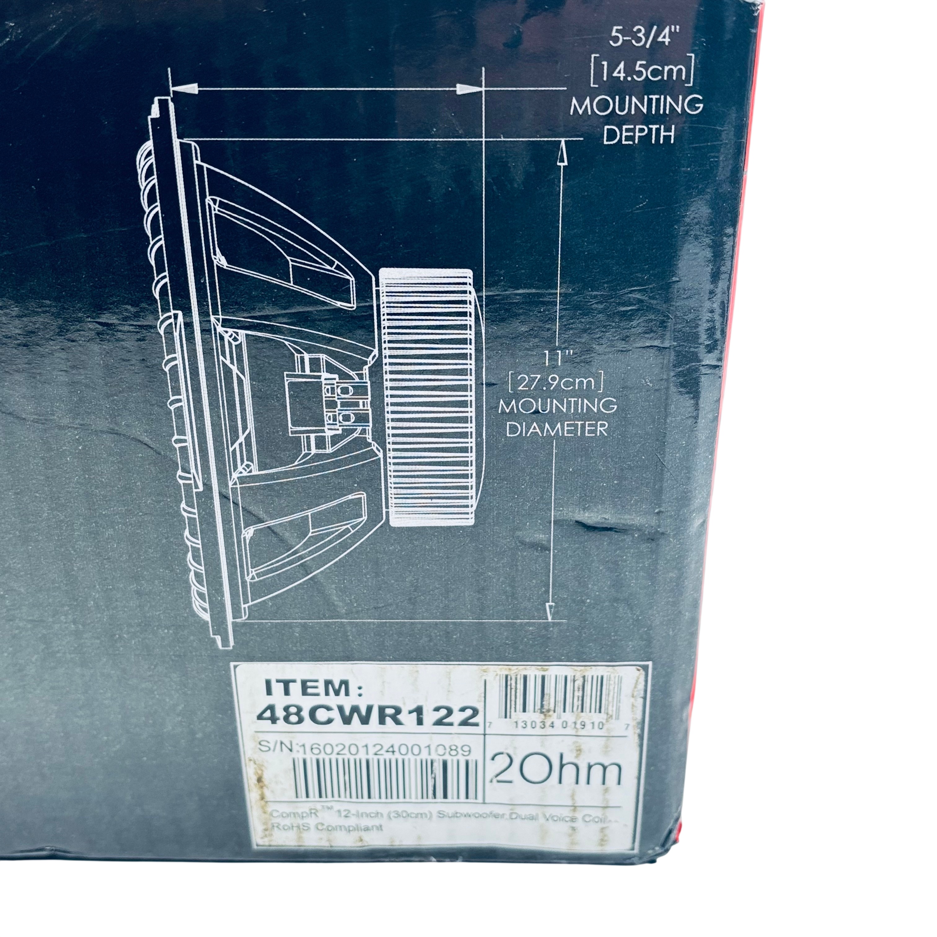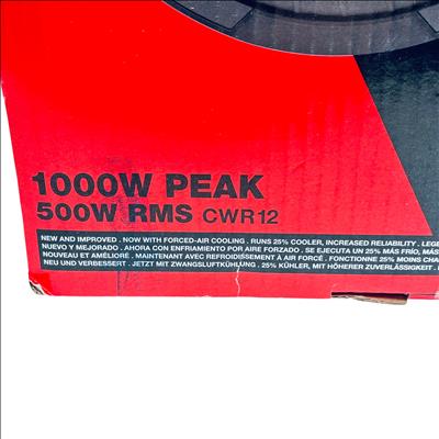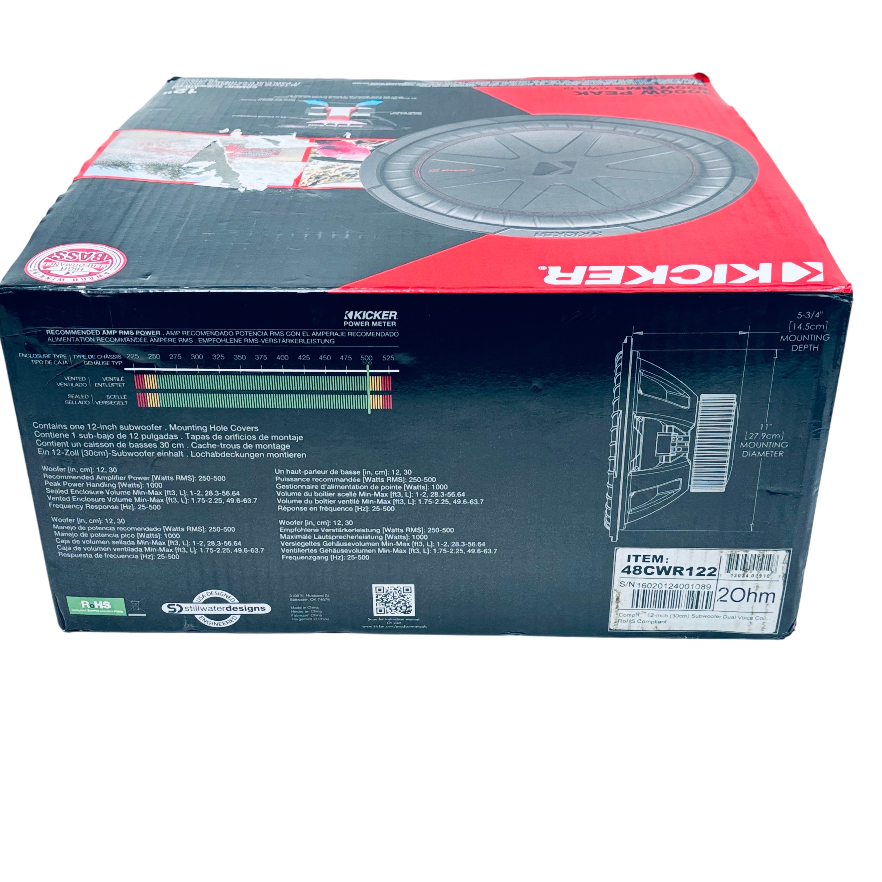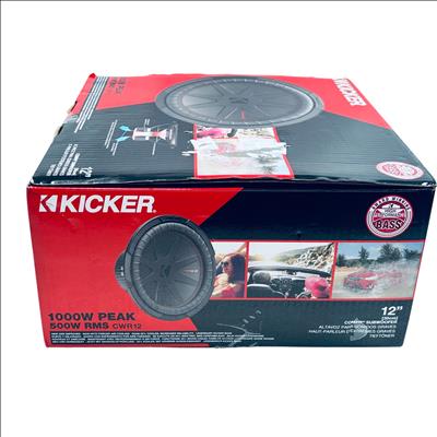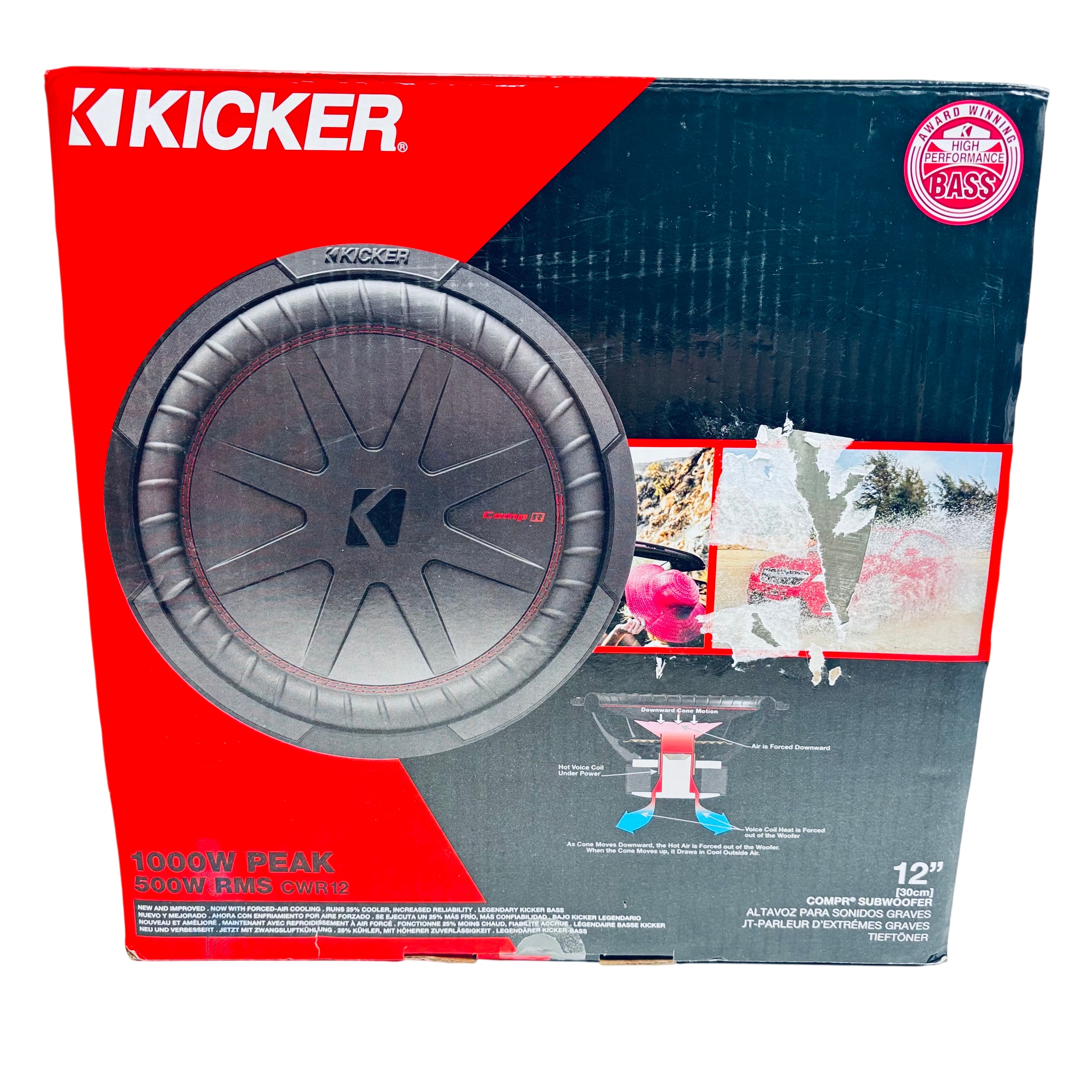 The Kicker CWR12 12-Inch Subwoofer delivers powerful bass performance with a peak power handling of 1000 watts and a recommended amplifier power of 250-500 watts RMS. Featuring forced-air cooling technology, this subwoofer runs 25% cooler for increased reliability and durability. It supports a frequency response range of 25 to 500 Hz, making it ideal for deep bass sounds. The subwoofer includes mounting hole covers and fits enclosures with a mounting diameter of 11 inches and a mounting depth of 5.75 inches. Perfect for car audio enthusiasts seeking high-performance bass with reliable cooling.