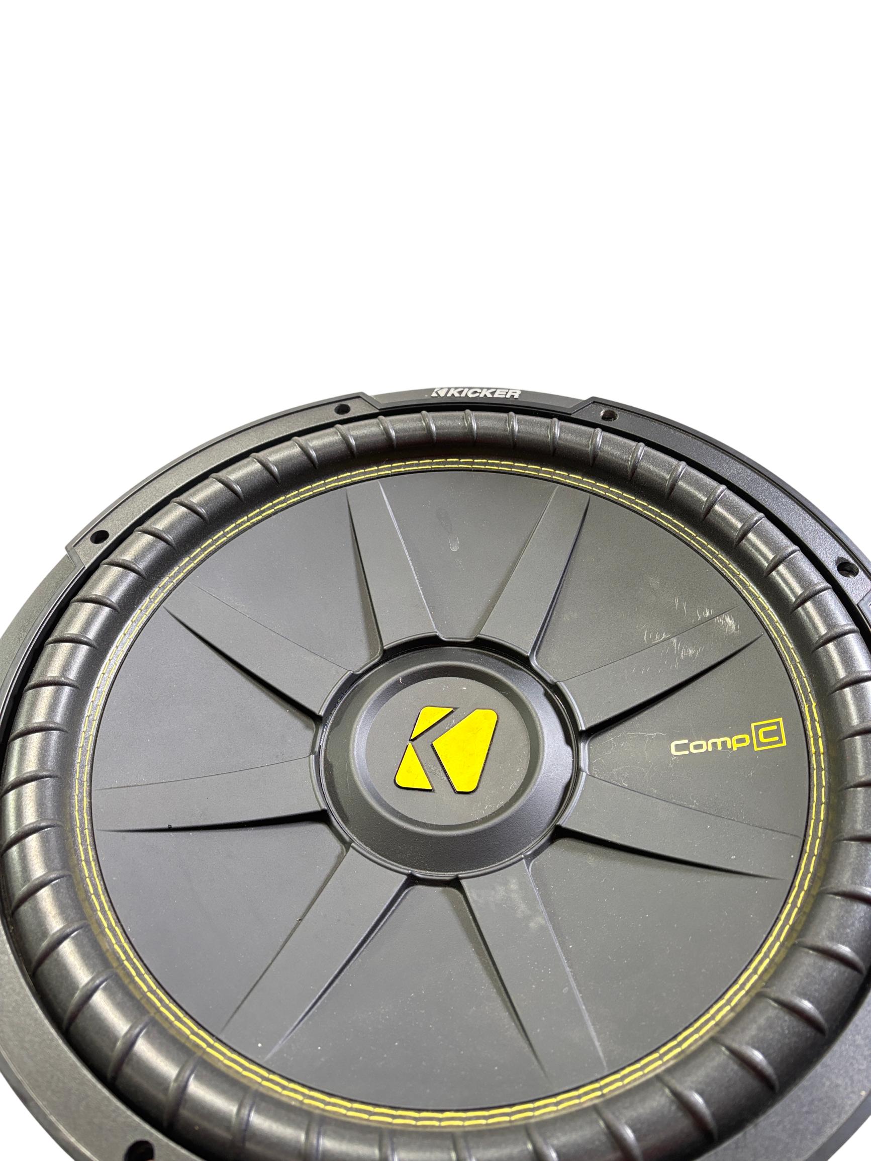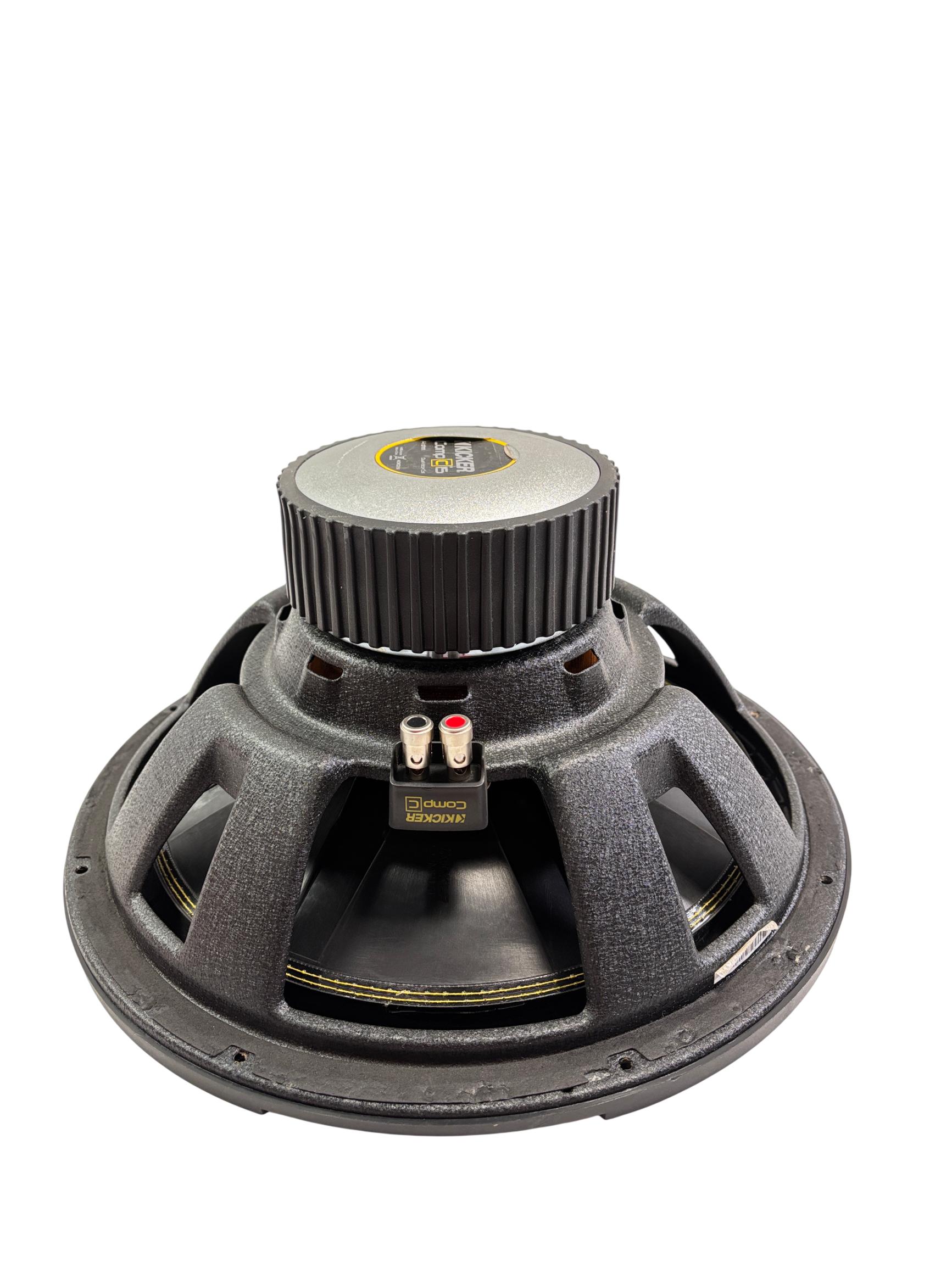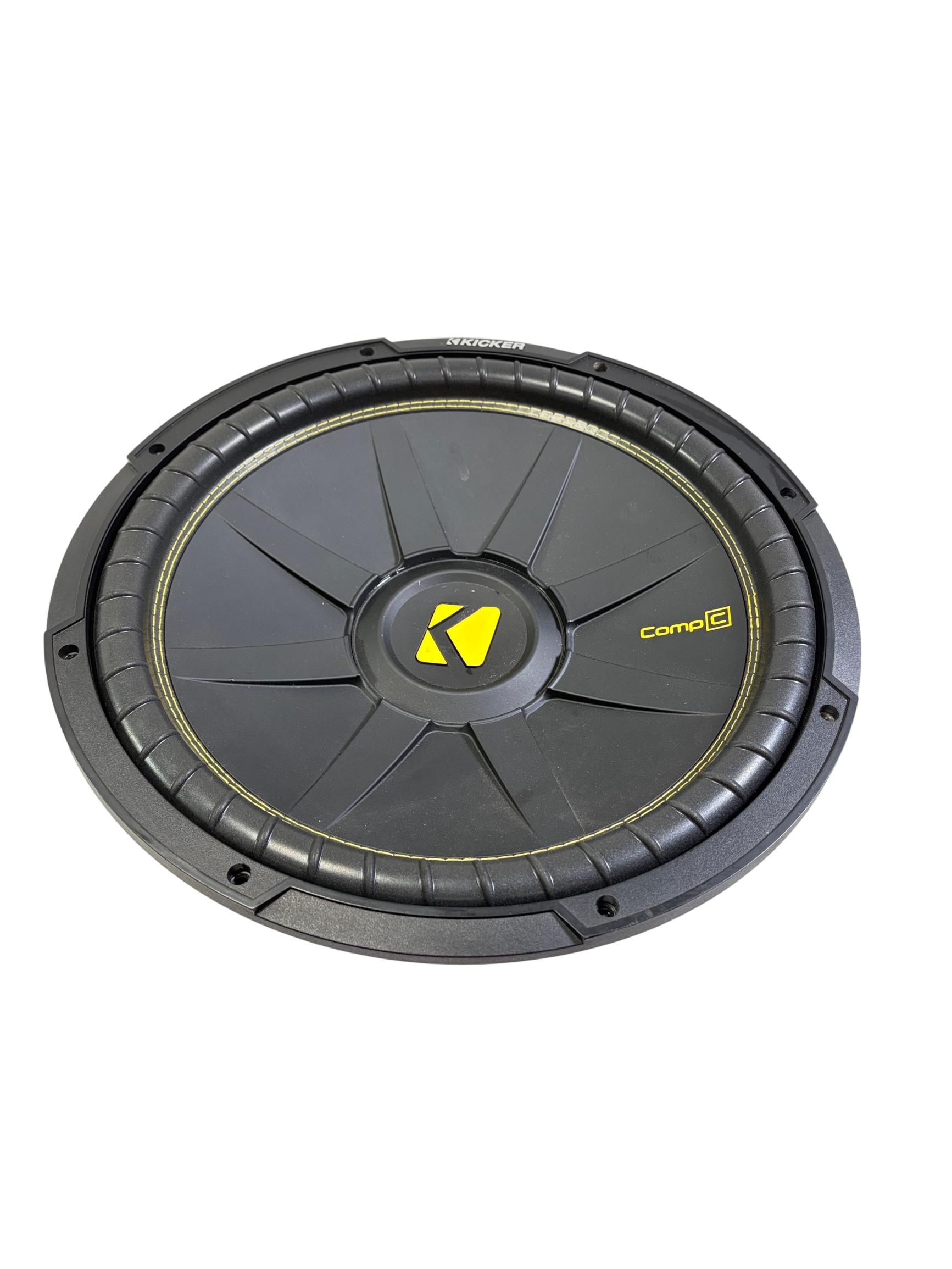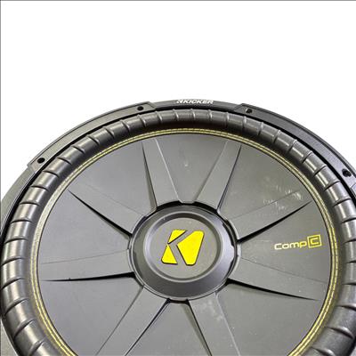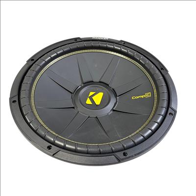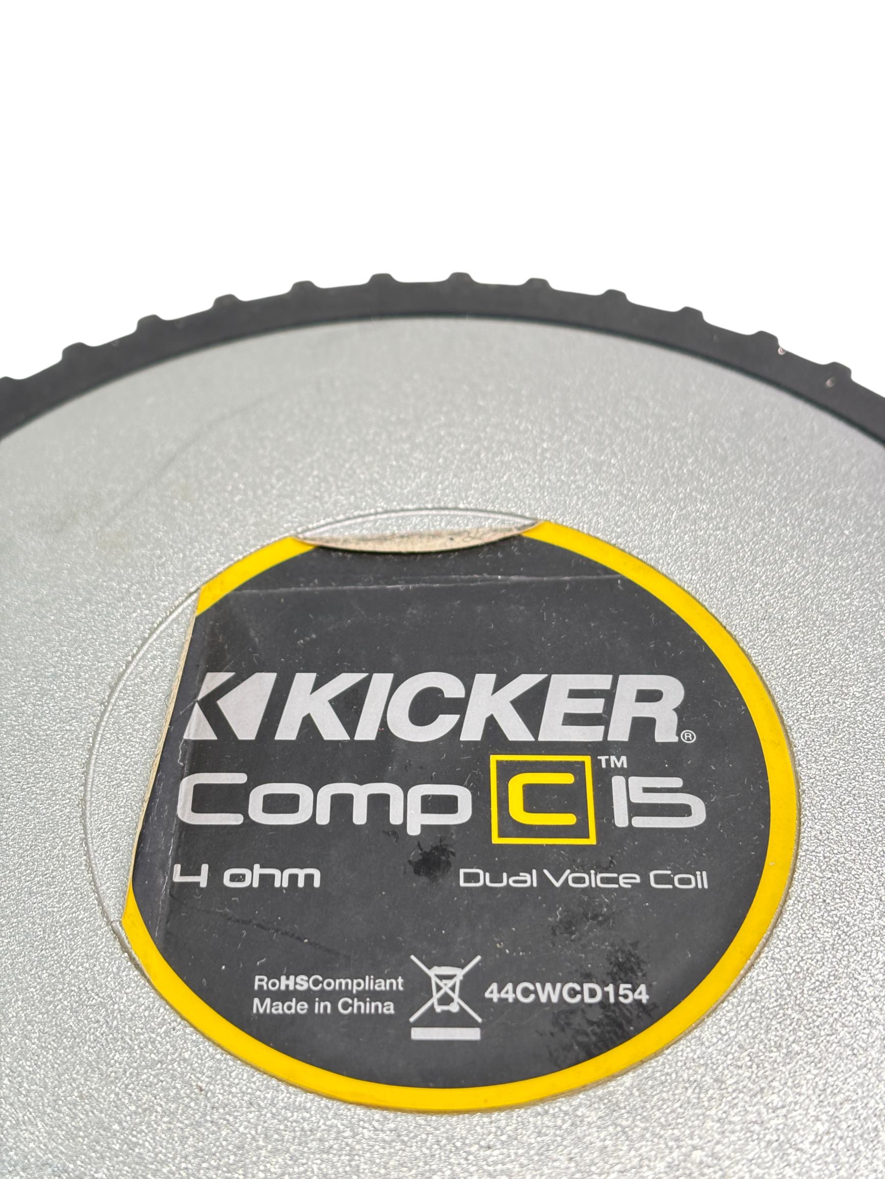 Kicker CompC 15" 4-Ohm Subwoofer - Model 44CWCD154 delivers powerful bass performance with a durable black design featuring a distinctive yellow triangle logo. This 15-inch subwoofer combines robust construction and high-quality materials to enhance audio systems with deep, clear low-frequency sound. Engineered for reliable car audio integration, it offers efficient power handling for an immersive listening experience.