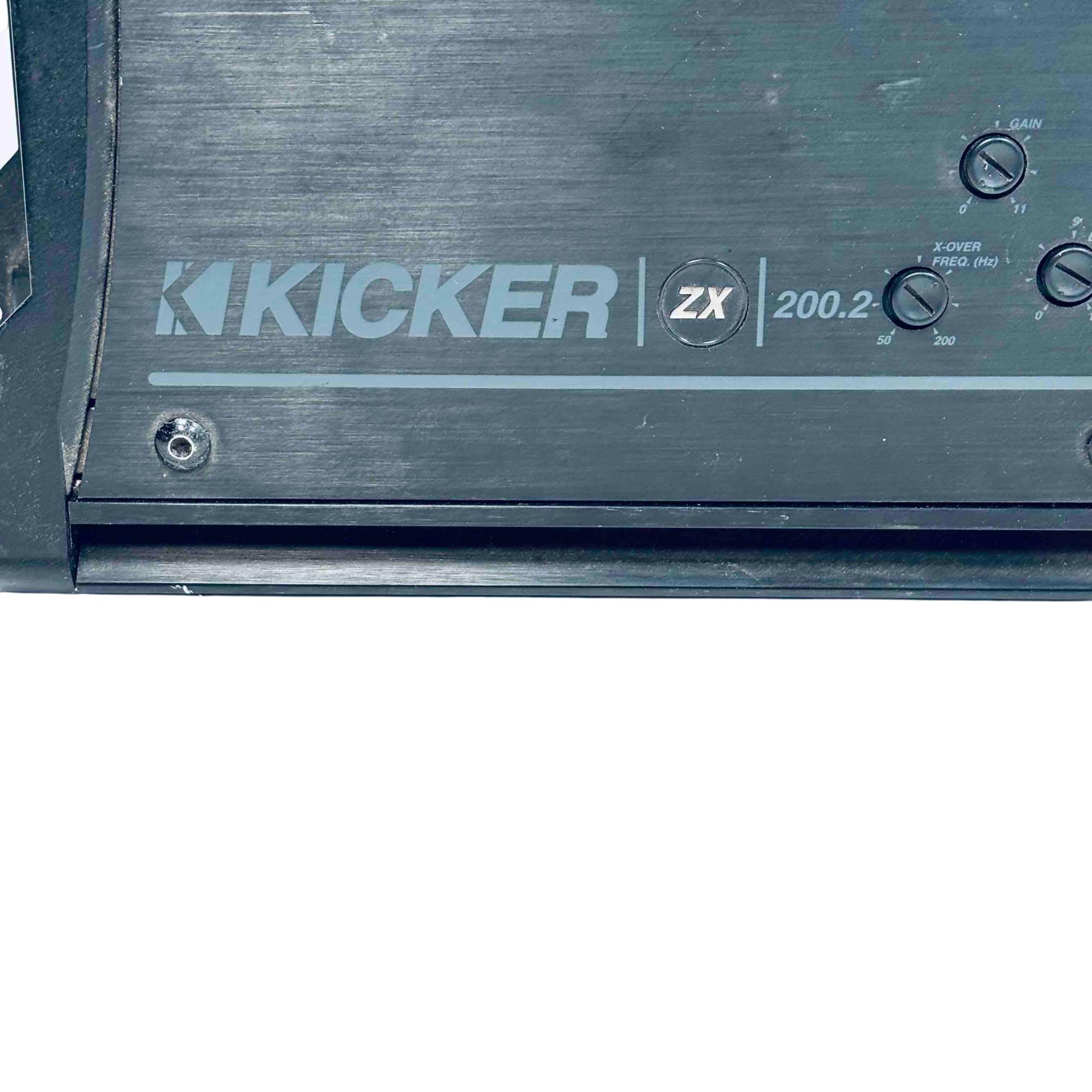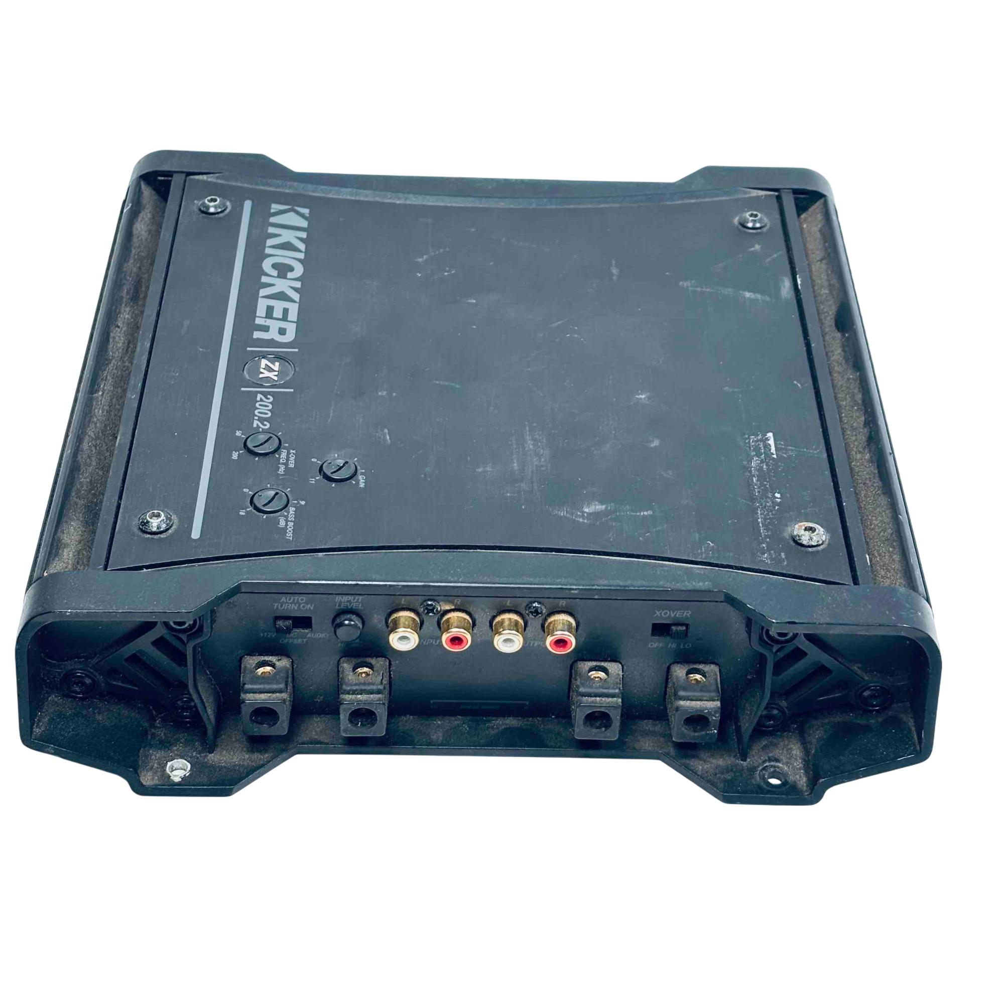 Kicker ZX200.2 Car Audio Amplifier is a compact and powerful two-channel amplifier designed for car audio systems. Featuring gold and silver audio ports and adjustable gain, bass boost, and crossover settings, it delivers clear, dynamic sound with up to 200 watts RMS power. This durable black electronic device includes multiple input and offset controls for precise audio customization.
