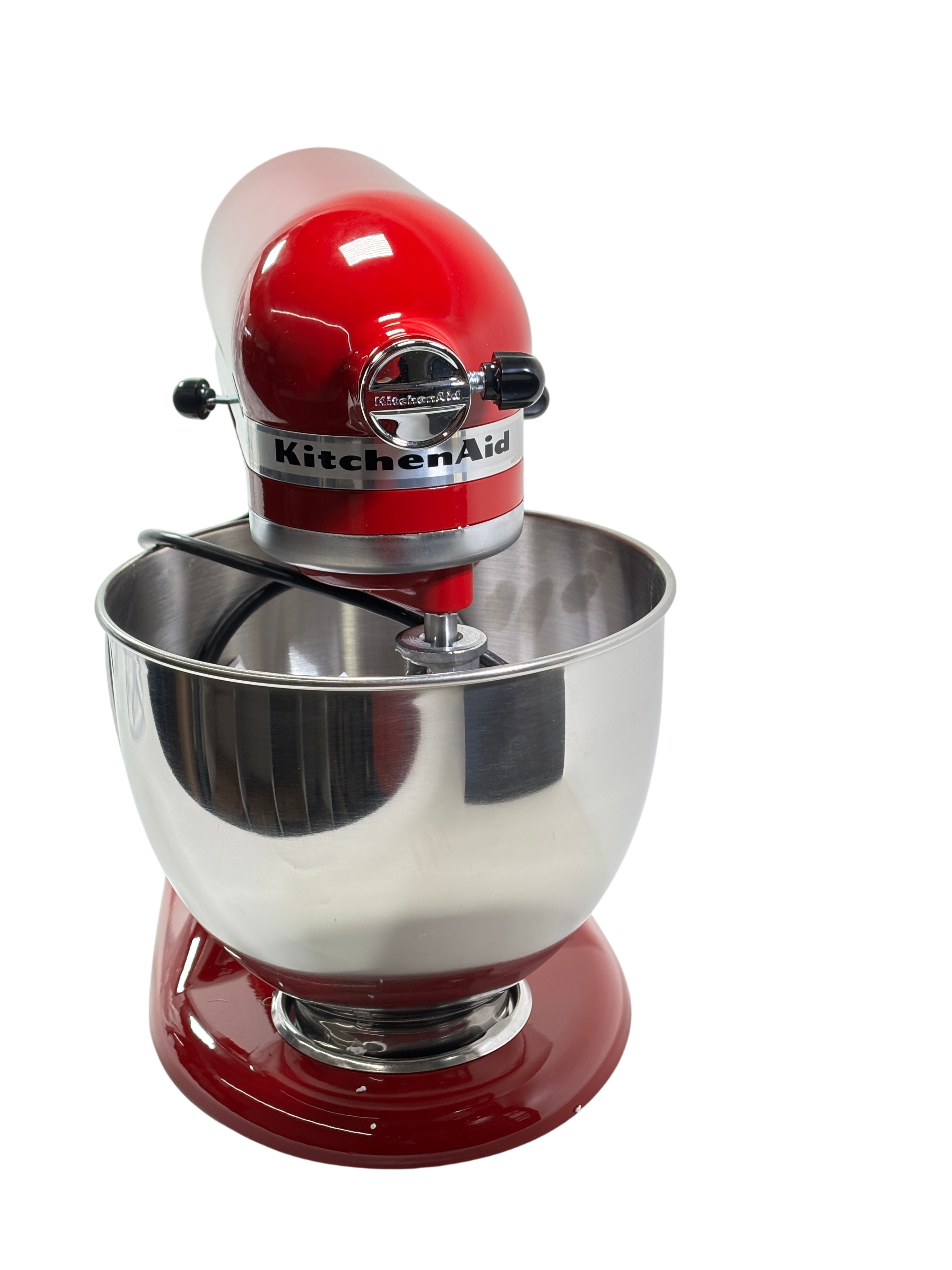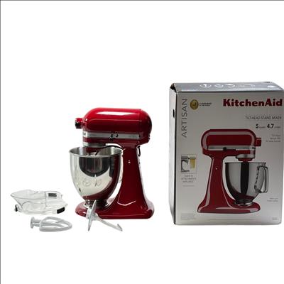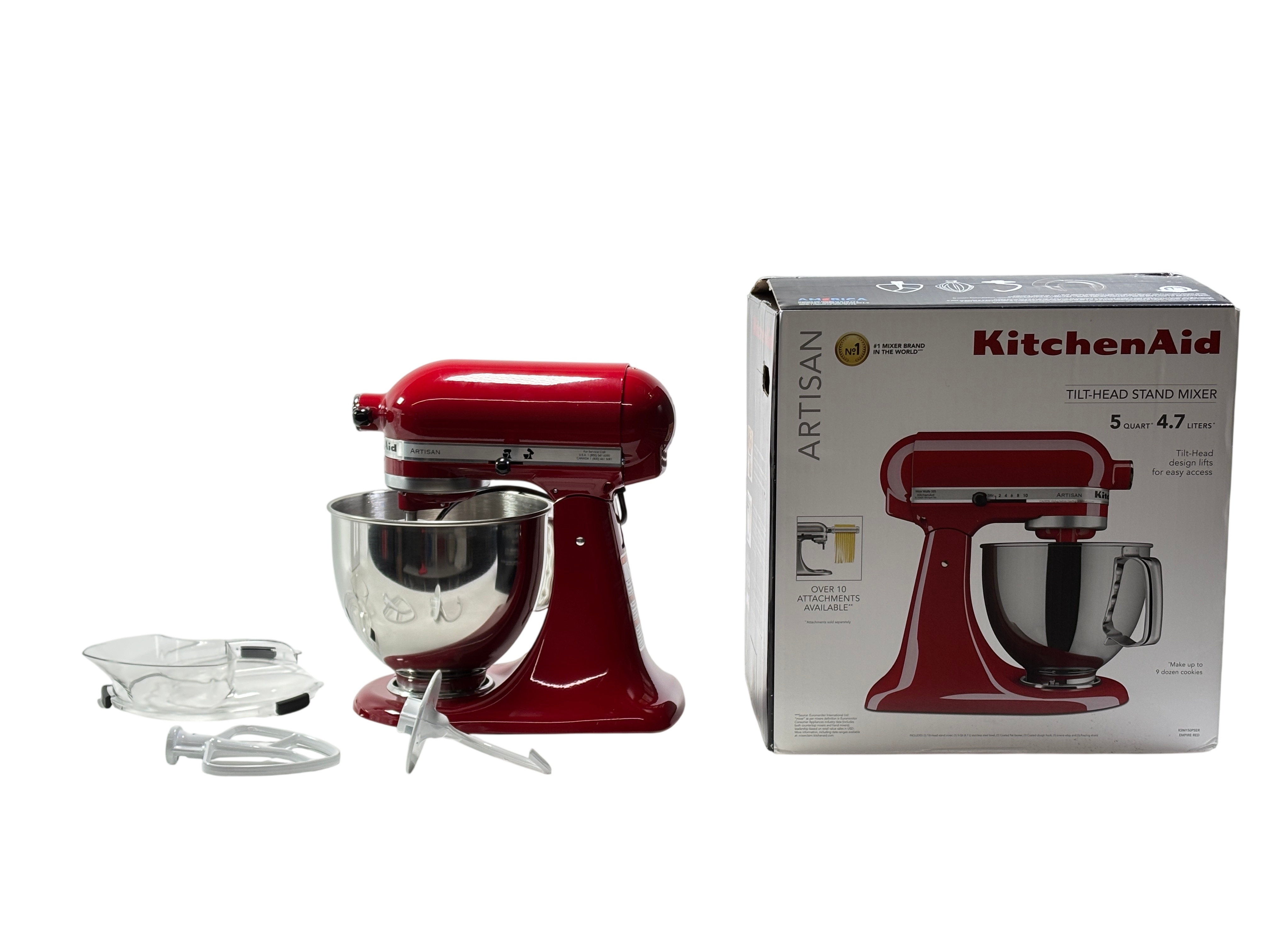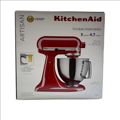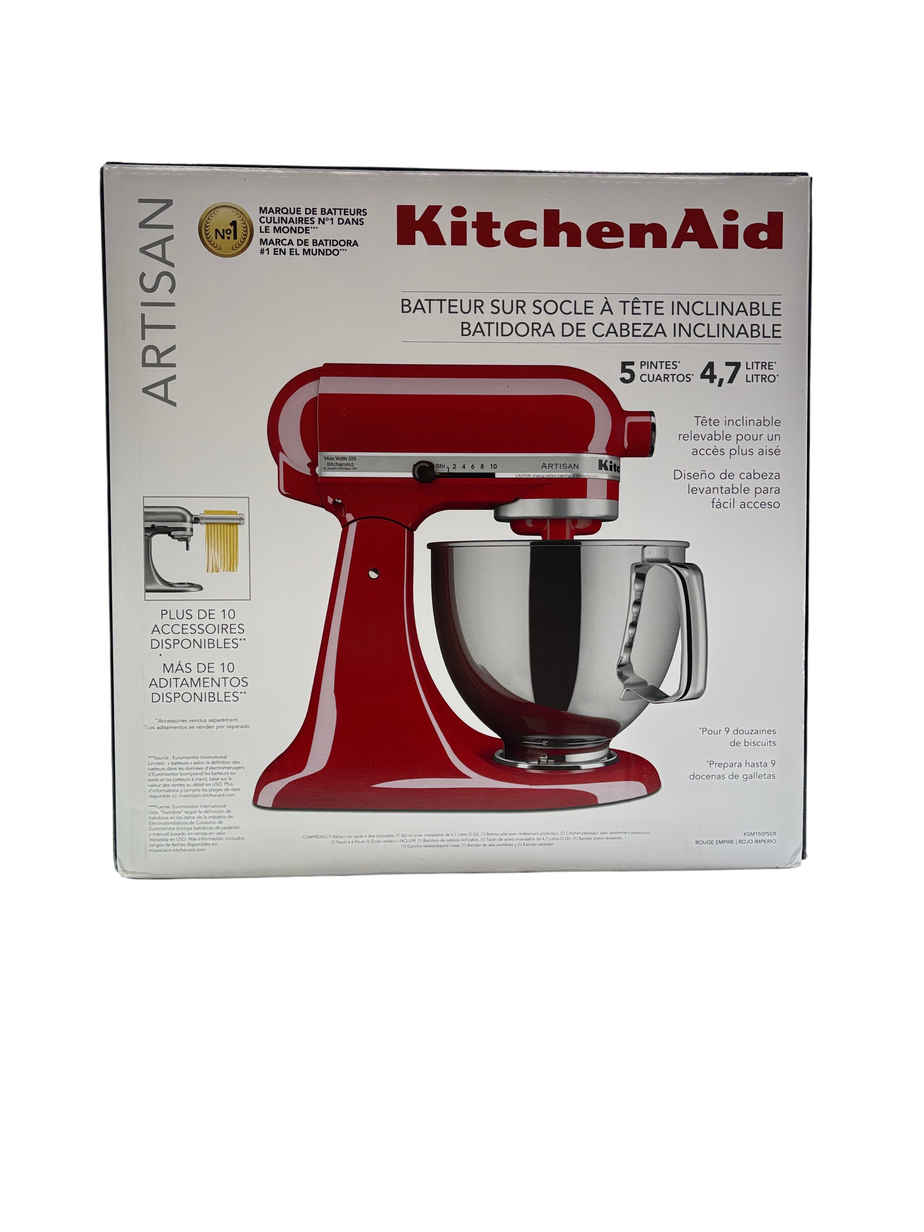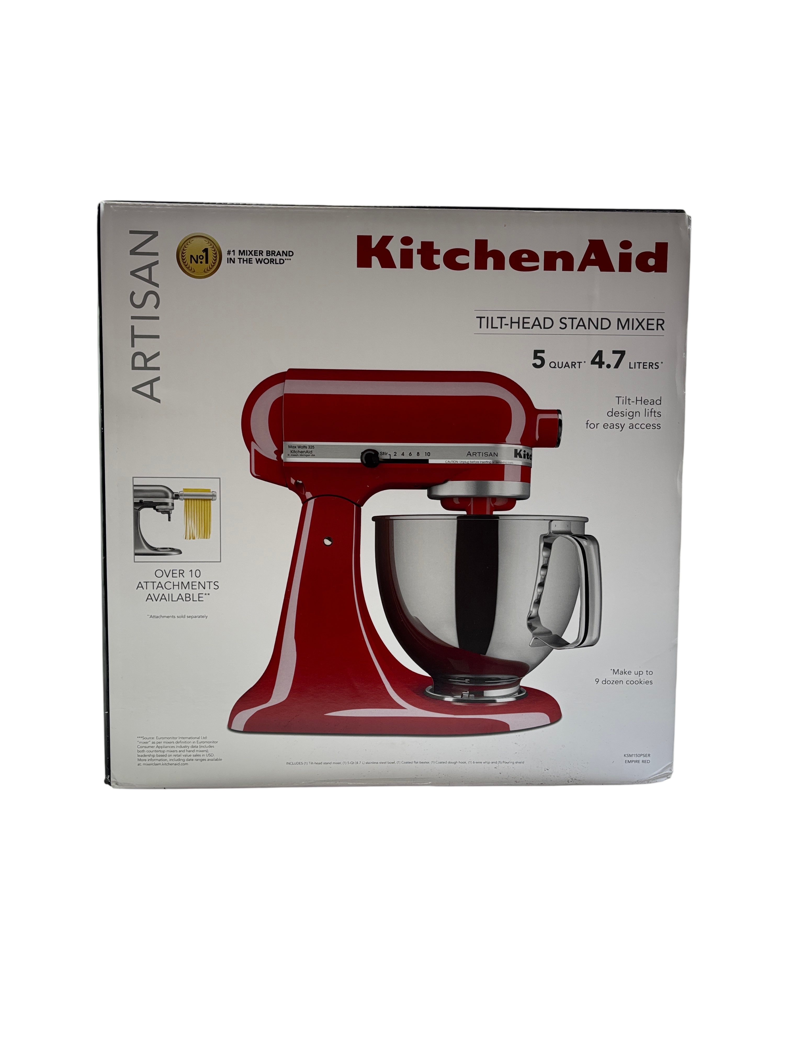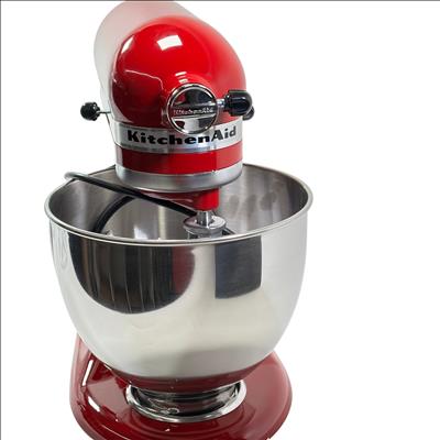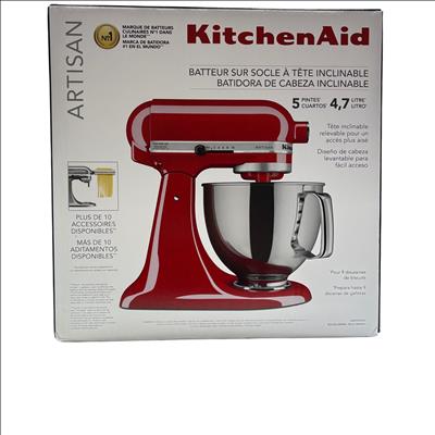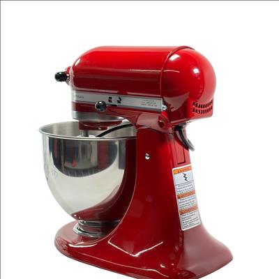 KitchenAid Artisan Tilt-Head Stand Mixer KSM150PSER features a 5 quart (4.7 liters) stainless steel bowl with handle, perfect for mixing large batches of dough, batter, and more. This Empire Red mixer offers a versatile 10-speed control and a tilt-head design that lifts for easy access to the bowl and attachments. Compatible with over 10 optional attachments sold separately, it is ideal for baking enthusiasts and home chefs looking to expand their kitchen capabilities. The robust metal construction and classic design make it a durable and stylish addition to any kitchen.