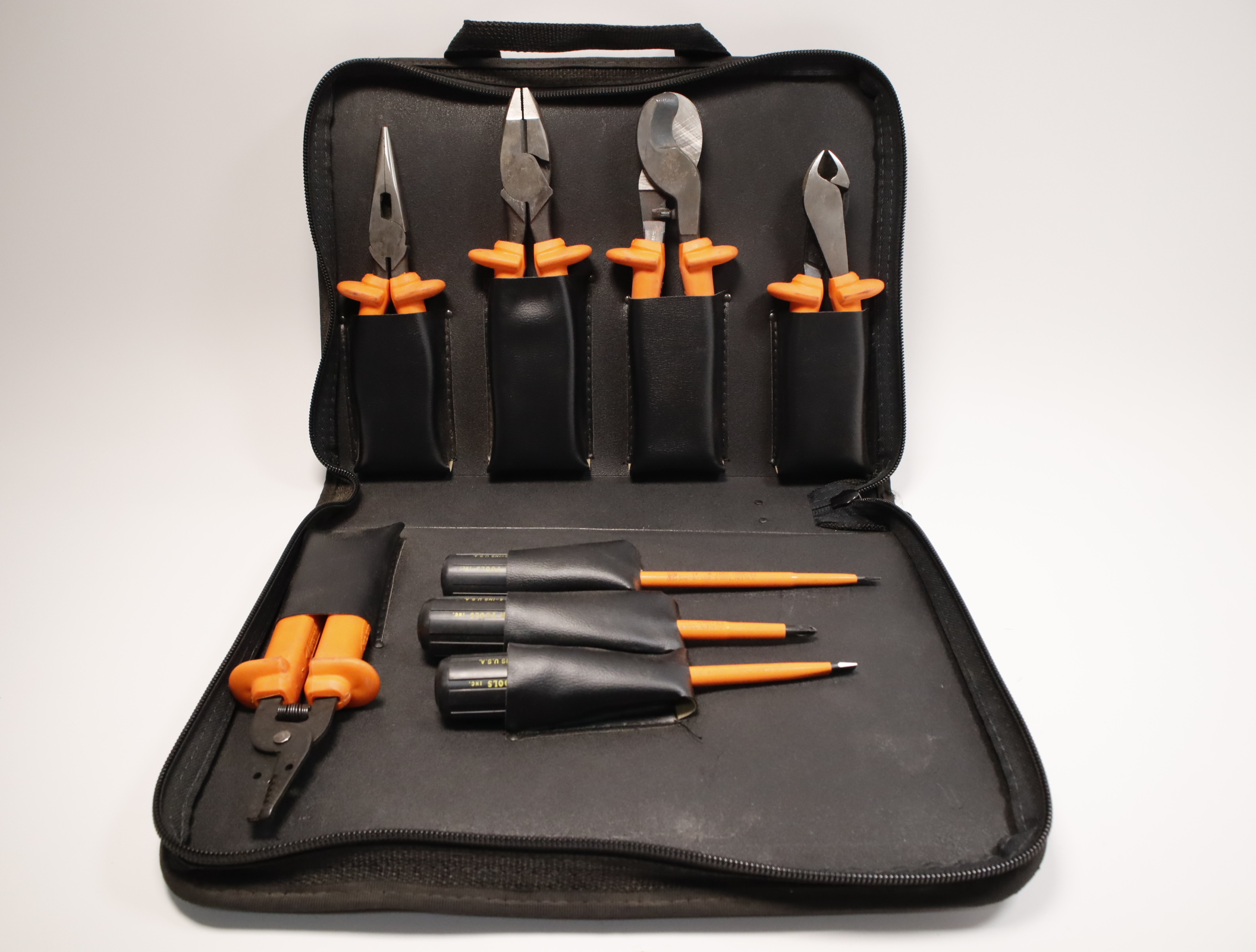 Compact set of eight popular insulated tools including assorted pliers (3), screwdrivers (3), a cable cutter and Klein-Kurve wire stripper/cutter (See individual tool listings for more details)