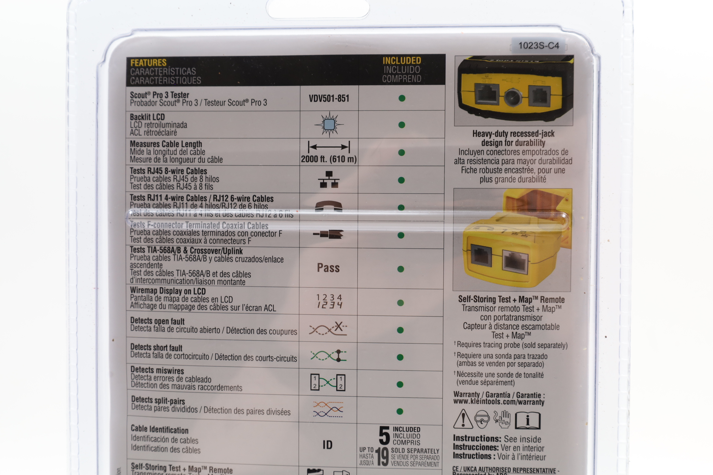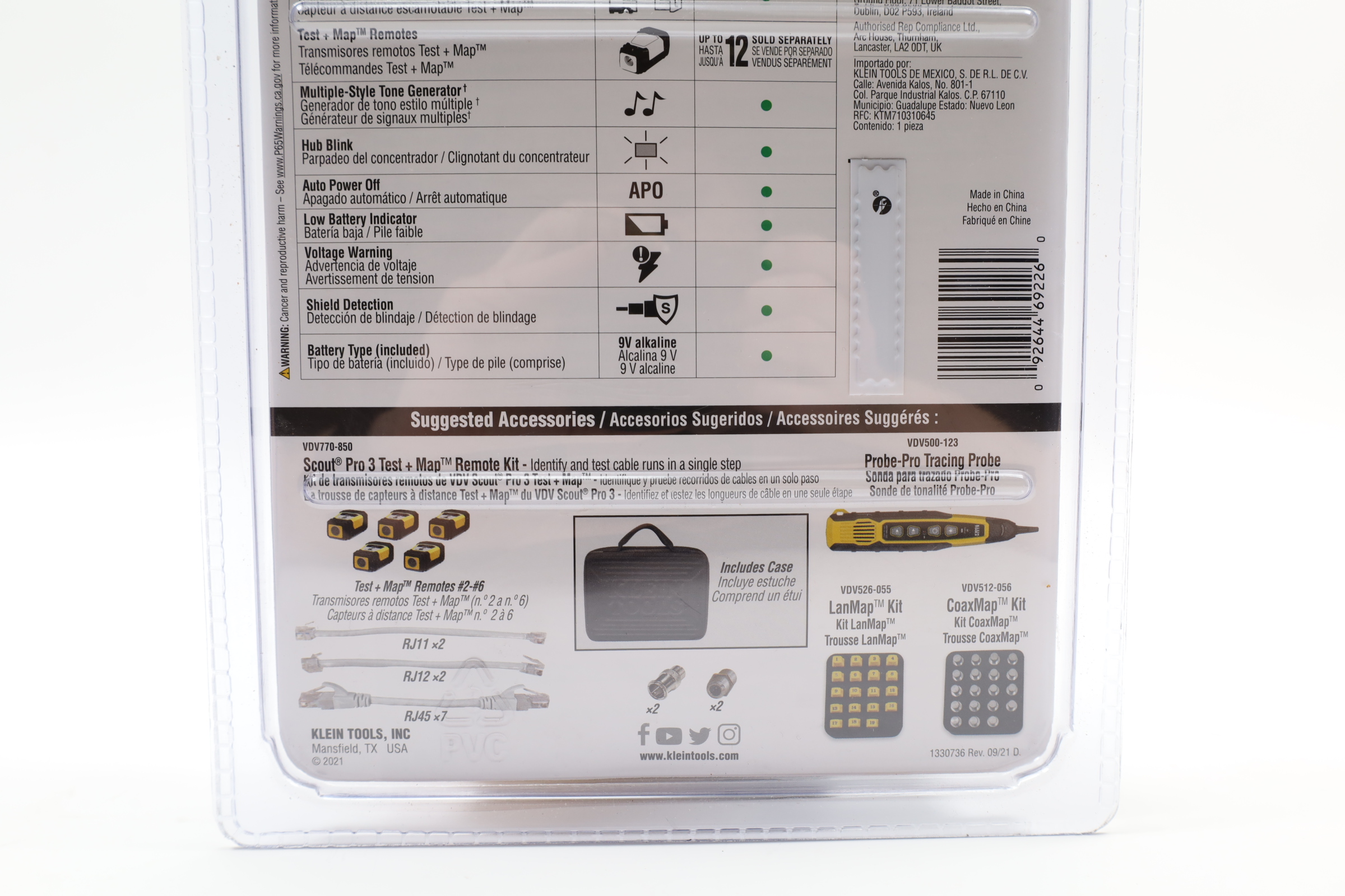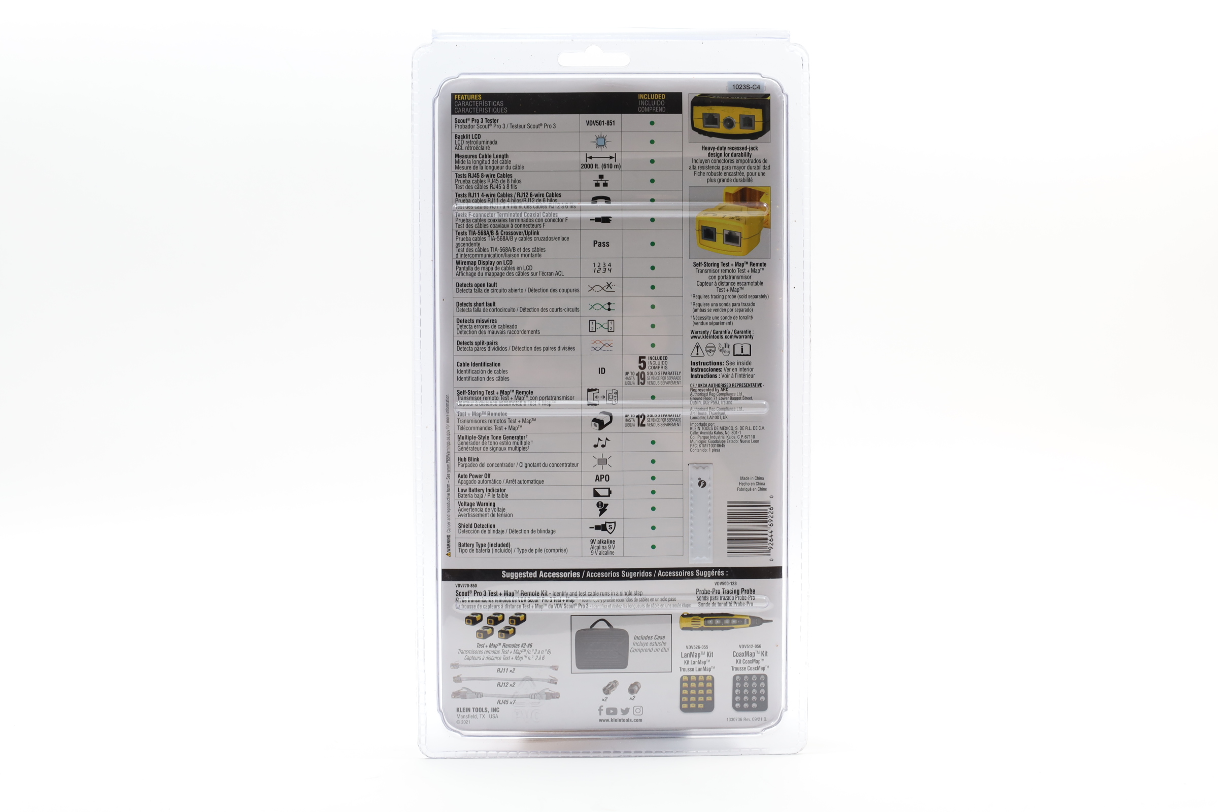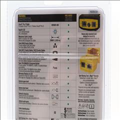 A comprehensive tool for testing and locating voice, data, and video cables. It accommodates RJ11/12, RJ45, and coax F-connector cables, displaying results on a backlit LCD screen for ease of use in low-light environments. The tester measures cable lengths up to 2000 feet and identifies Open, Short, Miswire, or Split-Pair faults. It includes LanMap and CoaxMap location remotes to map and identify multiple cable runs efficiently. Additional features include a tone generator for tracing cables and a hub blink mode to identify port locations on hubs or switches.