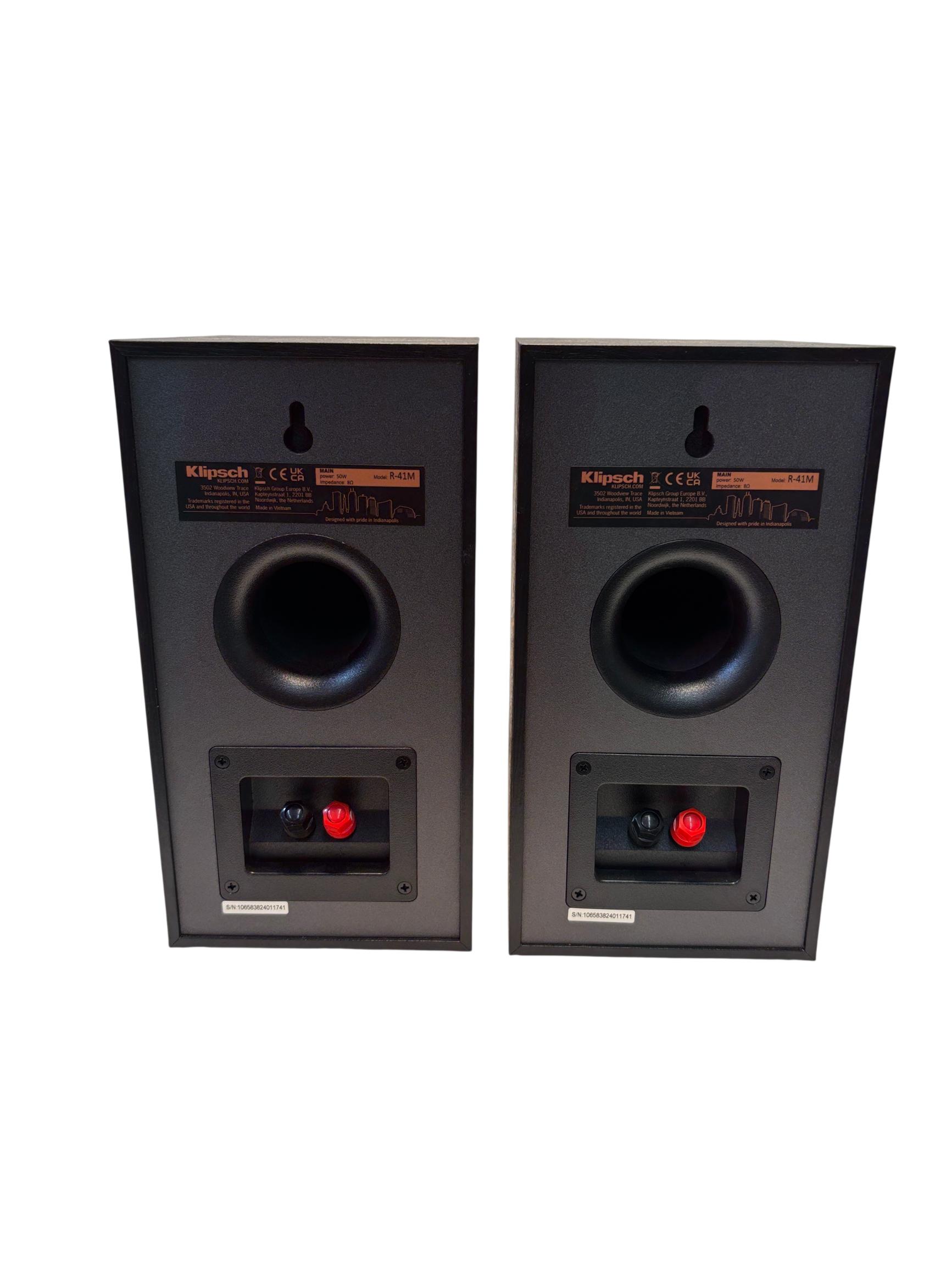 The Klipsch R-41M Bookshelf Speakers deliver detailed and dynamic sound performance, optimized for home audio use. Featuring a sleek black design with red accents on the controls, these compact speakers offer clear highs and rich bass thanks to their carefully engineered drivers and robust cabinetry. Ideal for enhancing any home entertainment setup, they connect easily with most audio systems through quality speaker wire.