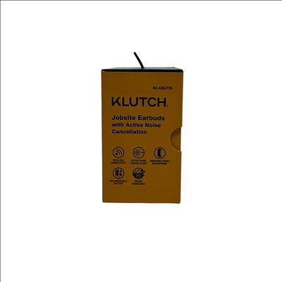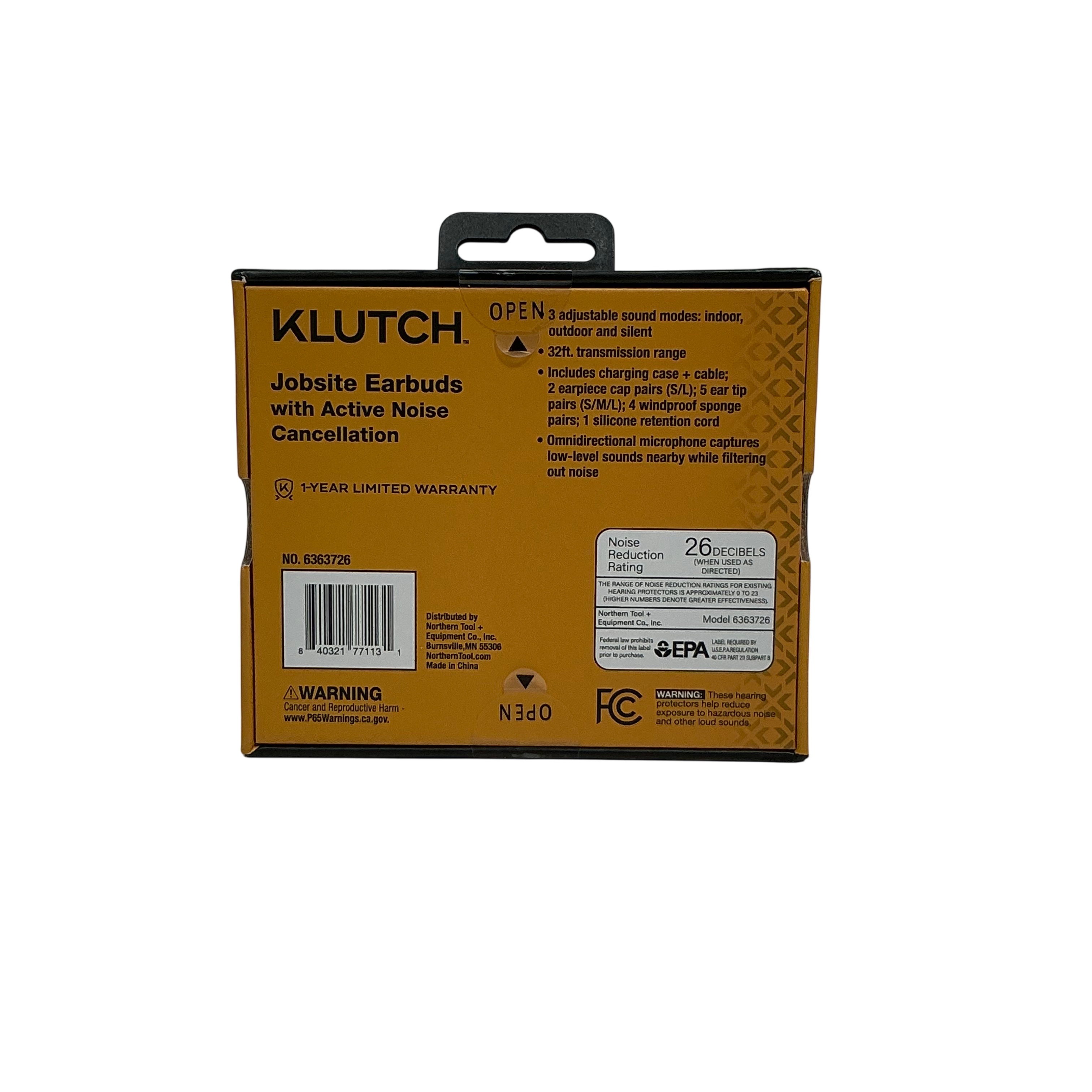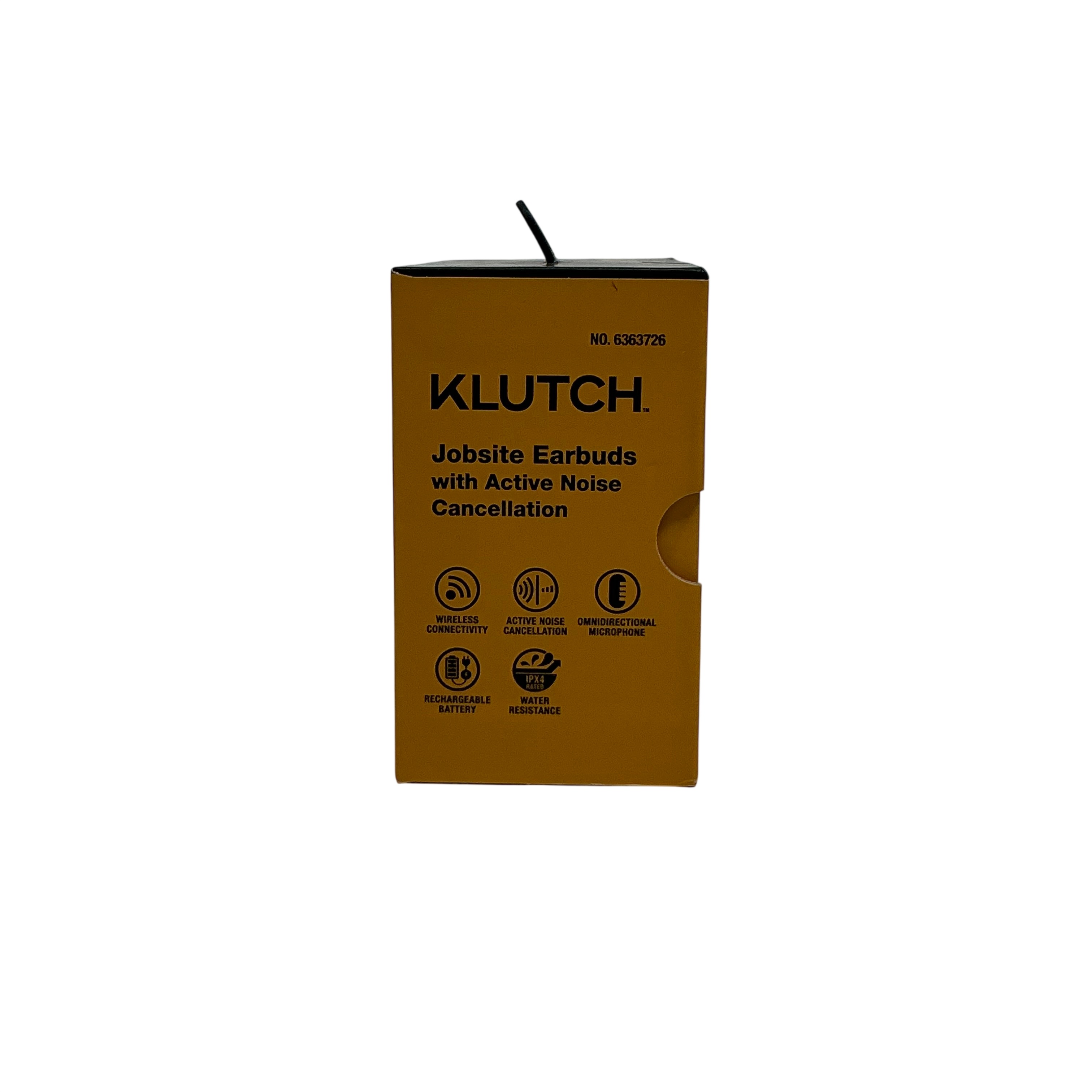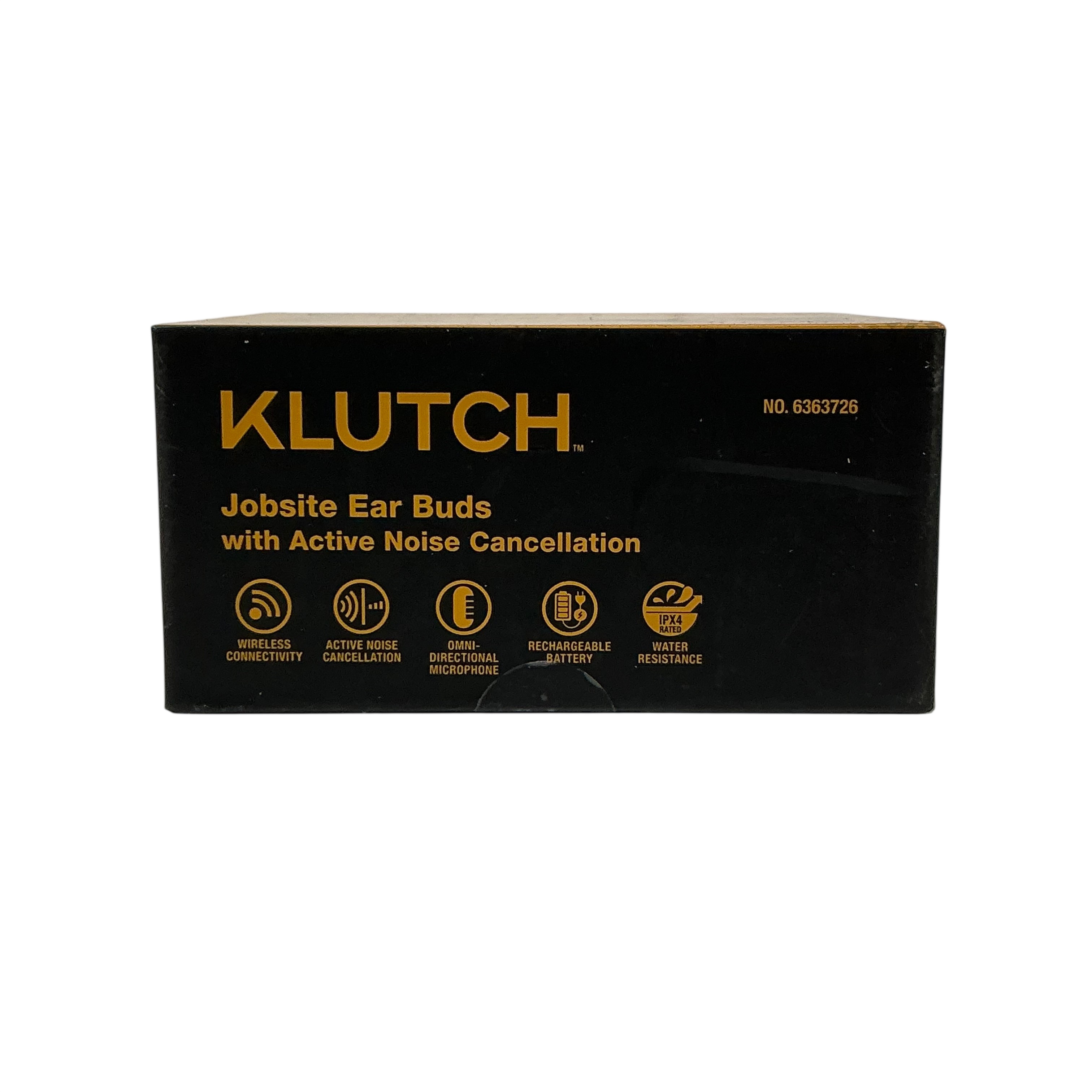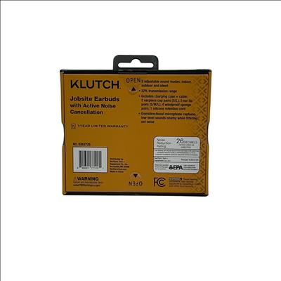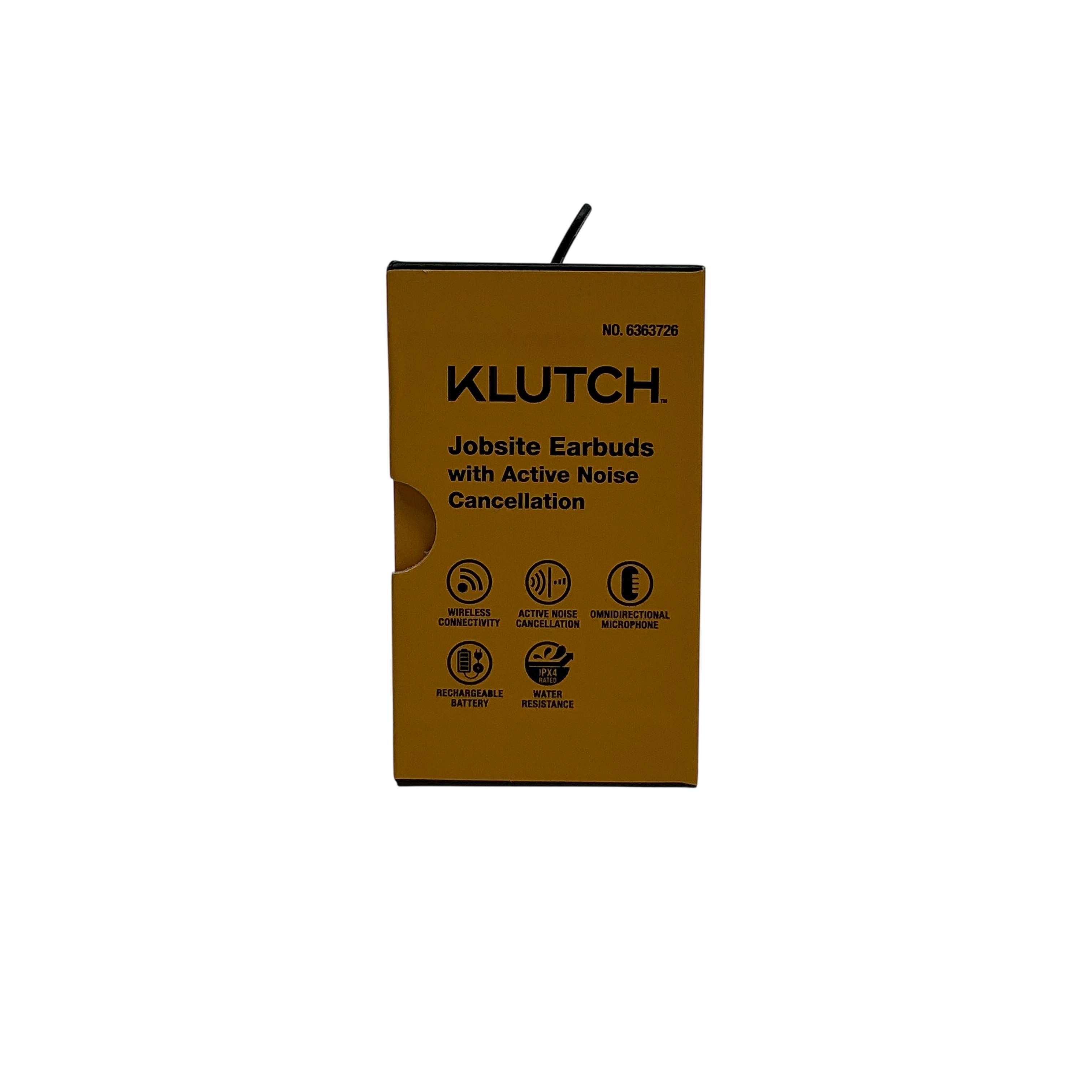 Klutch Jobsite Ear Buds with Active Noise Cancellation (Model No. 6363726) offer wireless connectivity with a rechargeable battery and IPX4 water resistance, making them ideal for use in demanding environments. These earbuds feature an omnidirectional microphone and provide a noise reduction rating of 26 decibels, helping to filter out background noise while allowing low-level sounds nearby to be heard. The set includes a charging case, multiple ear tip sizes, windproof sponge pairs, and a silicone retention cord for a secure and comfortable fit during extended use.