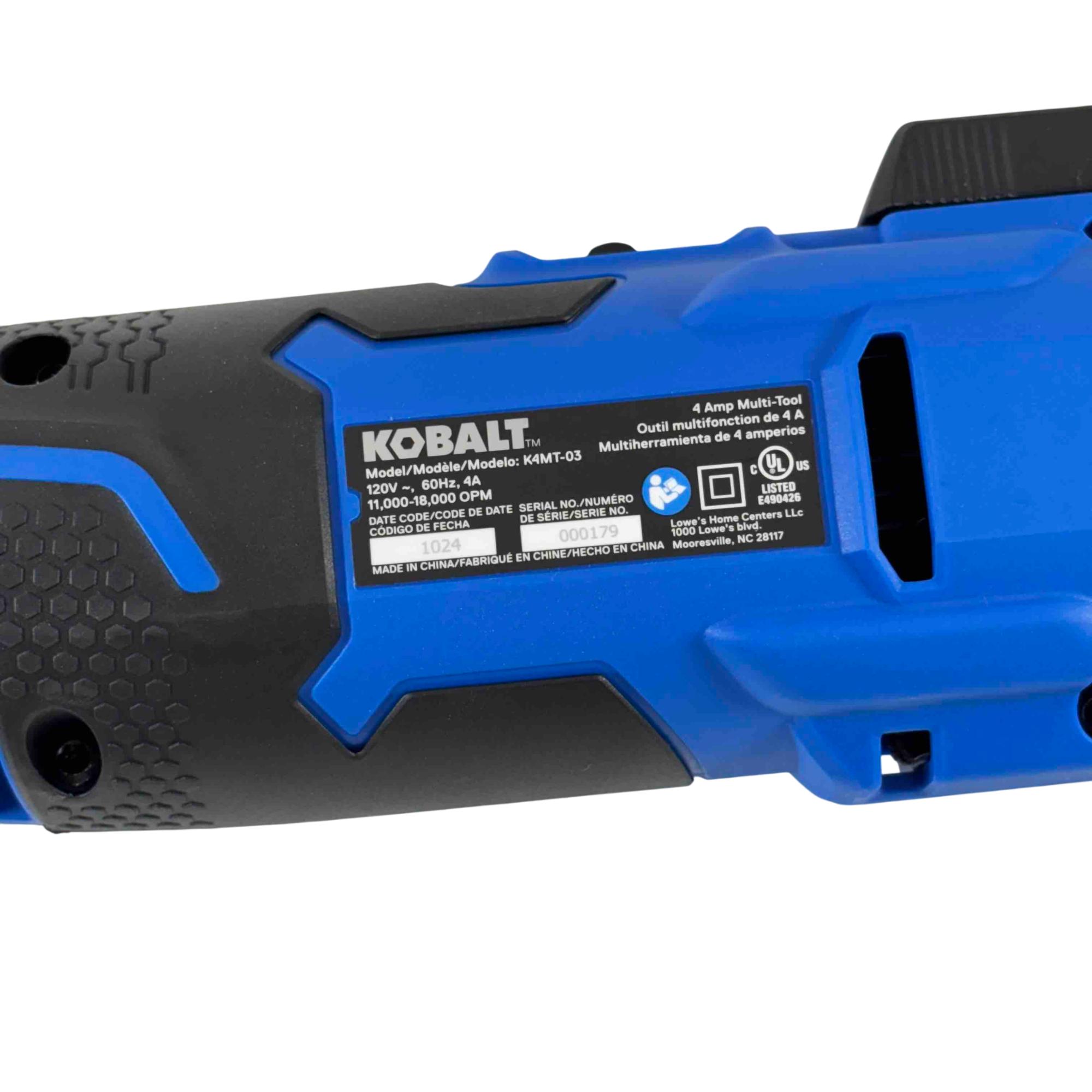 The Kobalt K4MT-03 4-Amp Variable Speed Corded Electric Oscillating Multi-Tool features a powerful motor delivering up to 18,000 oscillations per minute for efficient cutting and sanding. Vibration dampening technology ensures maximum comfort and minimal fatigue during use. Its tool-less blade change system allows quick and easy accessory swaps, minimizing downtime. A 6-position variable-speed dial lets users select the ideal speed for each task, while integrated LEDs illuminate the work area for enhanced visibility.