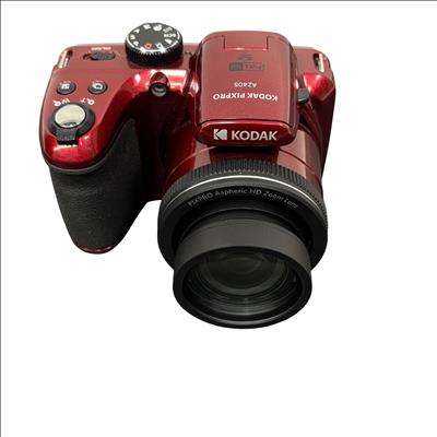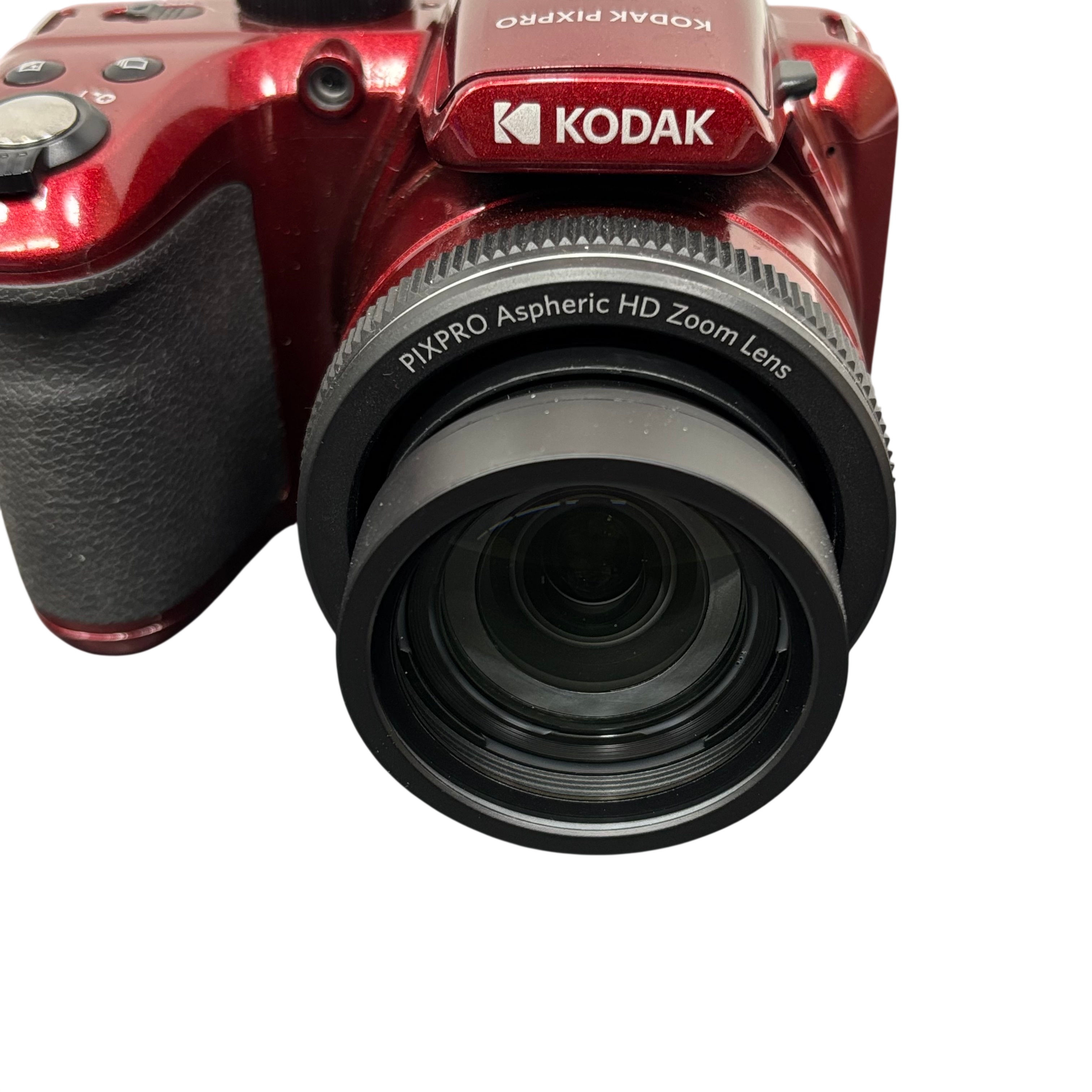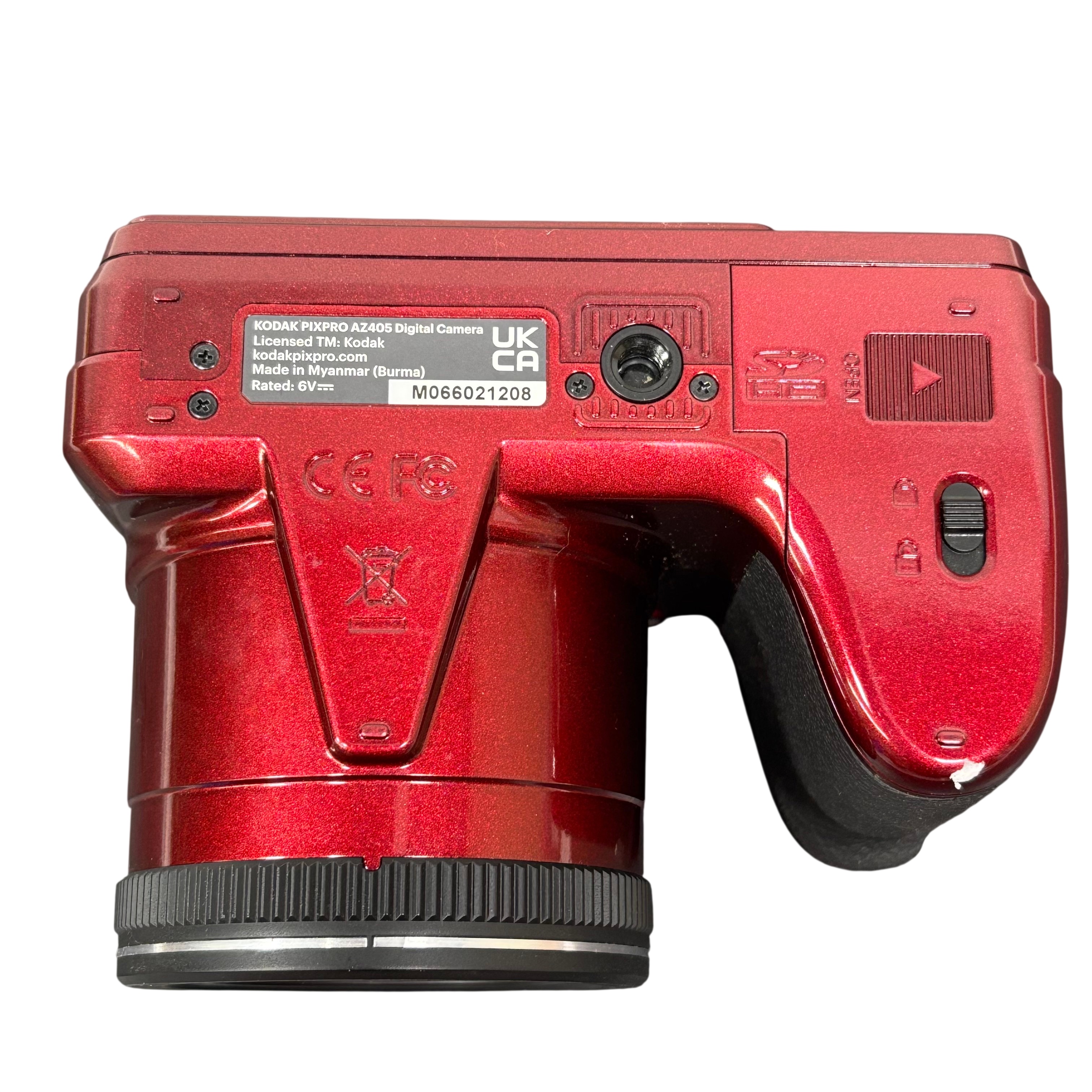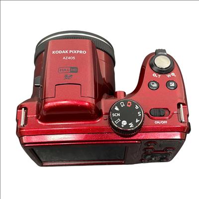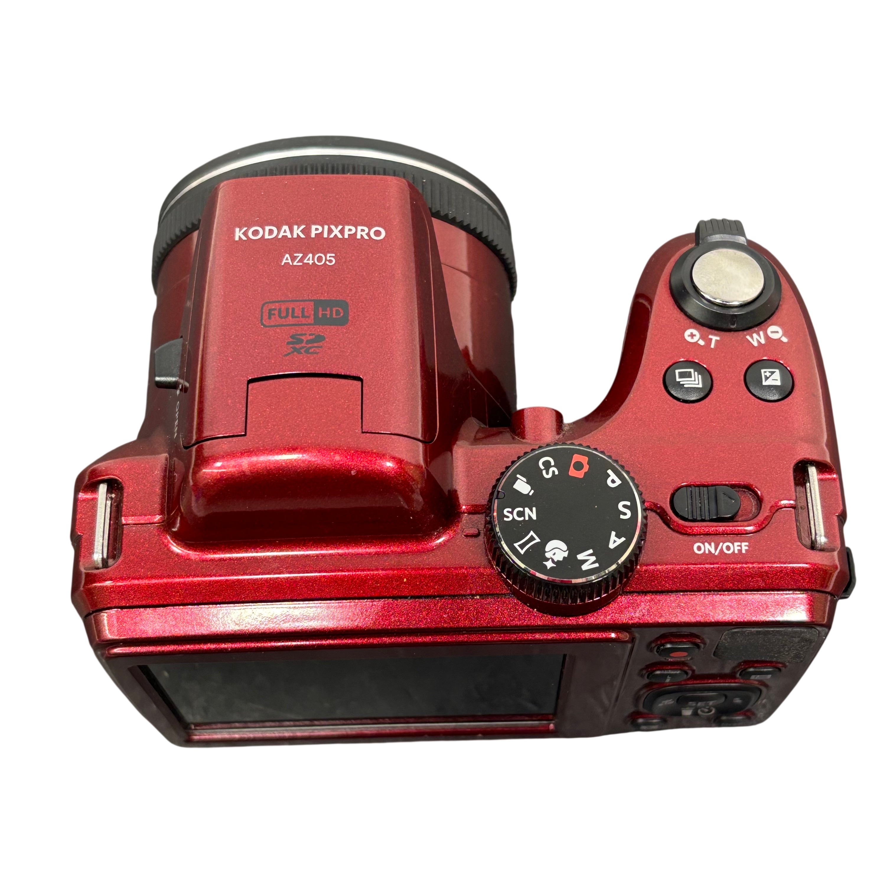 The Kodak PIXPRO AZ405 digital camera offers a powerful 40x optical zoom with a PIXPRO Aspheric HD lens covering an equivalent focal length of 24-960mm. This red compact camera supports Full HD video recording and uses standard AA batteries for convenient power replacement. Compatible with SDXC memory cards, it is ideal for users seeking versatile zoom capabilities in a portable design. The camera body is lightweight and easy to handle, making it suitable for travel and everyday photography.