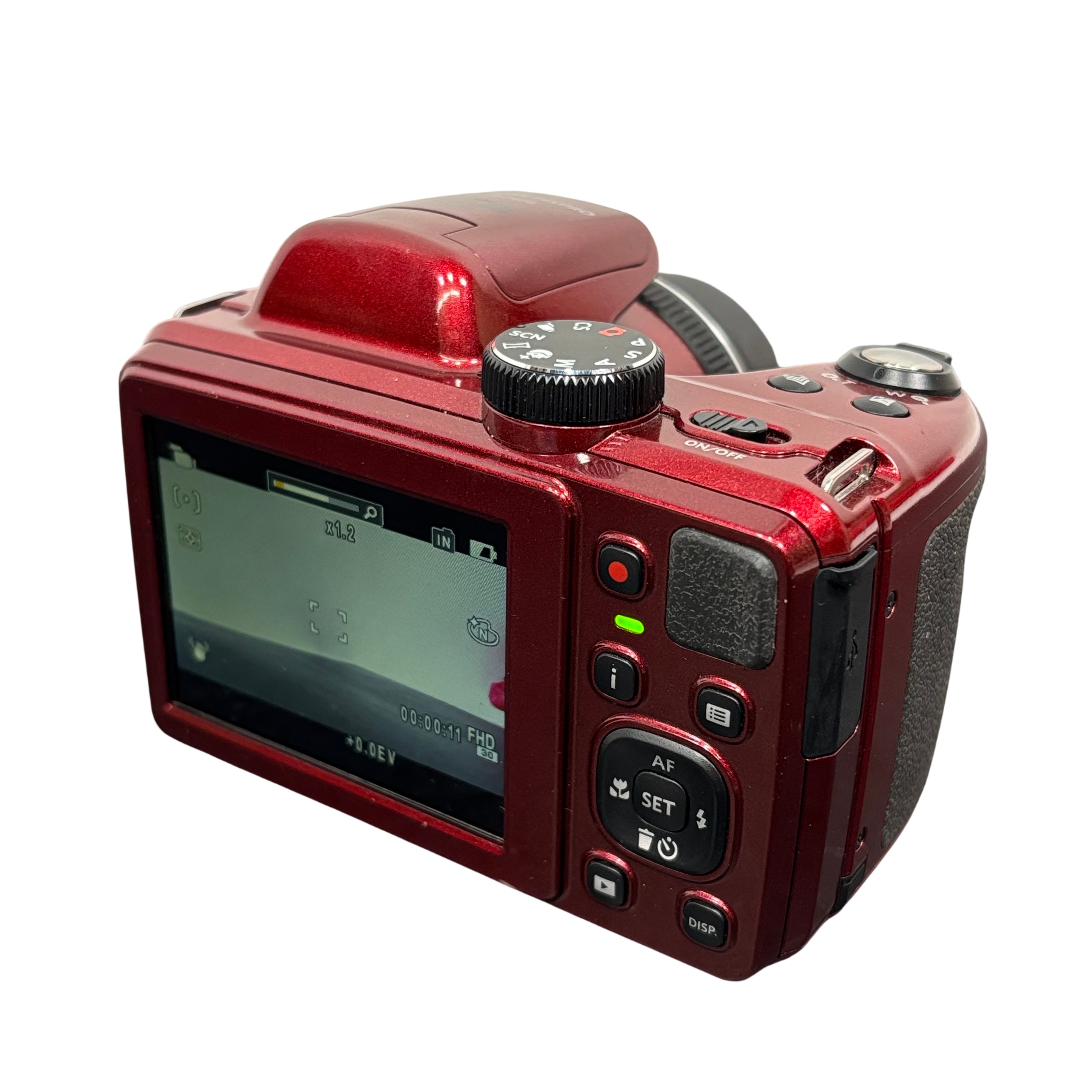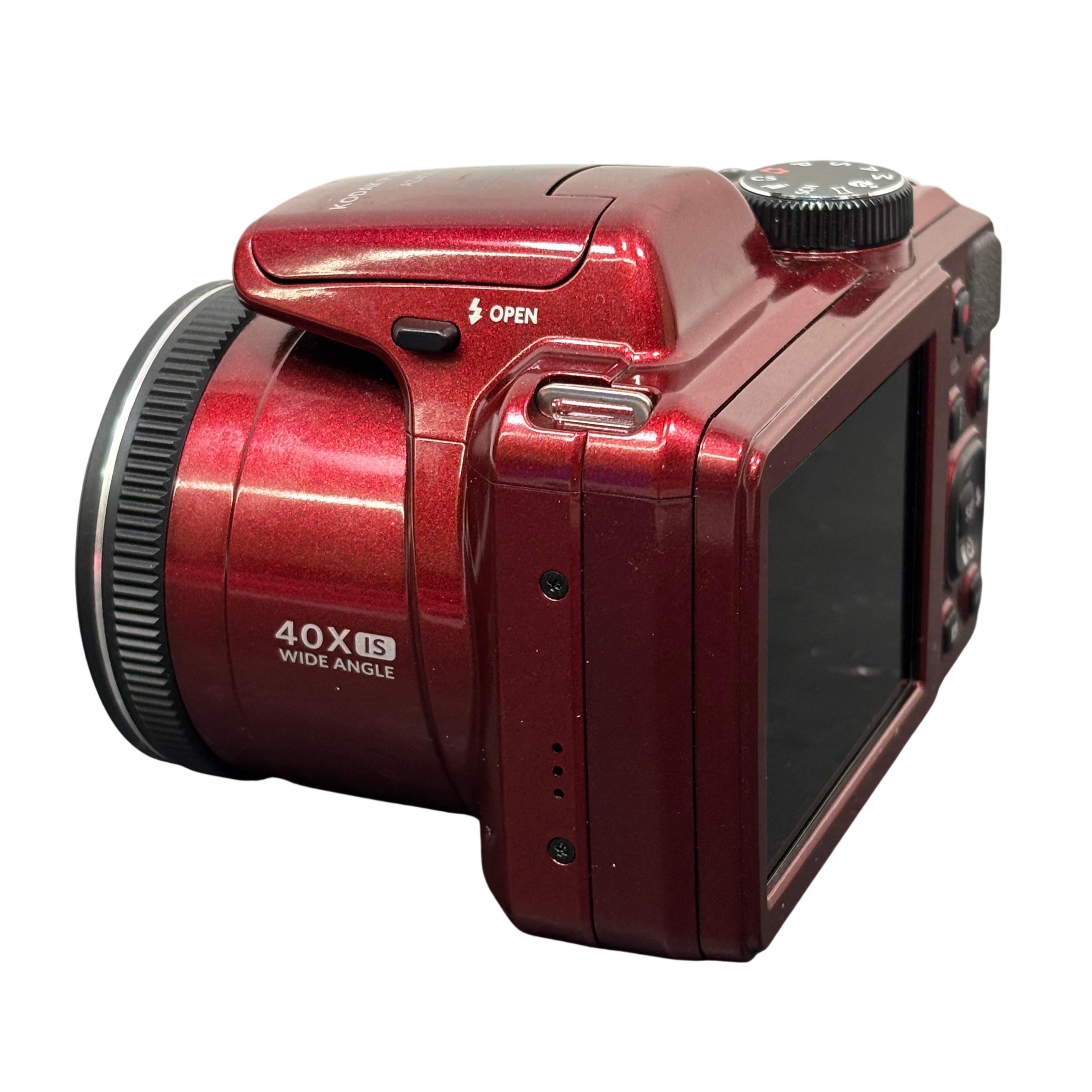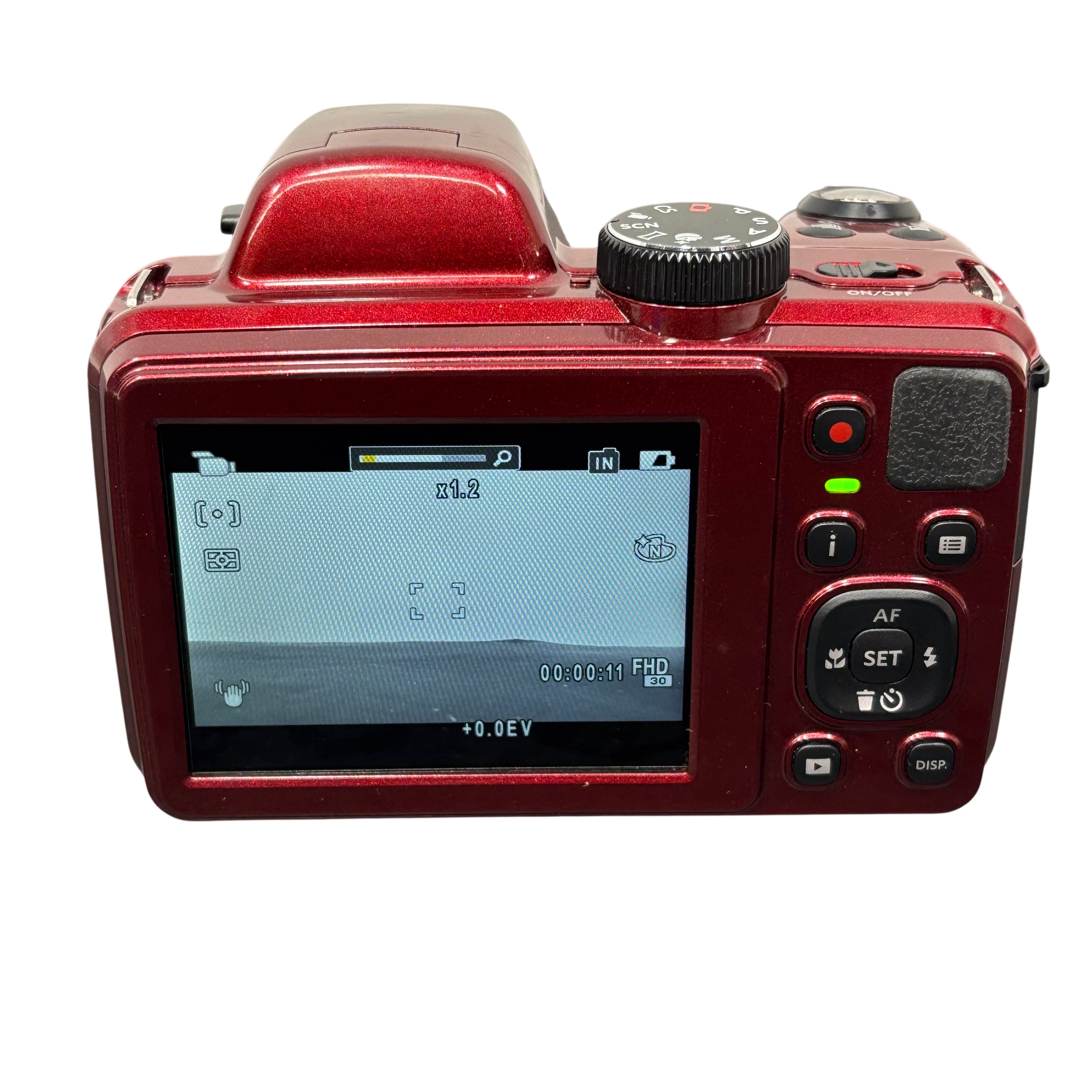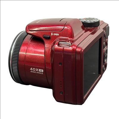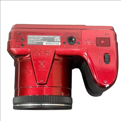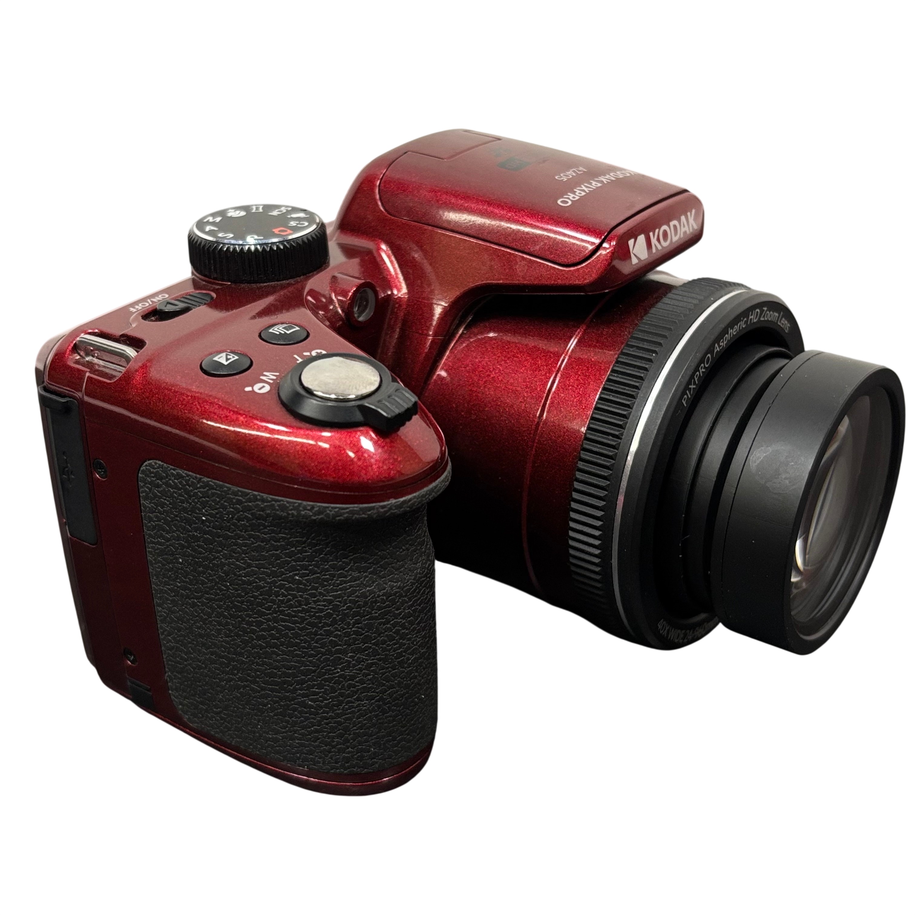 The Kodak PIXPRO AZ405 digital camera offers a powerful 40x optical zoom with a PIXPRO Aspheric HD lens covering an equivalent focal length of 24-960mm. This red compact camera supports Full HD video recording and uses standard AA batteries for convenient power replacement. Compatible with SDXC memory cards, it is ideal for users seeking versatile zoom capabilities in a portable design. The camera body is lightweight and easy to handle, making it suitable for travel and everyday photography.
