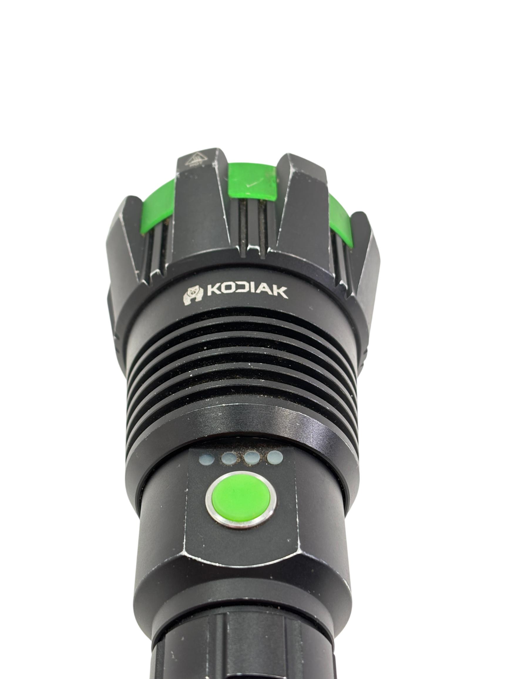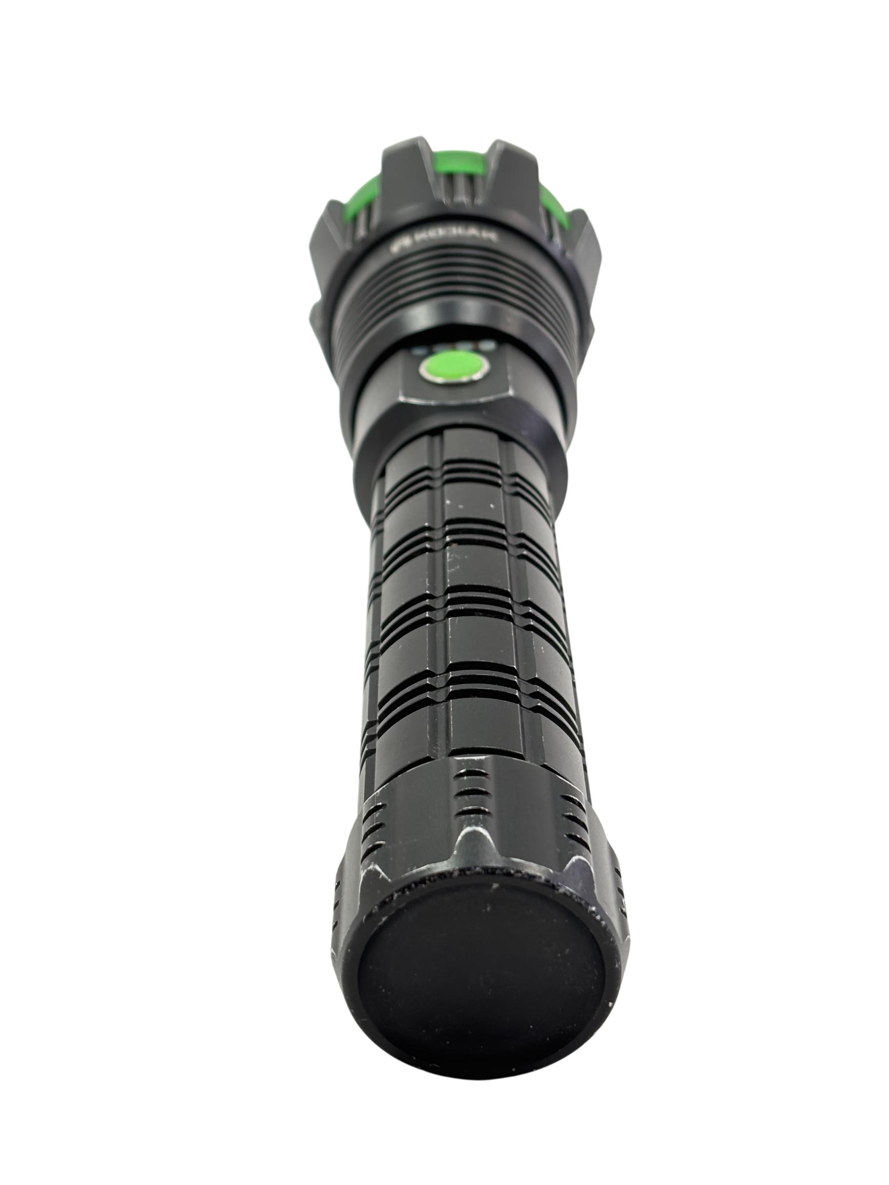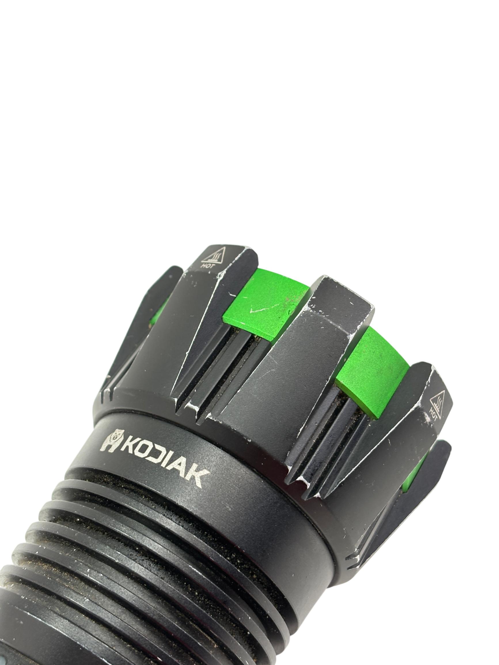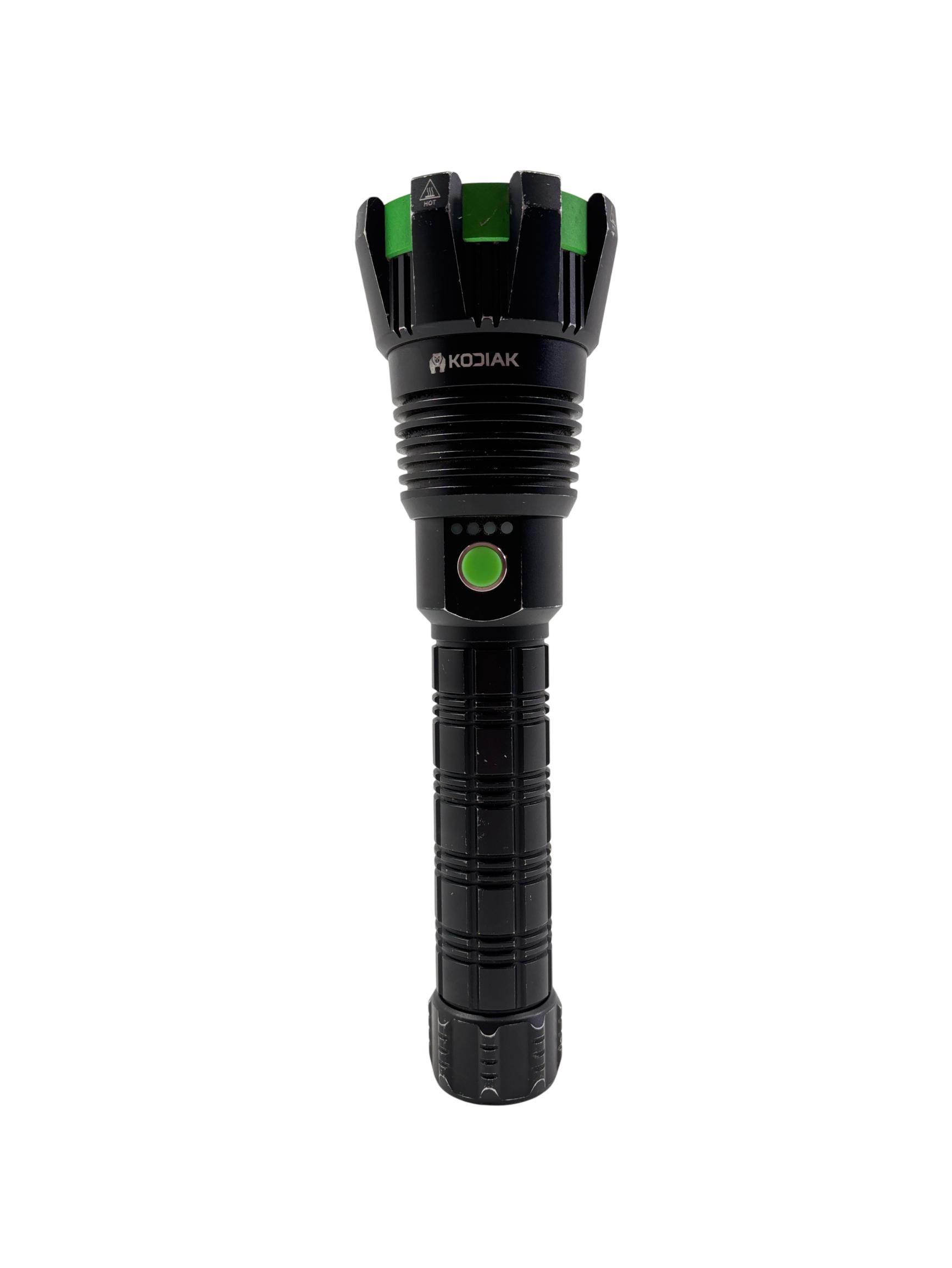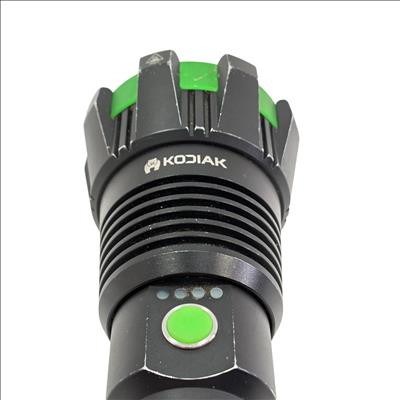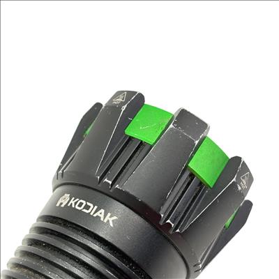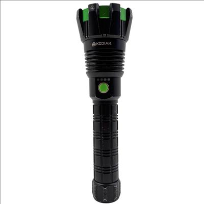 Kodiak Kolossus 15000 Lumen Rechargeable Tactical Flashlight delivers an exceptionally powerful beam with its high-output LED, designed for tactical, outdoor, and emergency use. Featuring a durable black and green polymer body, this flashlight offers superior grip and impact resistance, making it reliable in demanding conditions.