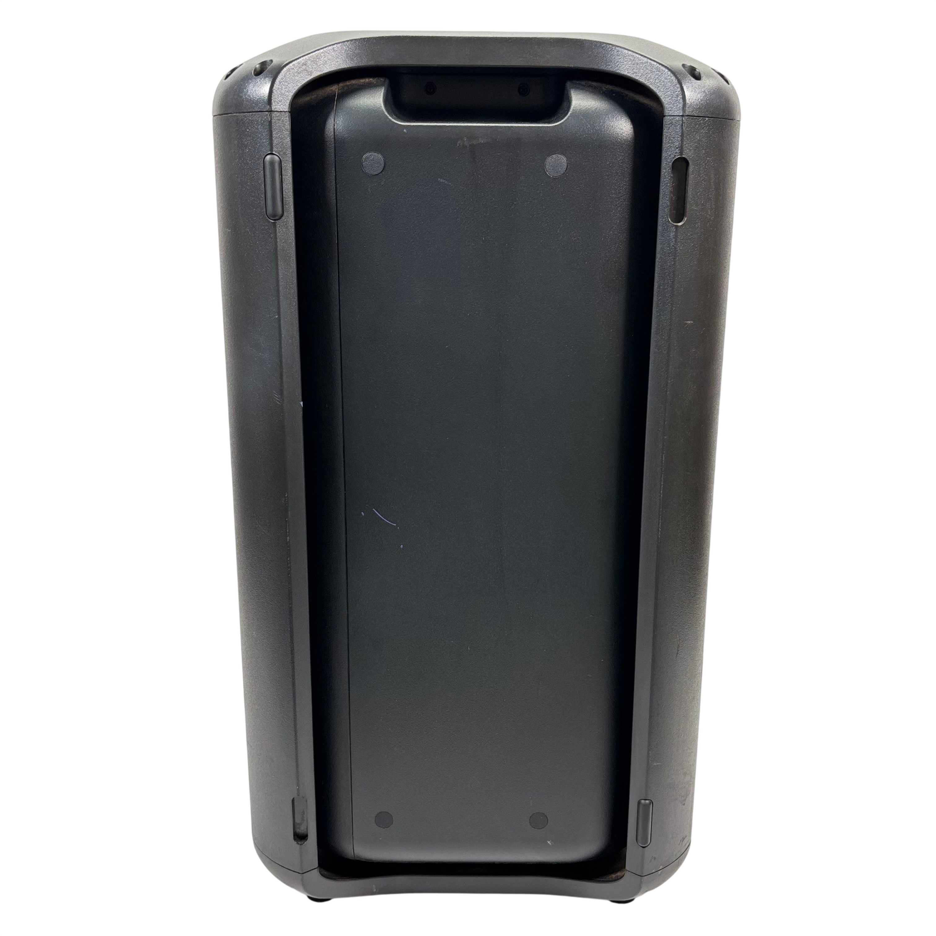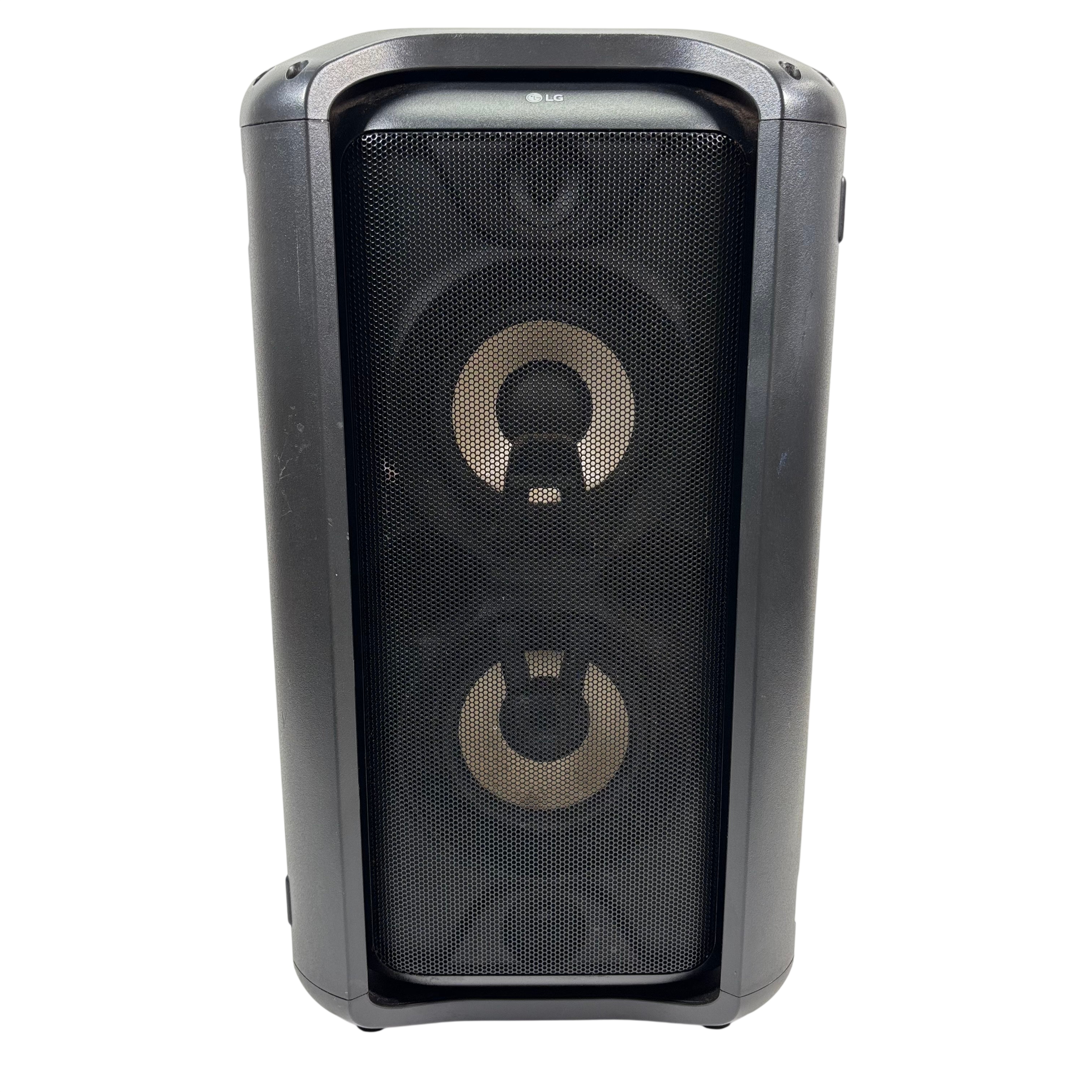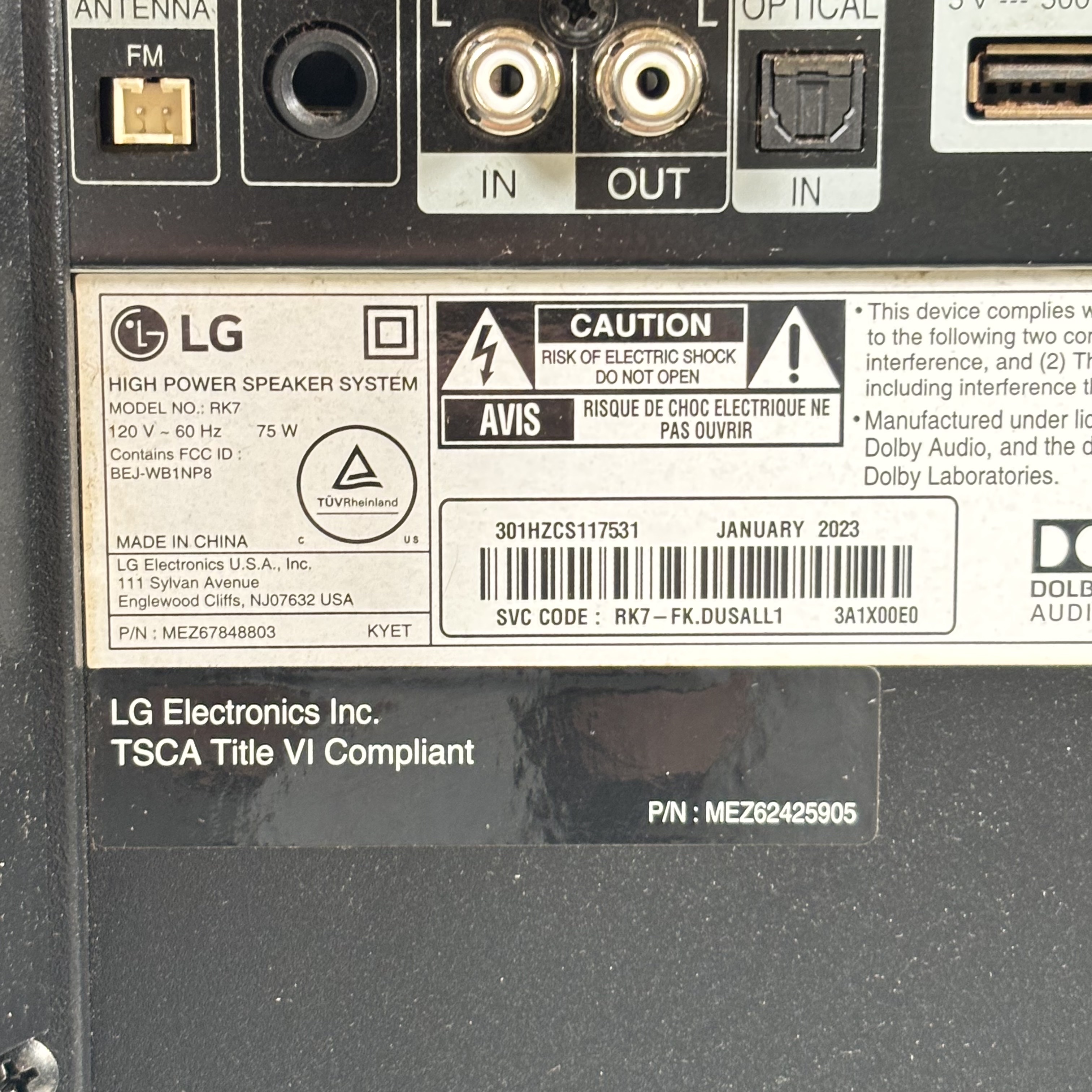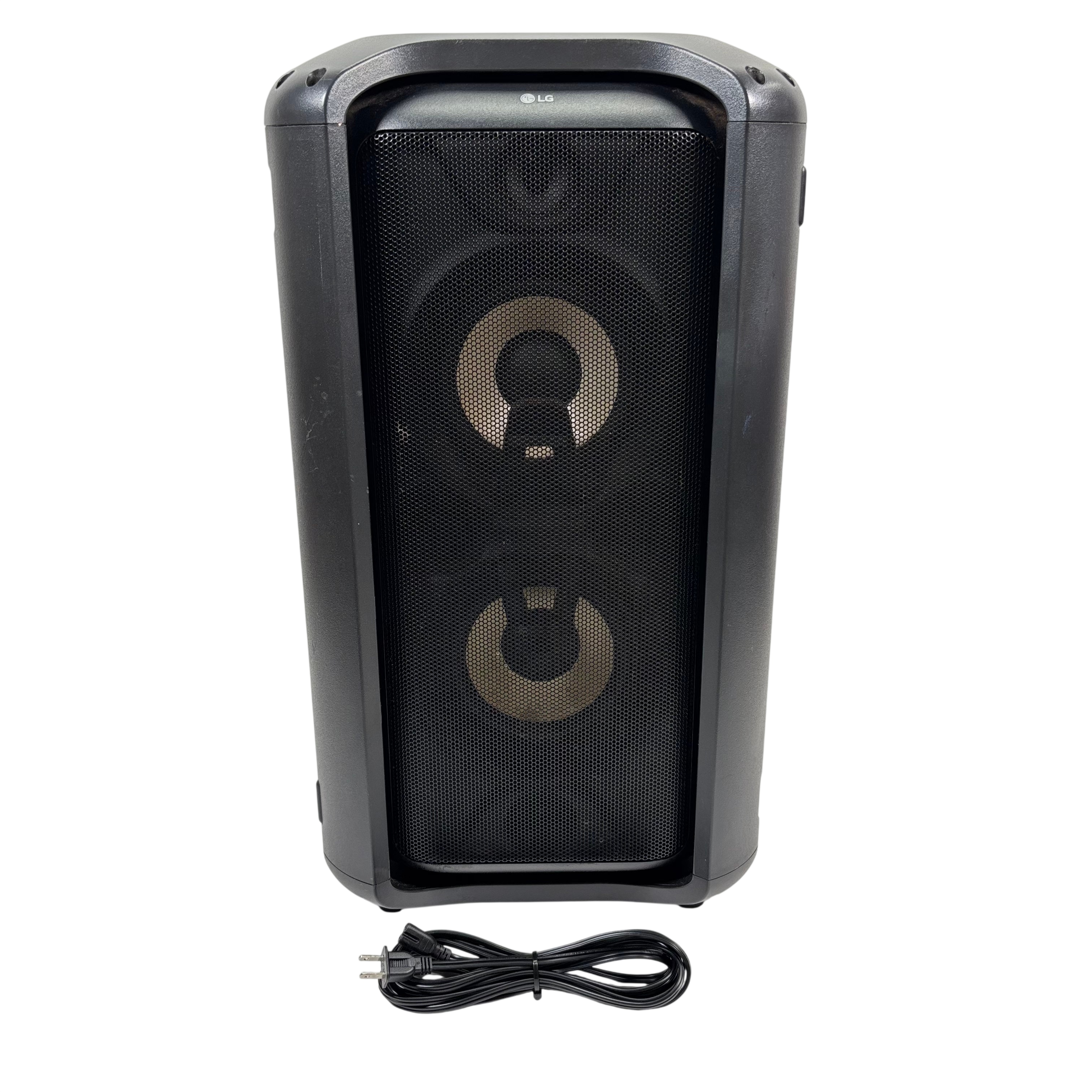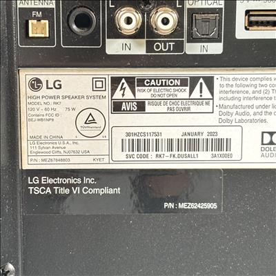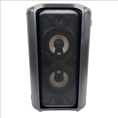 The LG High Power Speaker System RK7 delivers 75 watts of rich audio power with Dolby Audio support for an immersive listening experience. Operating at 120V and 60Hz, this speaker features multiple input options including FM antenna, optical input, and USB connectivity. Equipped with Auto DJ, Bass Blast sound effects, and customizable user EQ, it is designed for dynamic sound performance. Its compact black design with lighting effects makes it ideal for home entertainment or parties.