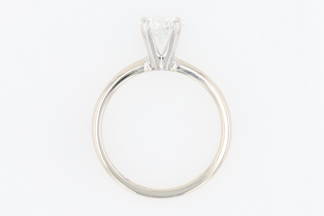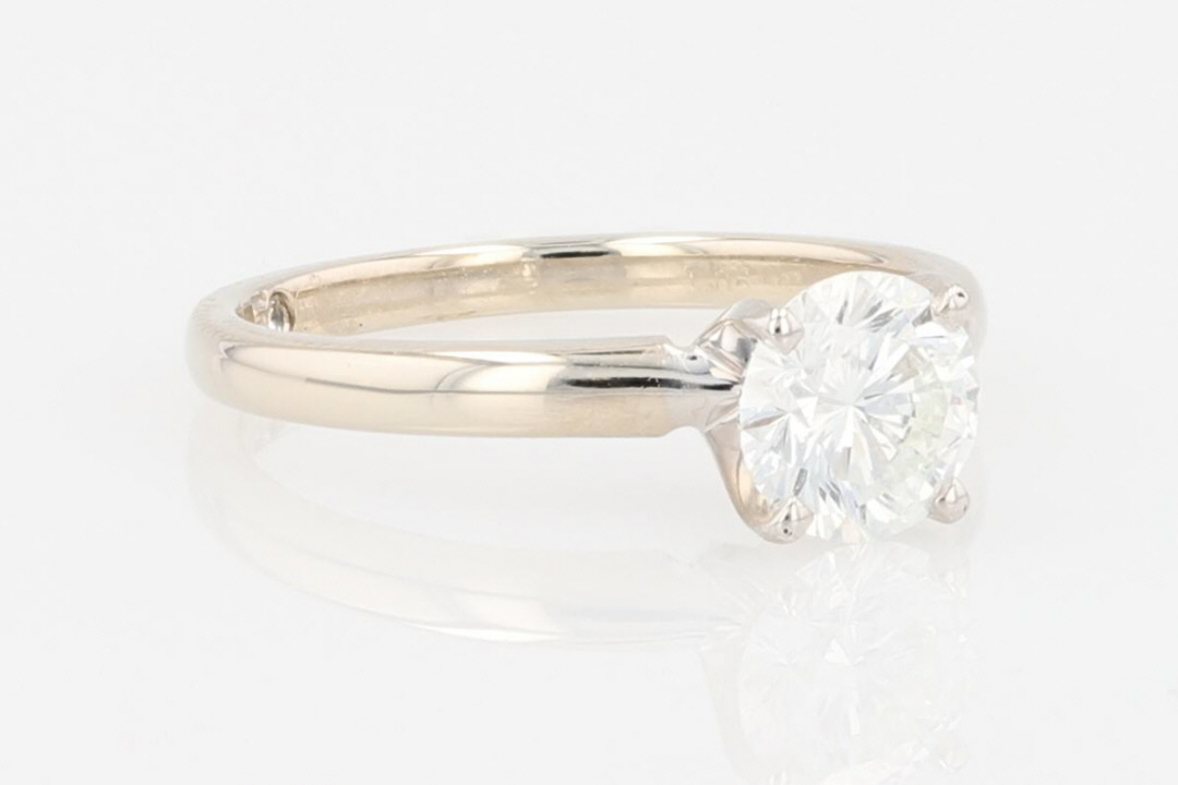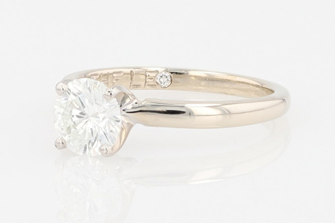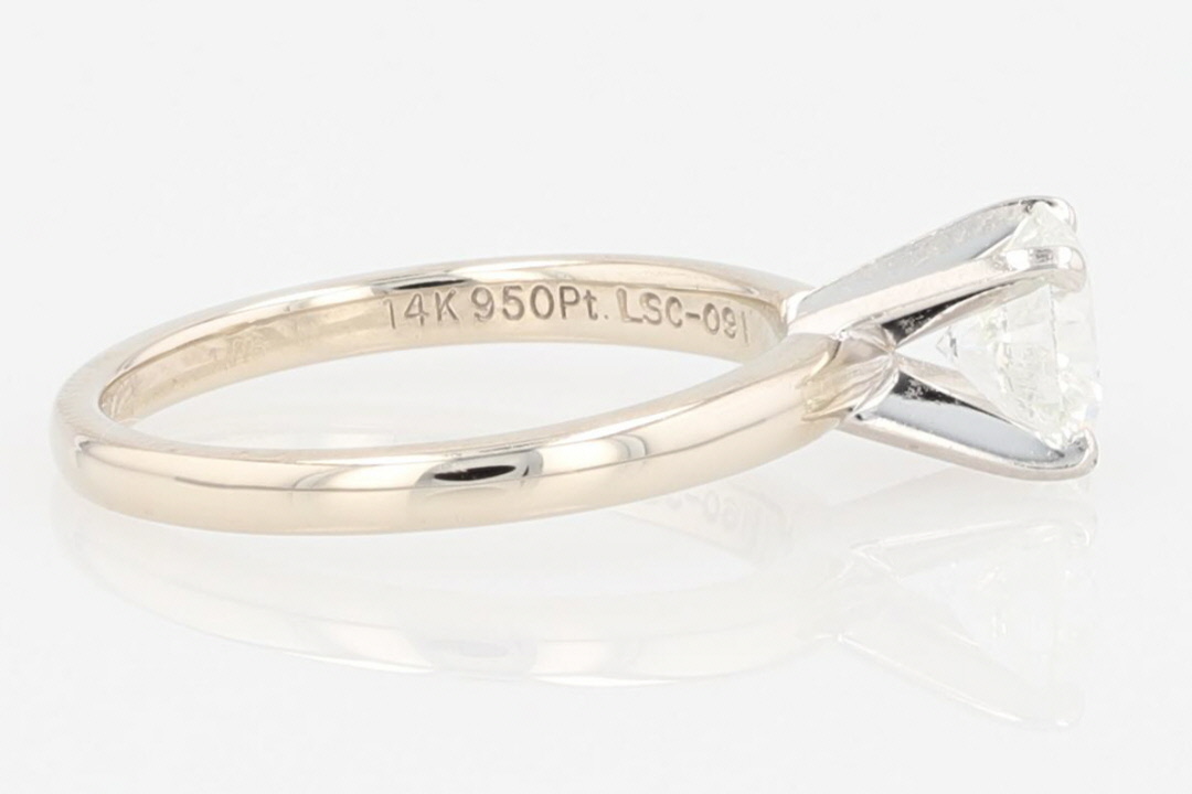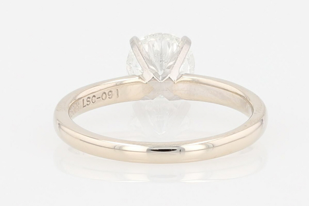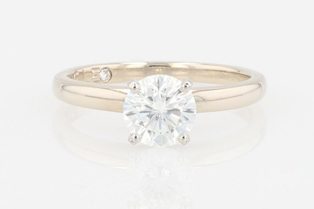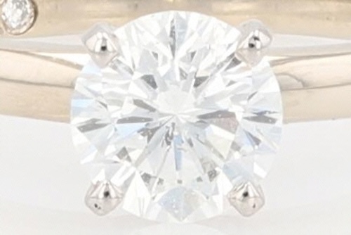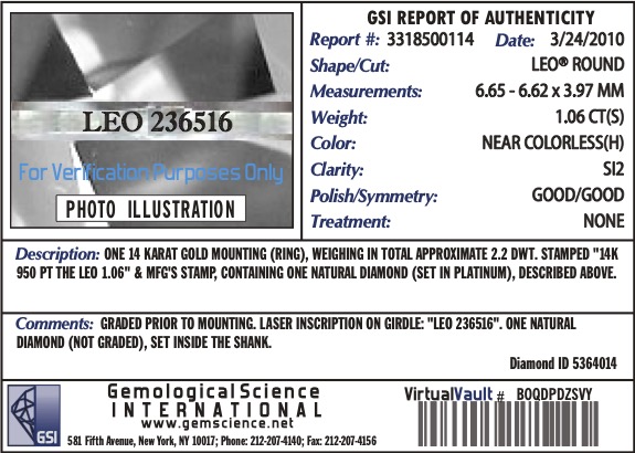 The primary diamond is laserscribed with LEO 236516 on the girdle. Stone set inside shank not graded.