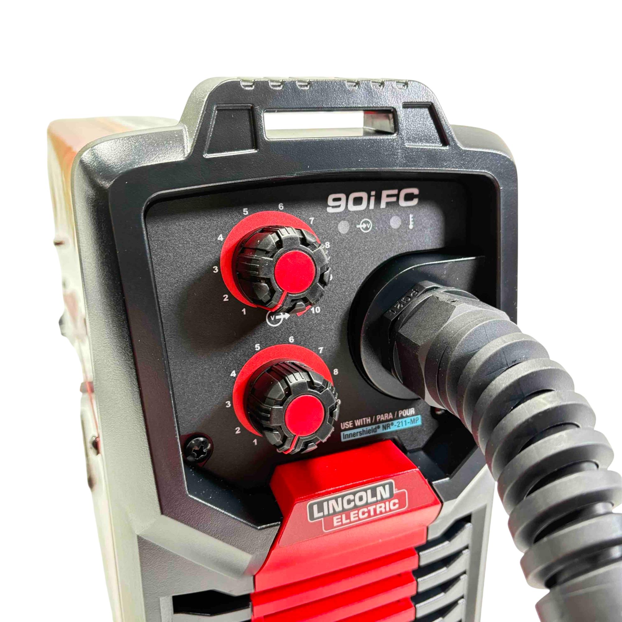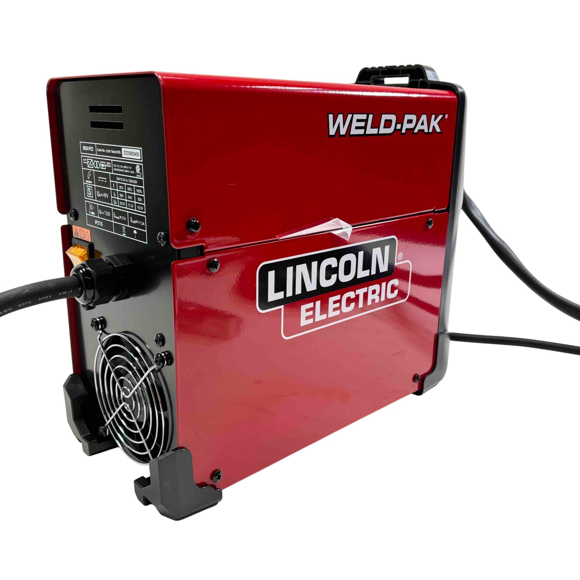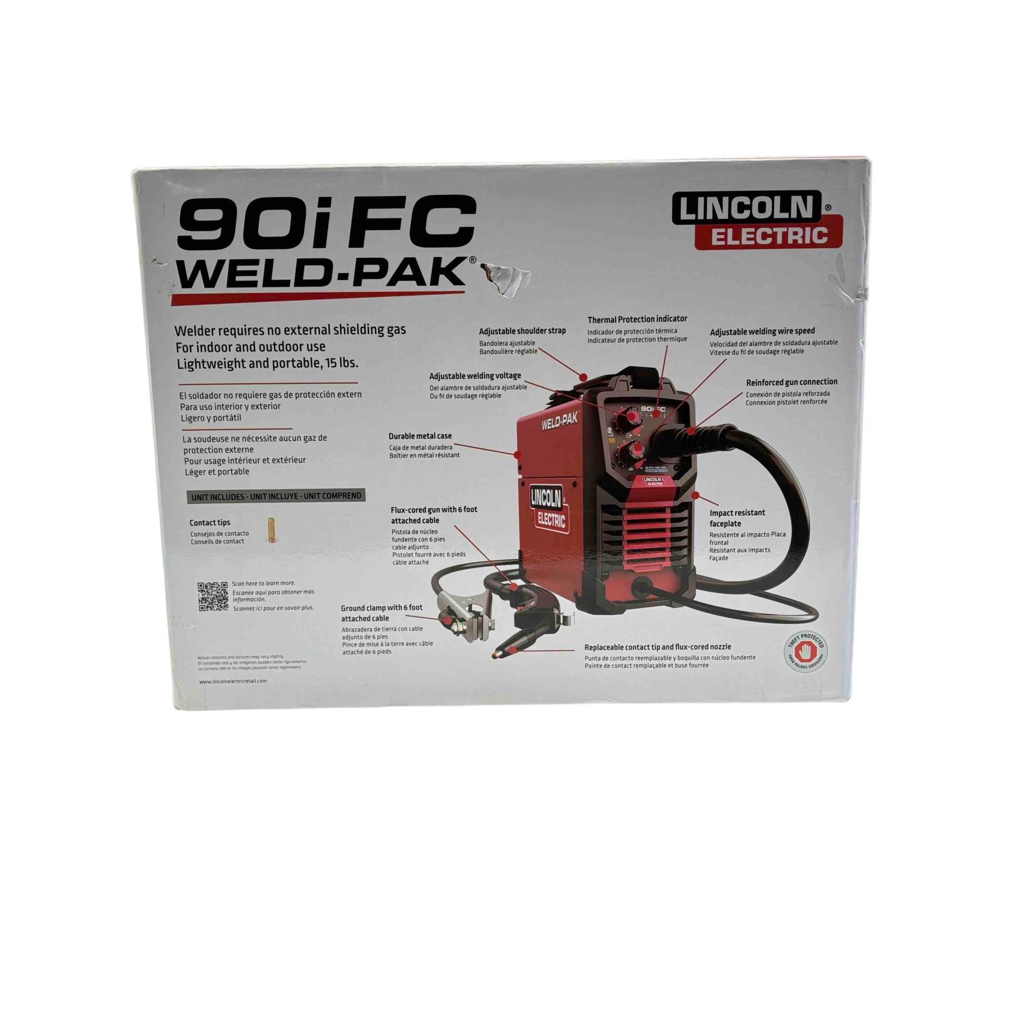 Introducing the Lincoln Electric Weld-Pak 90i FC, a flux-cored wire feed welder designed for both indoor and outdoor use without the need for external shielding gas. This lightweight, portable welder features inverter technology for energy efficiency and precise control, making it perfect for welding steel up to 1/4" thick. With adjustable voltage and wire speed, reinforced gun connection, and included flux-cored gun and ground clamp, this welder is ready to handle your toughest welding tasks.