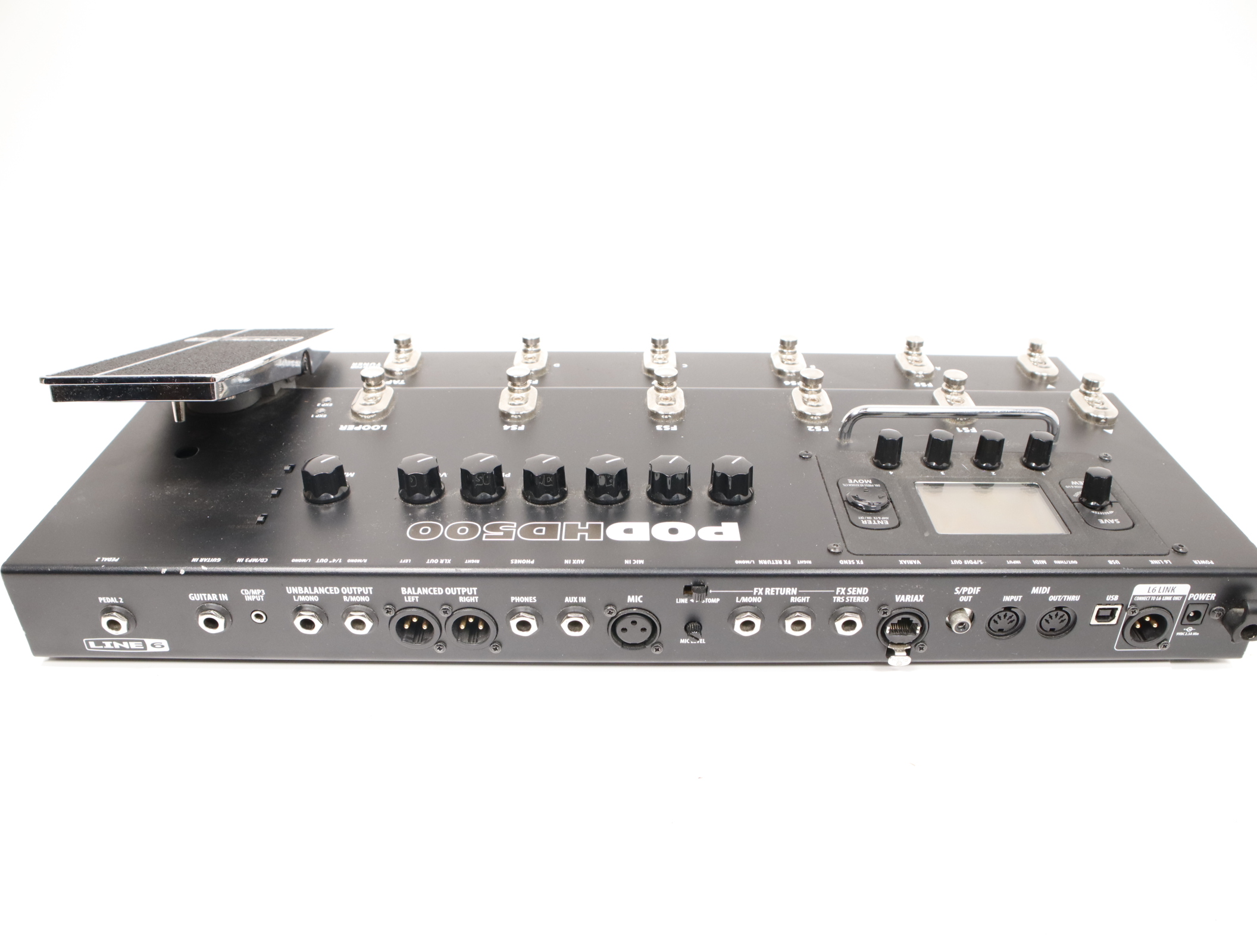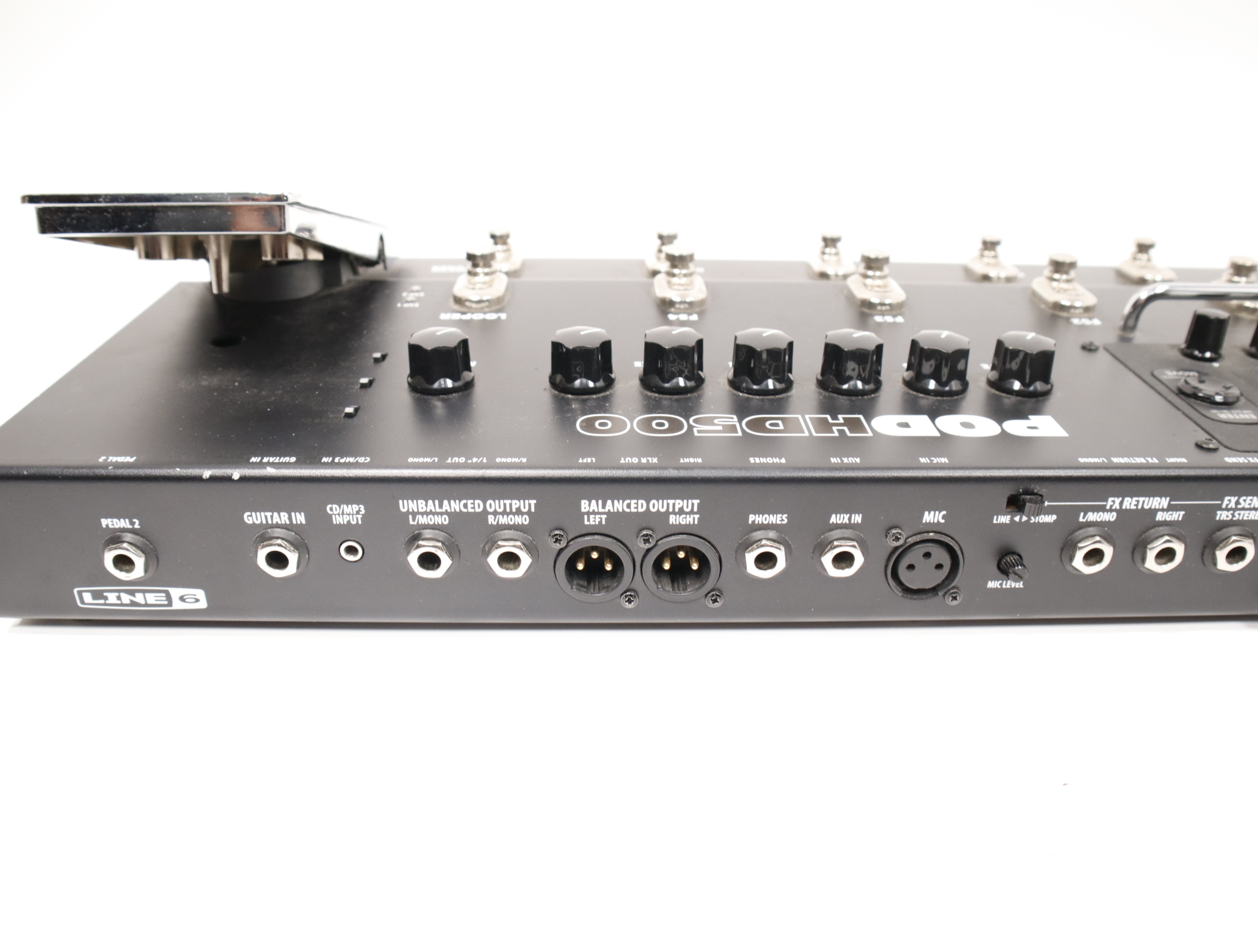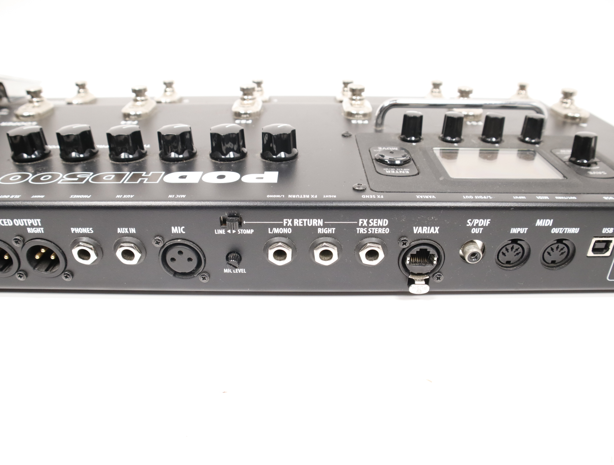 When it comes to connectivity, the HD500 has it all. There's a quarter-inch guitar input jack, a quarter-inch aux input jack, a mini-jack stereo input for MP3 players and a balanced XLR mic input with gain trim (but, alas, no phantom power). There's also a digital input for a Line 6 Variax Guitar, and MIDI connections (In and Out/Thru) on two DIN sockets. On the output side, there are two balanced XLRs for the left and right channels (which are duplicated on unbalanced quarter-inch jacks), a stereo effects loop and a quarter-inch stereo headphone jack.