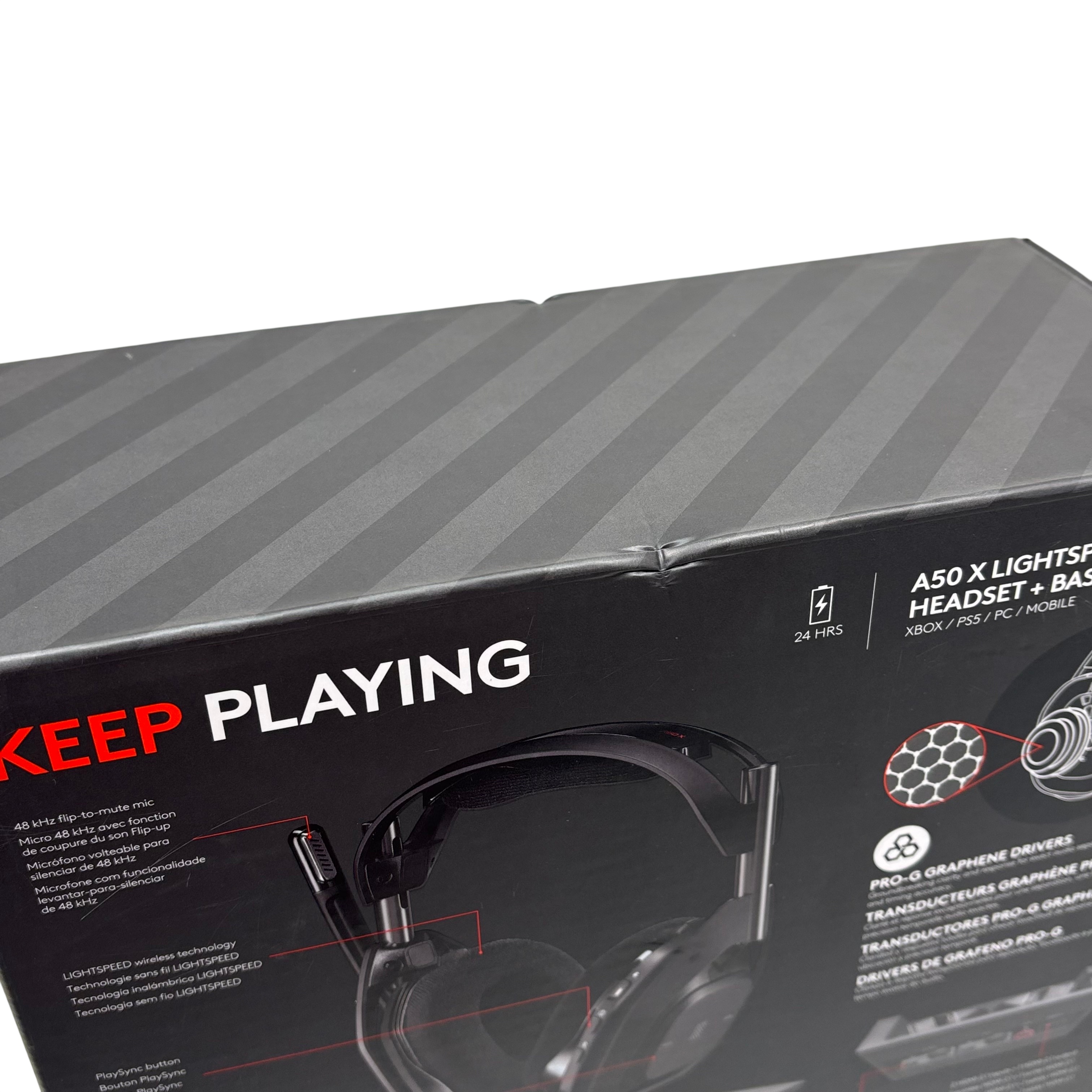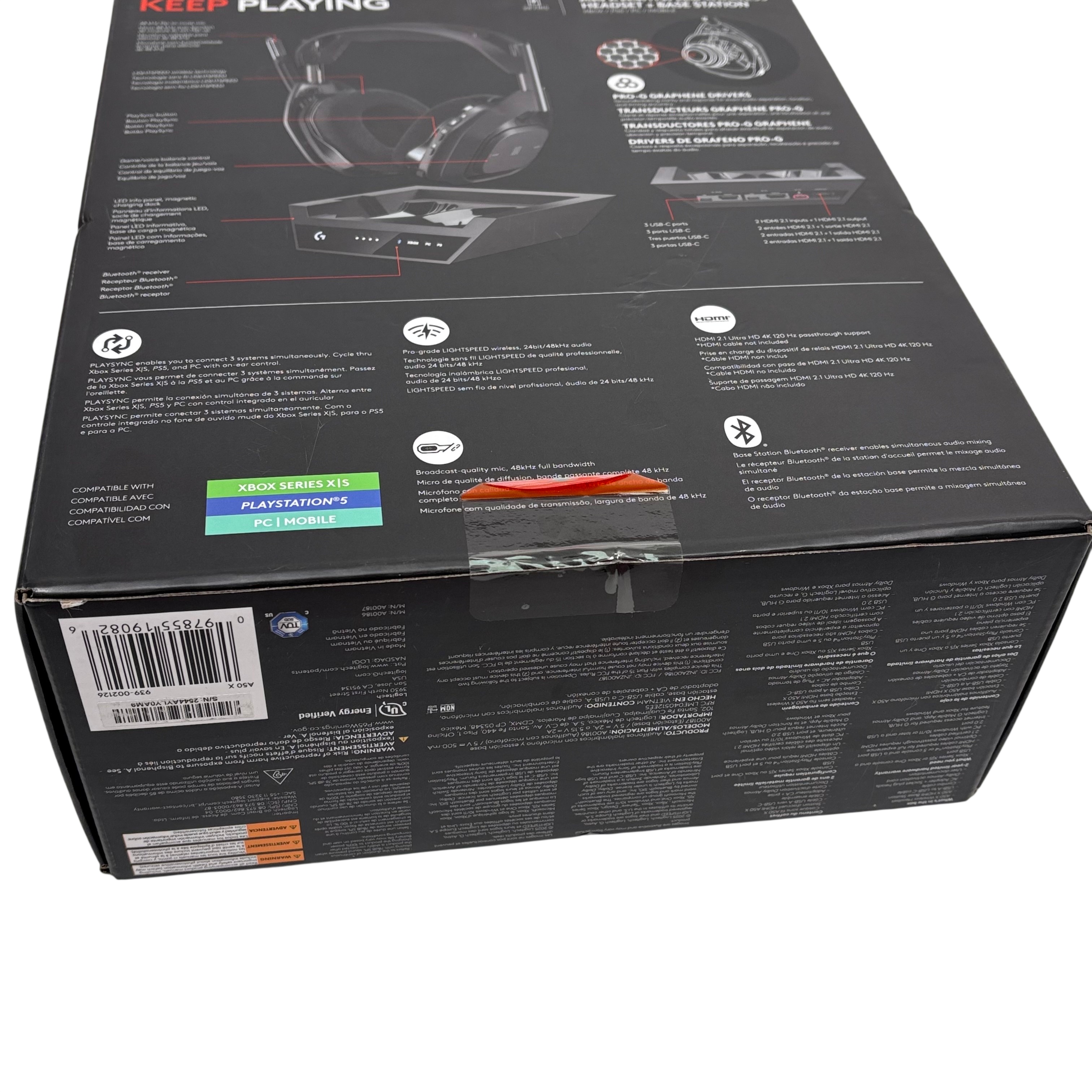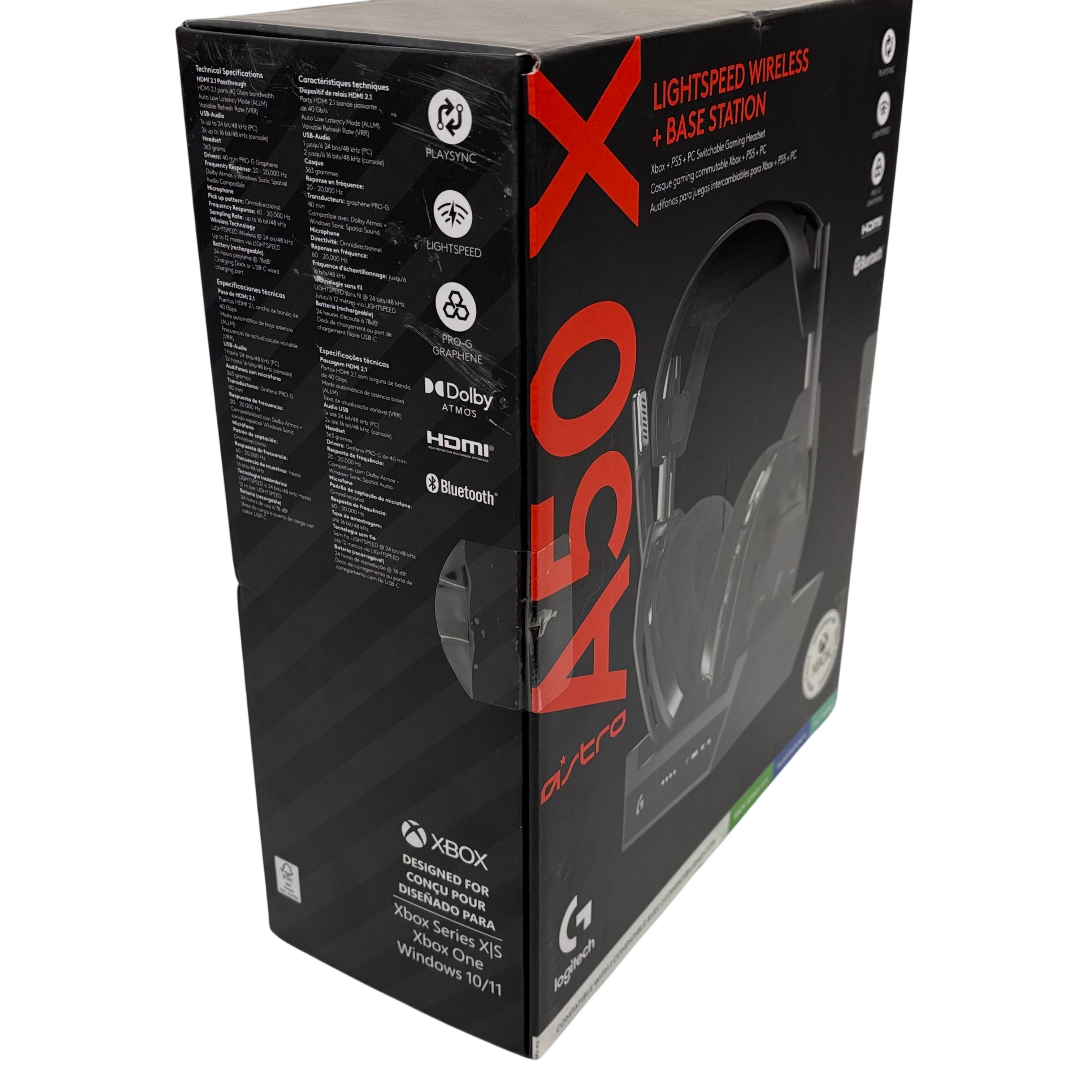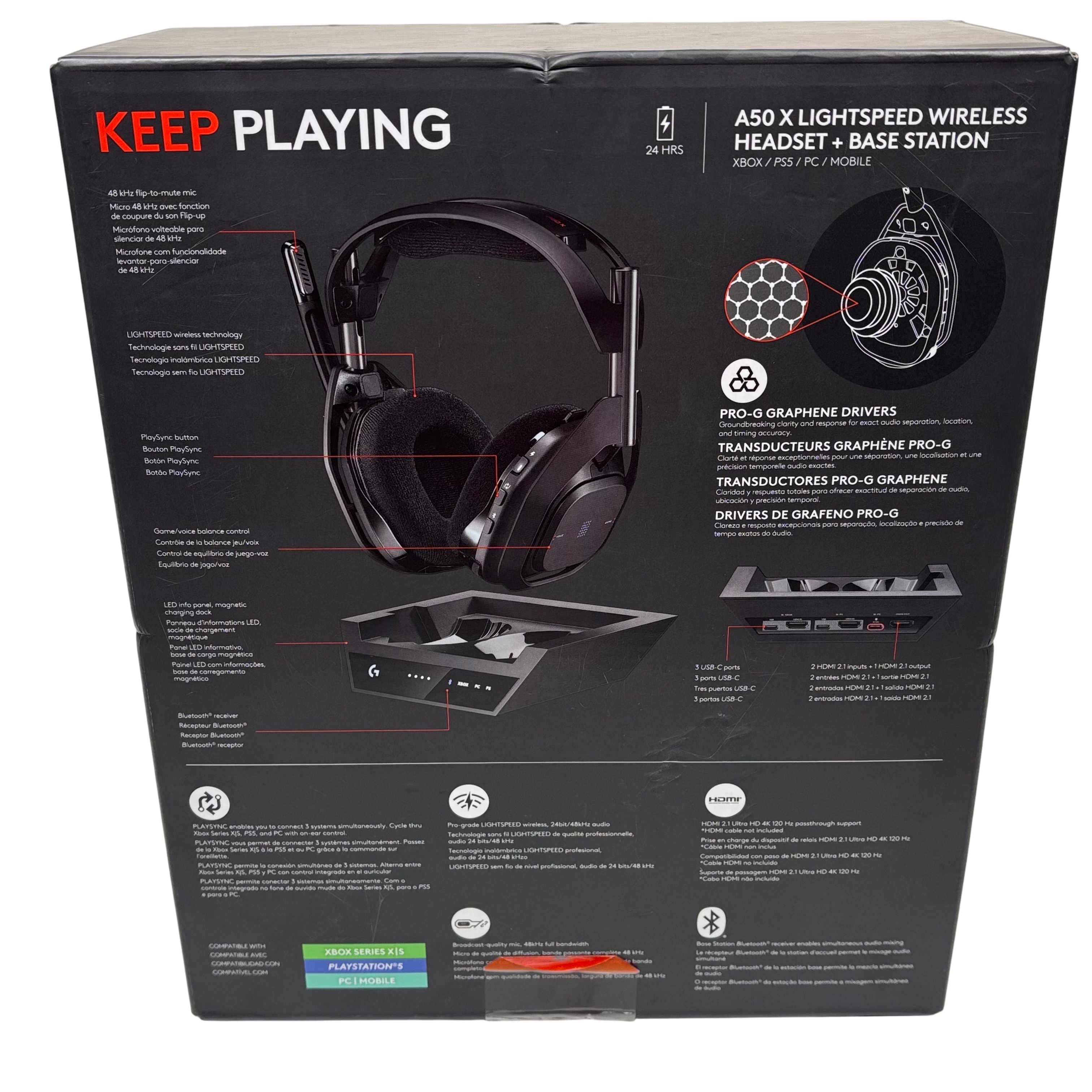 The Logitech Astro A50 X Lightspeed Wireless Gaming Headset with Base Station delivers premium audio performance with 40 mm PRO-G graphene drivers and Dolby Atmos support. Designed for Xbox Series X|S, PlayStation 5, PC, and mobile compatibility, this headset features low-latency Lightspeed wireless technology and Bluetooth connectivity. The flip-to-mute omnidirectional microphone ensures clear communication, while the rechargeable battery offers up to 24 hours of continuous gameplay. Included is a sleek base station with USB-C charging dock for convenient wireless charging and seamless connectivity.