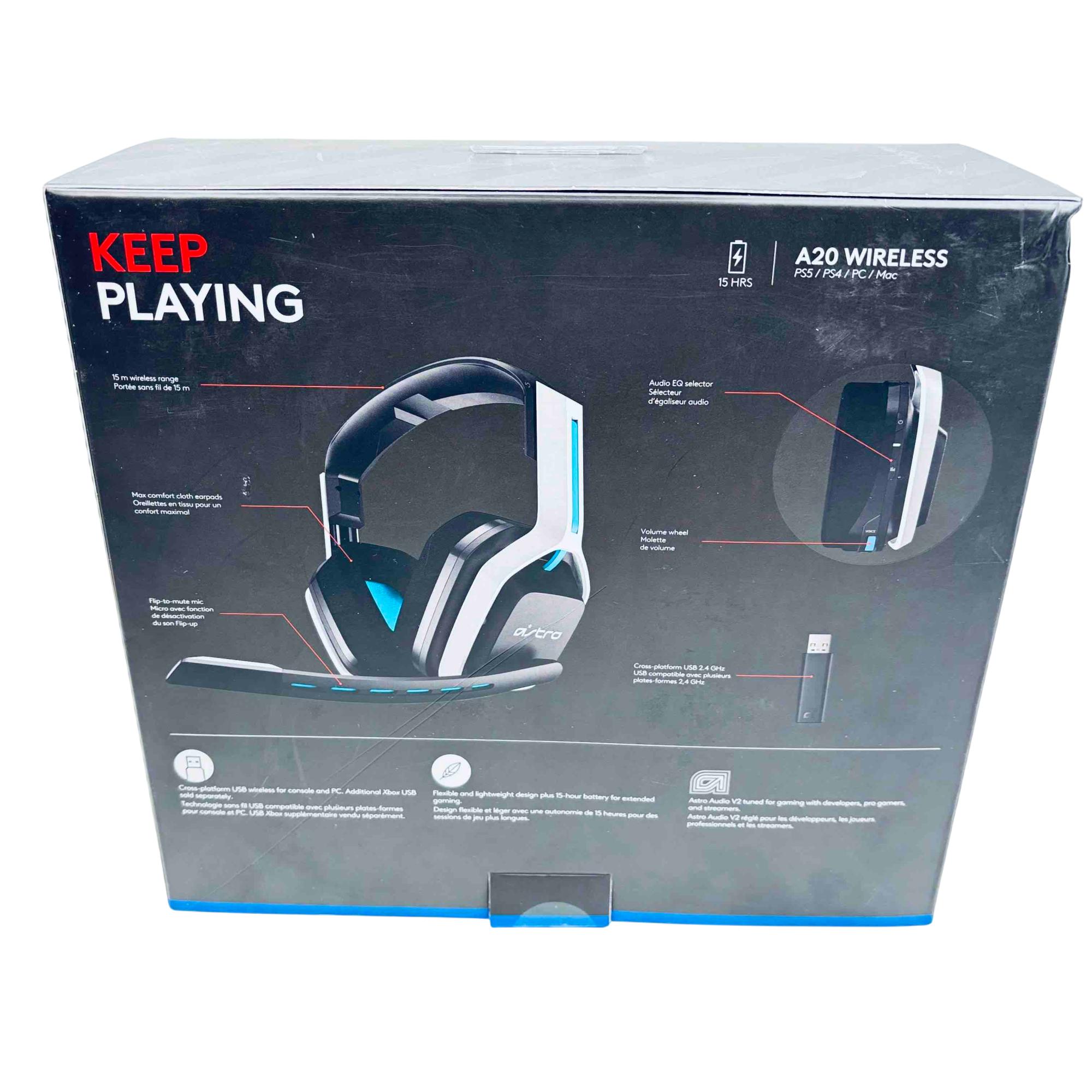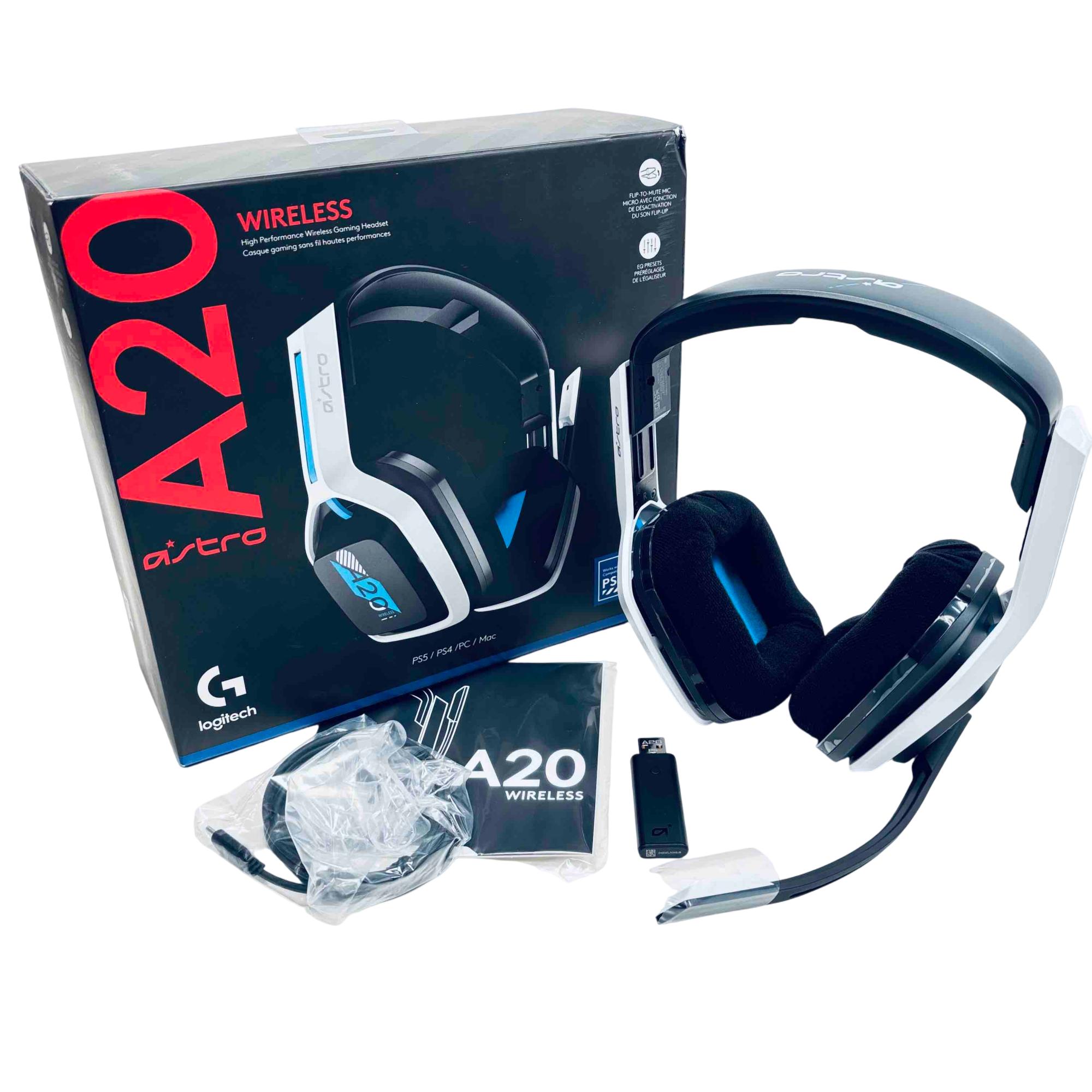 The Logitech Astro A20 Wireless Gaming Headset Gen 2 offers high-performance wireless audio with a 15-meter range, designed for PS5, PS4, PC, and Mac compatibility. It features Astro Audio V2 tuning for immersive gaming sound, a flip-to-mute microphone, and an audio equalizer selector for customizable sound profiles. The headset is built with maximum comfort in mind, including cloth earpads and a lightweight, flexible design ideal for extended gaming sessions.