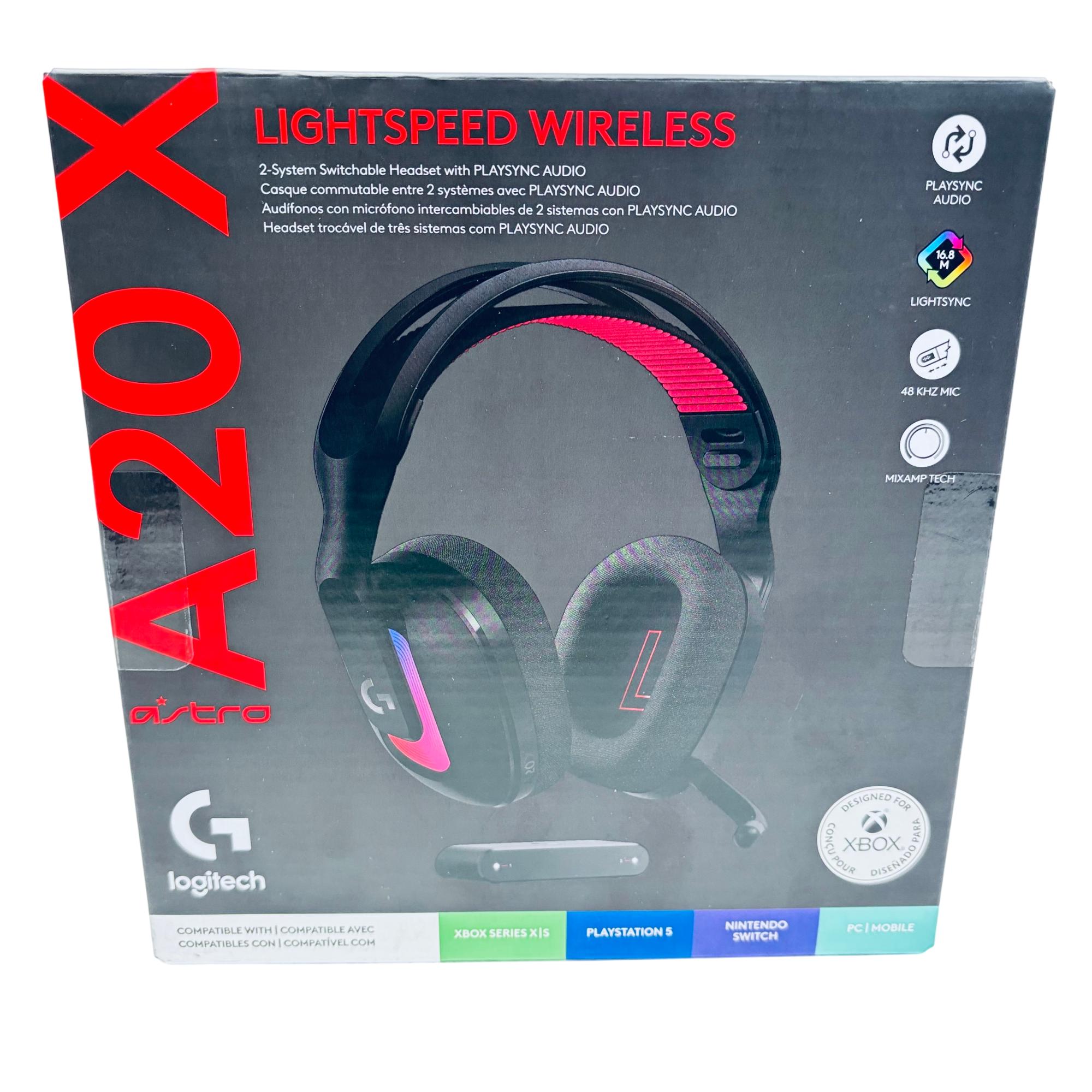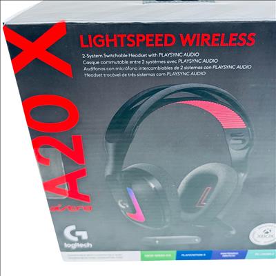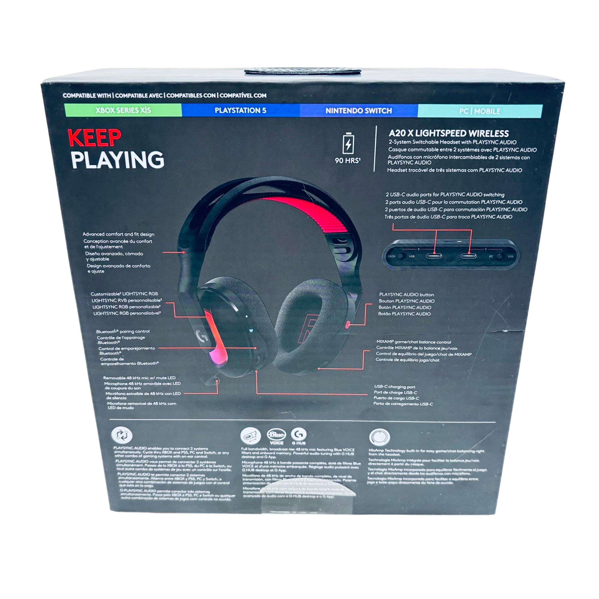 Logitech Astro A20 X LIGHTSPEED Wireless Gaming Headset offers high-fidelity audio with LIGHTSPEED wireless technology for a lag-free, immersive gaming experience. It features PLAYSYNC audio for seamless switching between two systems and a 48 kHz microphone for clear communication, making it compatible with multiple platforms including Xbox, PlayStation 5, Nintendo Switch, PC, and mobile devices.