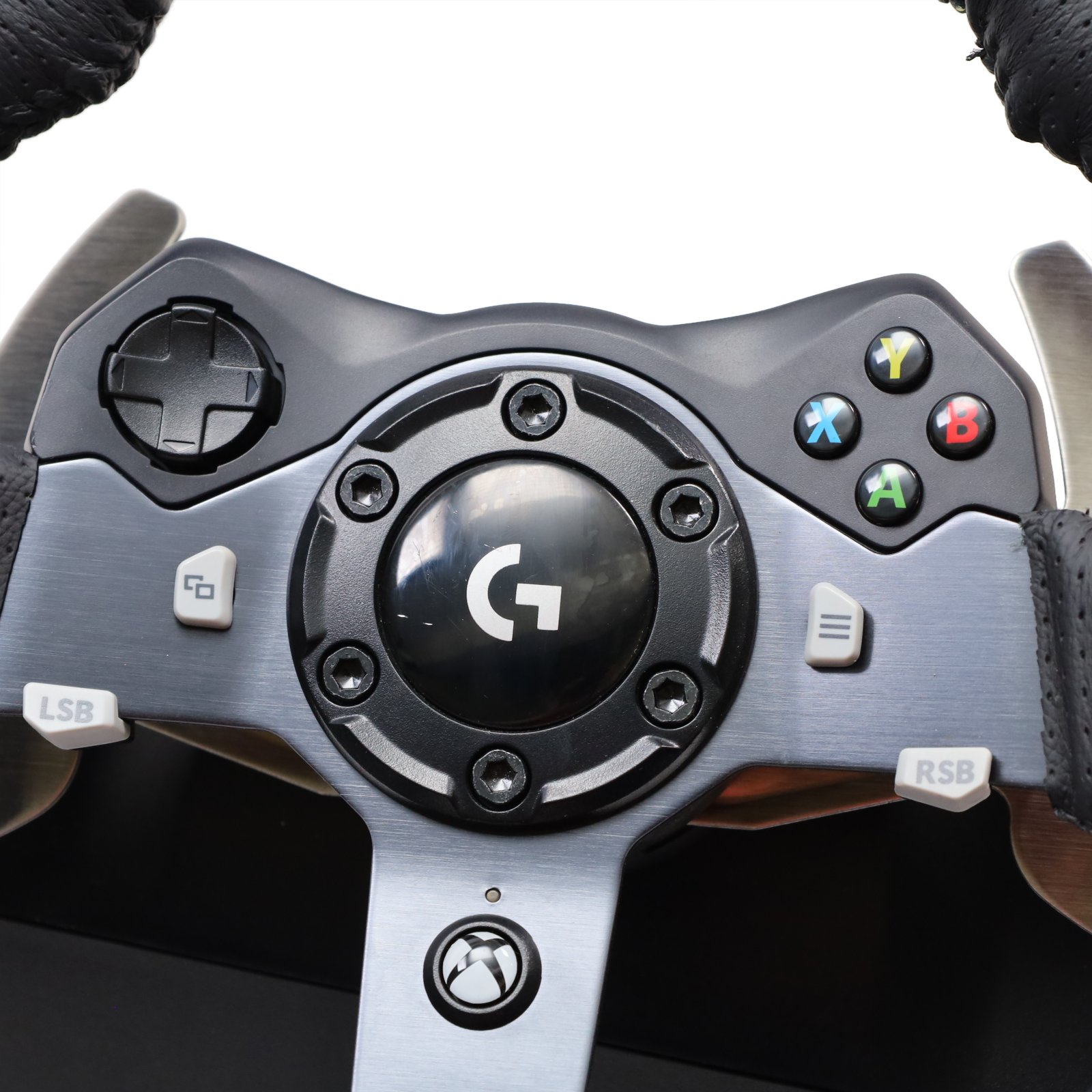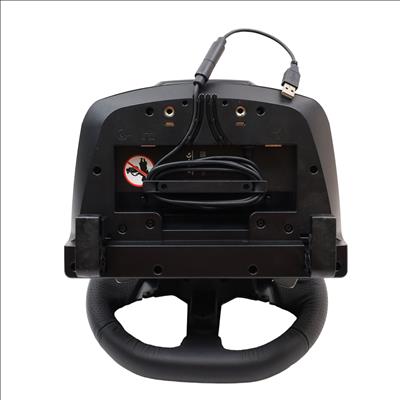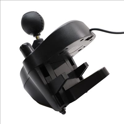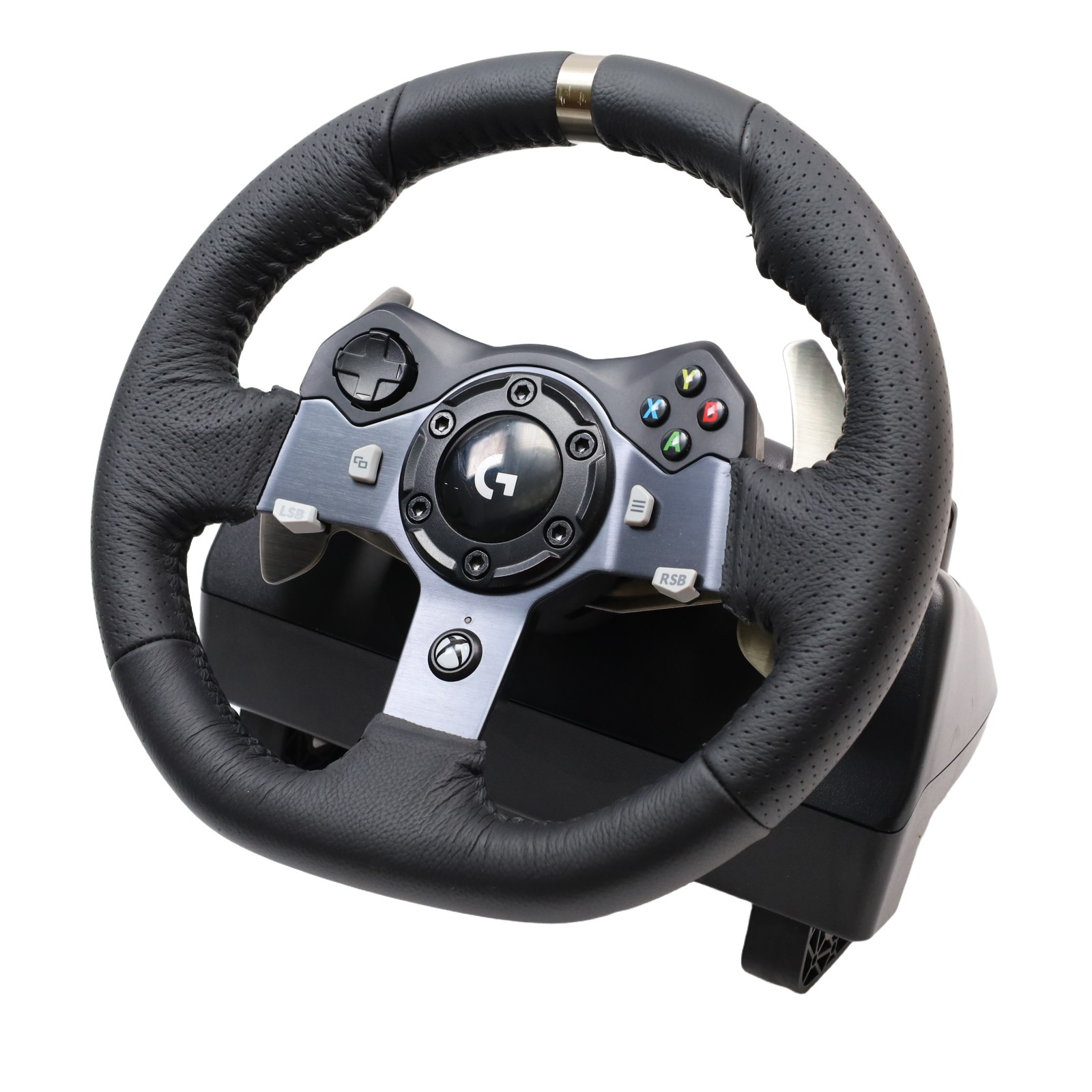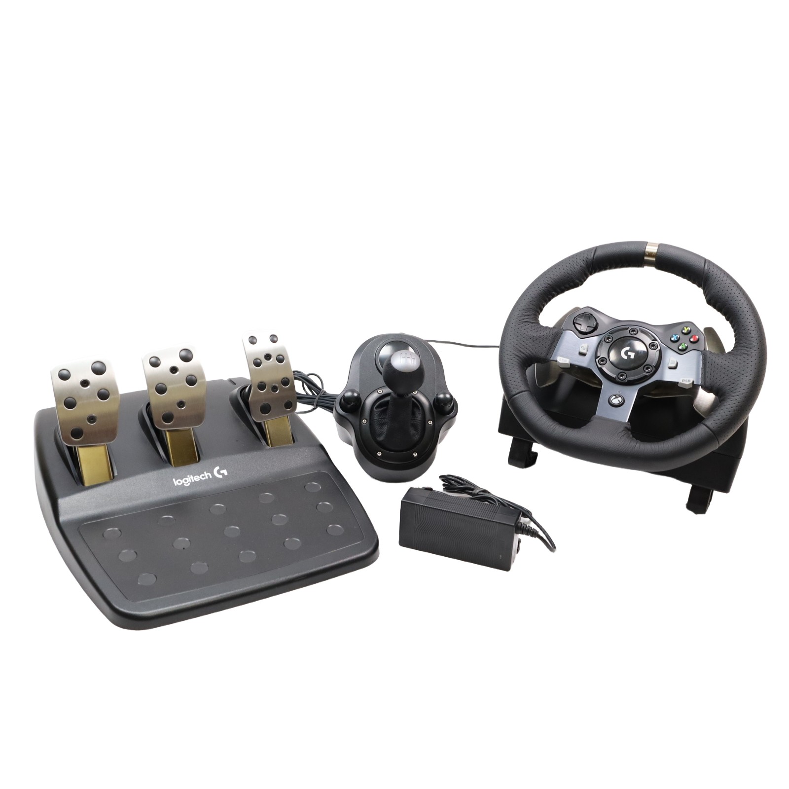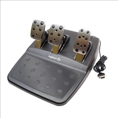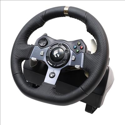 Features a 10.24" wheel covered in hand-stitched leather, 900° steering rotation, and dual-motor force feedback. It includes a responsive 3-pedal set with throttle, brake, and clutch pedals designed to mimic an actual car, along with a nonlinear brake pedal for precise braking. The wheel and pedals are constructed with solid steel ball bearings and stainless steel components, and helical gearing with anti-backlash ensures smooth, quiet operation. Compatible with Microsoft Xbox One and Windows PCs, the G920 offers easy access to game controls via a directional pad and Xbox One buttons. The set mounts securely to tables or racing rigs and features rubber feet for hard surfaces and a retractable grip system for carpets.