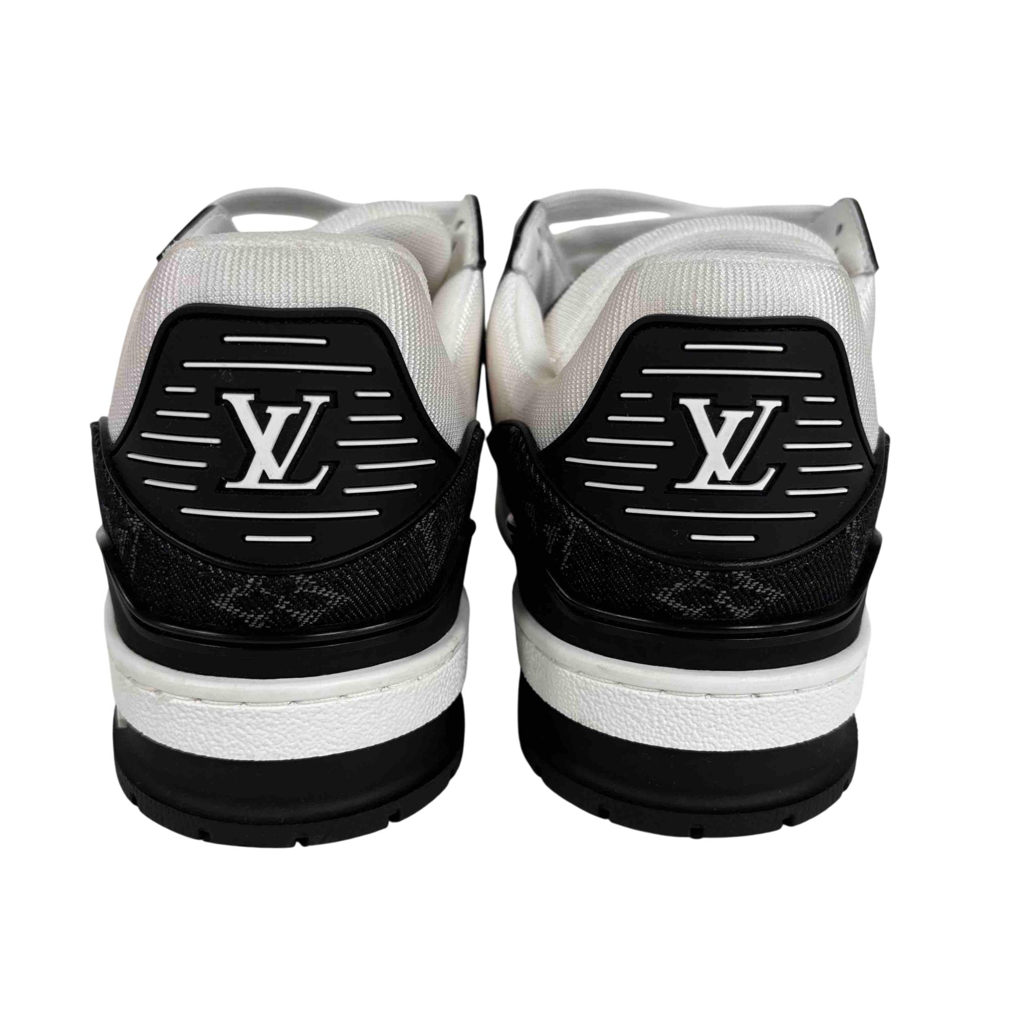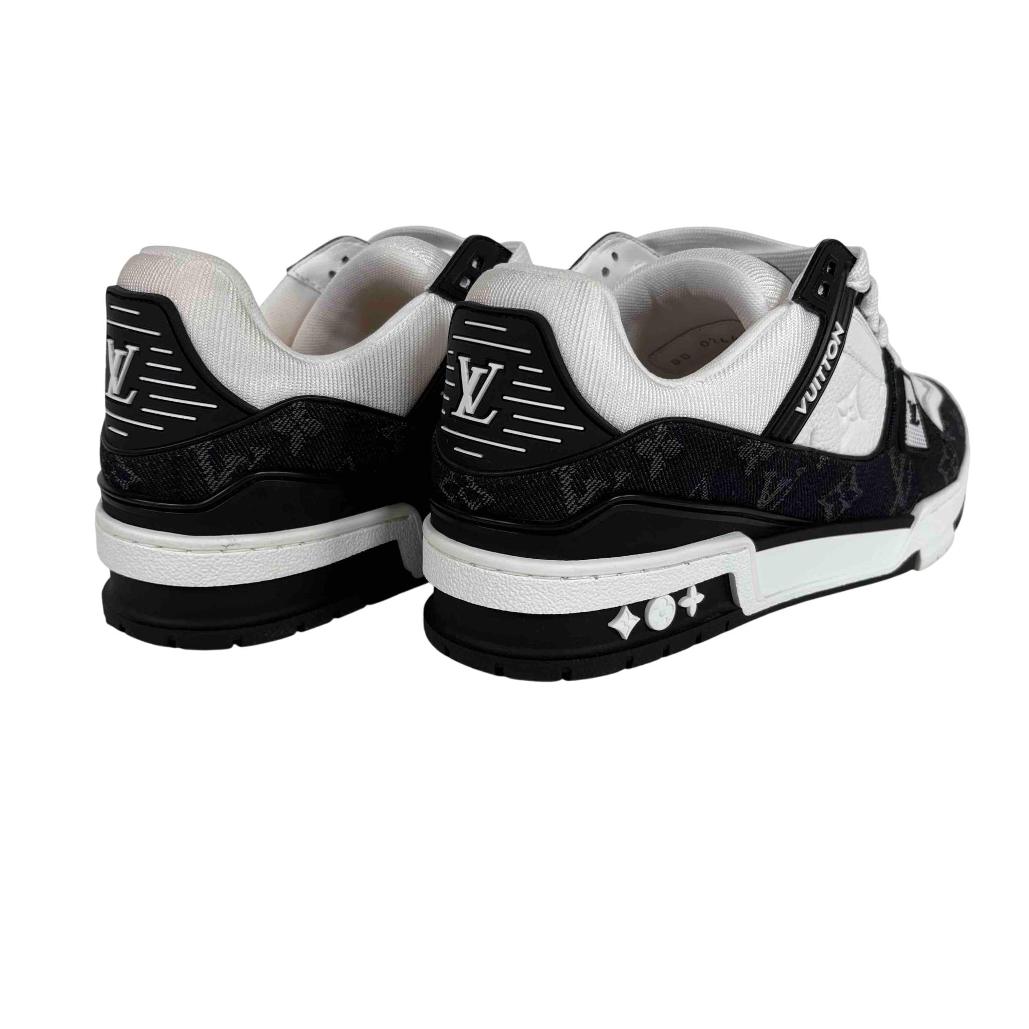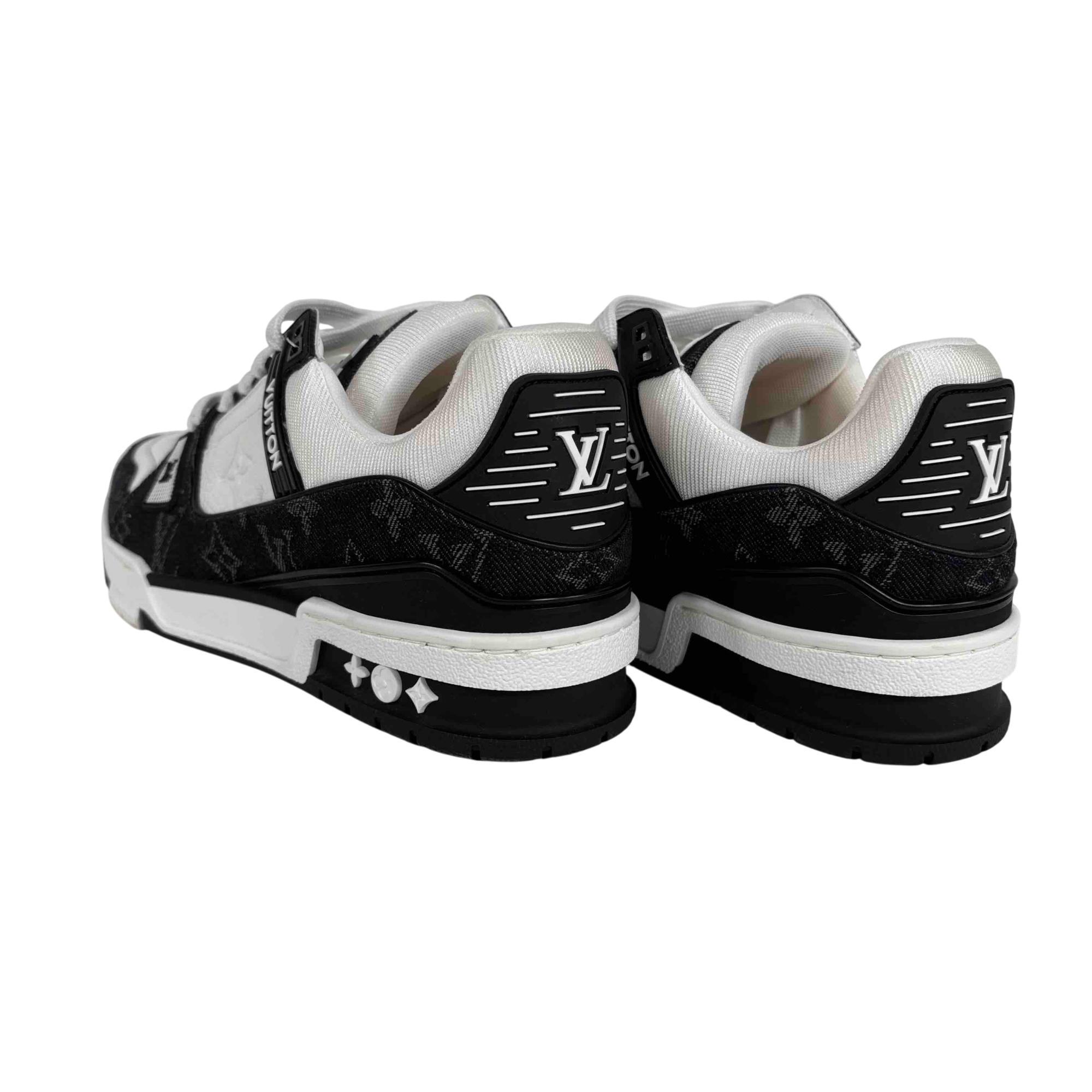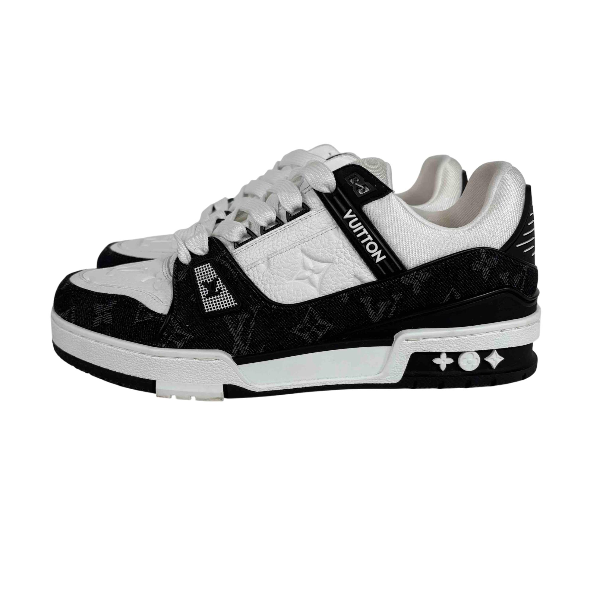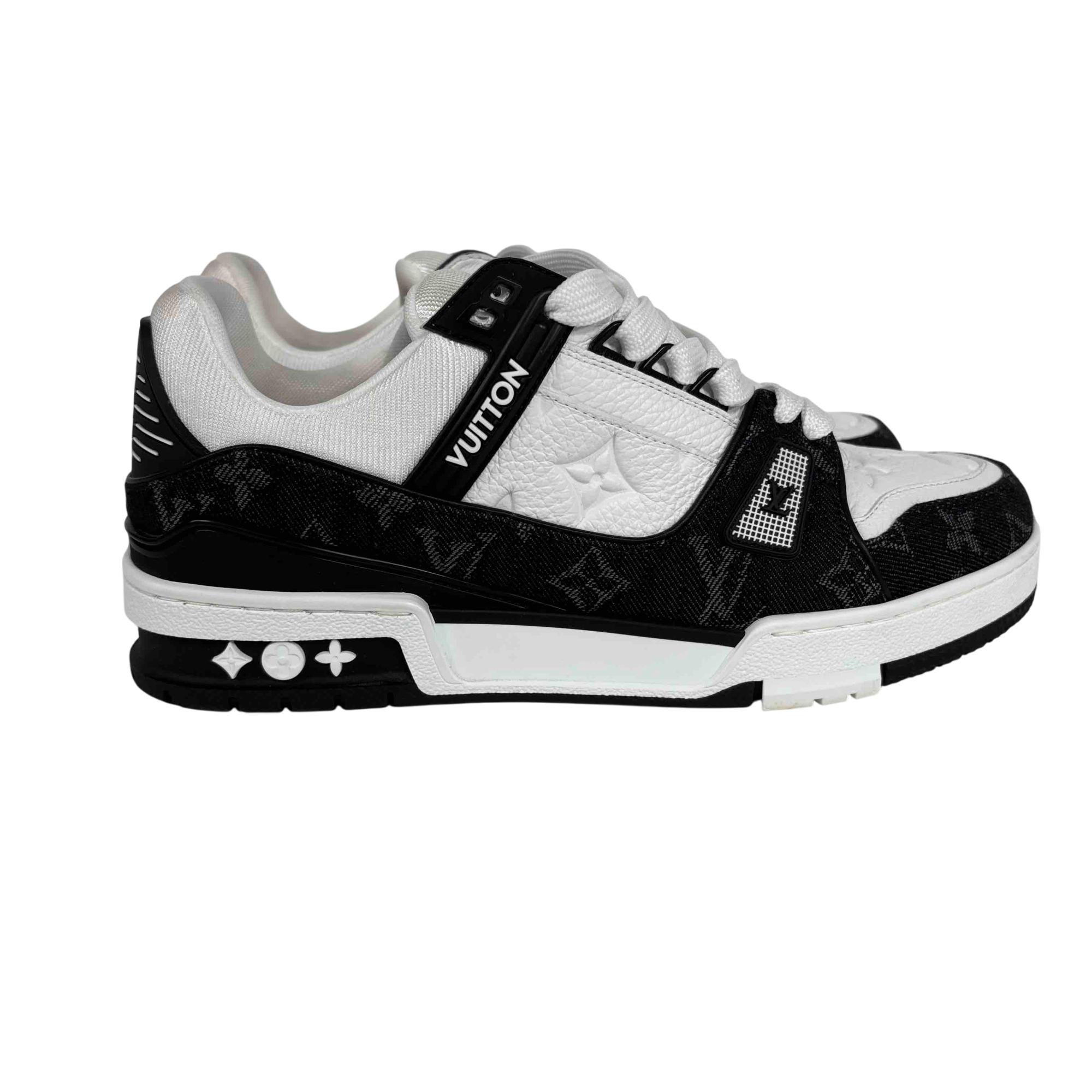 For the first time, the cult LV Trainer sneaker, a staple of the men's collection, is revisited for women in calf leather and Monogram denim. This classic design, created by Virgil Abloh, references vintage basketball sneakers. It features numerous signature details, including the LV Initials on the tongue and side, and Monogram Flowers on the outsole.