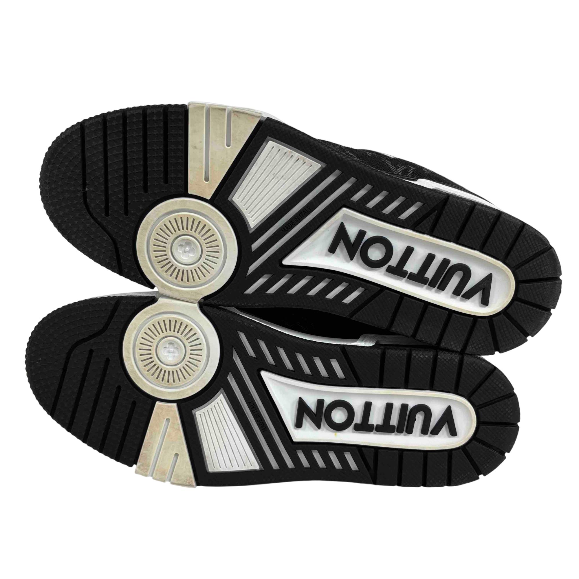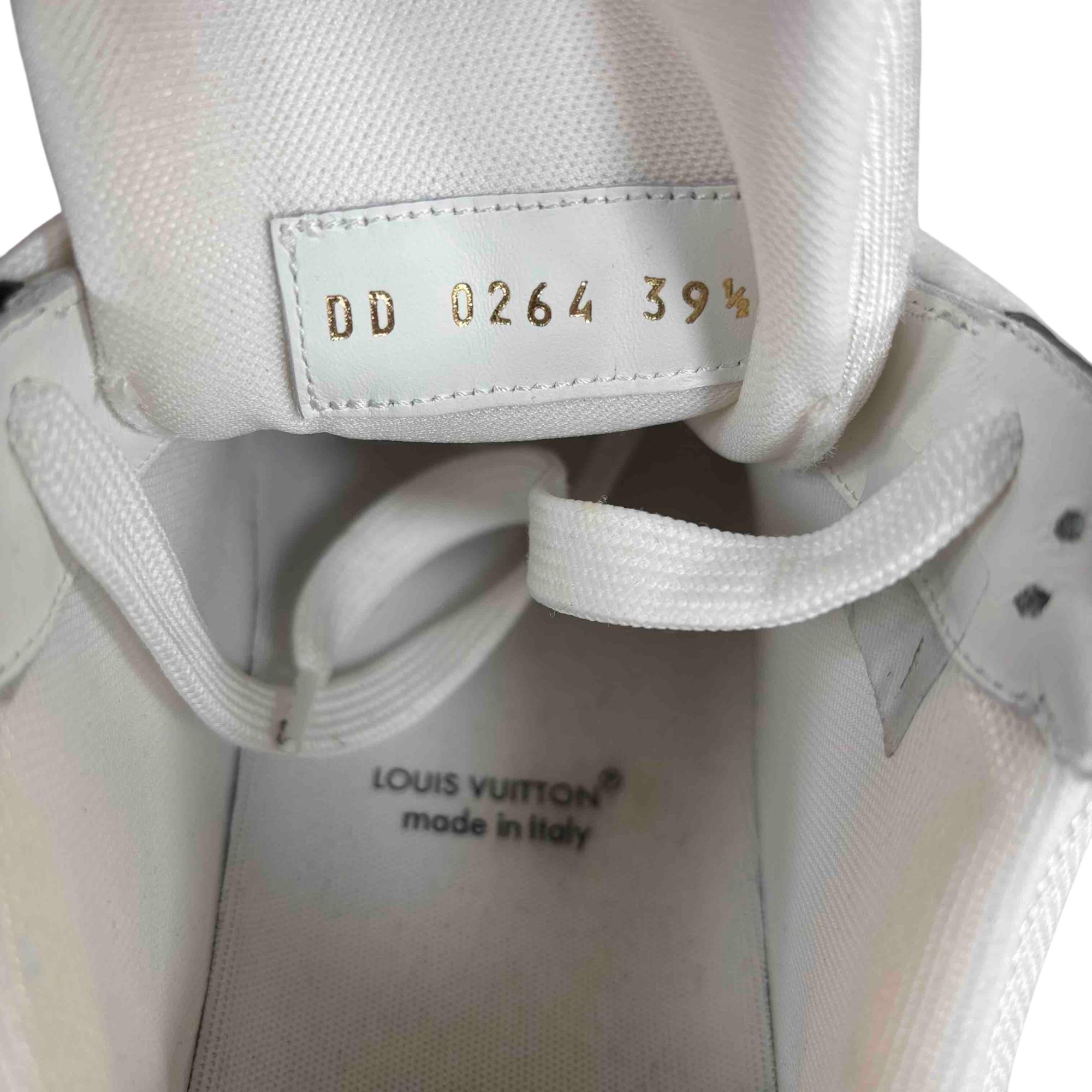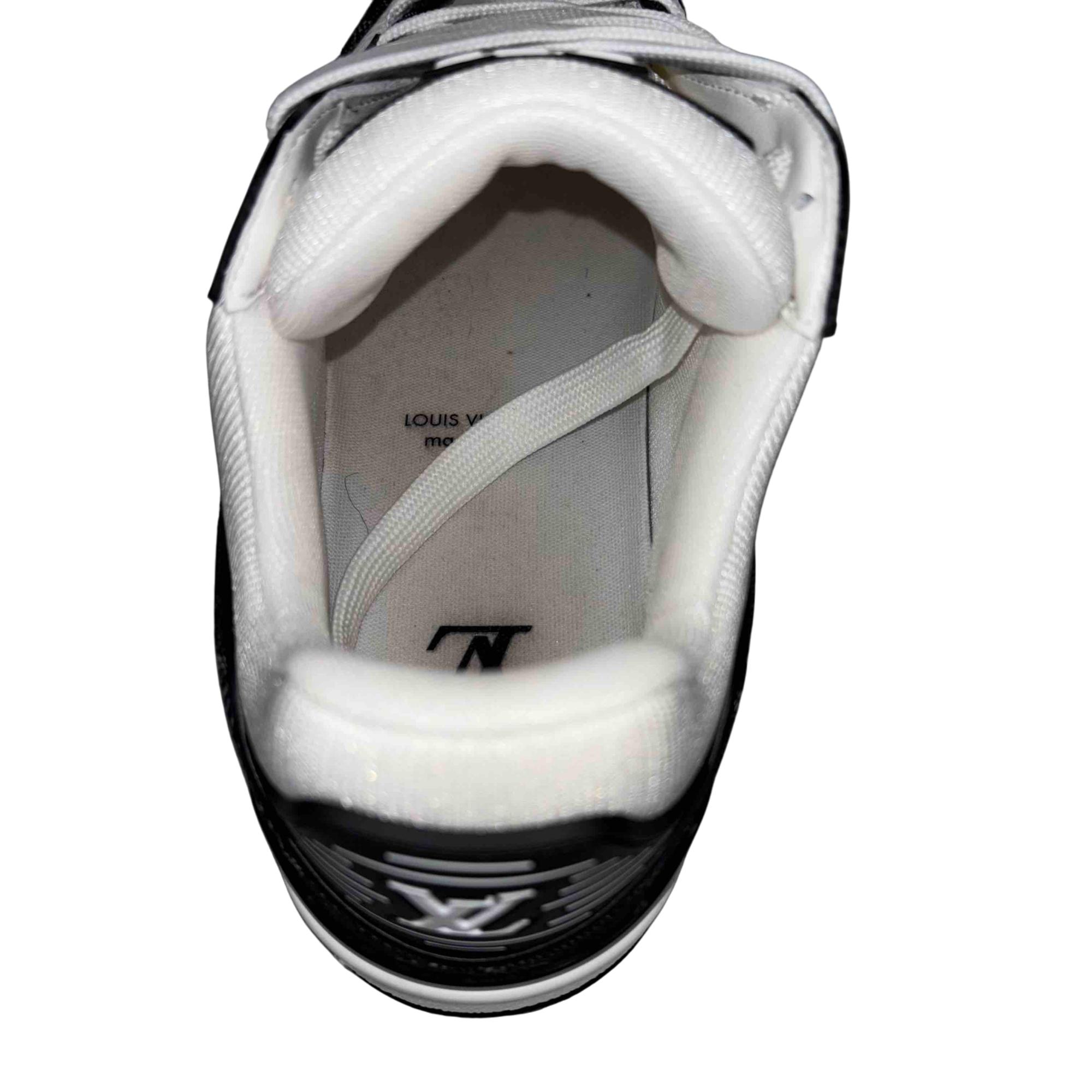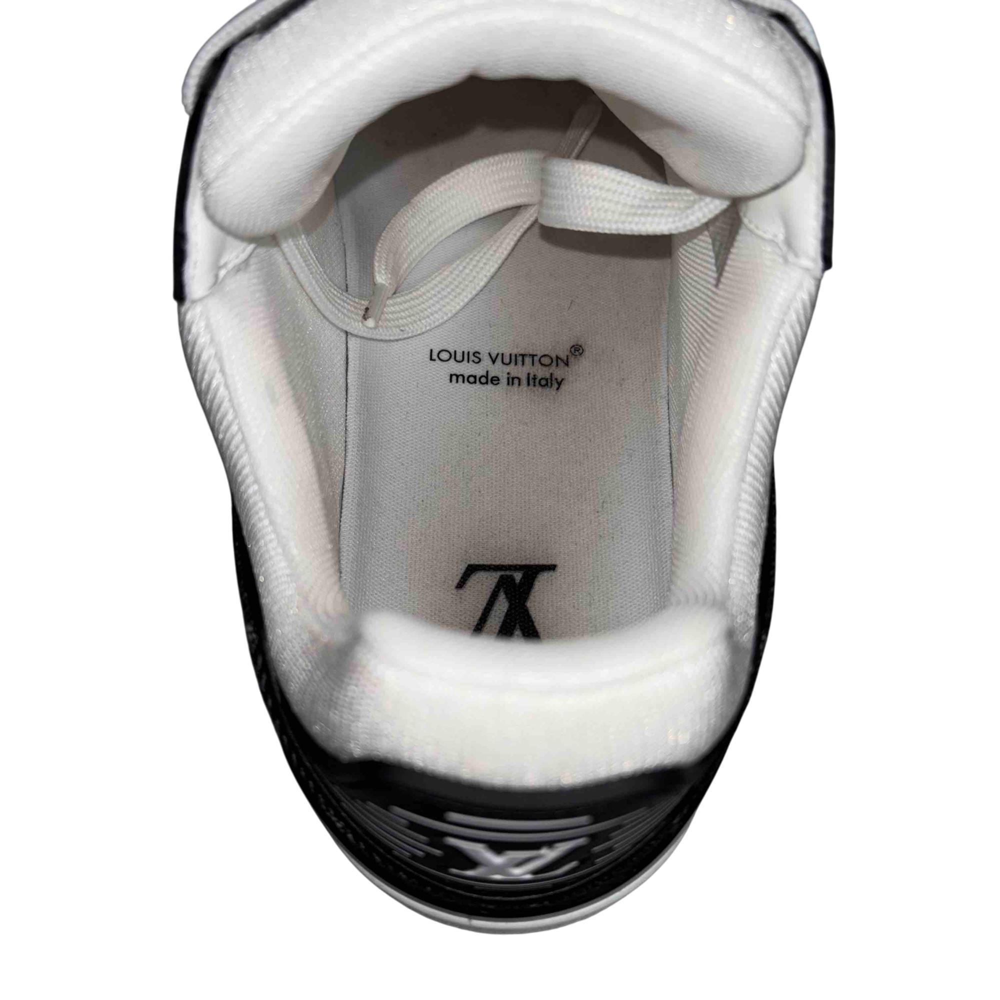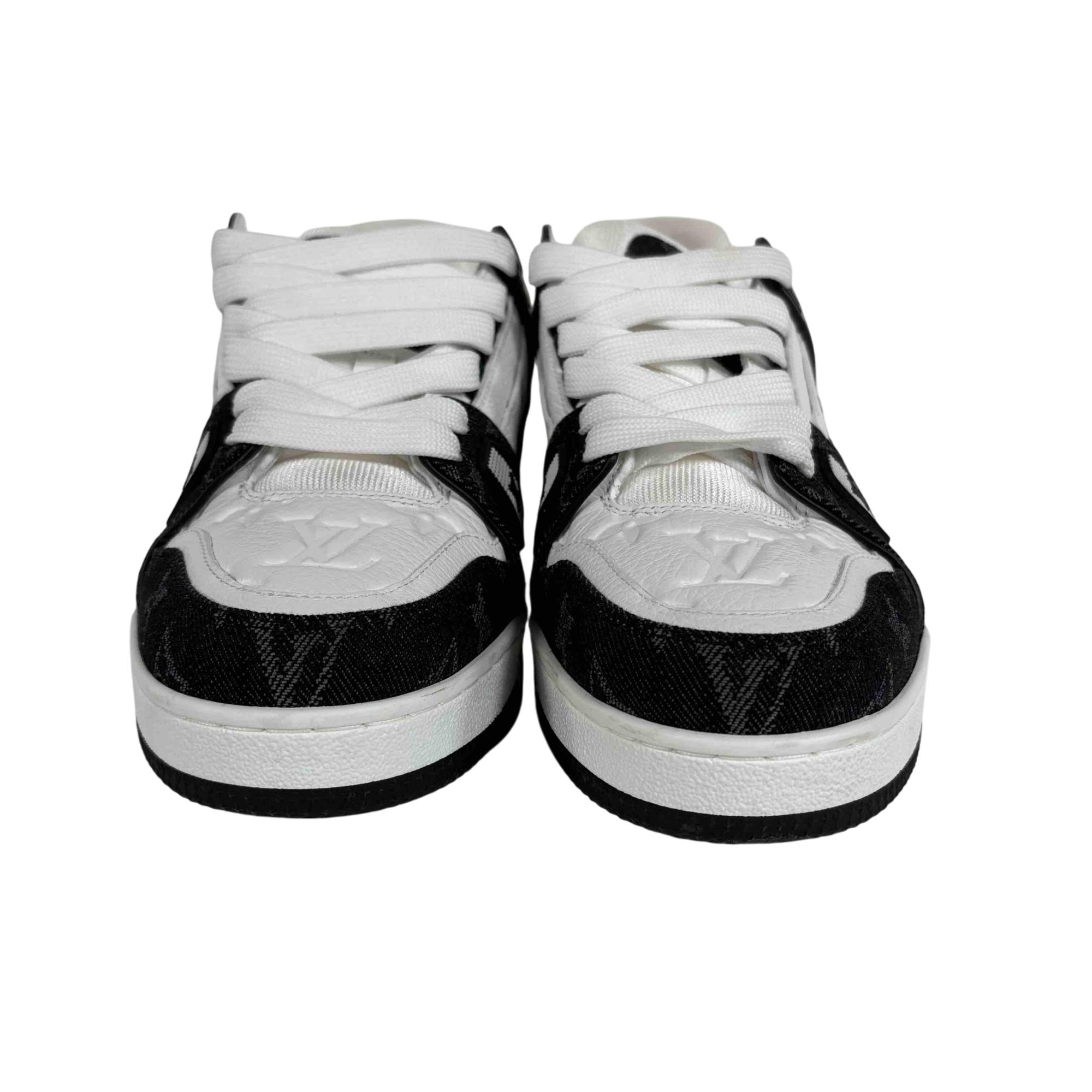 For the first time, the cult LV Trainer sneaker, a staple of the men's collection, is revisited for women in calf leather and Monogram denim. This classic design, created by Virgil Abloh, references vintage basketball sneakers. It features numerous signature details, including the LV Initials on the tongue and side, and Monogram Flowers on the outsole.