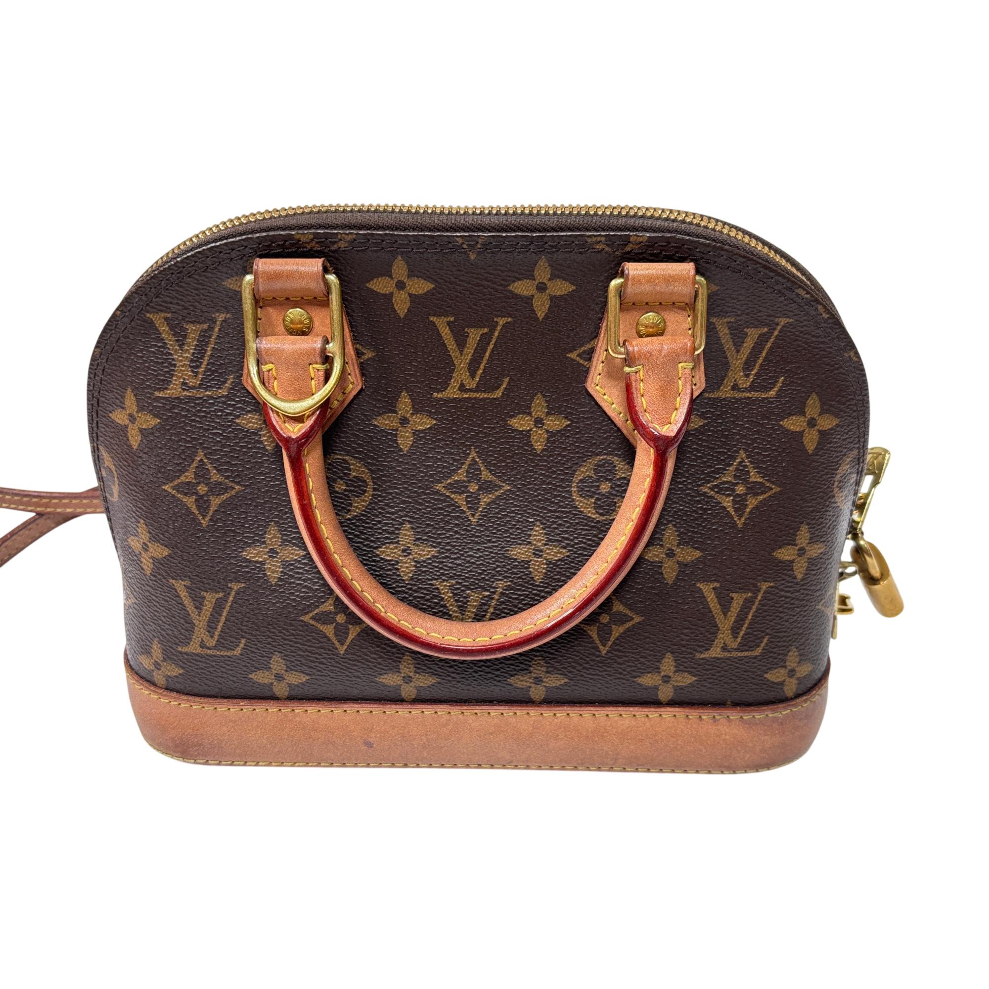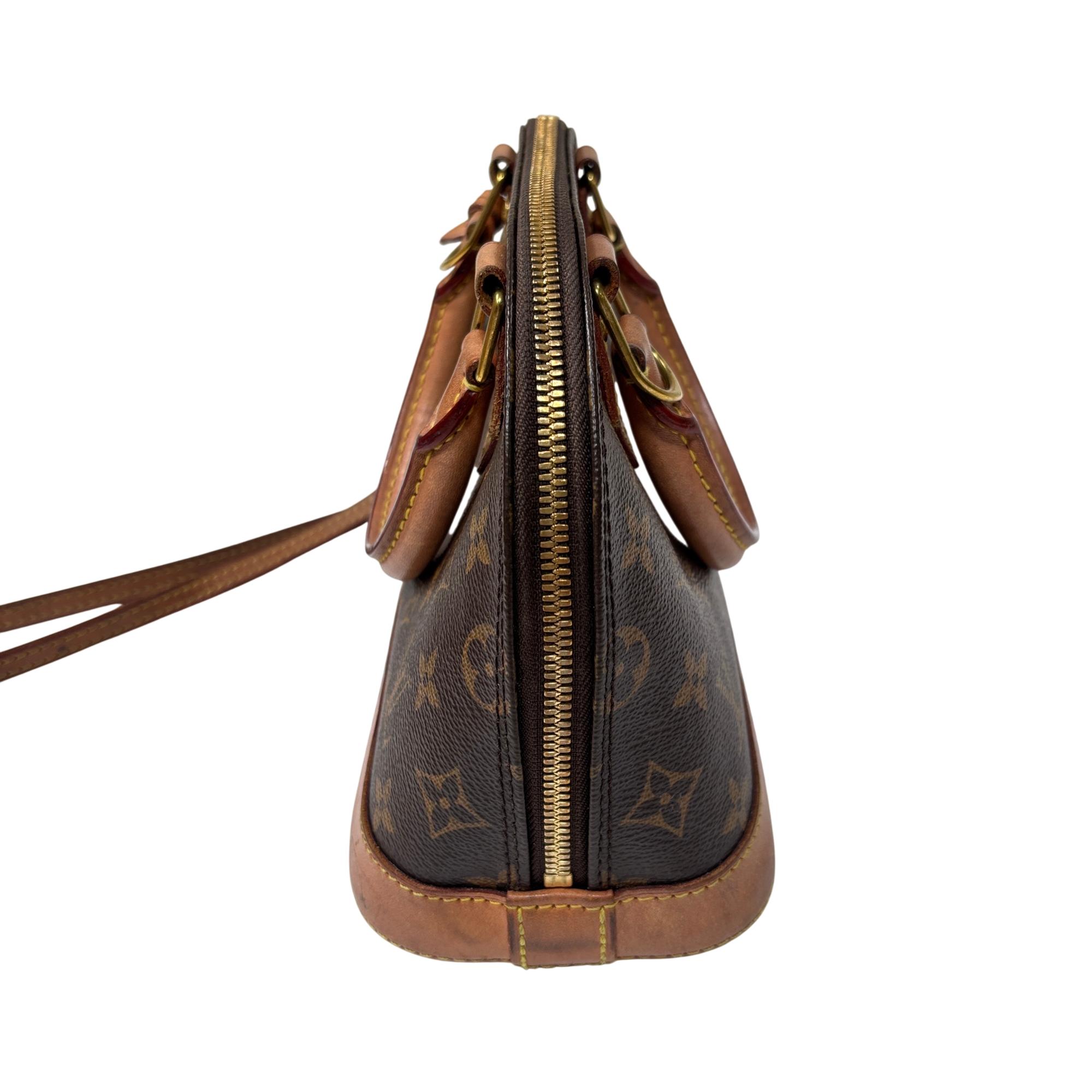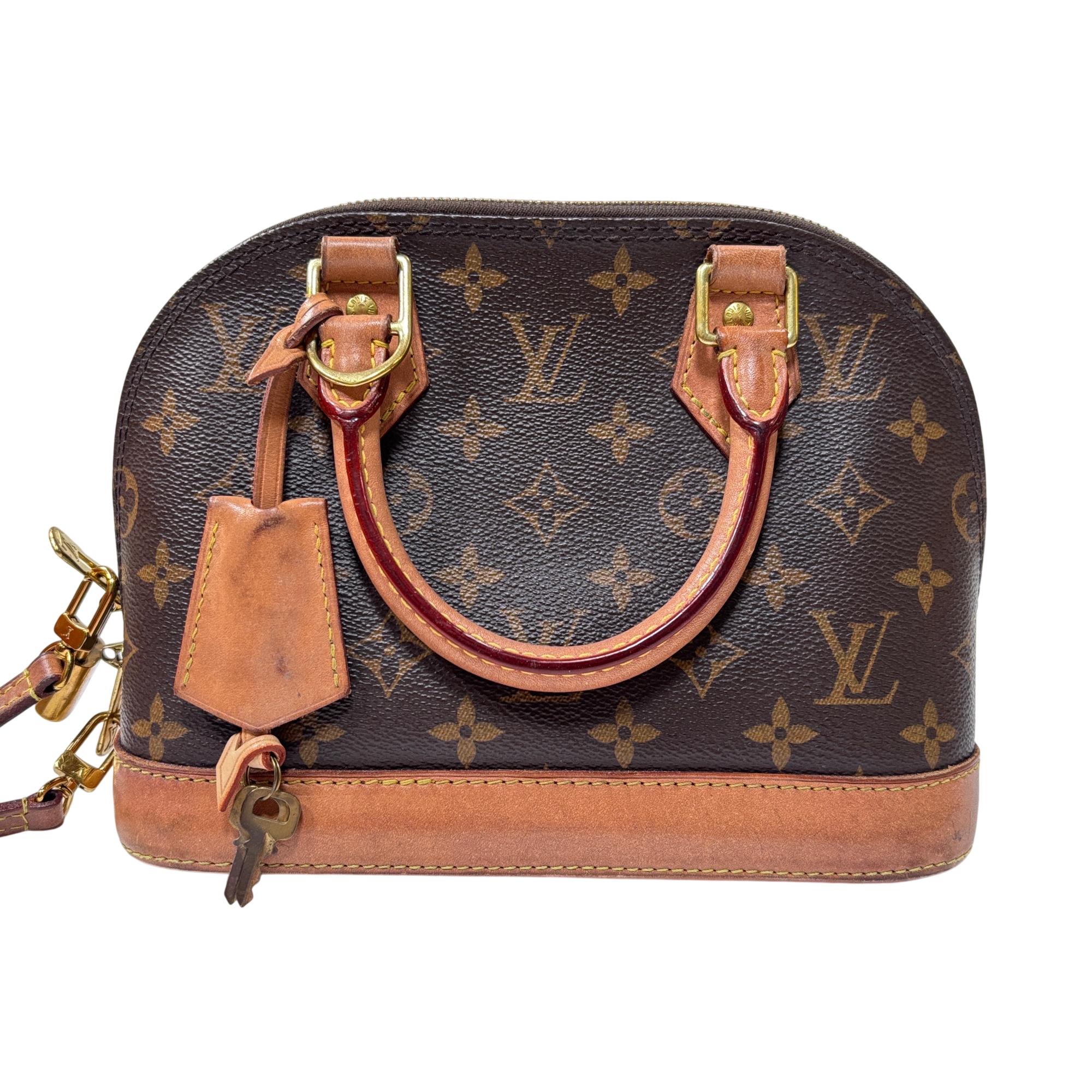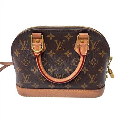 Louis Vuitton Alma BB Monogram Canvas Handbag features a compact and elegant design crafted from signature monogram canvas with natural cowhide leather trim. This small handbag includes a structured silhouette with dual top handles and a detachable shoulder strap, making it versatile for both hand carry and shoulder wear. Its detailed brass hardware and leather accents add a luxurious touch to this timeless accessory ideal for everyday use or special occasions.