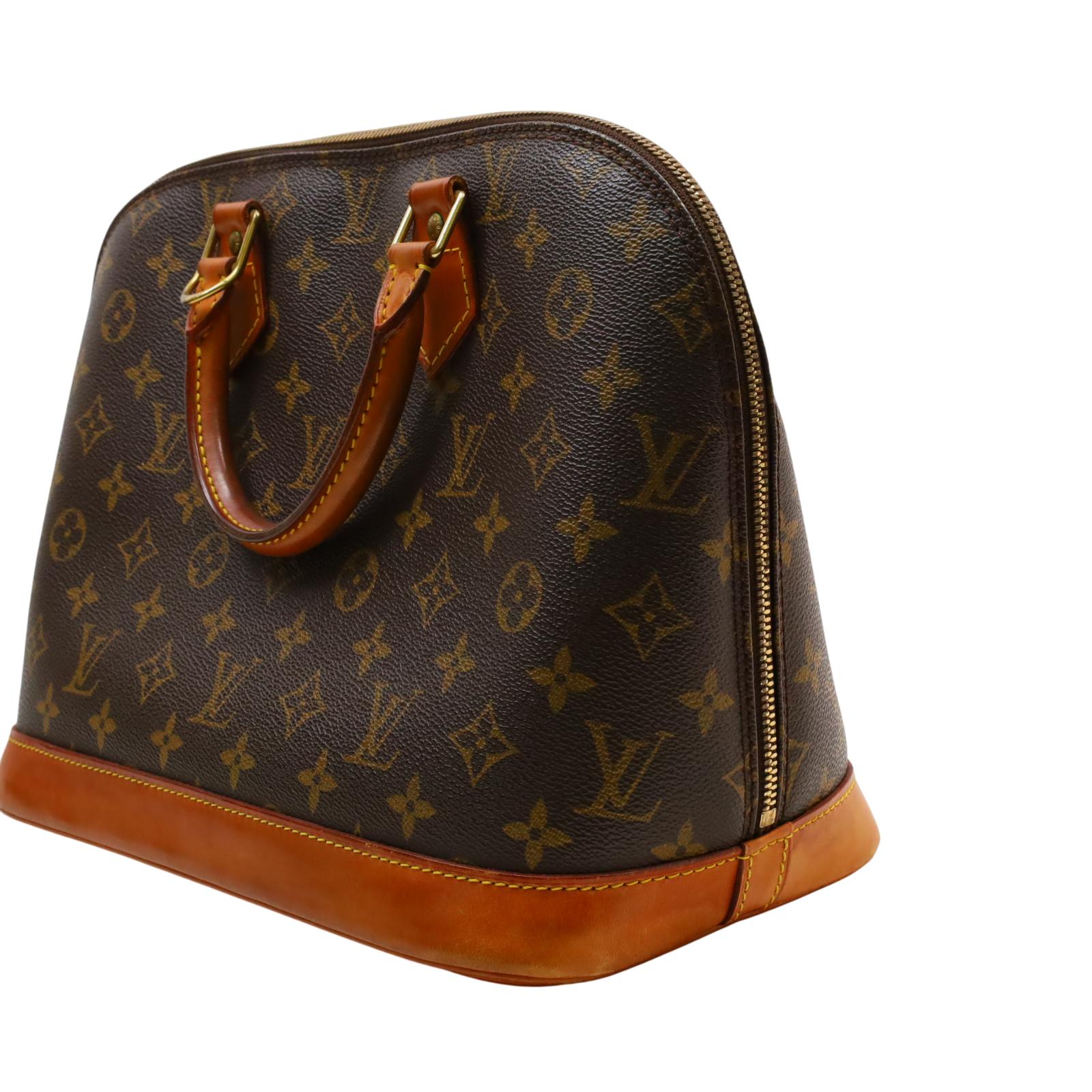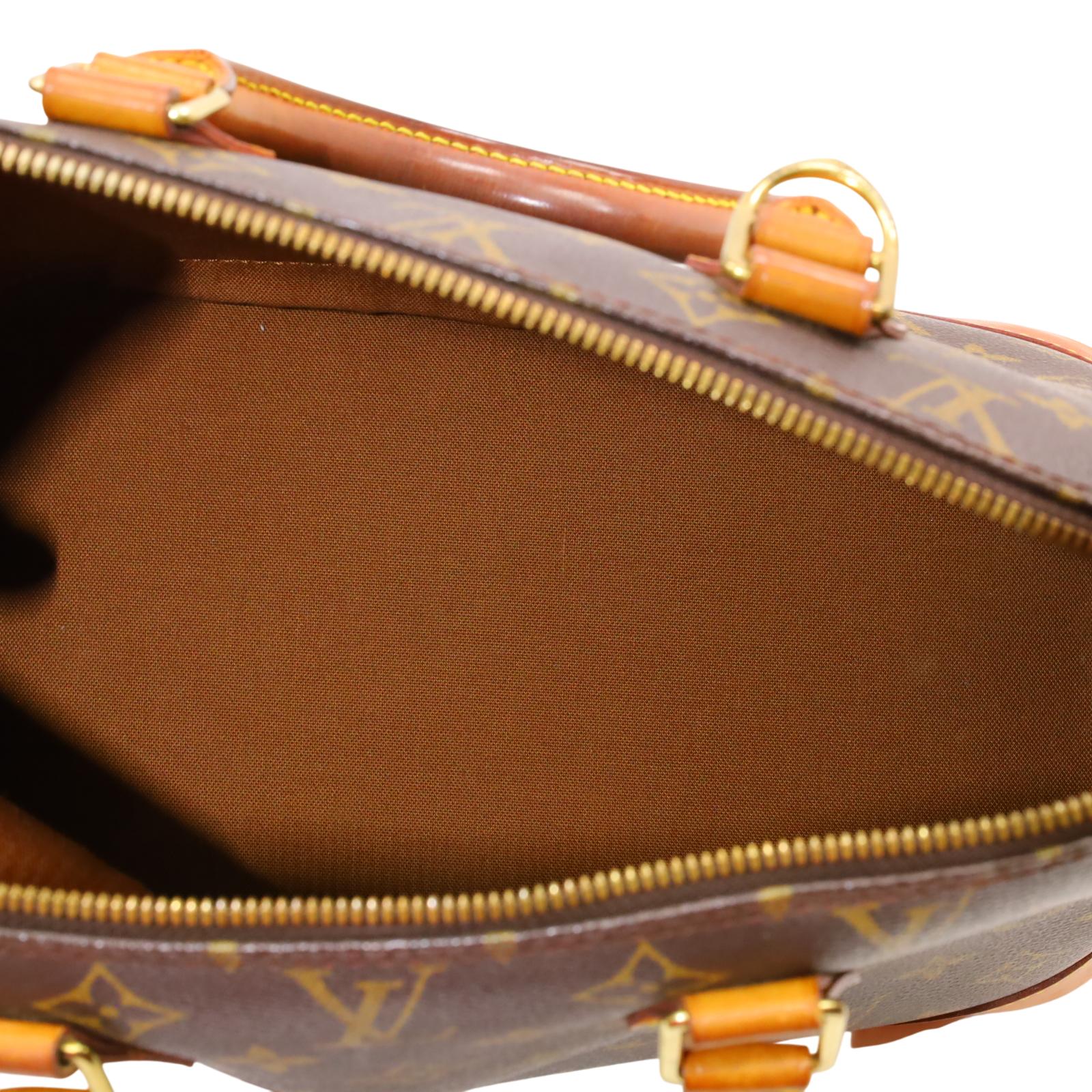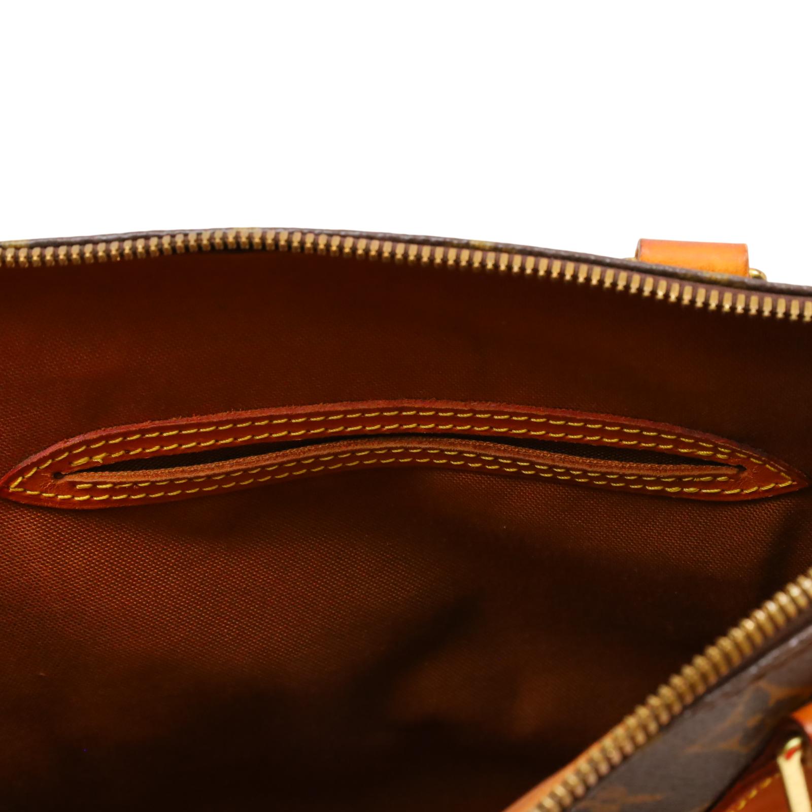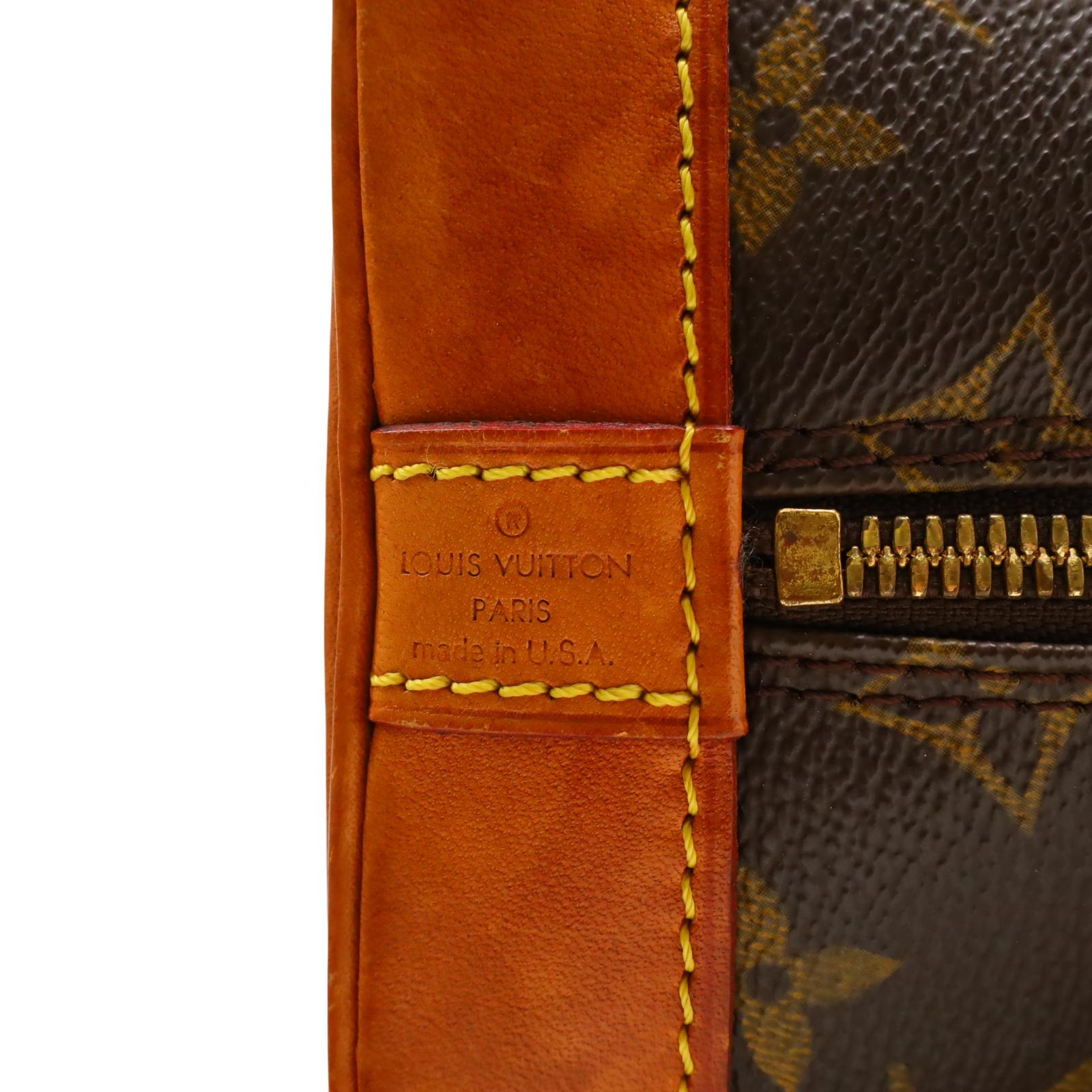 Constructed from signature monogram coated canvas and features natural vachetta leather trim, including rolled top handles and a structured base. Gold-tone hardware accents the exterior, while a wrap-around zipper secures the main compartment. Inside, the brown fabric-lined interior includes patch pockets for small item organization. Measuring approximately 12 inches in base length, 9.25 inches in height, and 6.5 inches in width, with a 3.25-inch handle drop, this structured design offers a timeless and recognizable silhouette.
