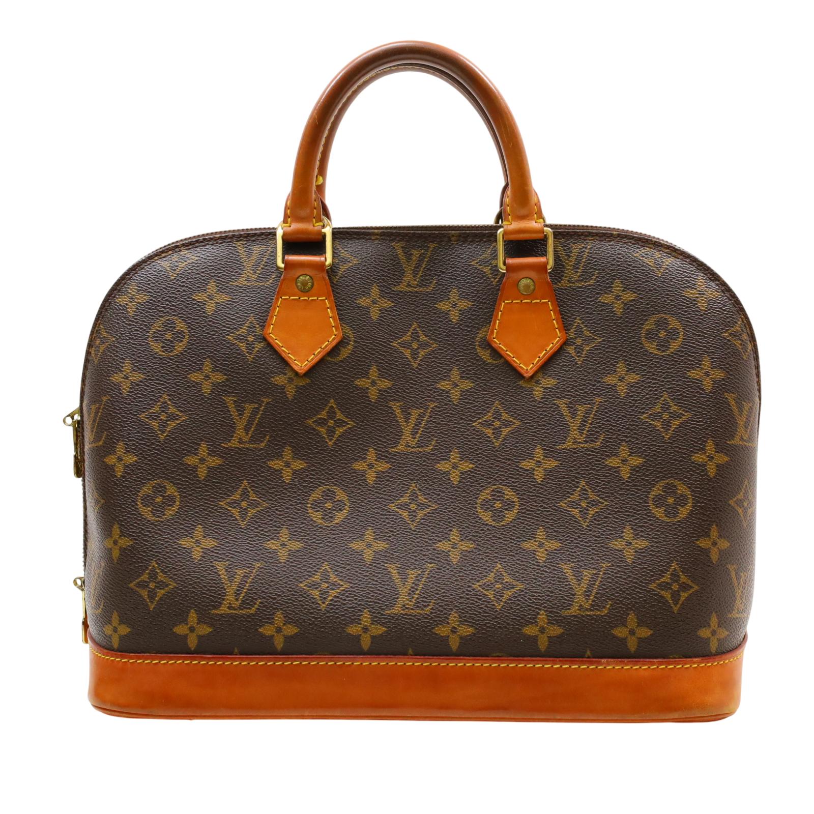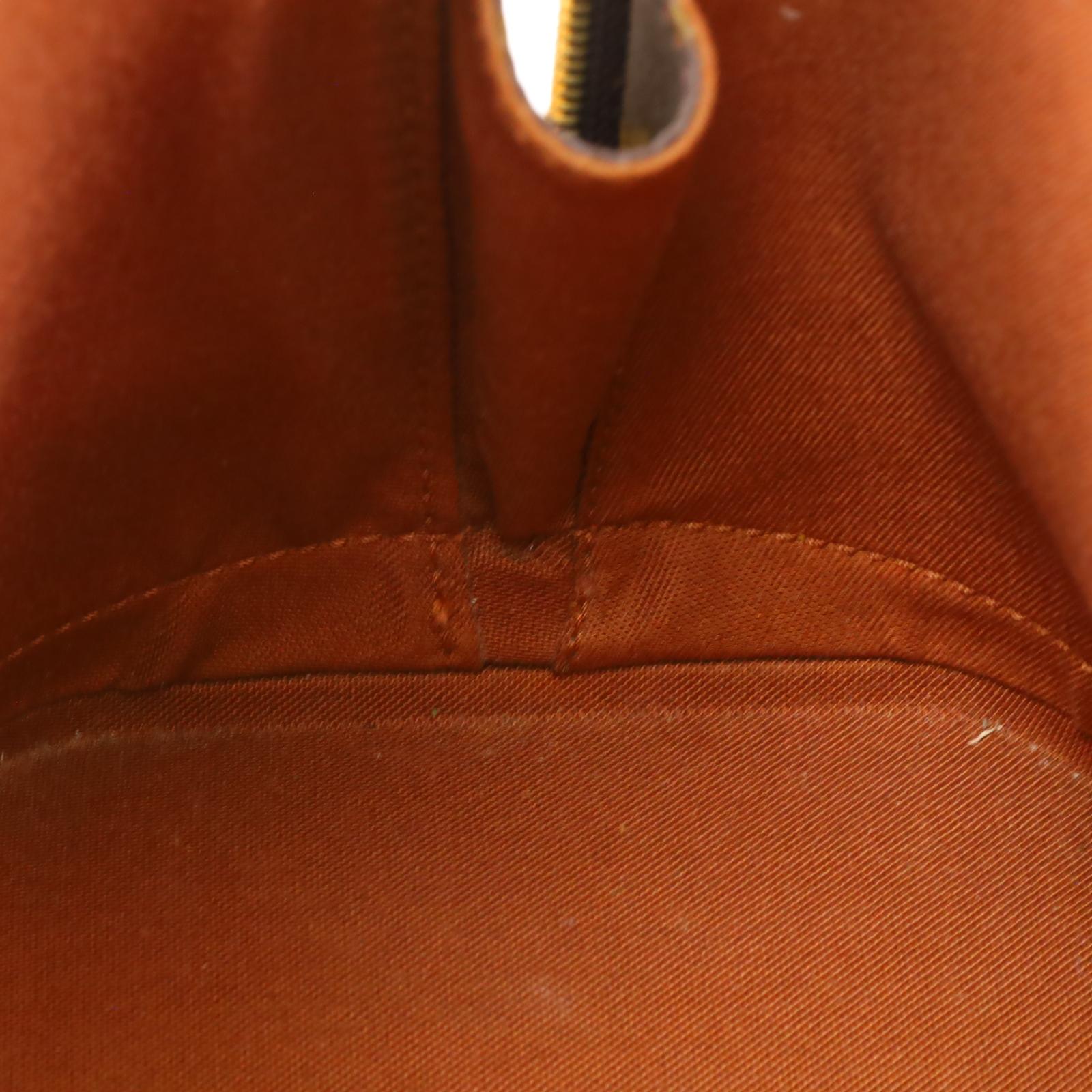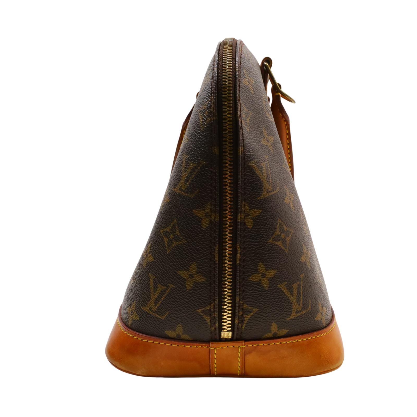 Constructed from signature monogram coated canvas and features natural vachetta leather trim, including rolled top handles and a structured base. Gold-tone hardware accents the exterior, while a wrap-around zipper secures the main compartment. Inside, the brown fabric-lined interior includes patch pockets for small item organization. Measuring approximately 12 inches in base length, 9.25 inches in height, and 6.5 inches in width, with a 3.25-inch handle drop, this structured design offers a timeless and recognizable silhouette.