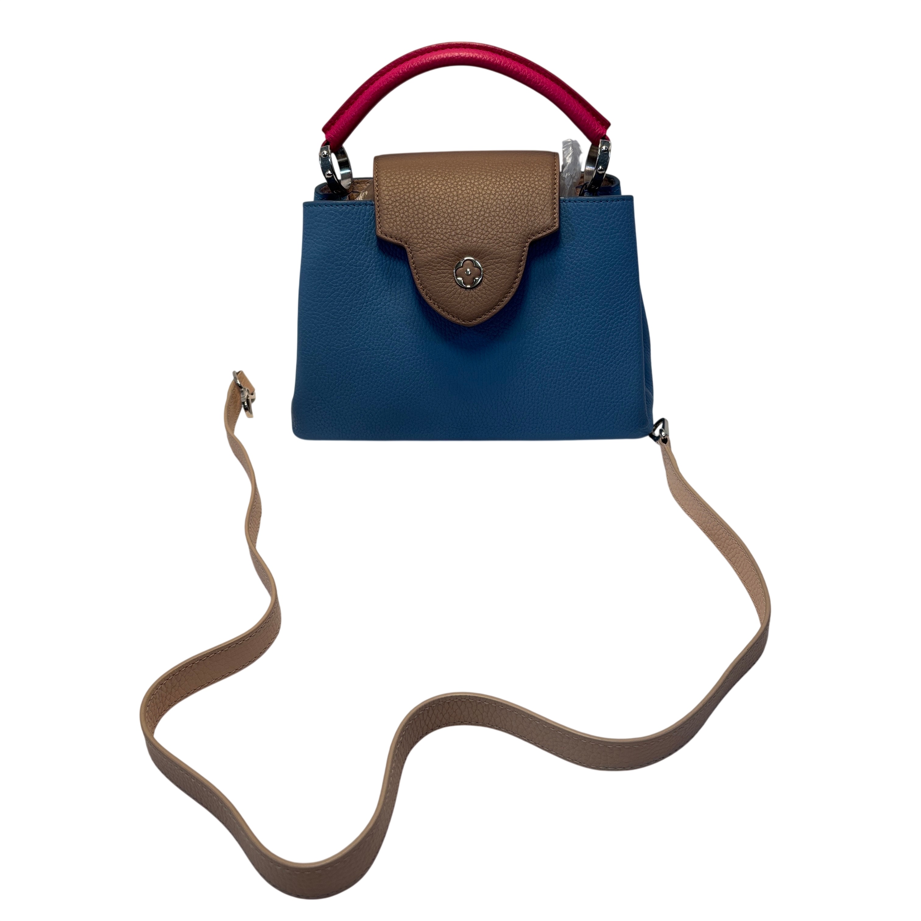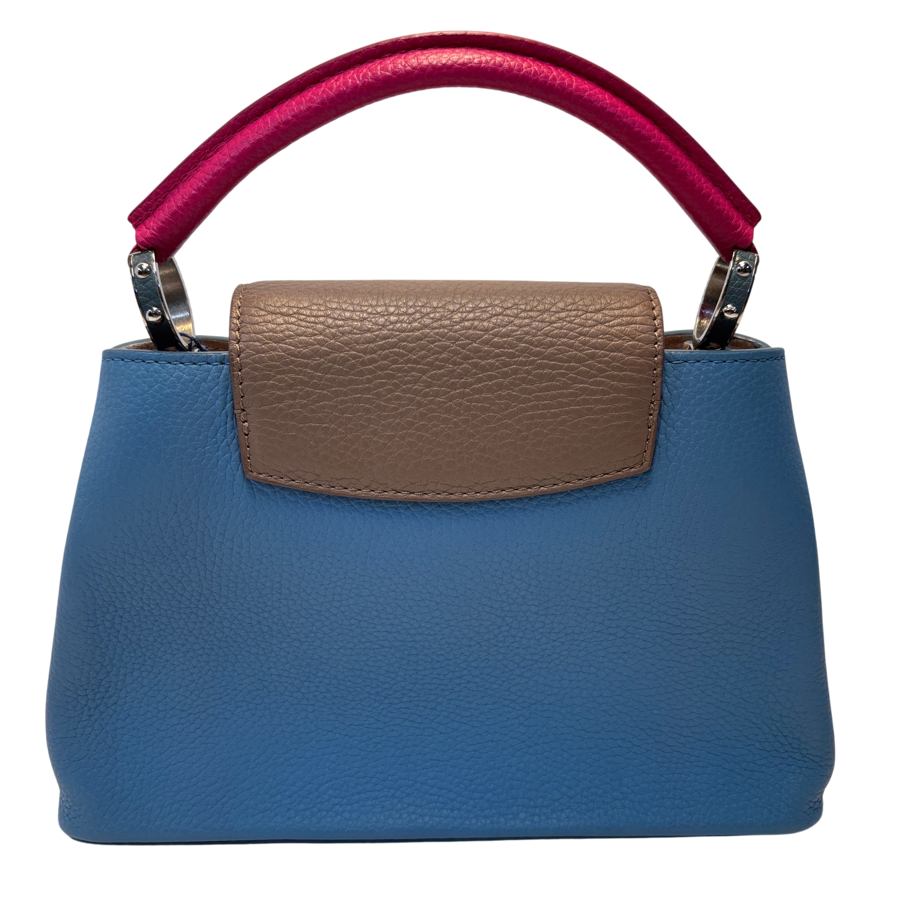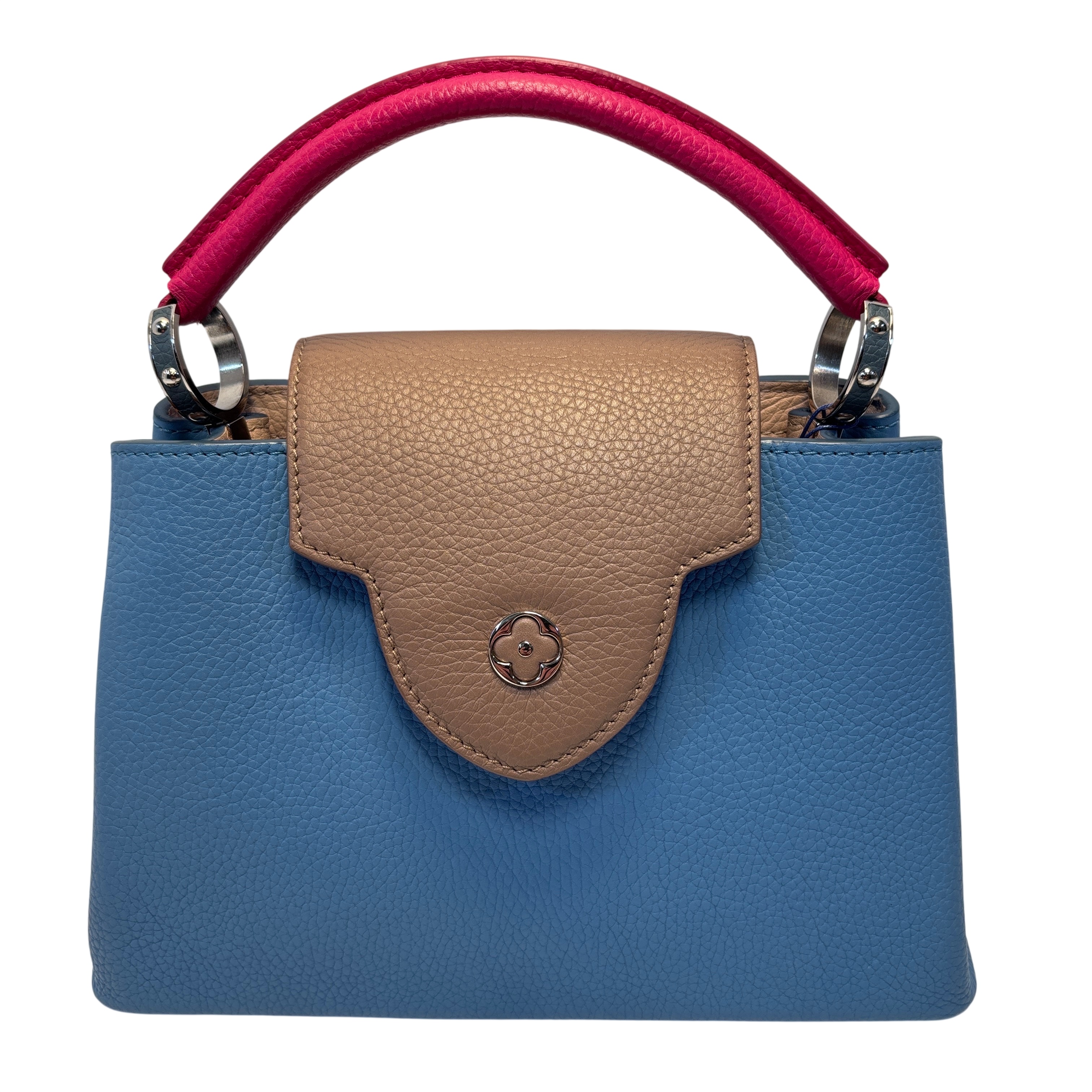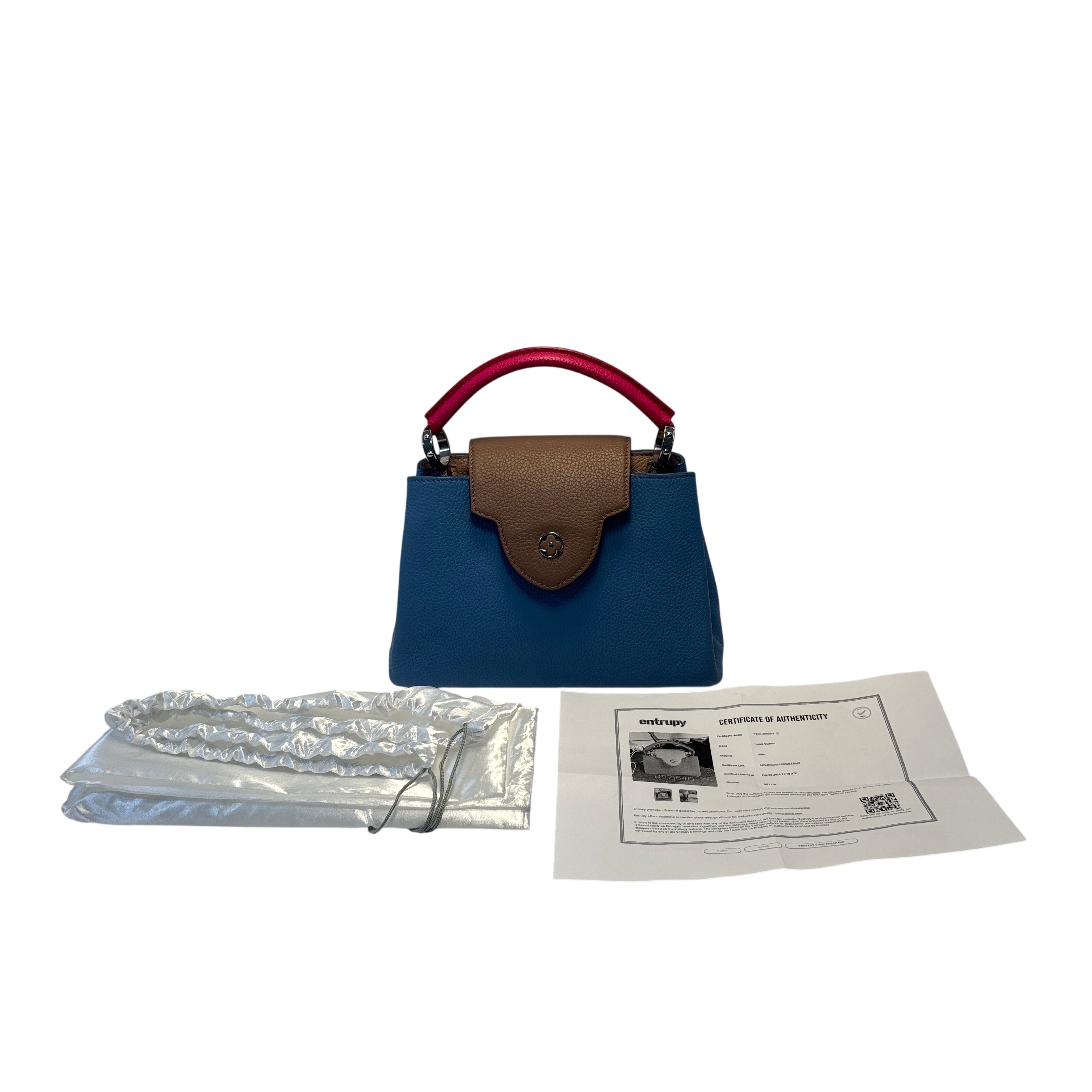The Louis Vuitton Capucines BB Purse is a luxurious leather handbag featuring a distinctive tri-color design with a blue body, brown flap, and pink handle. This compact purse is crafted from high-quality leather, making it both stylish and durable. Included with the purse are a dust bag and a certificate of authenticity from Entrupy, ensuring genuine Louis Vuitton craftsmanship. Its elegant size and design make it perfect for everyday use or special occasions.
