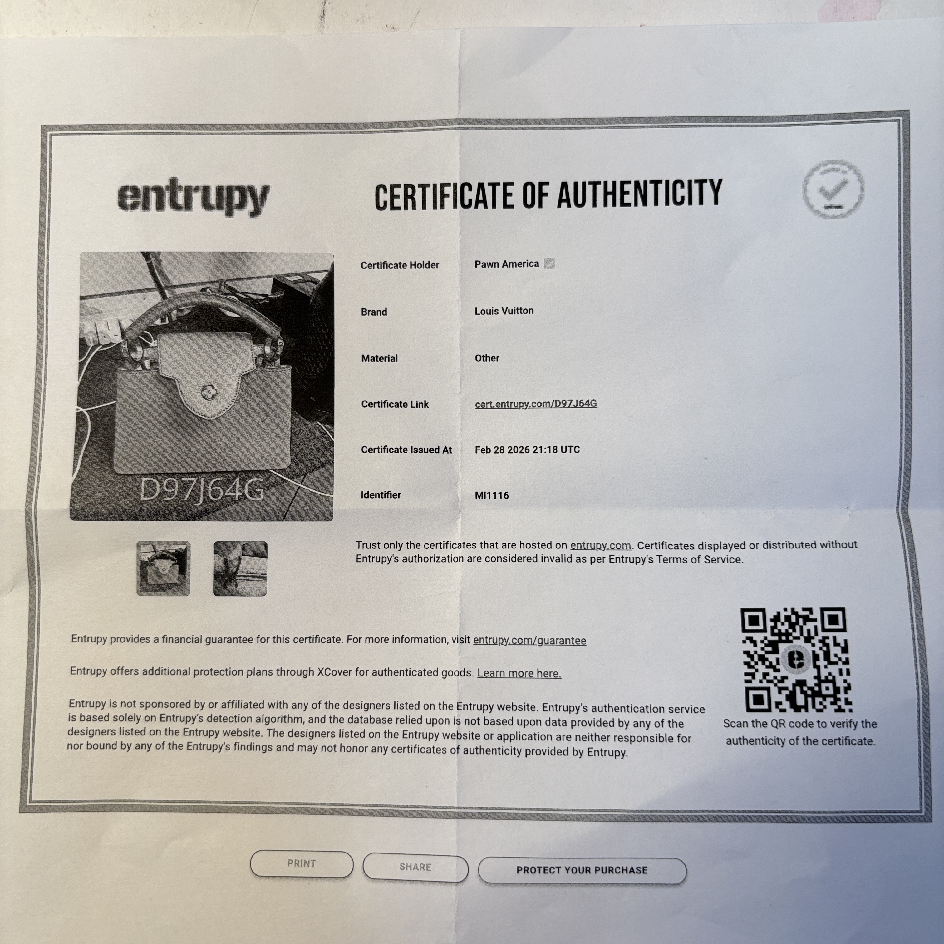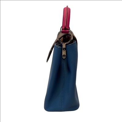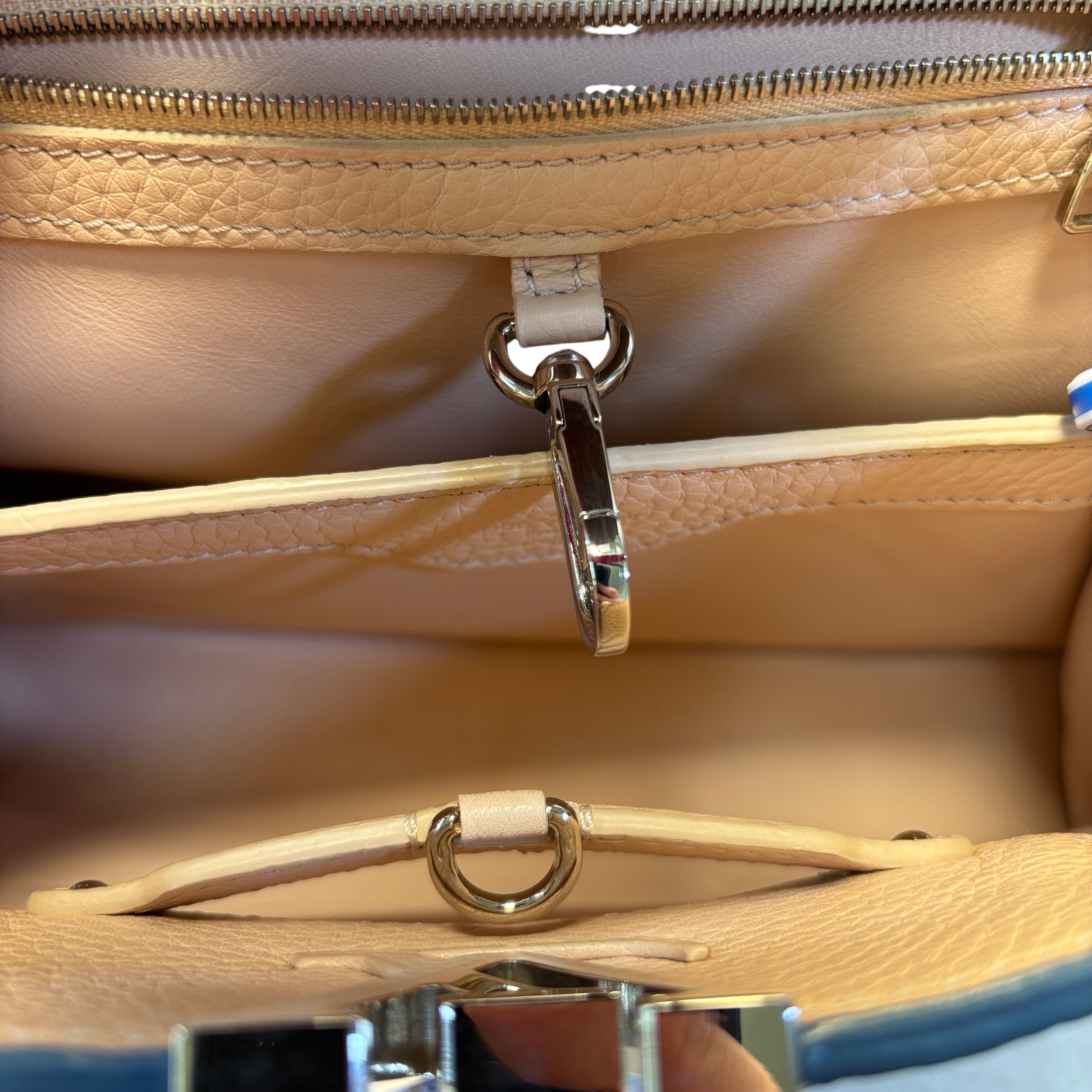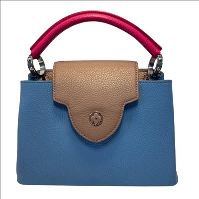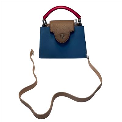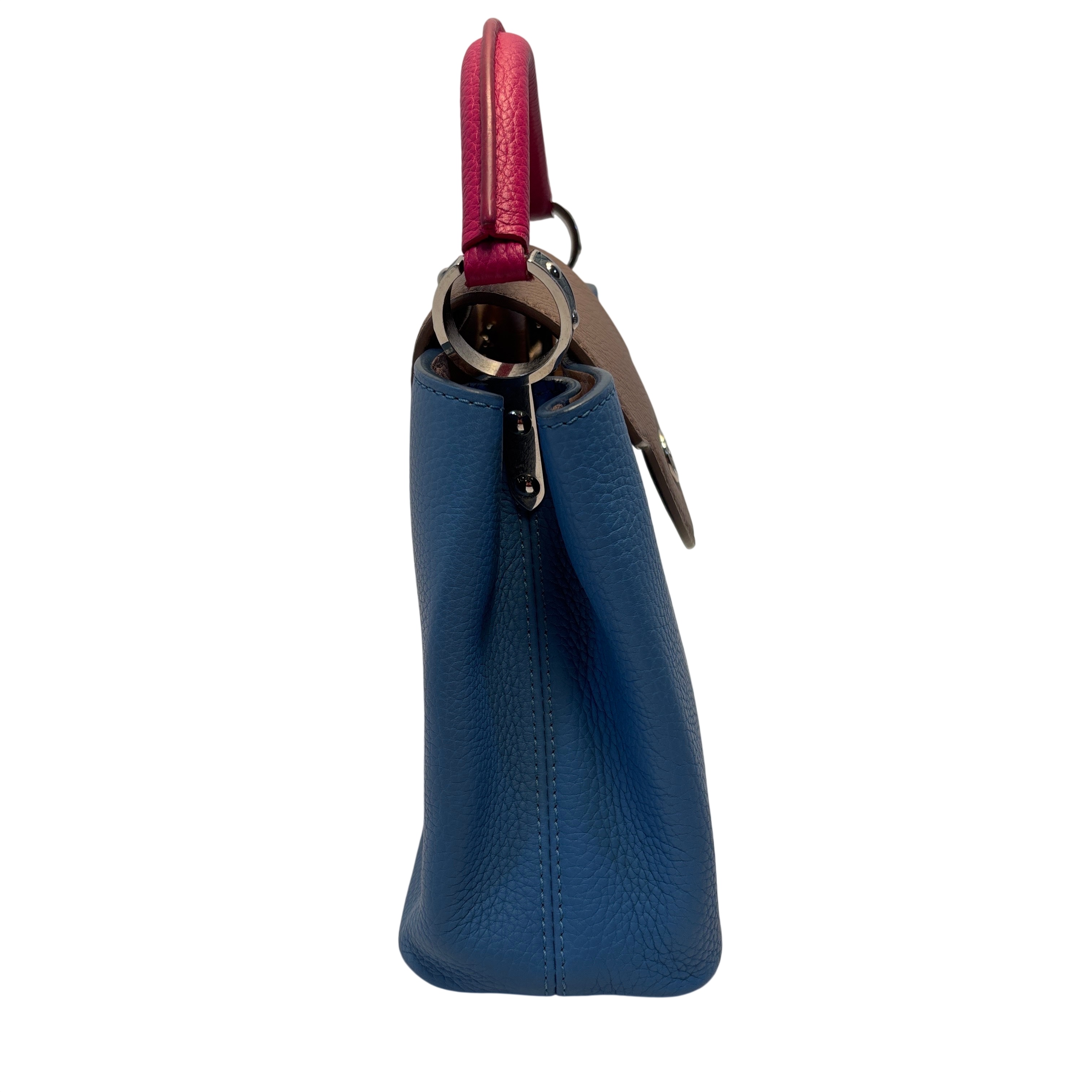 The Louis Vuitton Capucines BB Purse is a luxurious leather handbag featuring a distinctive tri-color design with a blue body, brown flap, and pink handle. This compact purse is crafted from high-quality leather, making it both stylish and durable. Included with the purse are a dust bag and a certificate of authenticity from Entrupy, ensuring genuine Louis Vuitton craftsmanship. Its elegant size and design make it perfect for everyday use or special occasions.