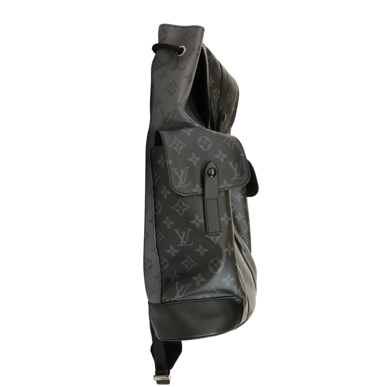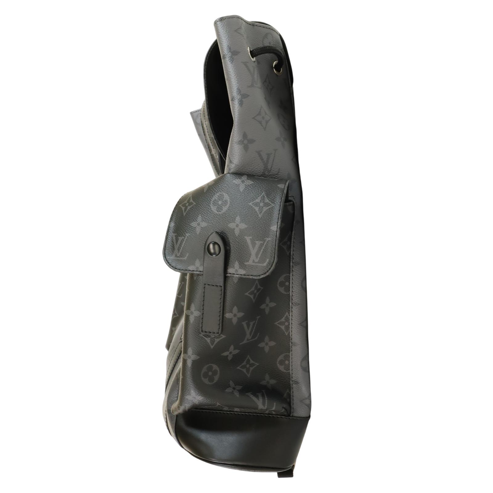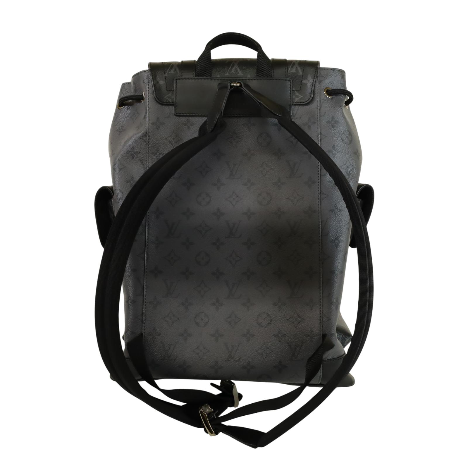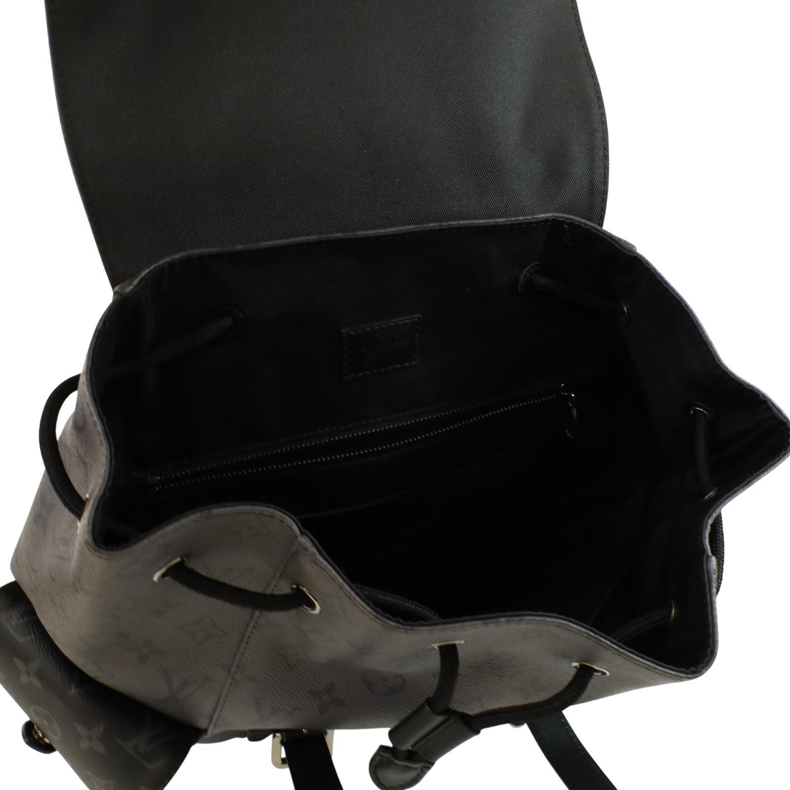 A men’s backpack crafted from Monogram Eclipse and Monogram Eclipse Reverse coated canvas with black cowhide leather trim and silver-tone hardware. Measuring approximately 15 x 17.3 x 4.9 inches, it features a flap opening with press-stud and drawstring closure, two side pockets, an inside tablet pocket, an inside zipped pocket, and two inside flat pockets. The interior is lined with textile, and the bag includes adjustable shoulder straps and a single top handle for carrying options.