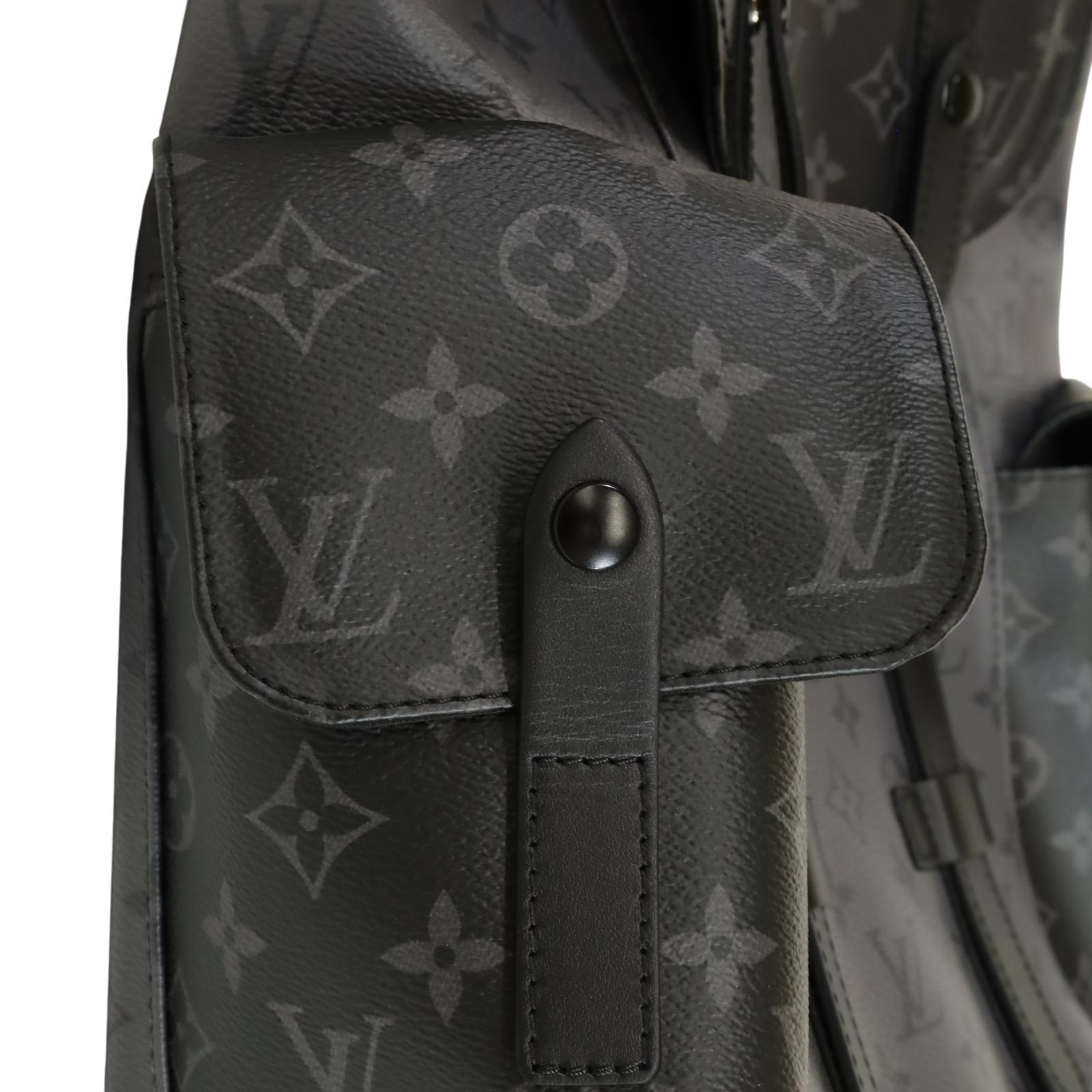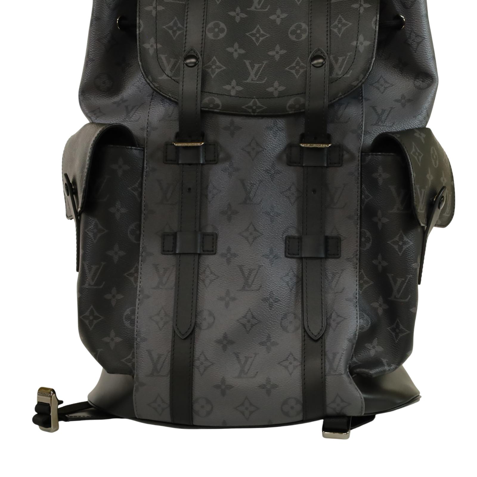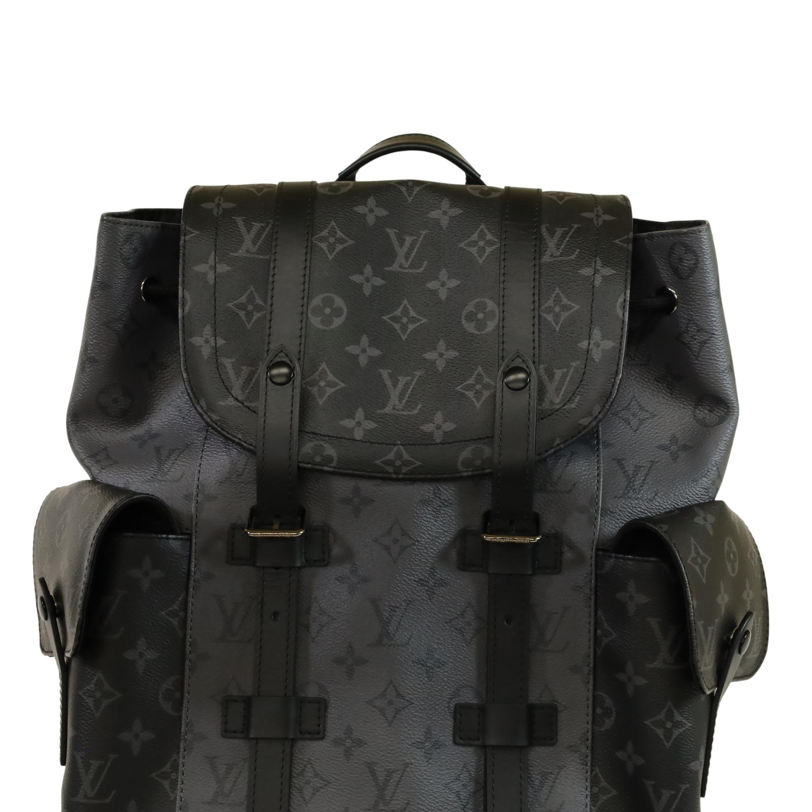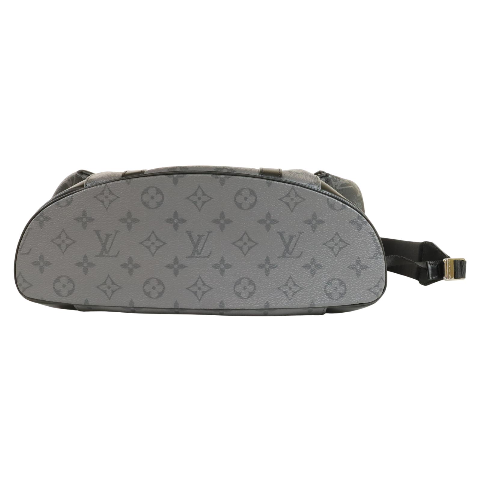A men’s backpack crafted from Monogram Eclipse and Monogram Eclipse Reverse coated canvas with black cowhide leather trim and silver-tone hardware. Measuring approximately 15 x 17.3 x 4.9 inches, it features a flap opening with press-stud and drawstring closure, two side pockets, an inside tablet pocket, an inside zipped pocket, and two inside flat pockets. The interior is lined with textile, and the bag includes adjustable shoulder straps and a single top handle for carrying options.