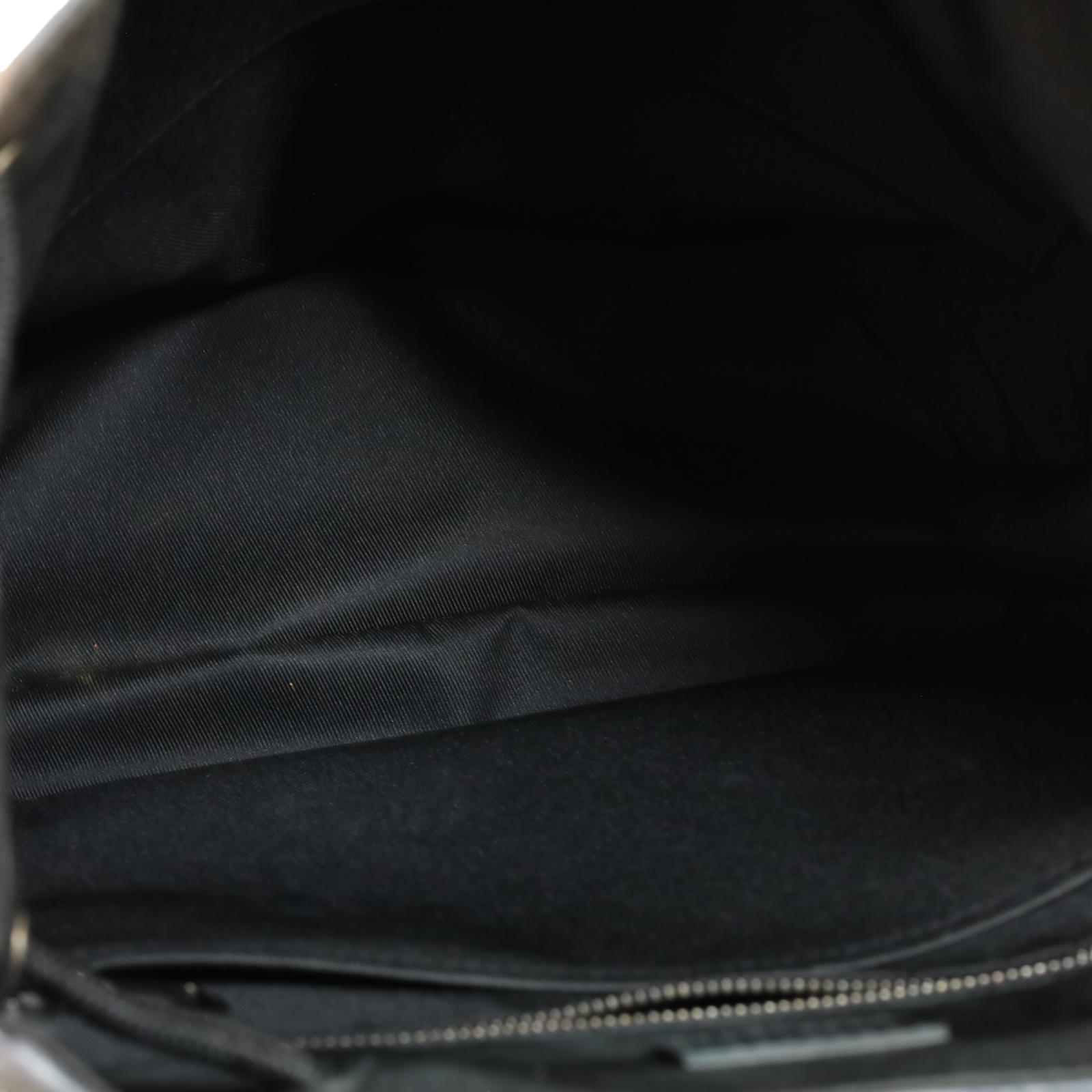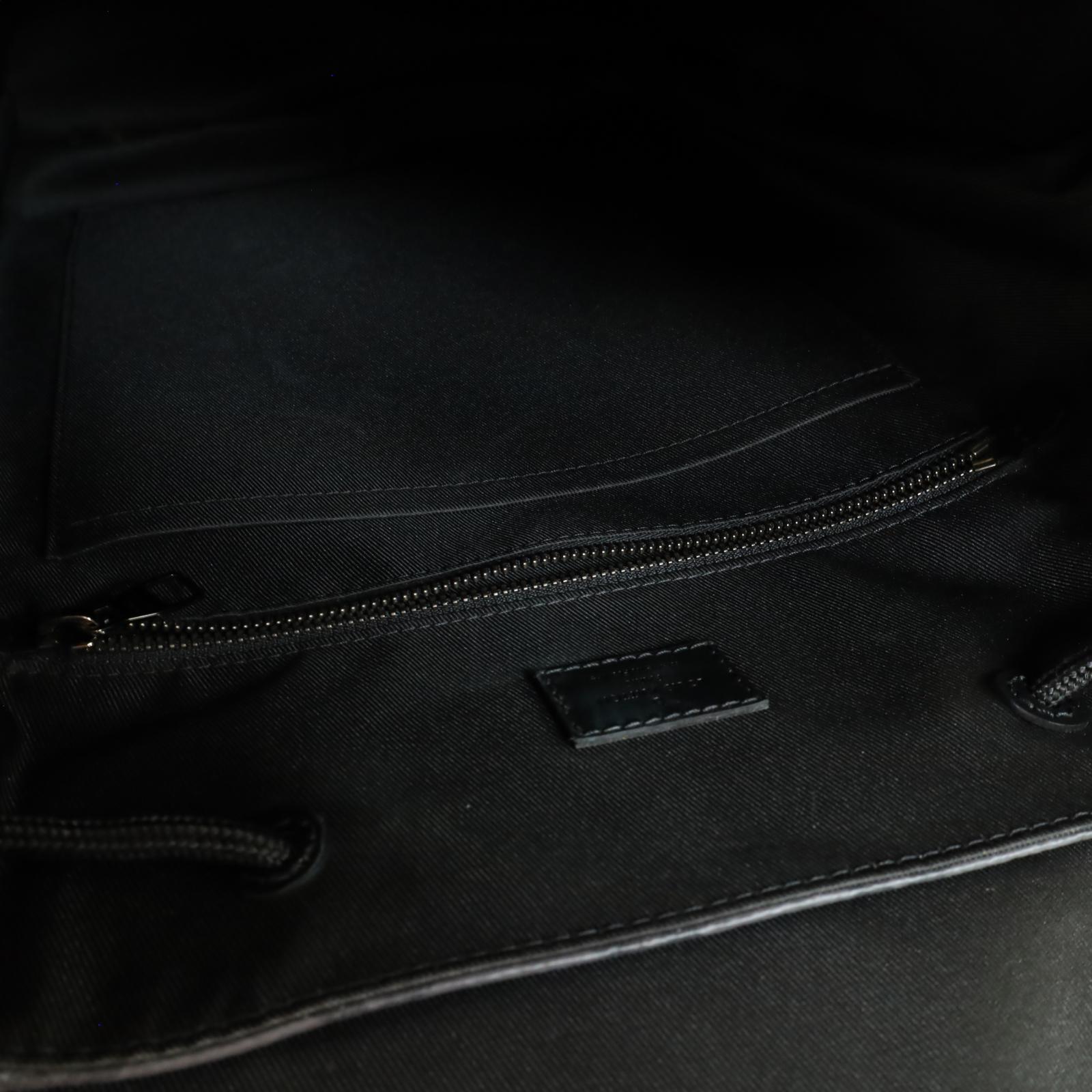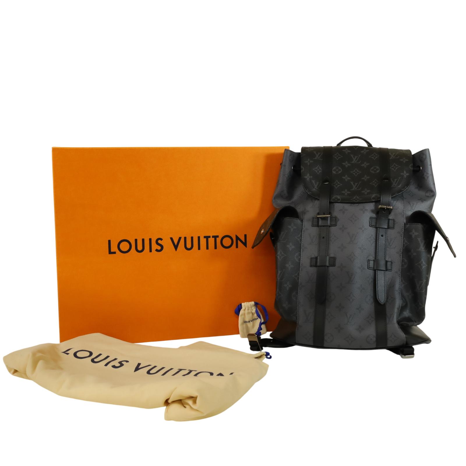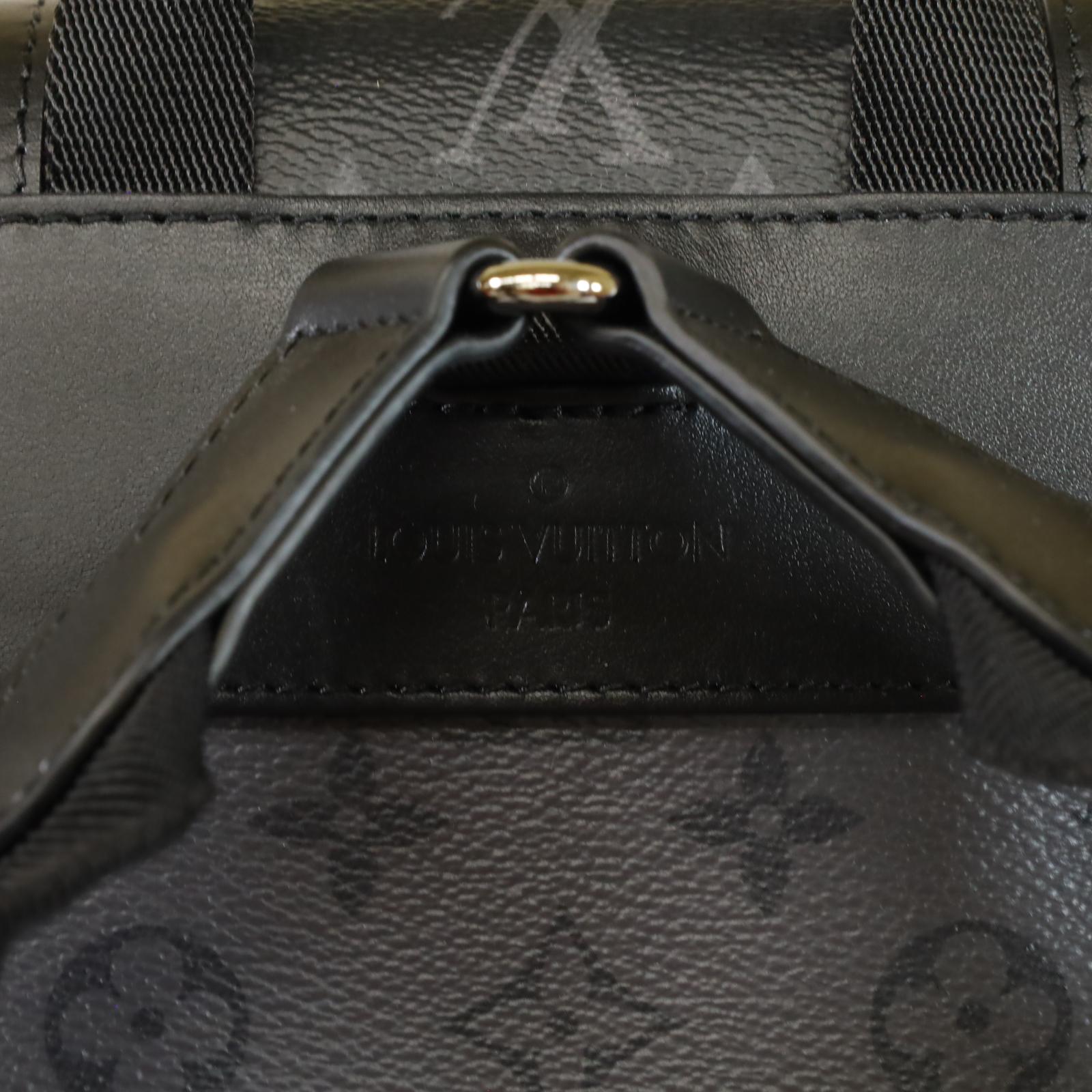 A men’s backpack crafted from Monogram Eclipse and Monogram Eclipse Reverse coated canvas with black cowhide leather trim and silver-tone hardware. Measuring approximately 15 x 17.3 x 4.9 inches, it features a flap opening with press-stud and drawstring closure, two side pockets, an inside tablet pocket, an inside zipped pocket, and two inside flat pockets. The interior is lined with textile, and the bag includes adjustable shoulder straps and a single top handle for carrying options.