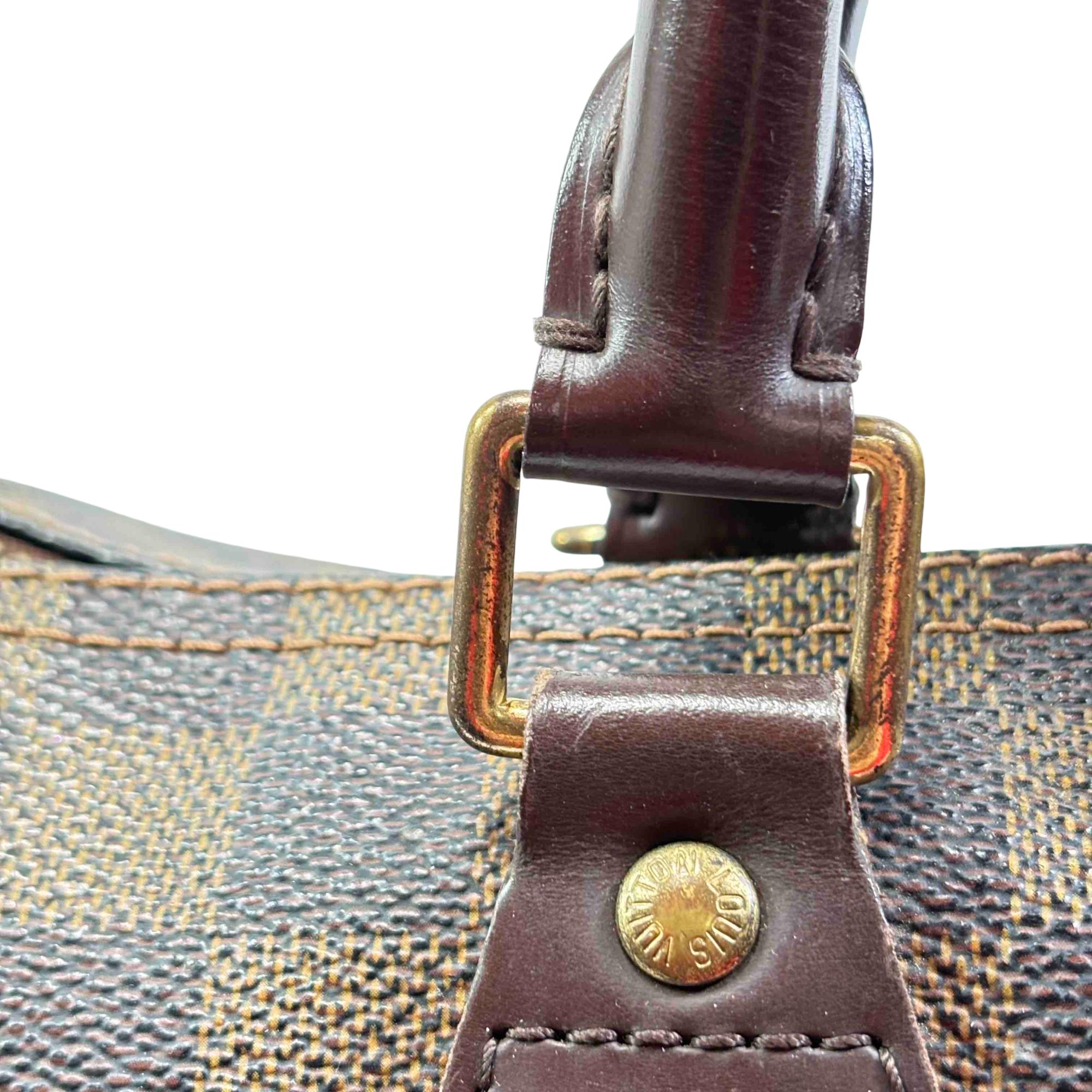 Elevate your fashion ensemble with the coveted Louis Vuitton Damier Ebene Canvas and Leather Handbag. This iconic piece combines elegance and function with its luxurious canvas and leather composition, accented with brass hardware and a secure zipper closure. Perfect for the fashion-forward individual, this handbag is a timeless addition to any wardrobe.