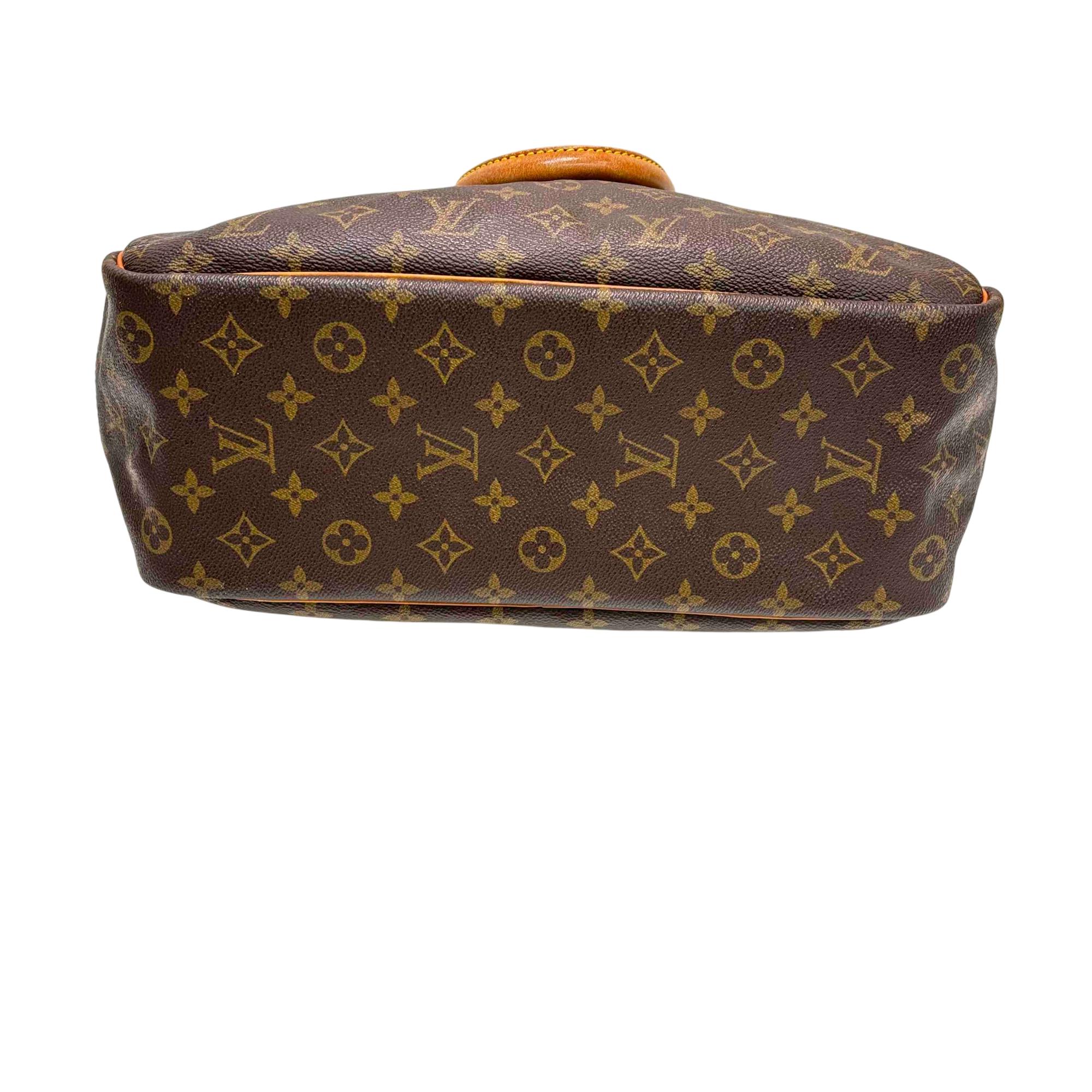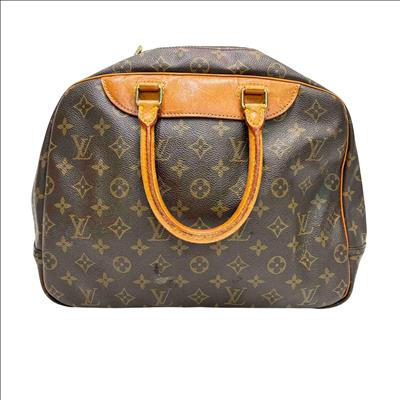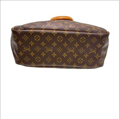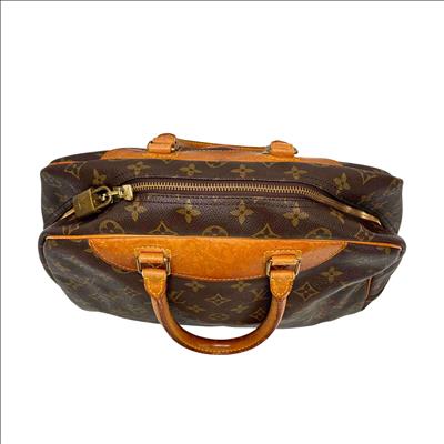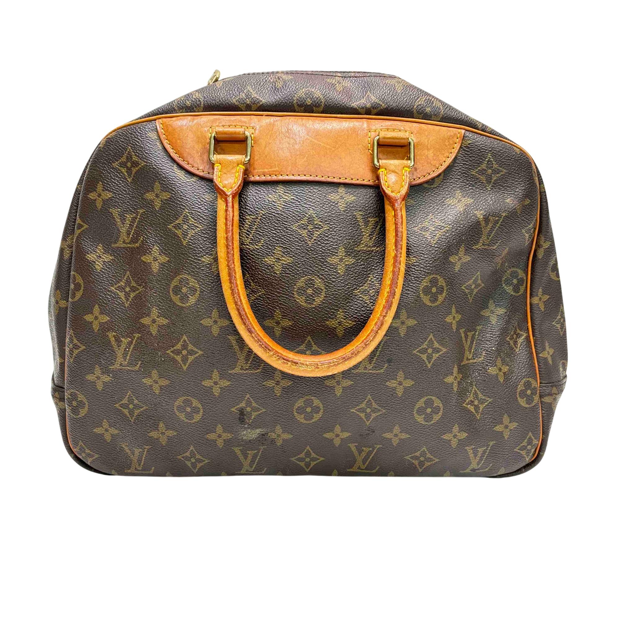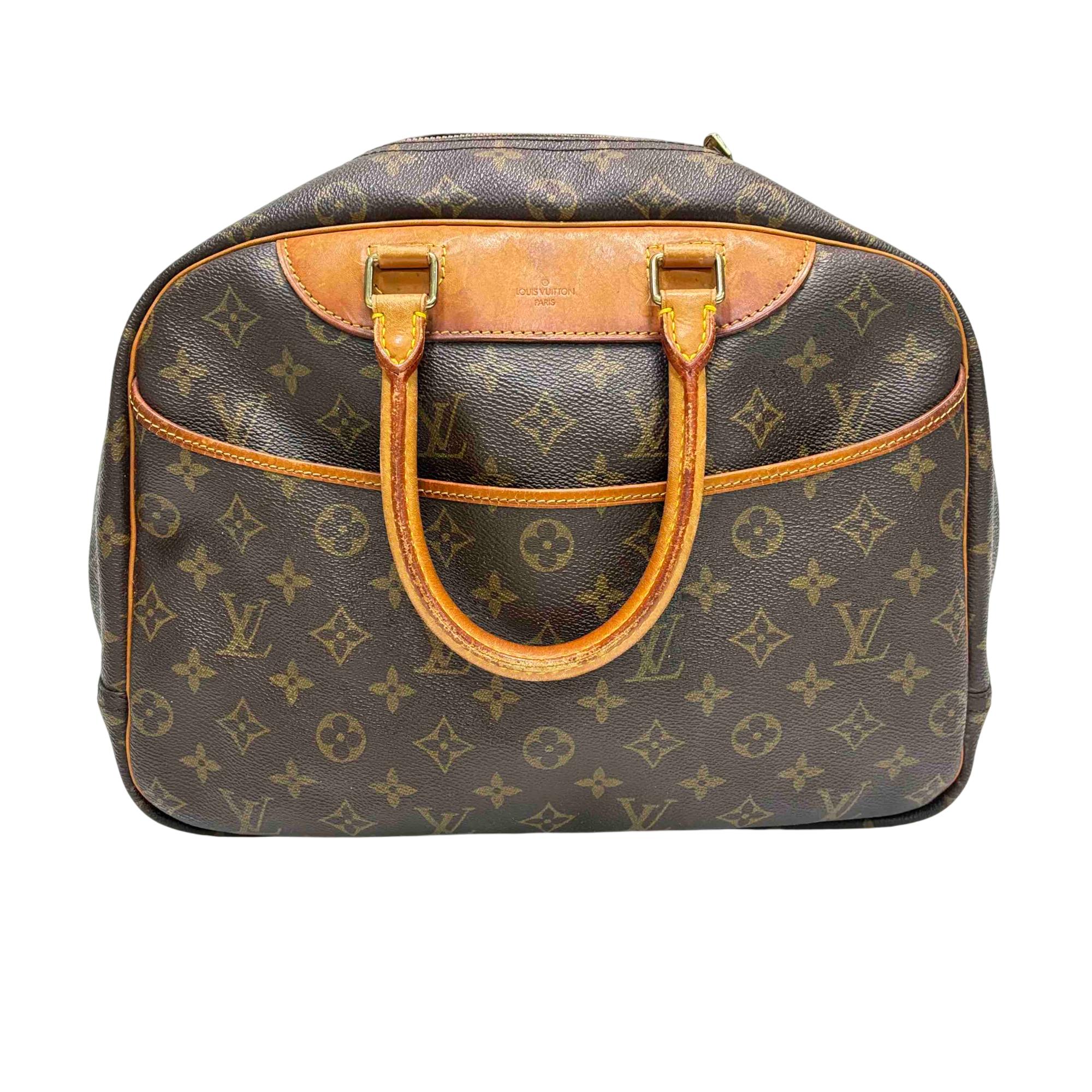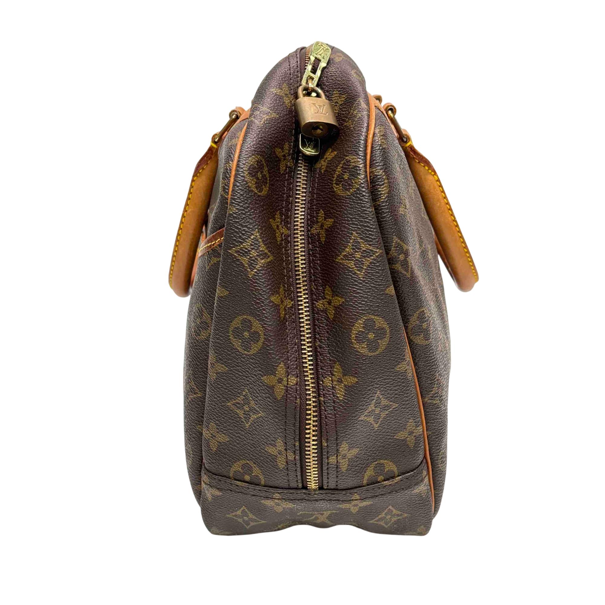 The Louis Vuitton Deauville Monogram Canvas Handbag features a classic brown monogram canvas design accented with tan leather handles and trim. This sophisticated shoulder bag is crafted from durable coated canvas and detailed with gold-toned hardware, including a secure zipper closure. Its structured shape and spacious interior with multiple pockets make it both a stylish and practical fashion accessory.