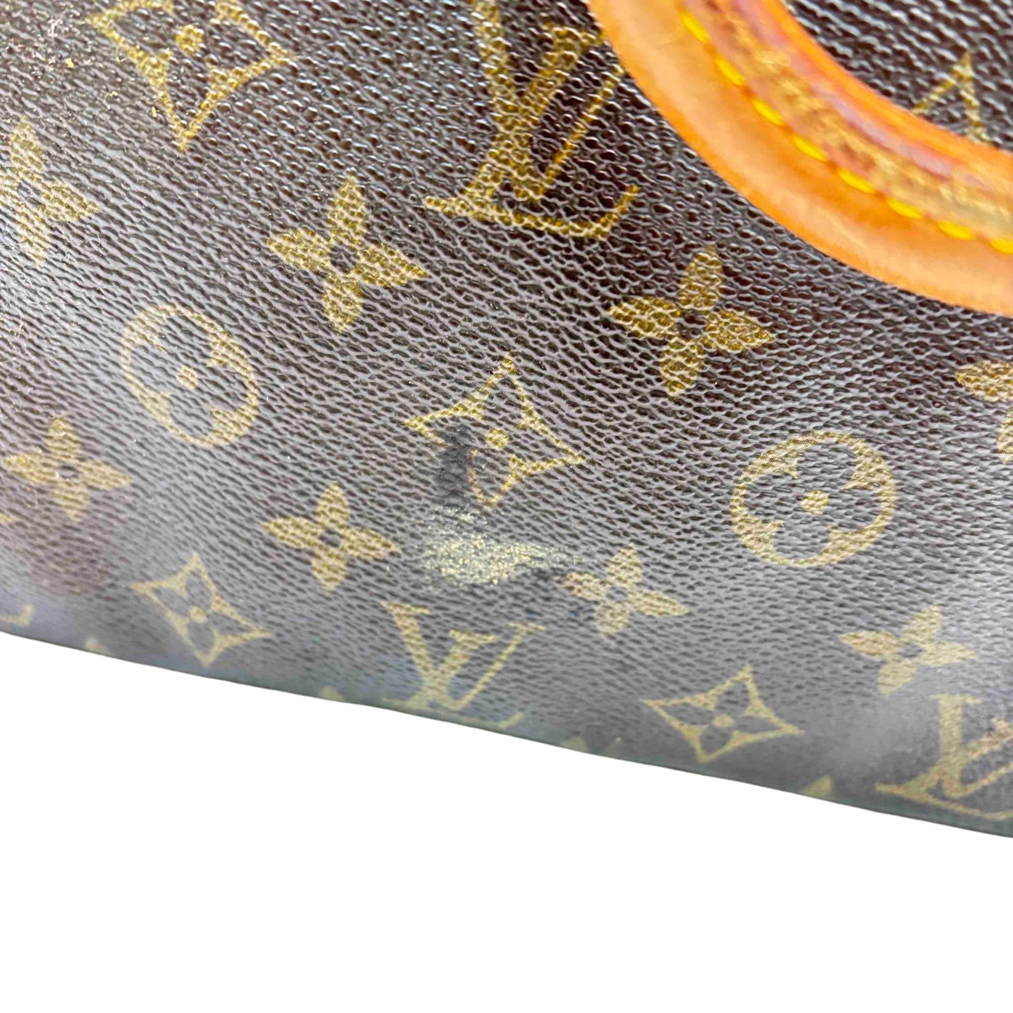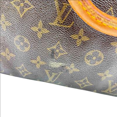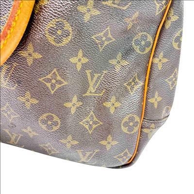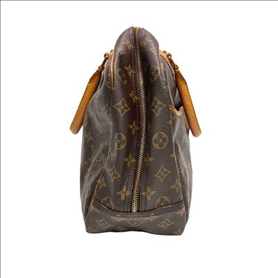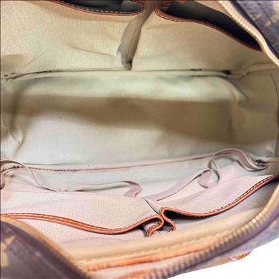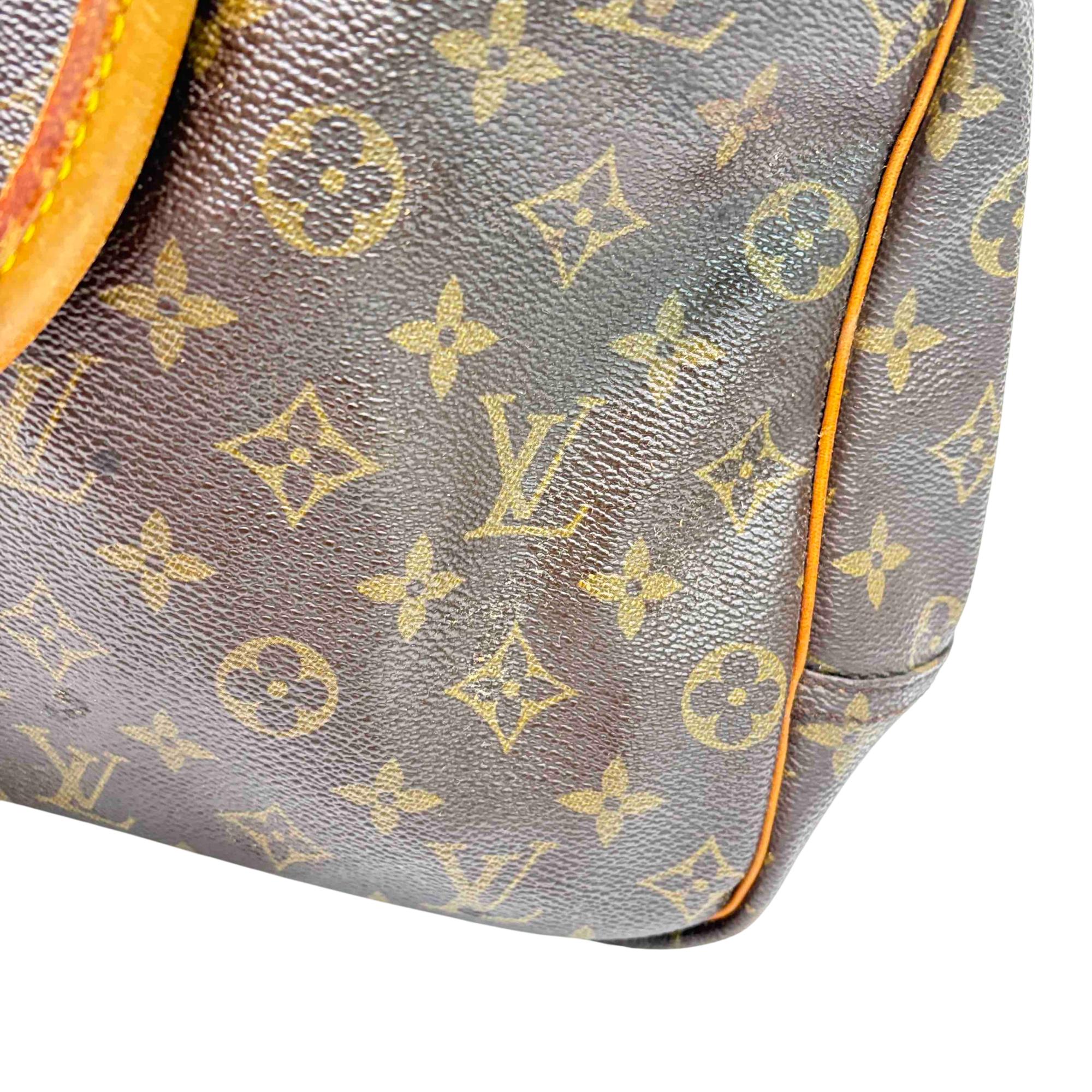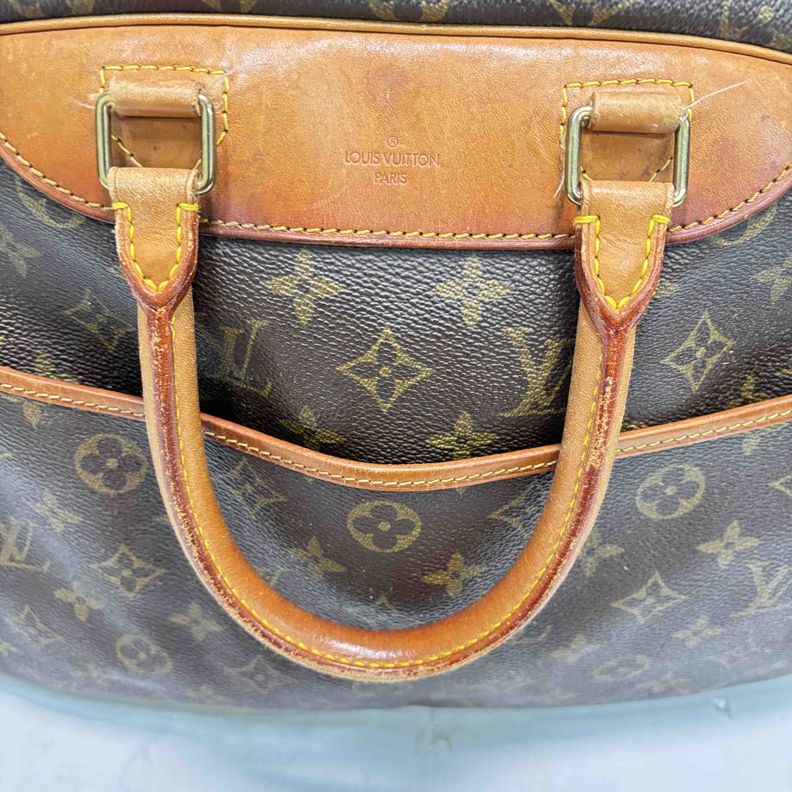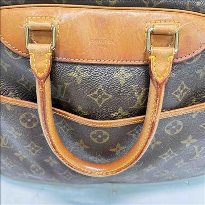 The Louis Vuitton Deauville Monogram Canvas Handbag features a classic brown monogram canvas design accented with tan leather handles and trim. This sophisticated shoulder bag is crafted from durable coated canvas and detailed with gold-toned hardware, including a secure zipper closure. Its structured shape and spacious interior with multiple pockets make it both a stylish and practical fashion accessory.