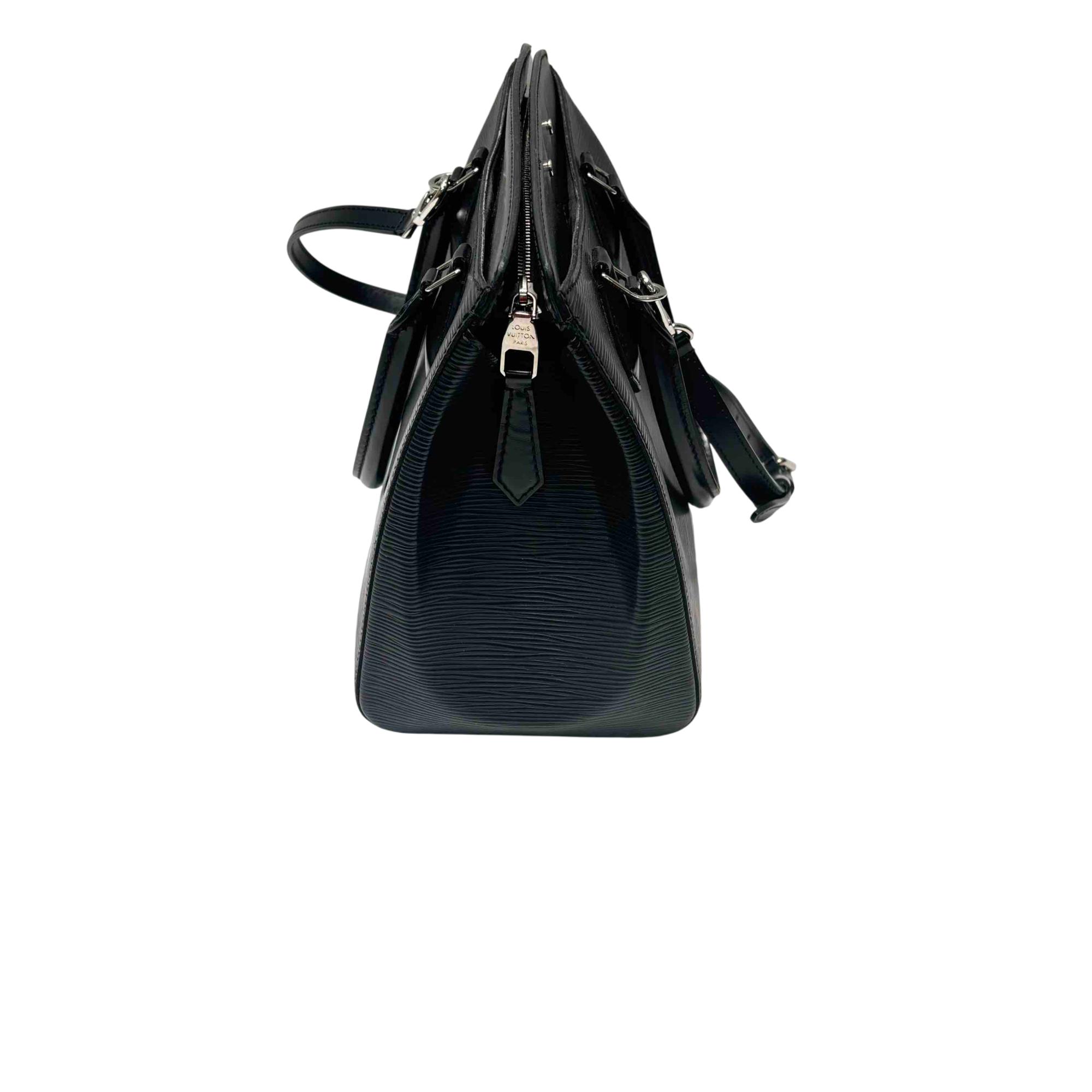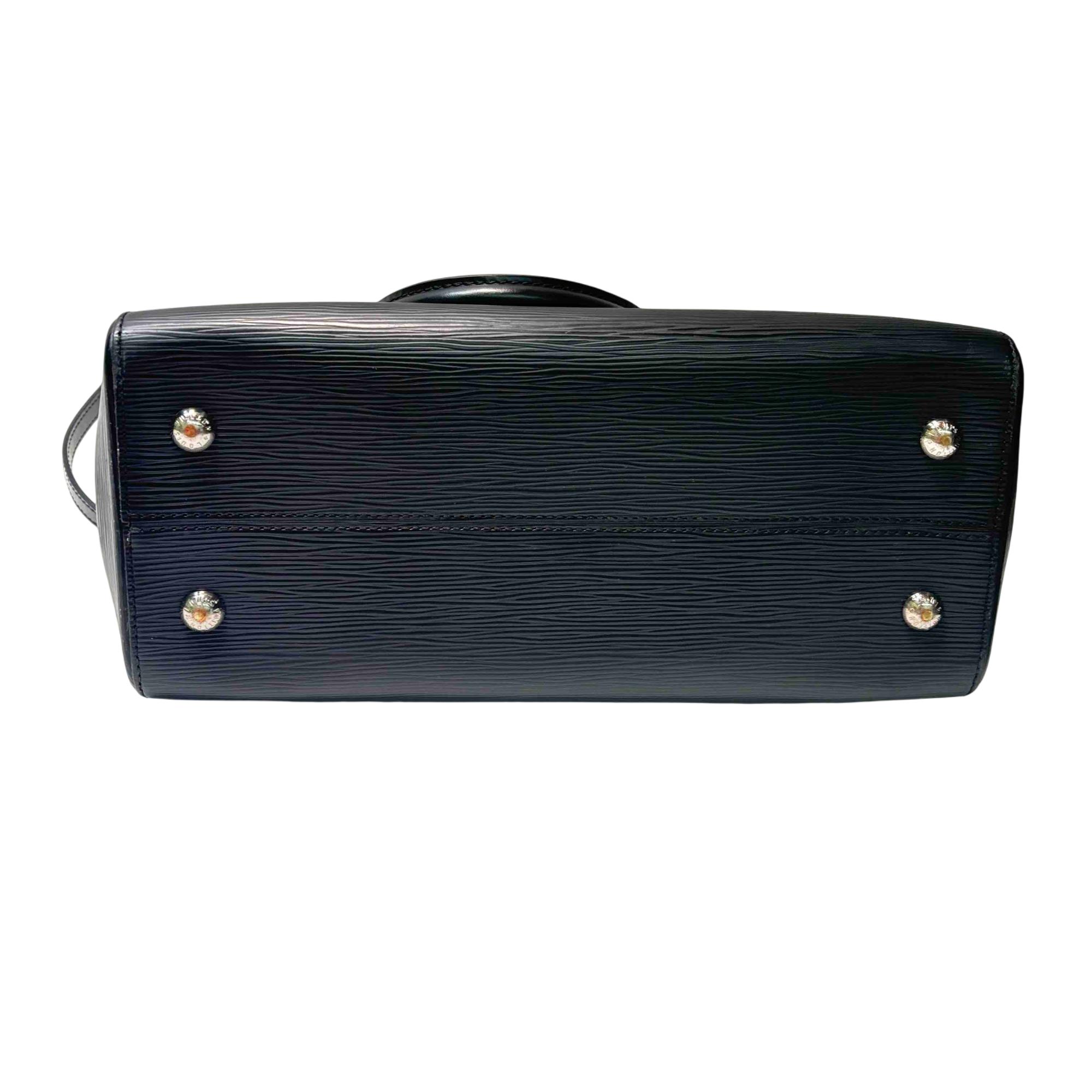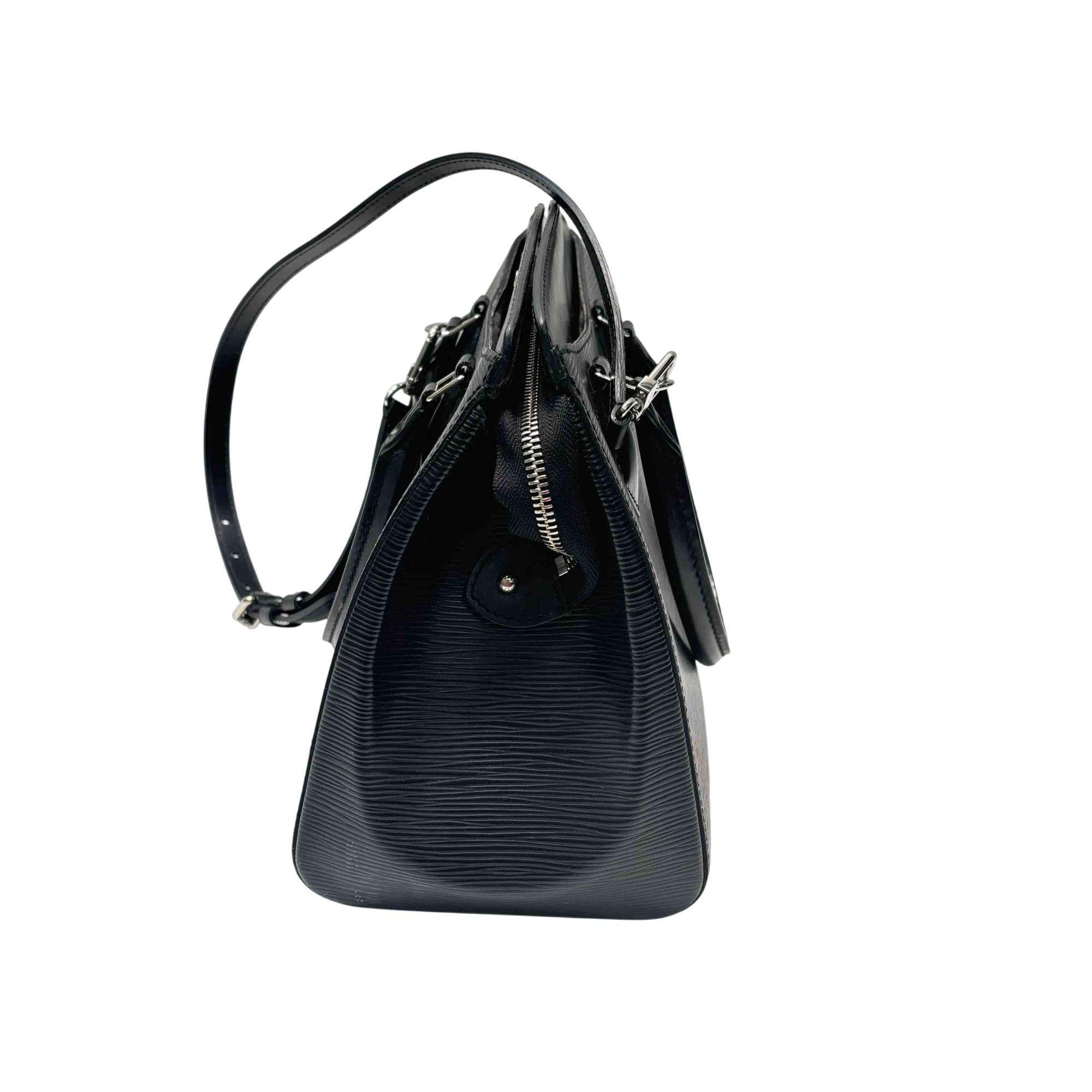 Elevate your style with the Louis Vuitton Soufflot MM handbag, featuring luxurious black Epi leather adorned with silver rivets for a sophisticated touch. This elegant handbag combines classic chic with modern design, making it a timeless accessory that complements any outfit.