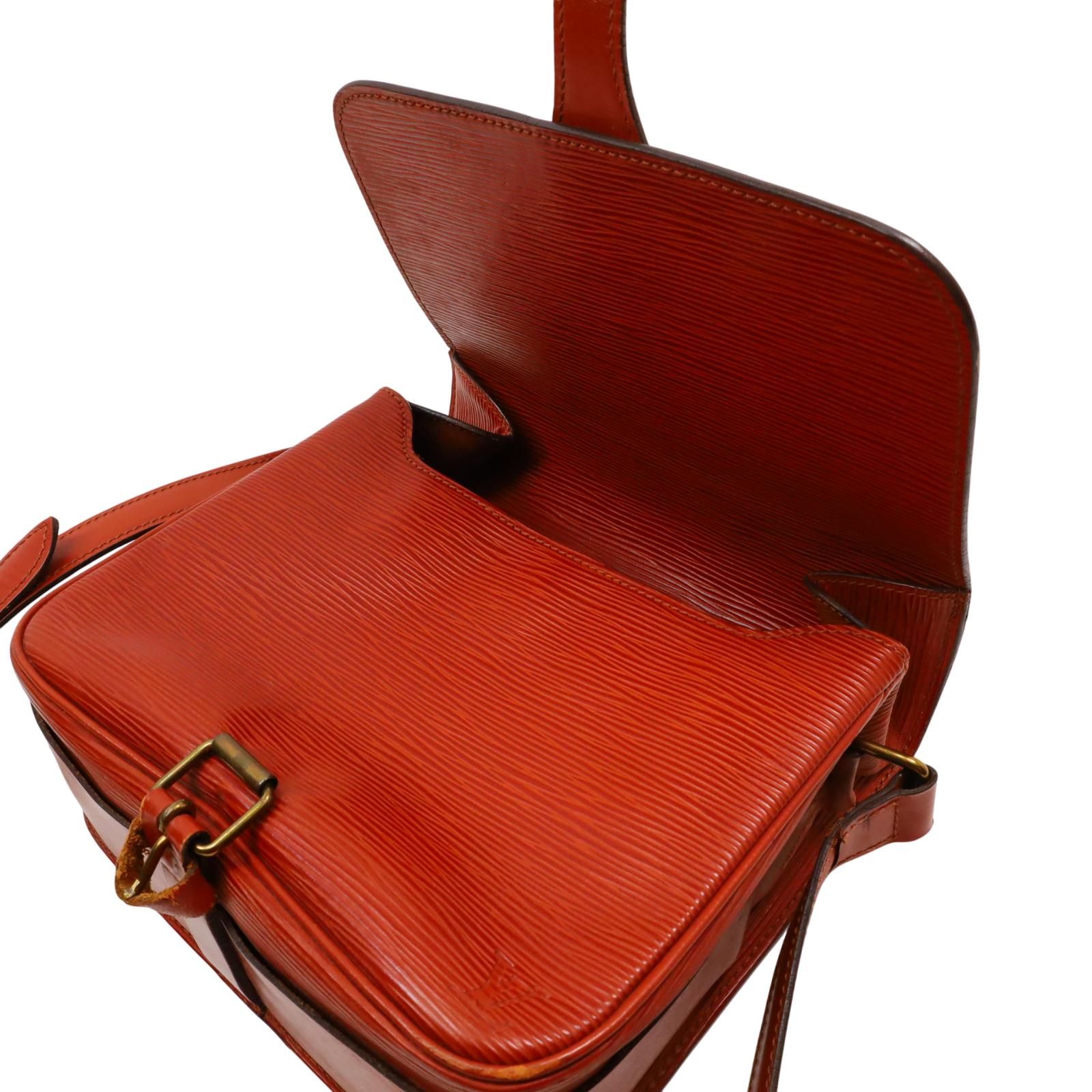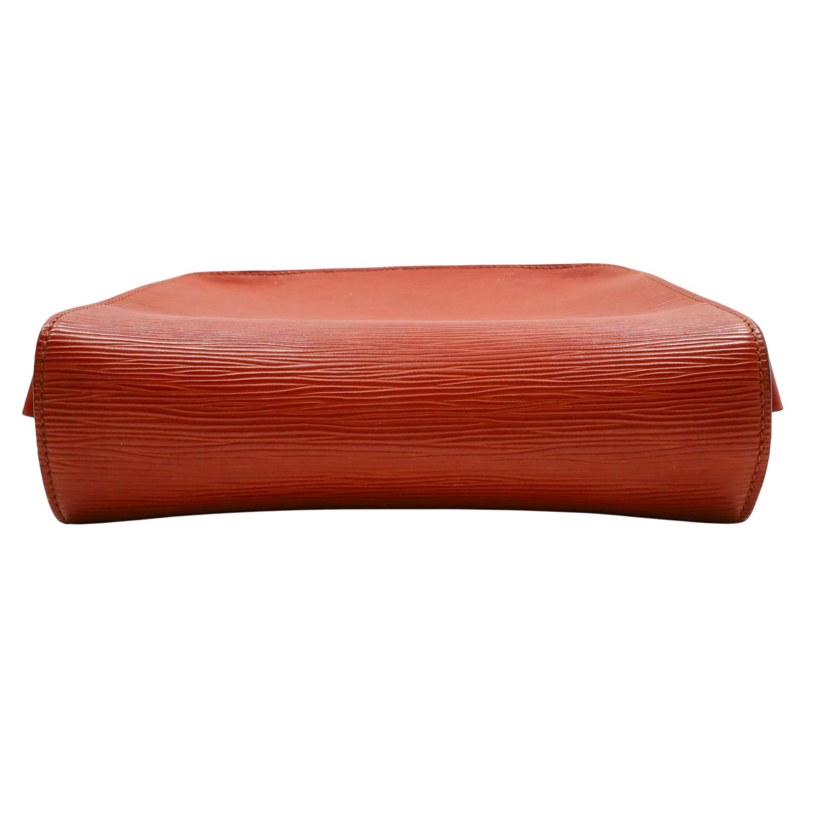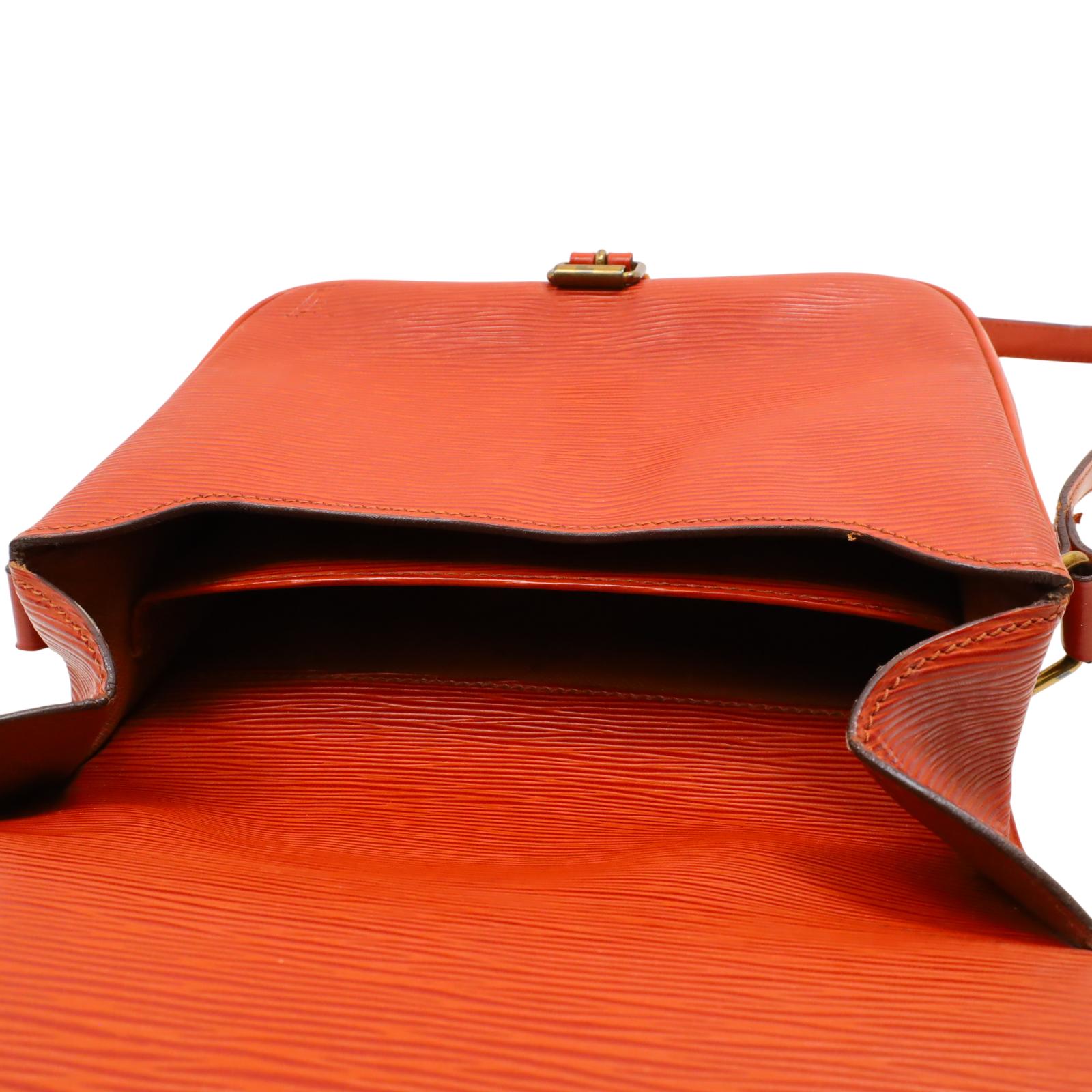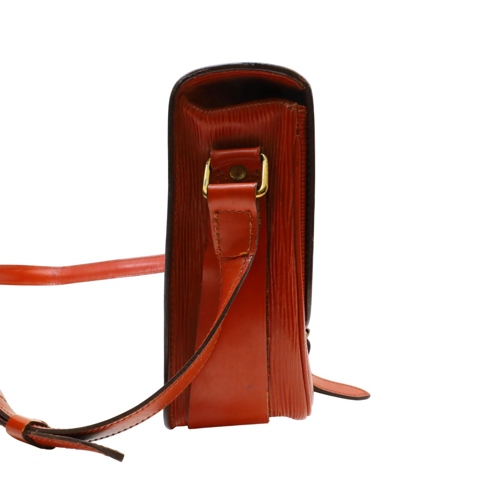 A structured shoulder bag made from textured golden brown Epi leather. It features a long adjustable shoulder strap, a front flap with a leather strap closure, and brass hardware. The interior is lined with brown cross-grain leather and includes a partitioned compartment with a patch pocket for organization. With its compact shape and classic materials, this bag offers a timeless and understated design suitable for daily wear. Approximate dimensions are 9 inches in length, 3 inches in width, and 7 inches in height, with a 19-inch strap drop.
