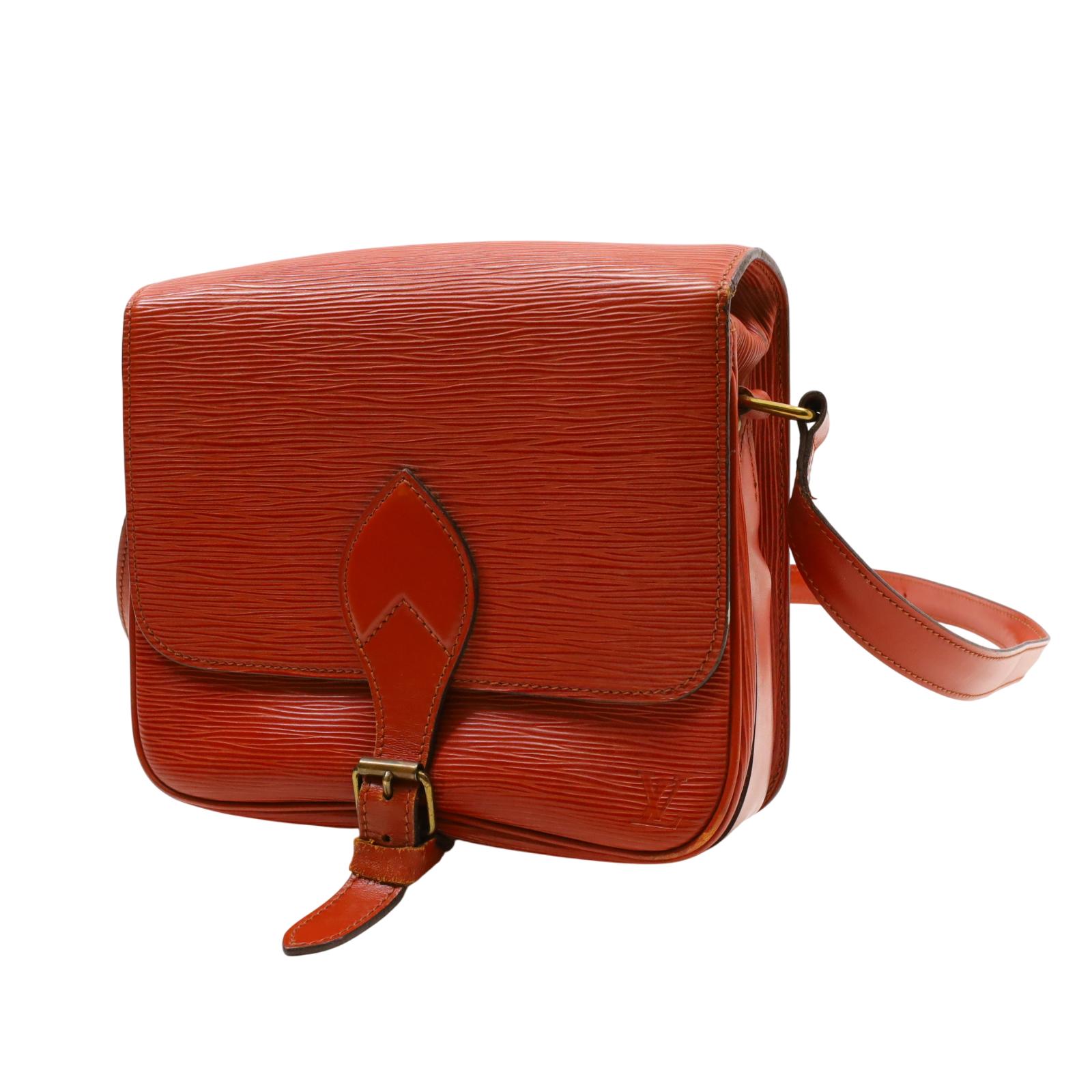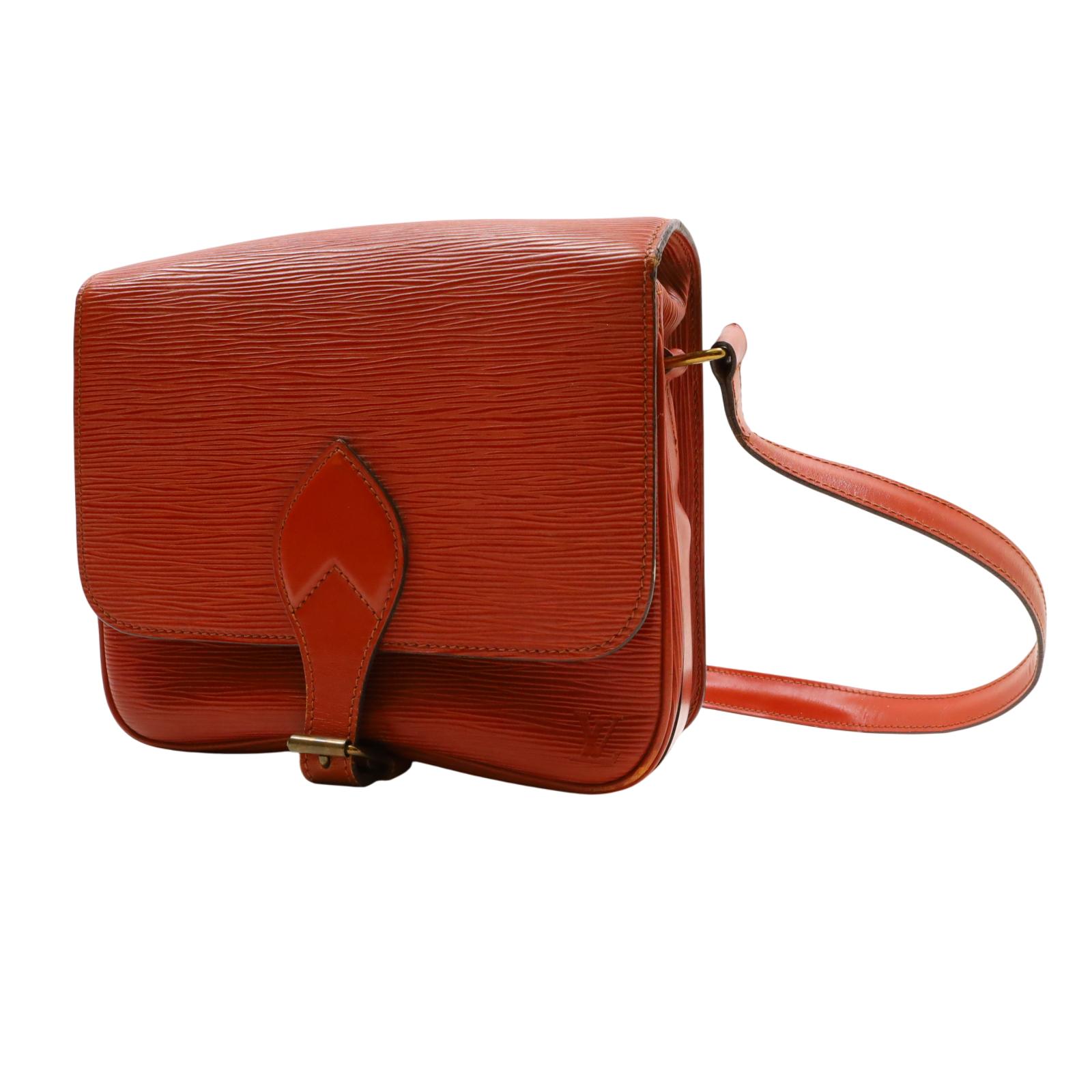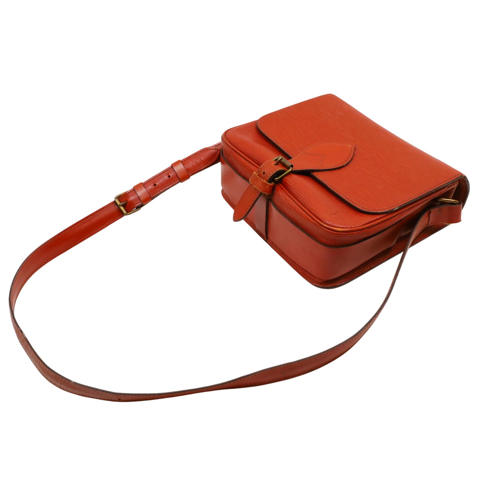 A structured shoulder bag made from textured golden brown Epi leather. It features a long adjustable shoulder strap, a front flap with a leather strap closure, and brass hardware. The interior is lined with brown cross-grain leather and includes a partitioned compartment with a patch pocket for organization. With its compact shape and classic materials, this bag offers a timeless and understated design suitable for daily wear. Approximate dimensions are 9 inches in length, 3 inches in width, and 7 inches in height, with a 19-inch strap drop.